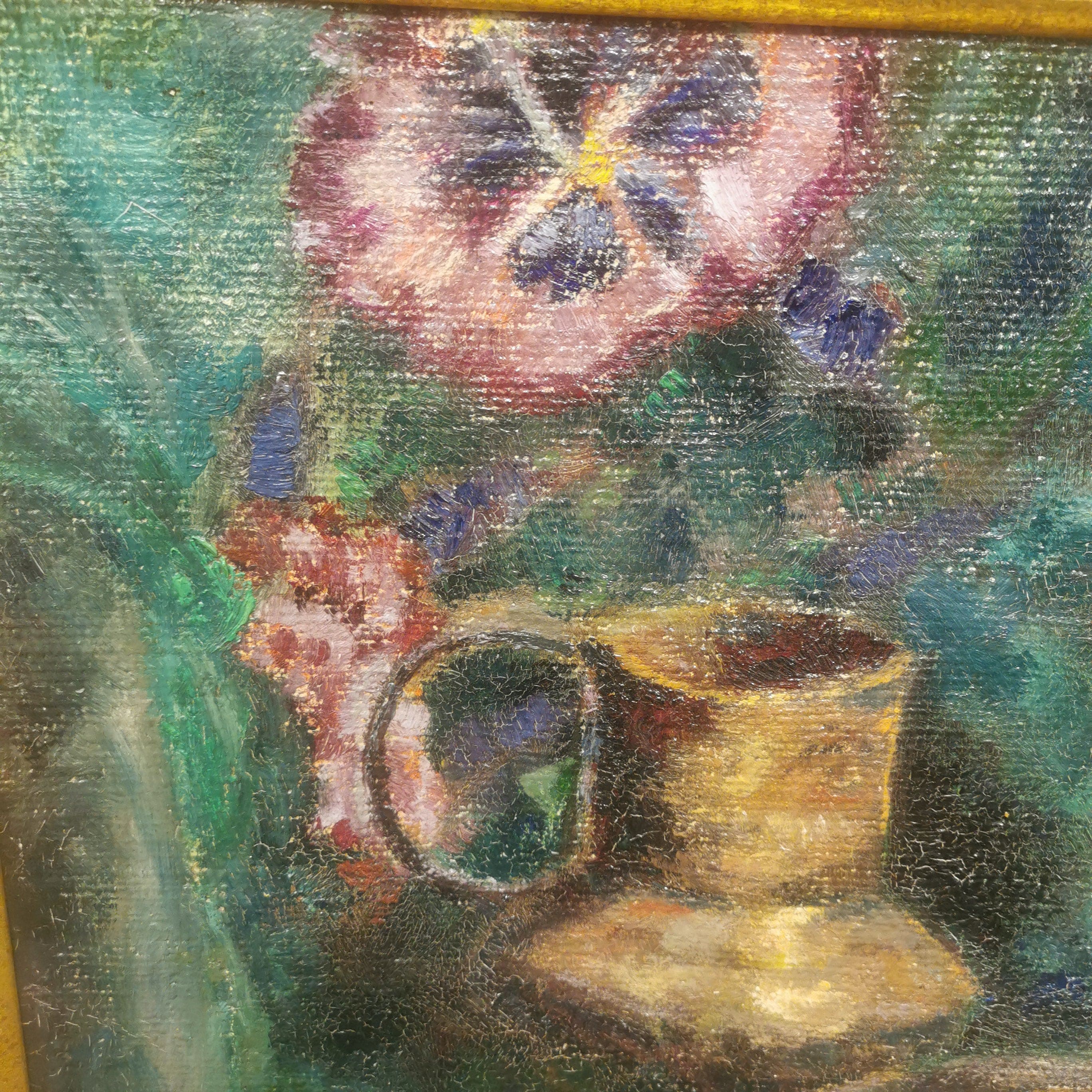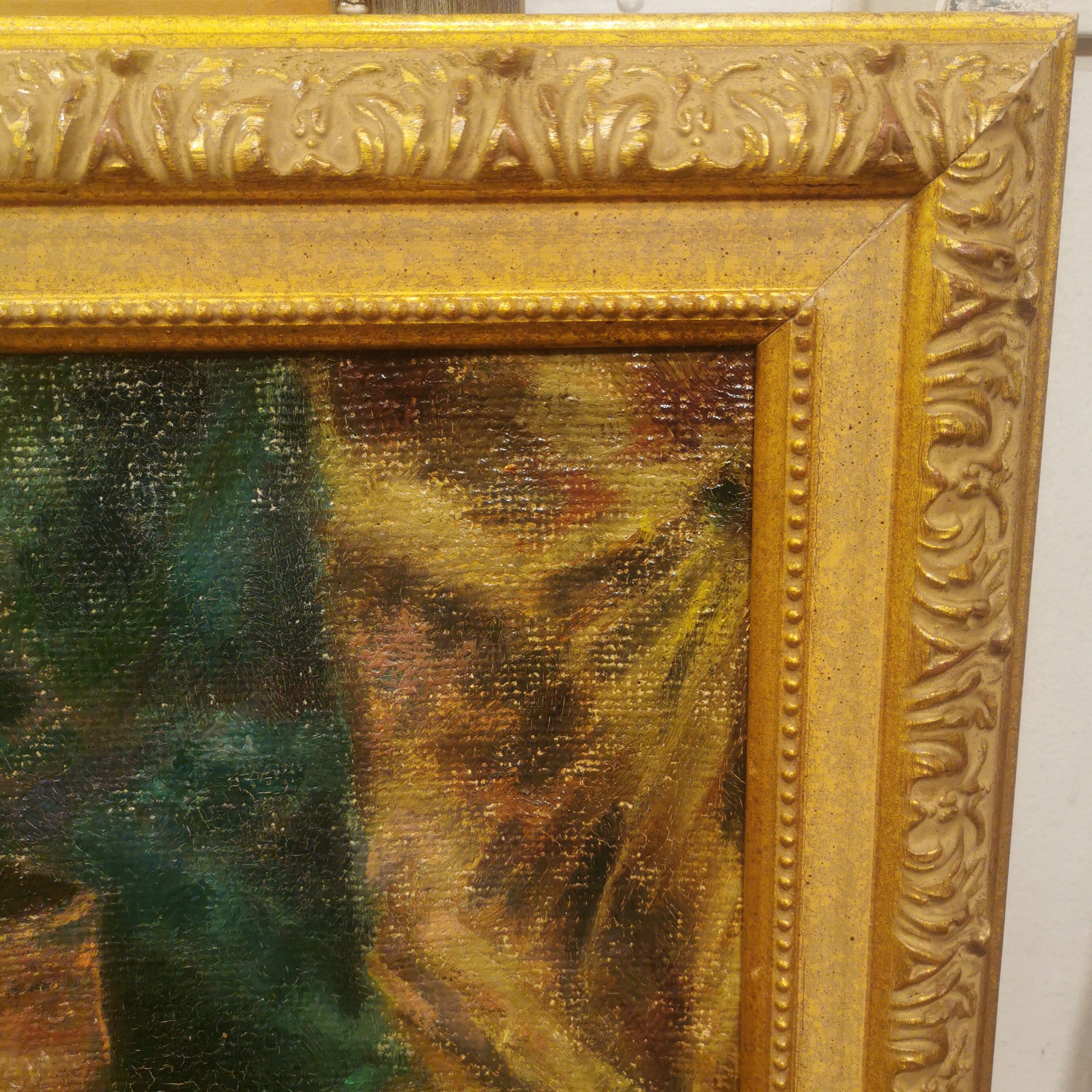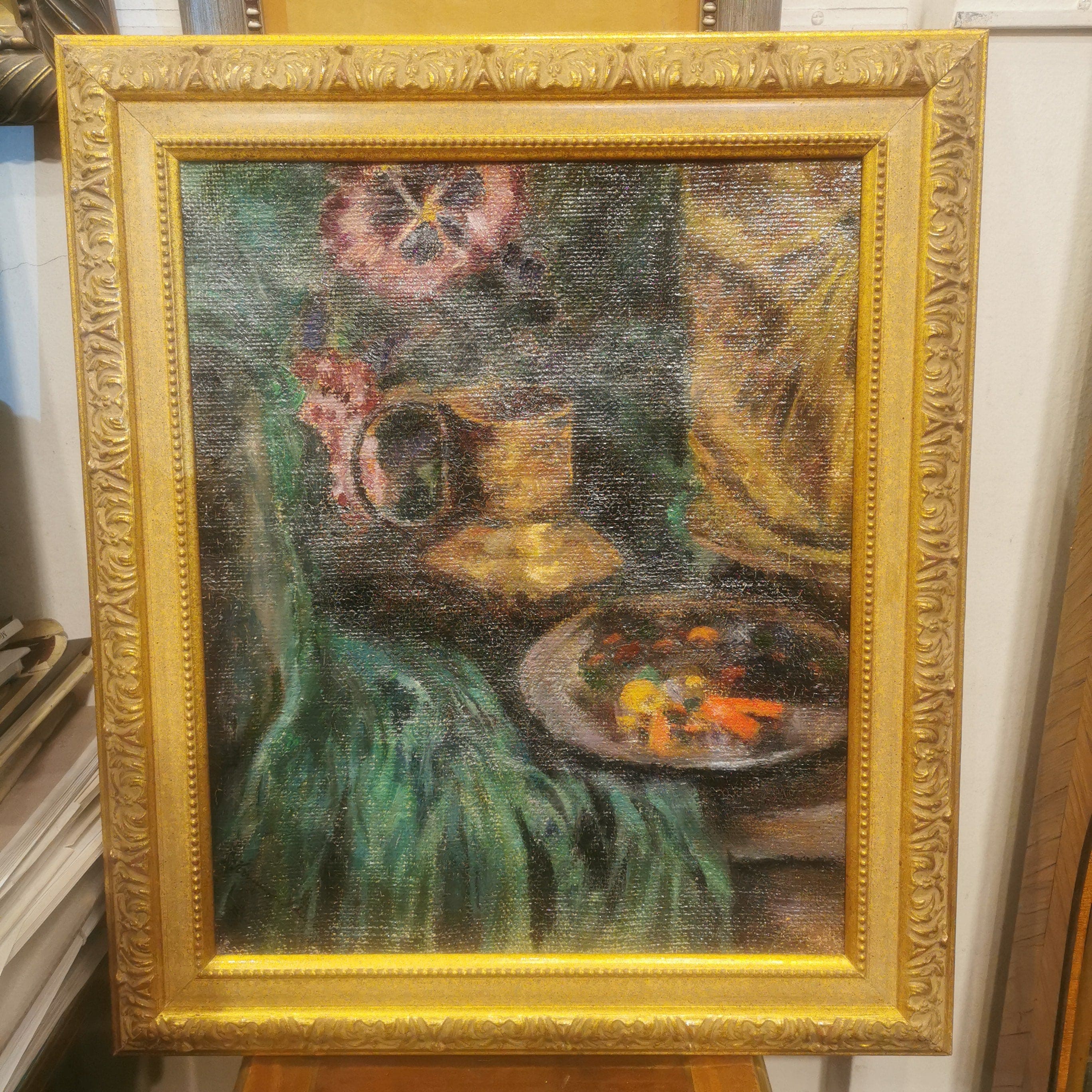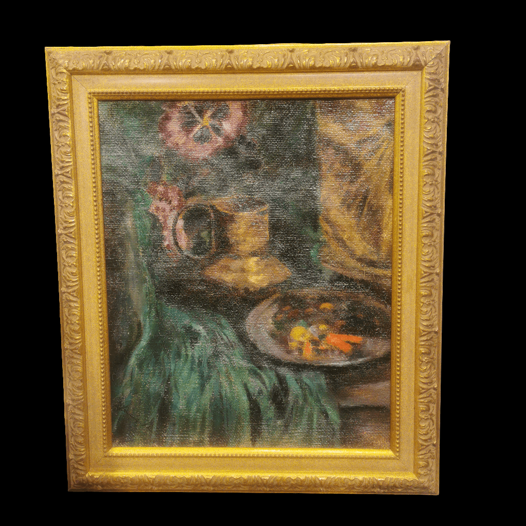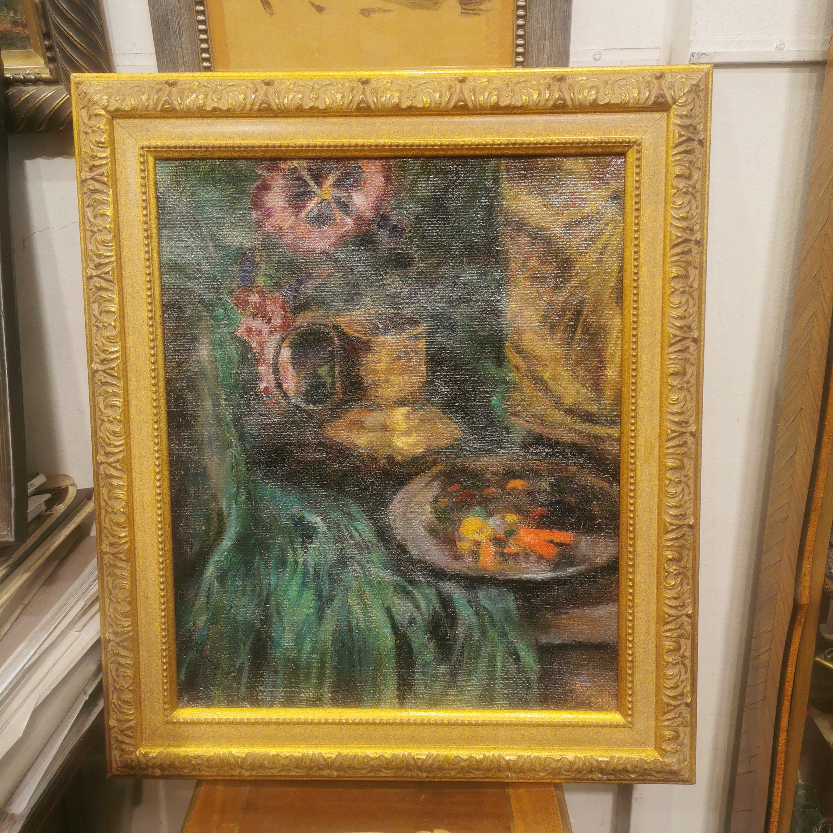 Bonito Óleo sobre arpillera con firma ilegible. En la pintura una especie de Bodegón. La pintura está restaurada y tiene un bello marco dorado tallado.