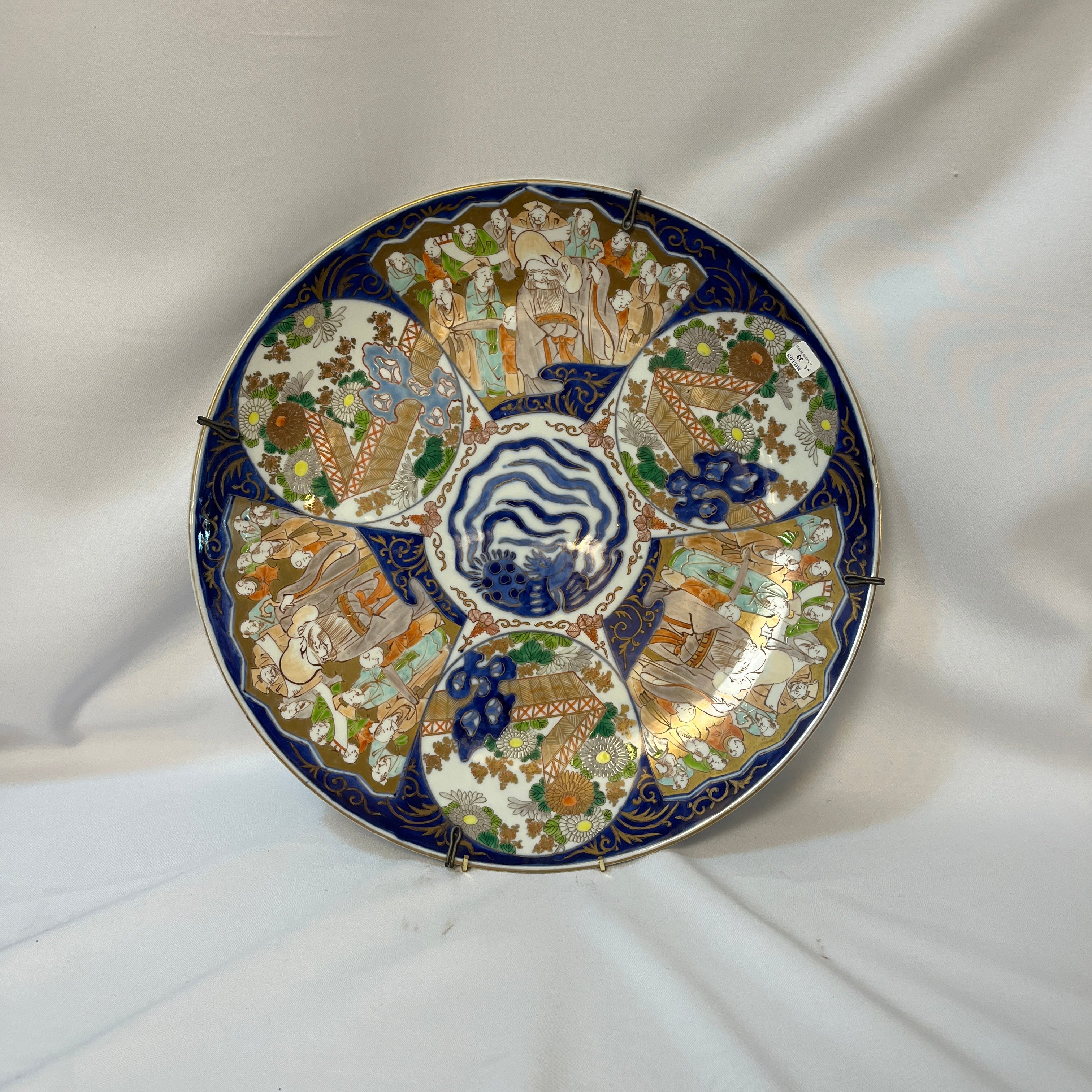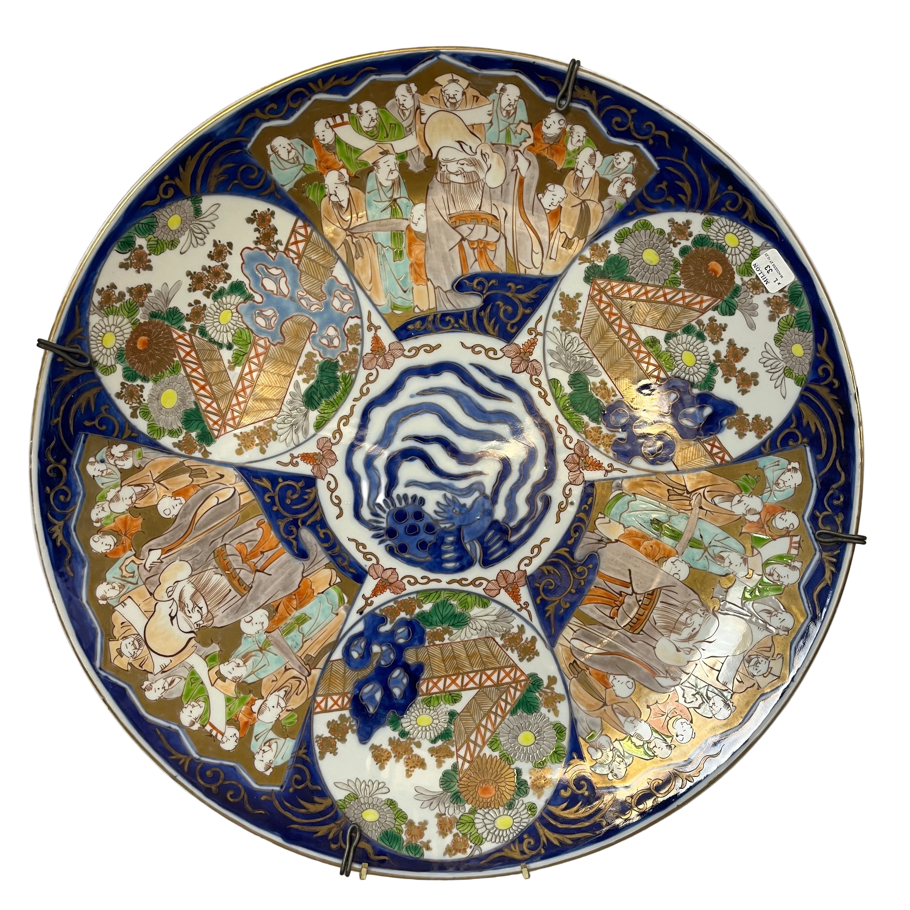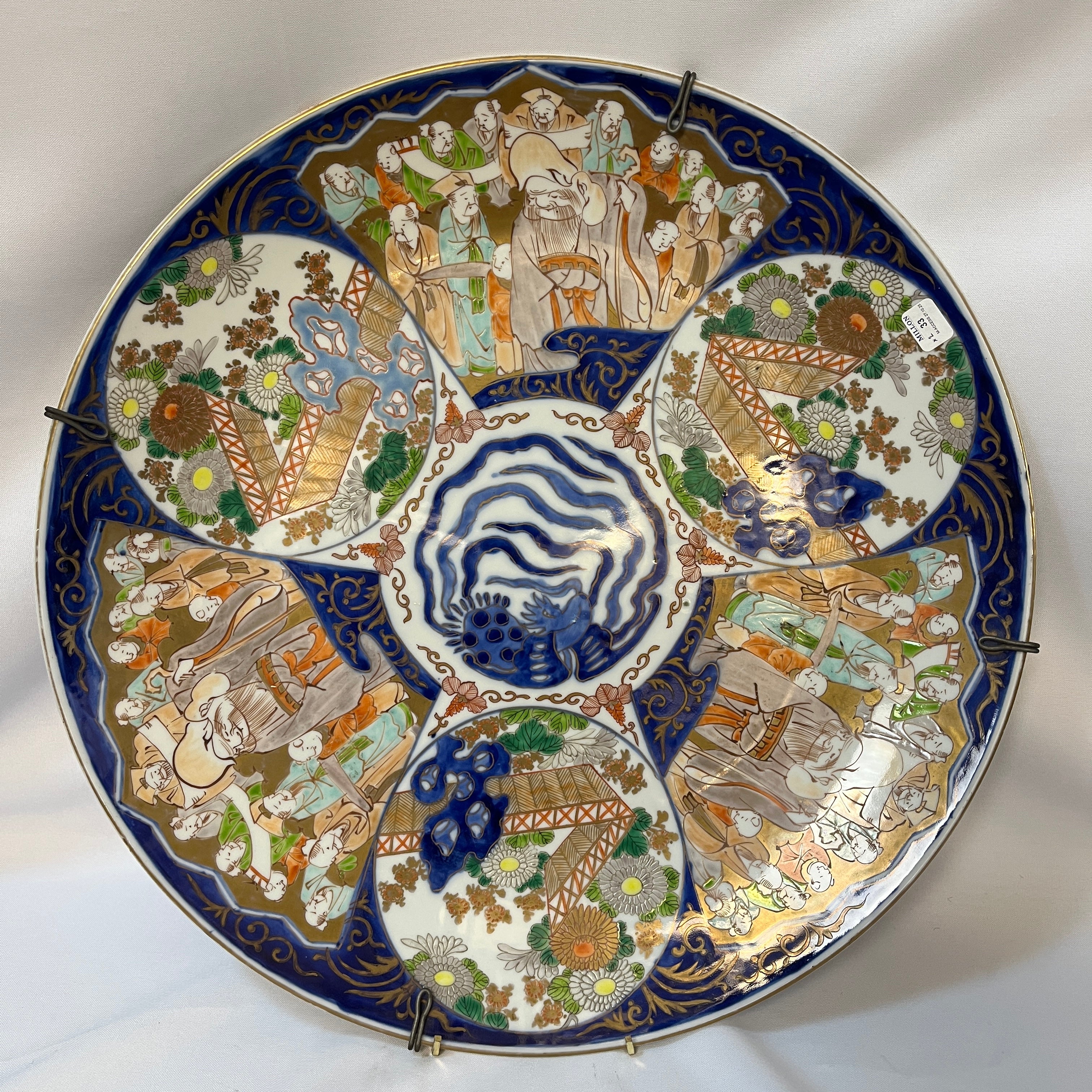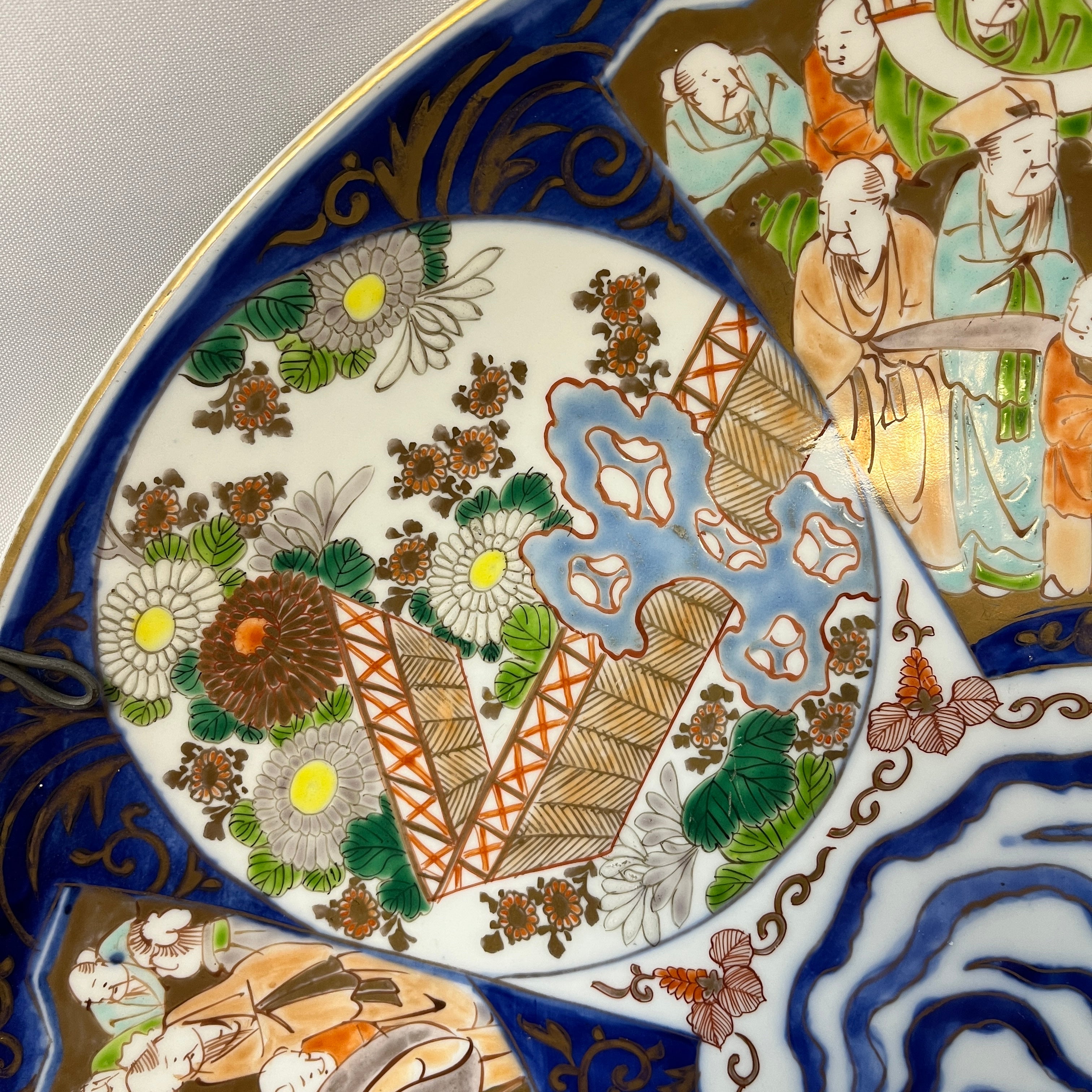 Hermoso plato de porcelana japones pintado a mano estilo Imarí de fines del siglo XIX. El plato destaca por una base en azul cobalto, con tonos rojo hierro y dorados. El diseño cuenta con 6 pares de paneles intercalados ilustrados tres circulares y tres con forma de abanico; un par tiene un muro agua en tonos azul y vegetación, otro par también tiene un muro con vegetación pero con agua en tonos celestres y el tercer par muestra un grupo de hombres reunidos entorno a un hombre más grande y robusto.