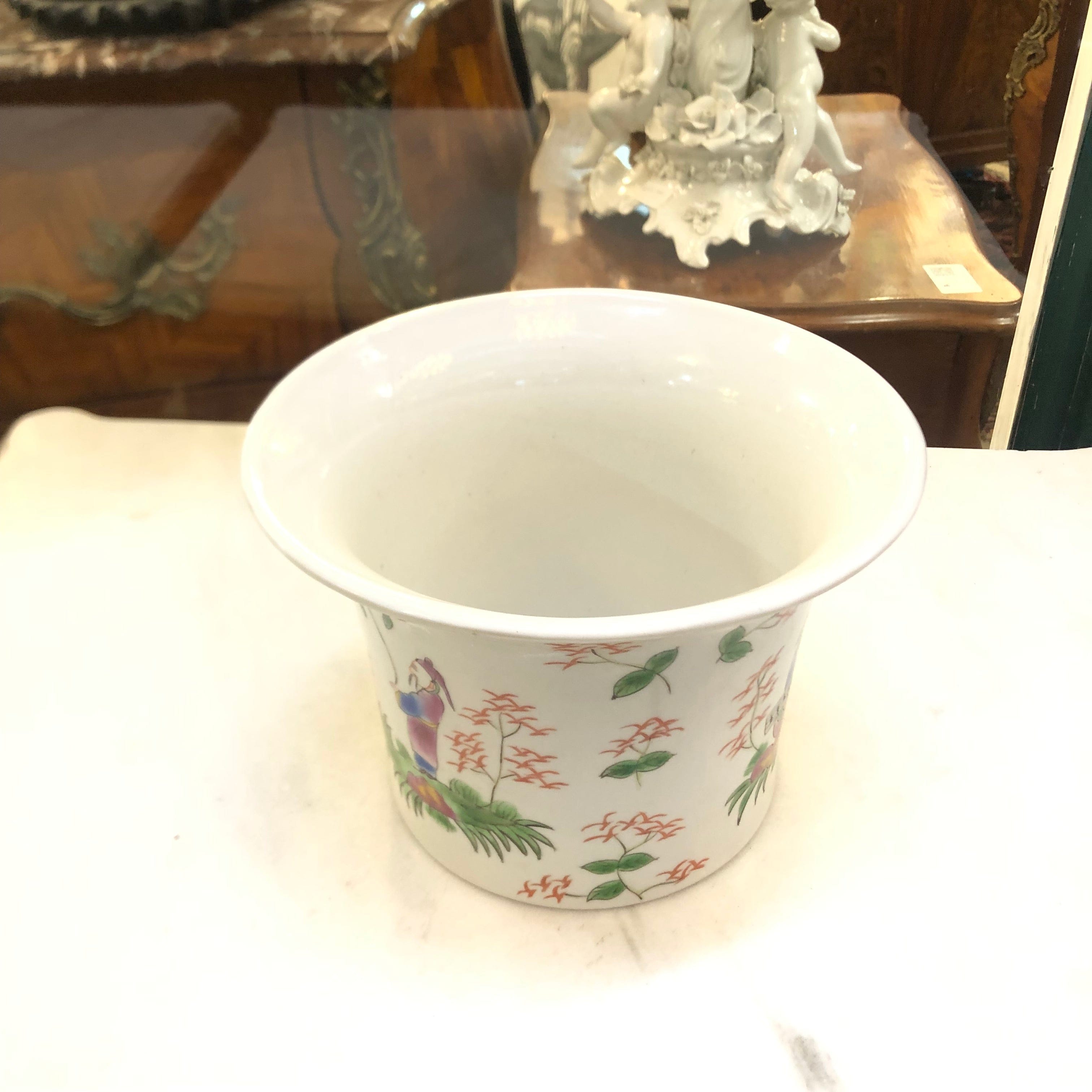 Bella Jardinera de porcelana de origen chino, diseño de diferentes personajes en un jardin, colores verdes, rosados, azul y amarillo.