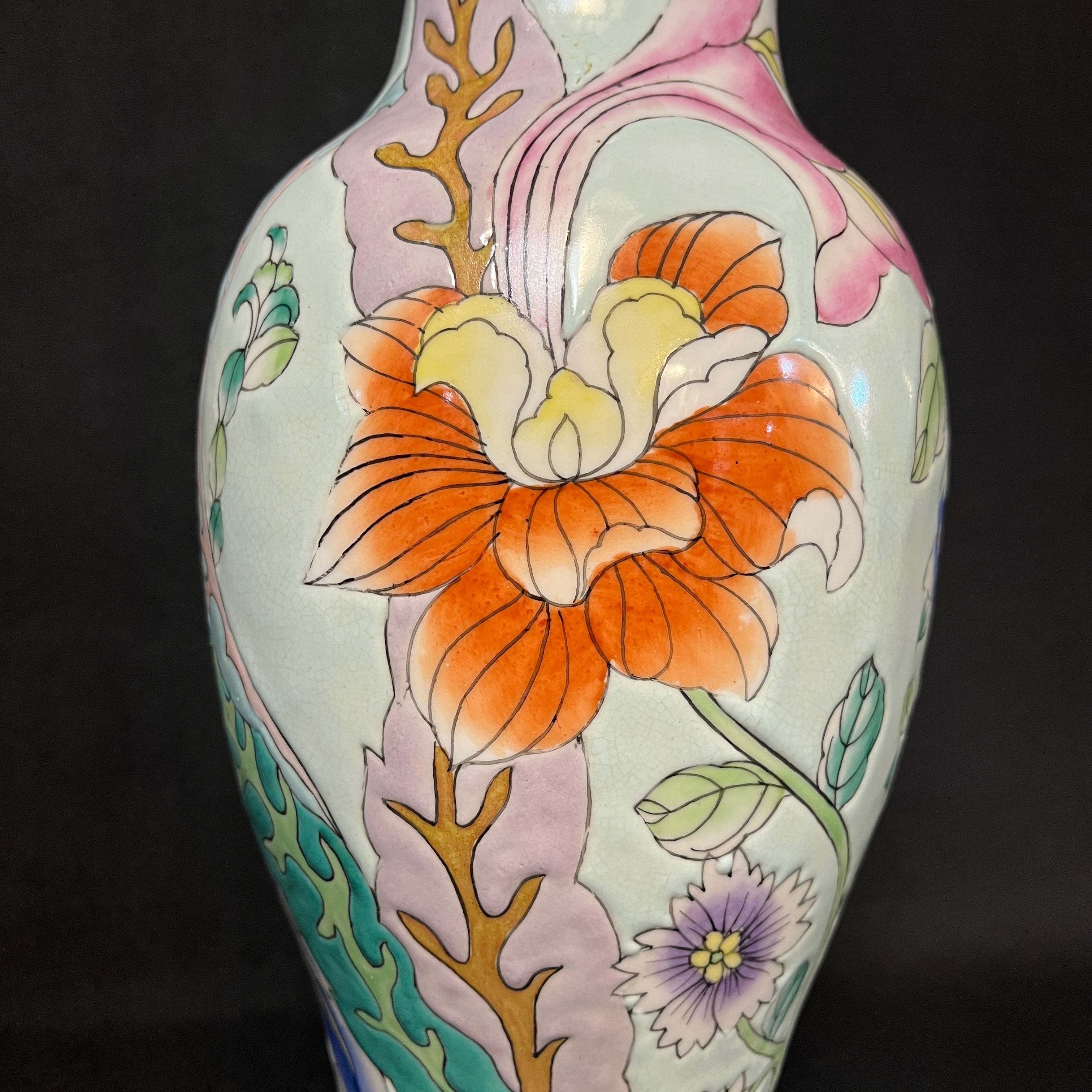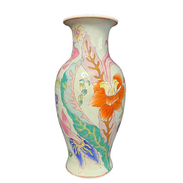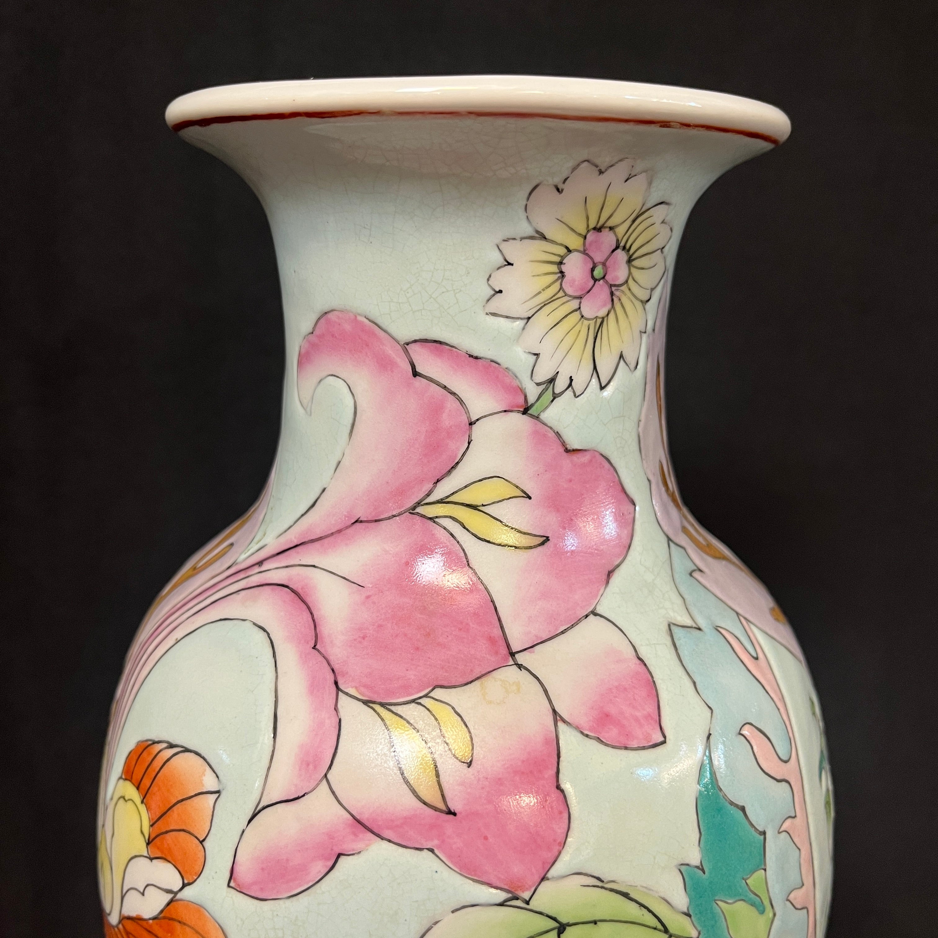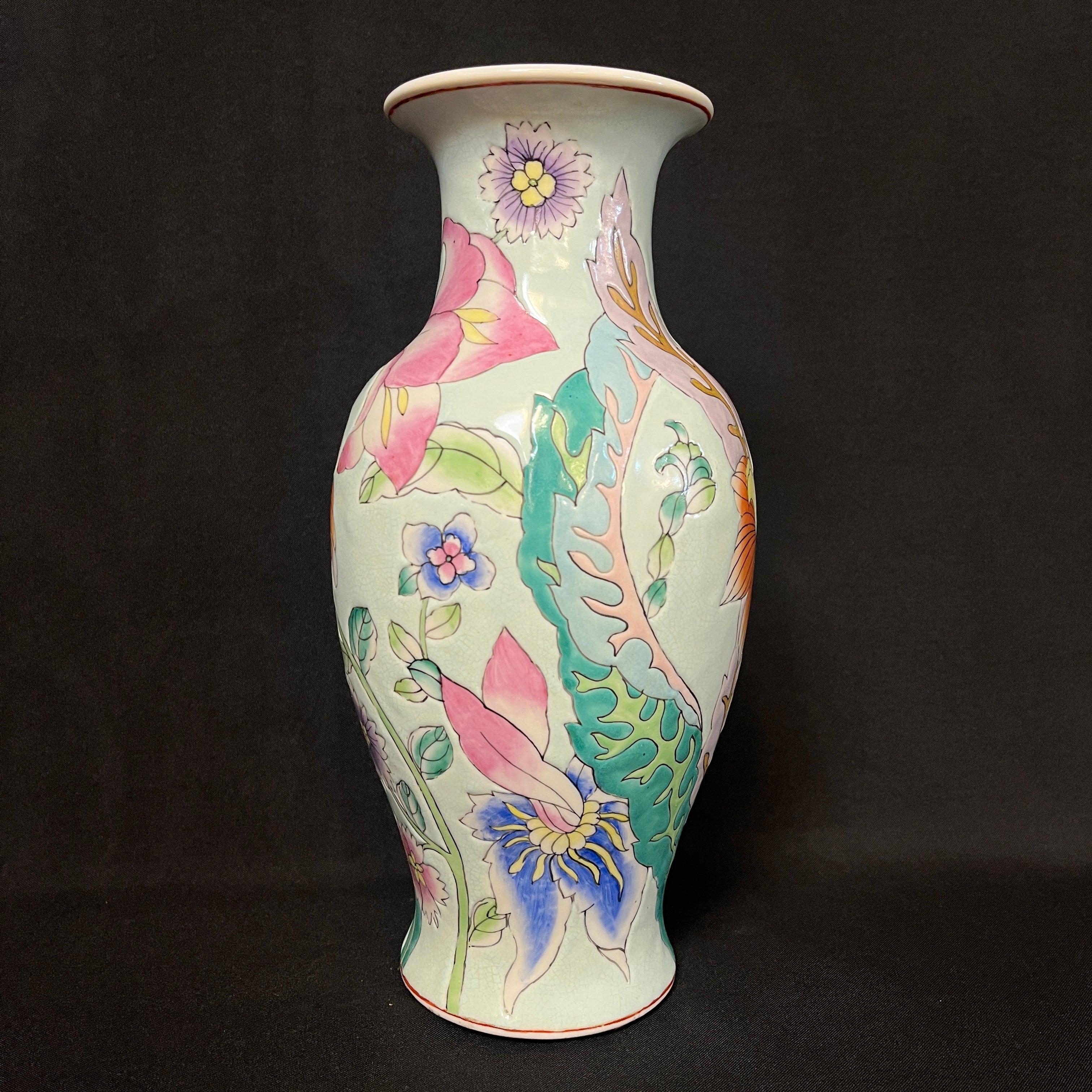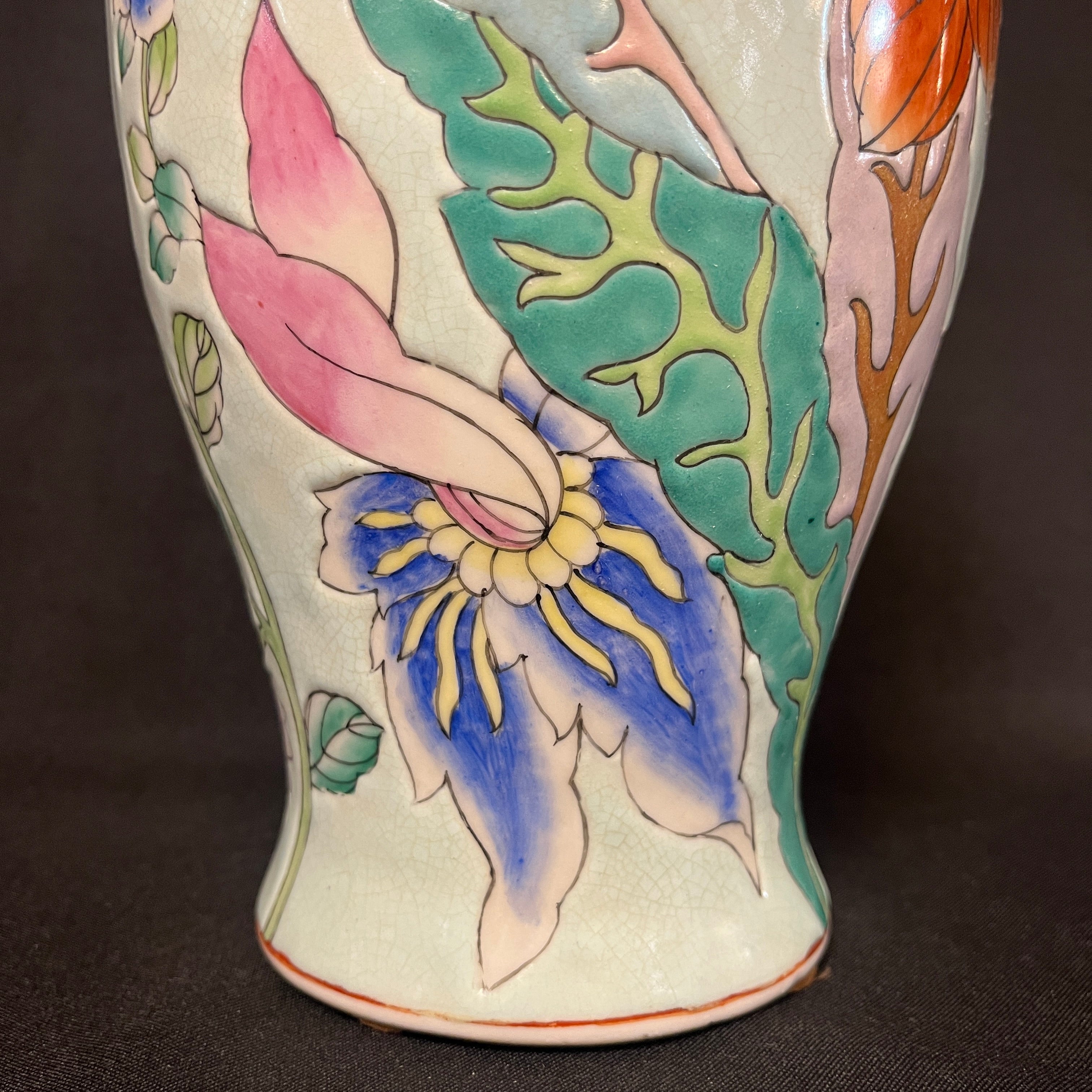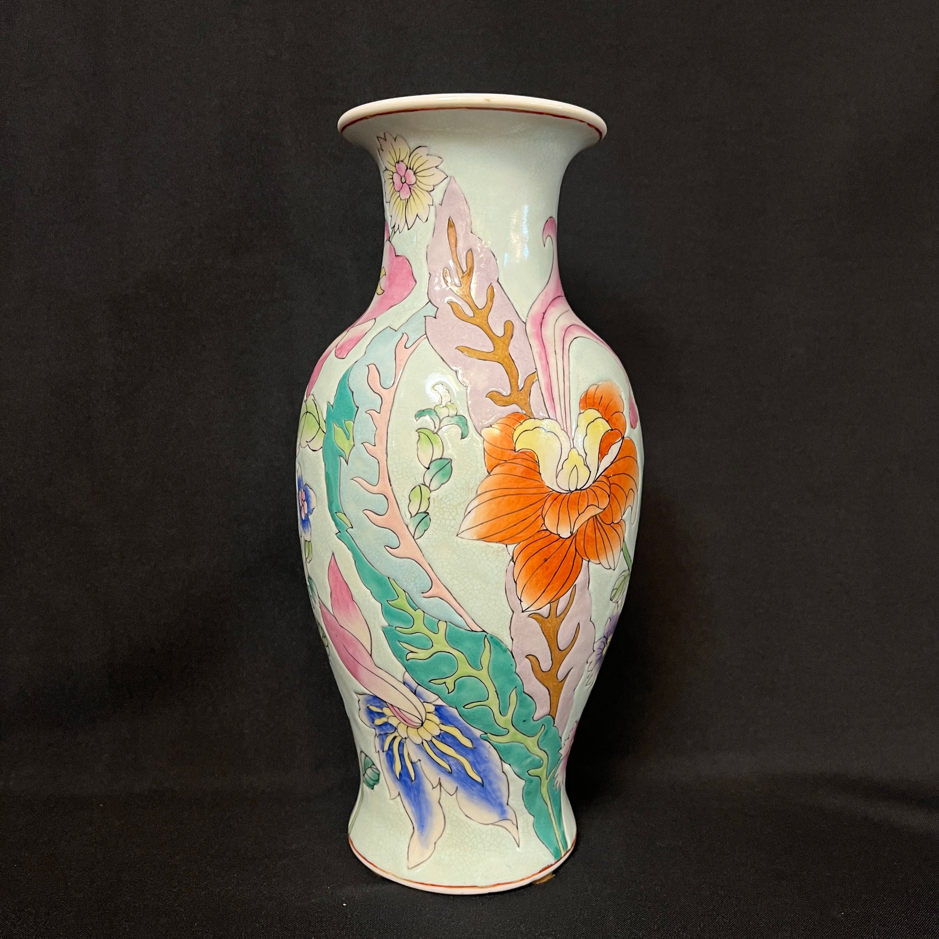 Este atractivo jarrón de porcelana chino, presenta un patrón floral con motivos de hojas y flores estilizadas, con un acabado esmaltado. Es utilizado comúnmente como pieza decorativa o florero.