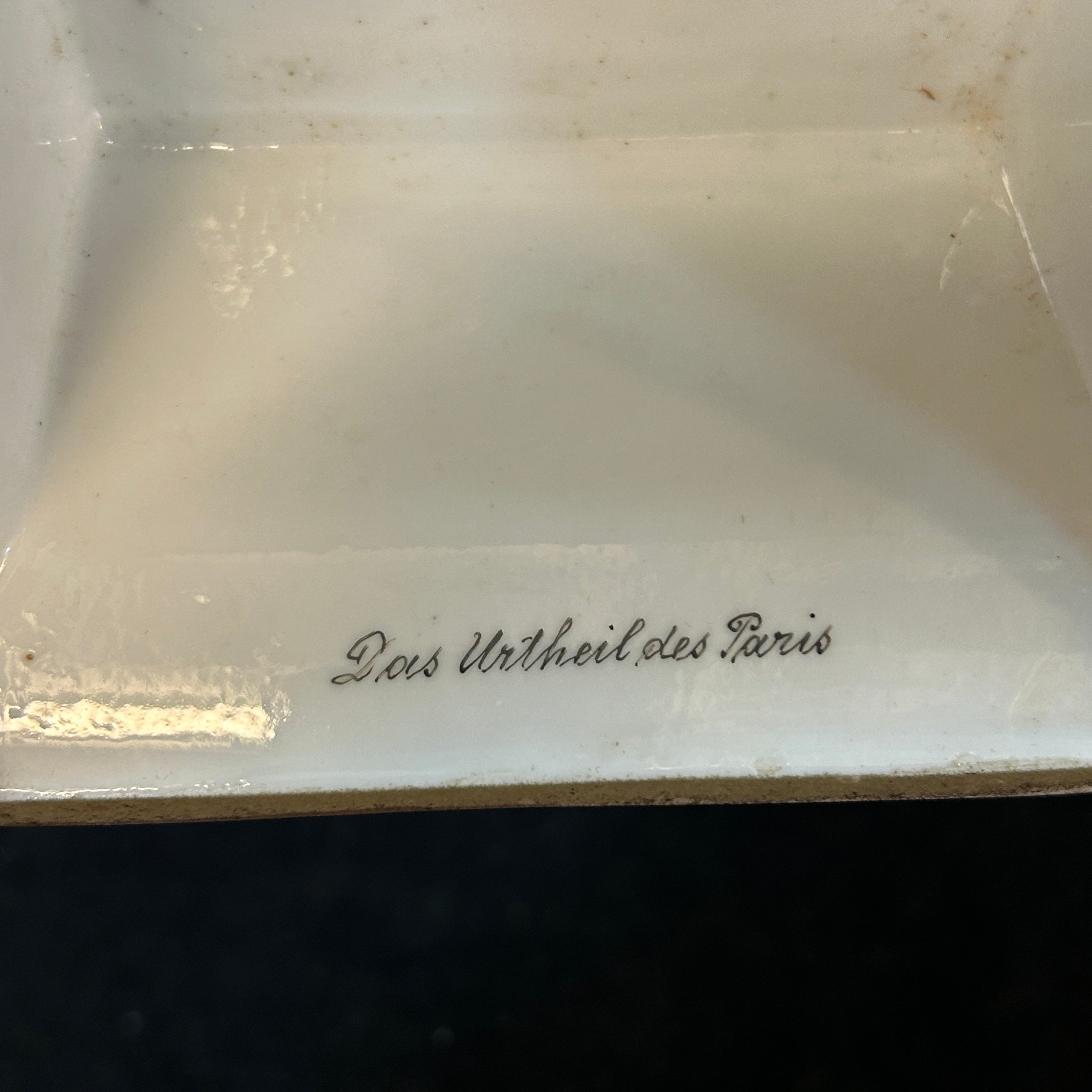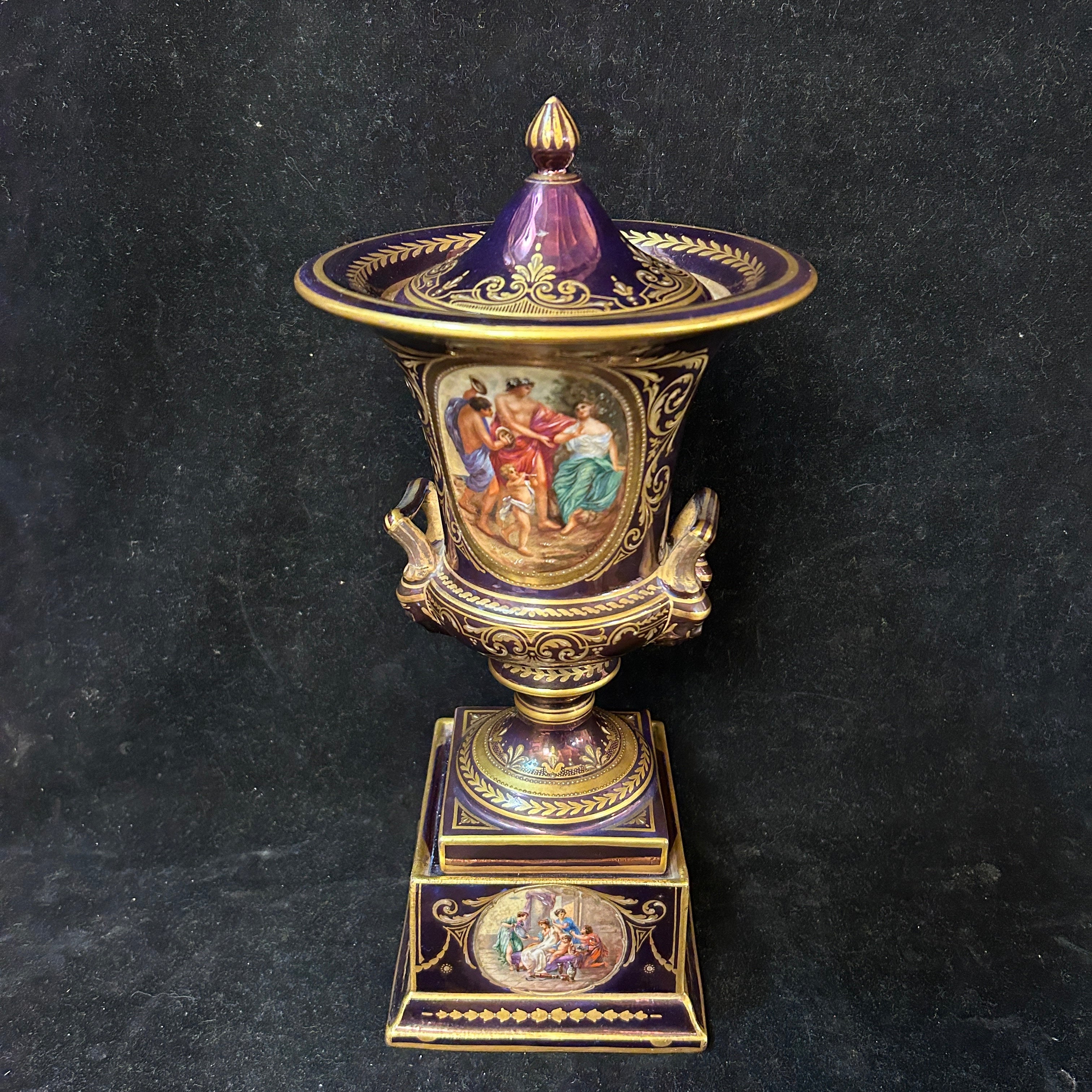 Bello jarrón urna de porcelana de Viena, hecho en Francia, esmaltado en un elegante púrpura con detalles dorados pintados a mano, con motivos de guirnaldas y escenas noclásicas, representando al Dios Baco, Dios romano de los placeres y la fiesta, con una ninfa. En su base la pieza tiene dos inscripciones: “Bachus hei der Nymphe”, indicando el contenido de las escenas, y “Das Urtheil des Paris”, indicando su fabricaciones en Francia.