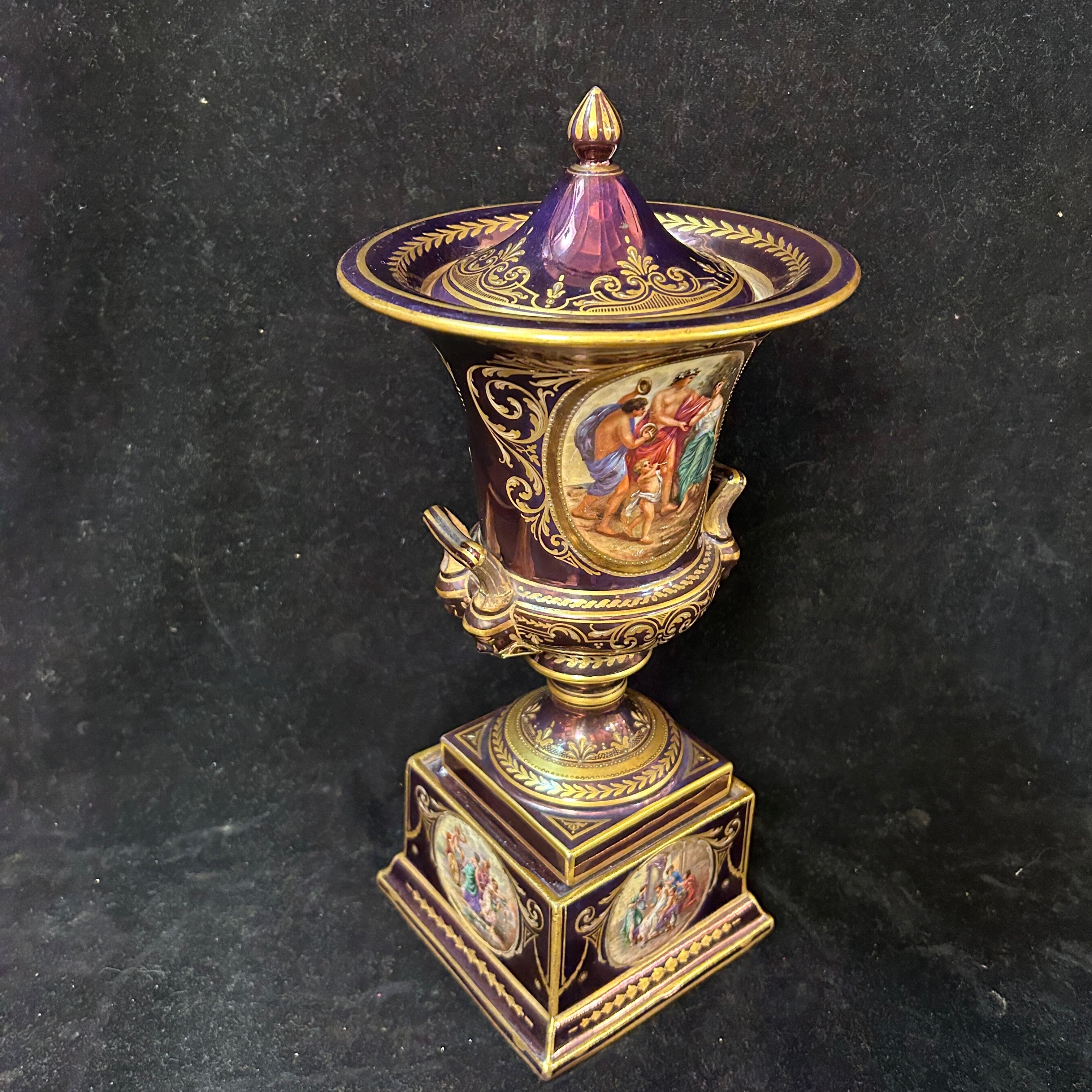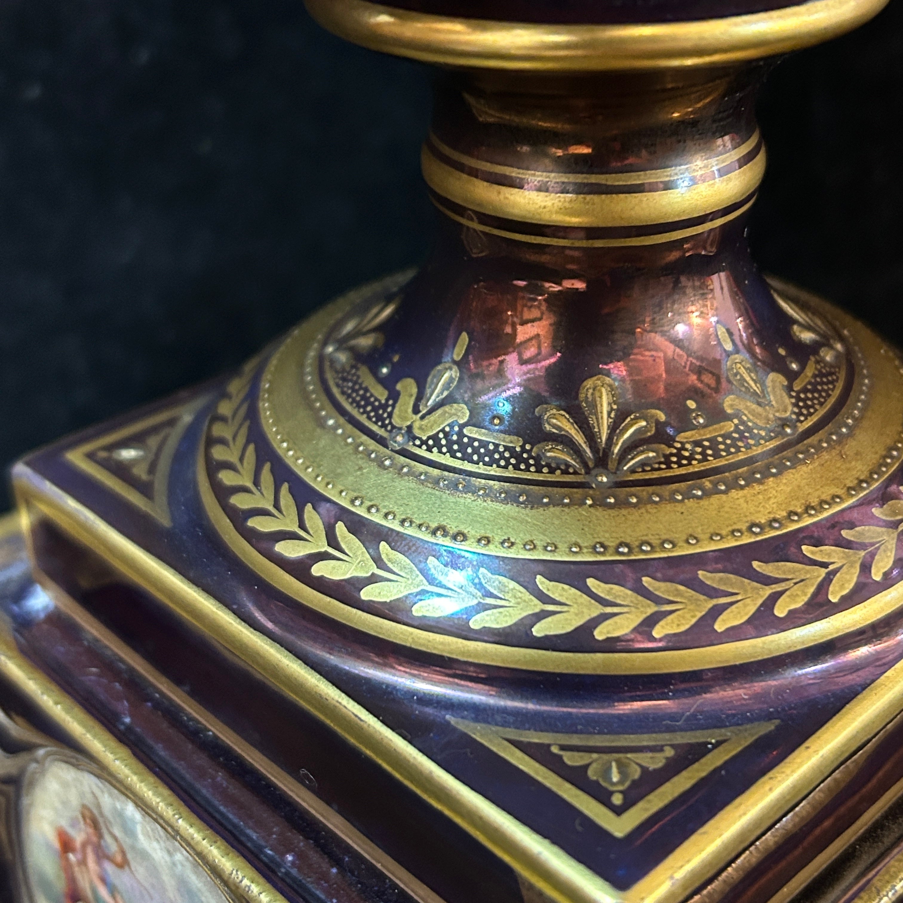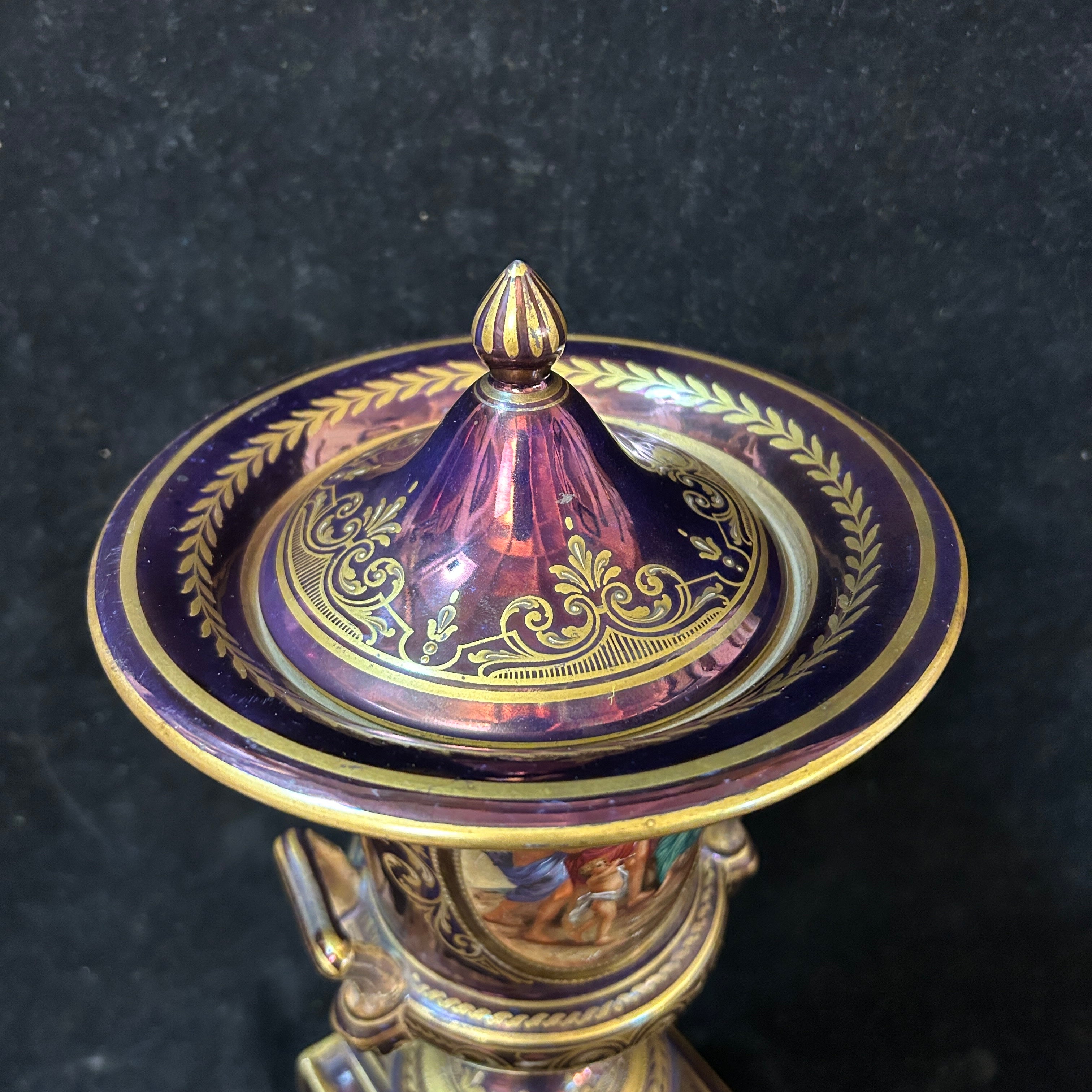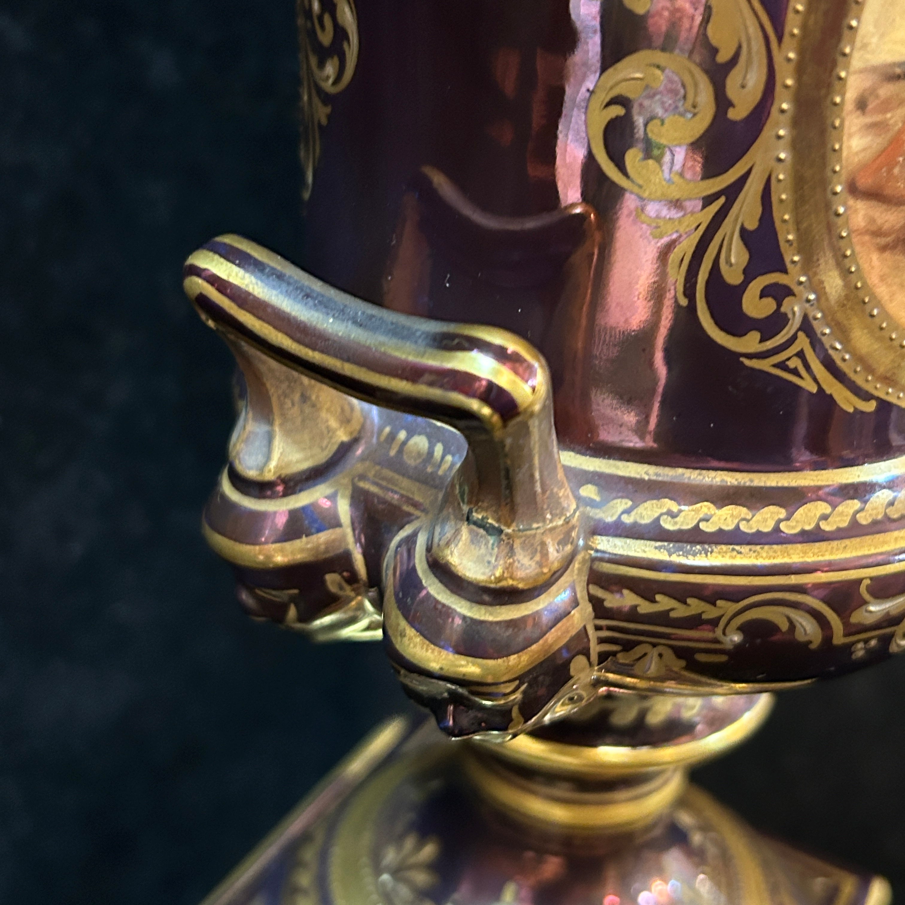 Jarrón urna de porcelana de Viena púrpura y decorados dorados “Baco y la Ninfa”