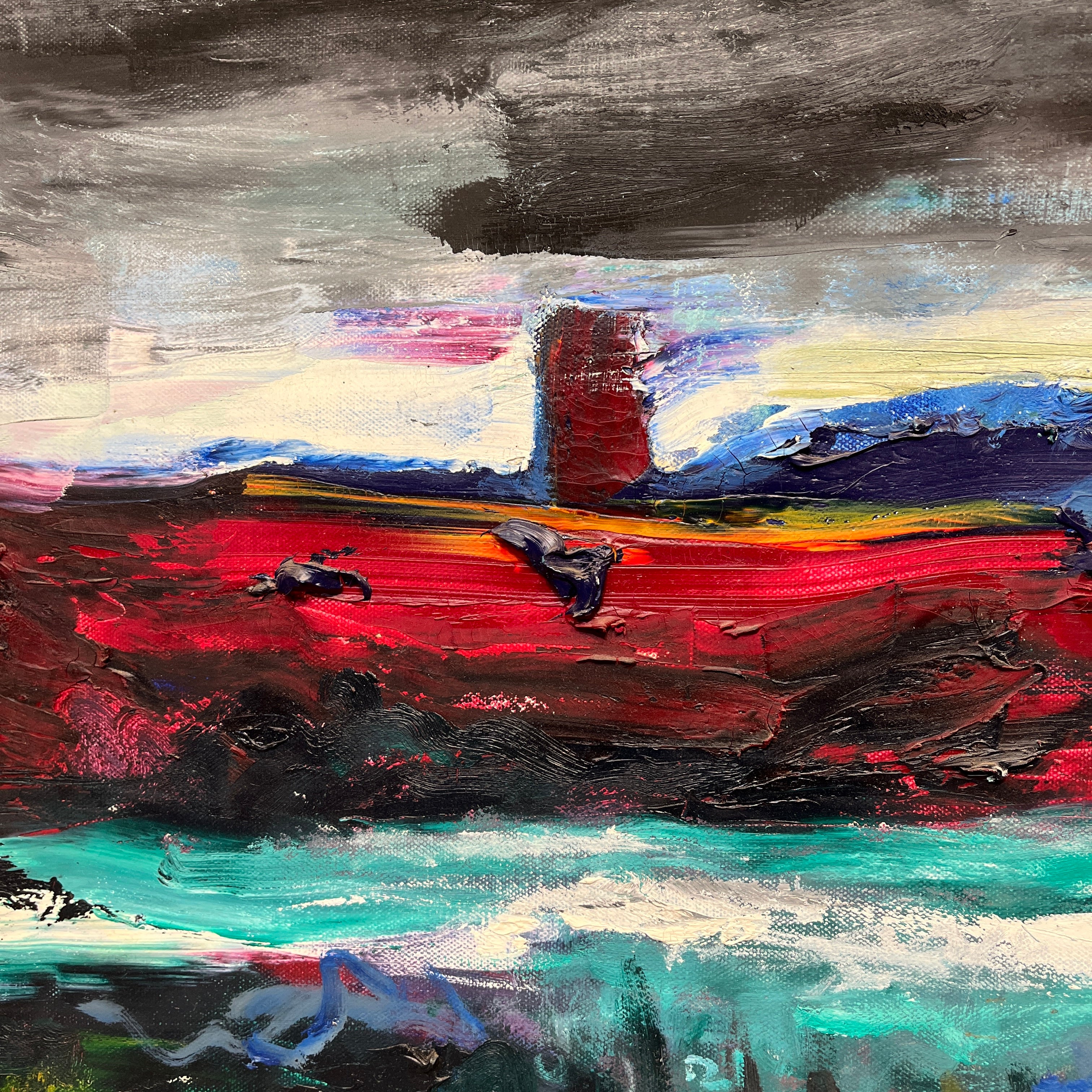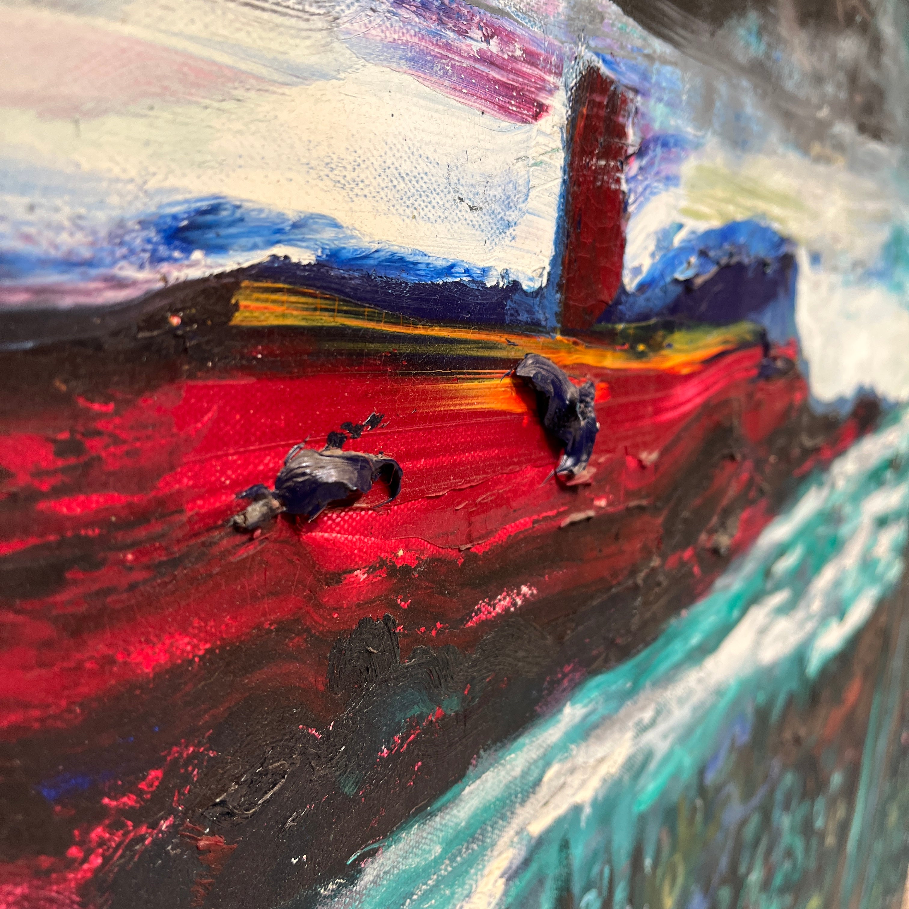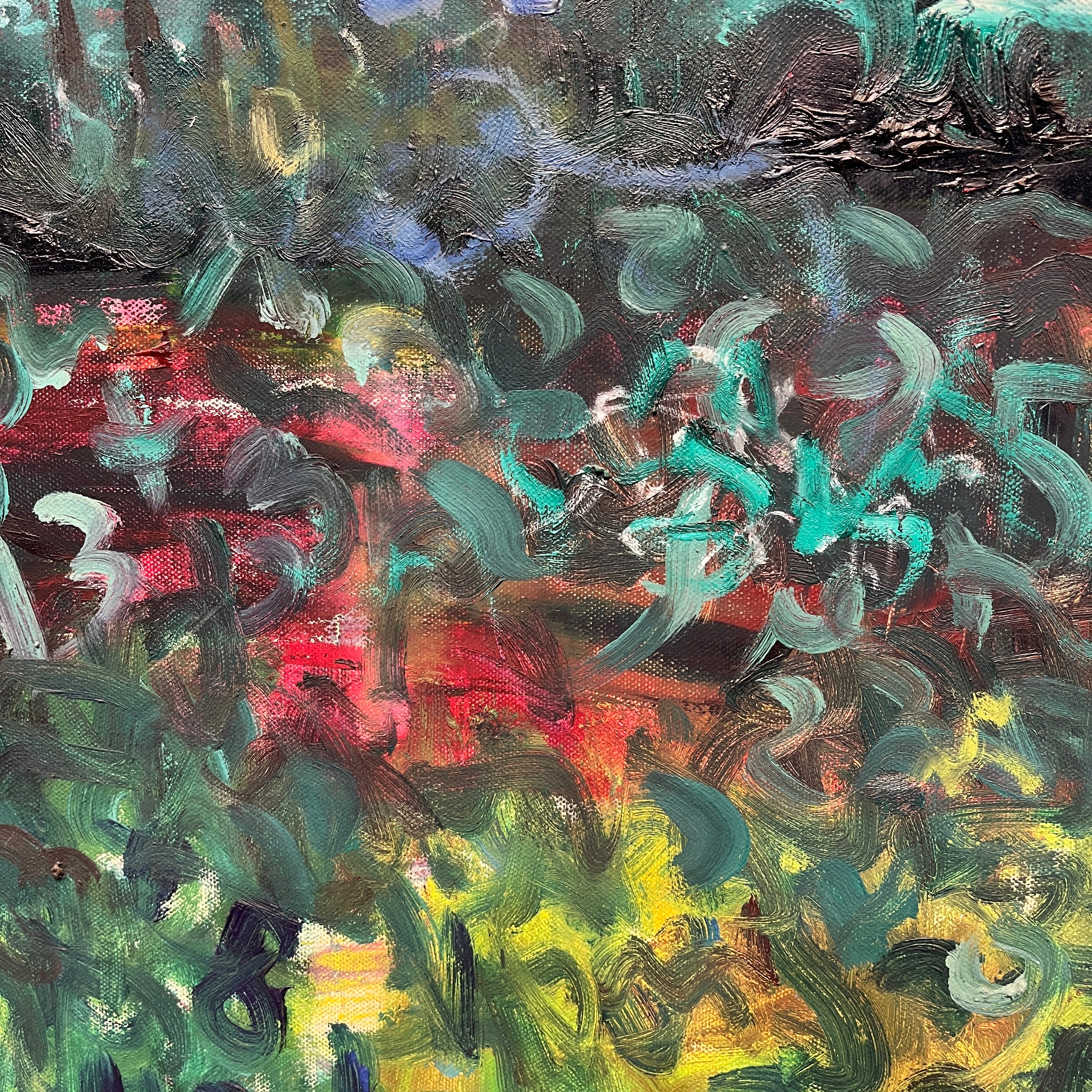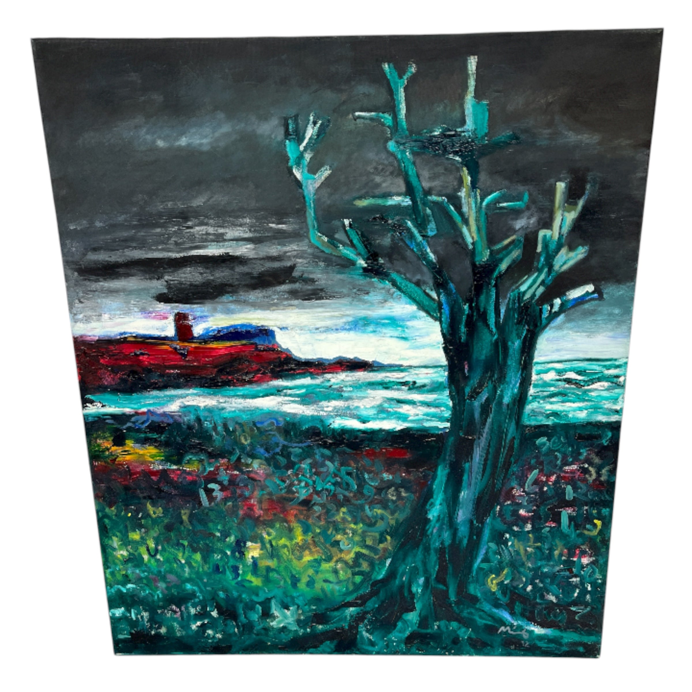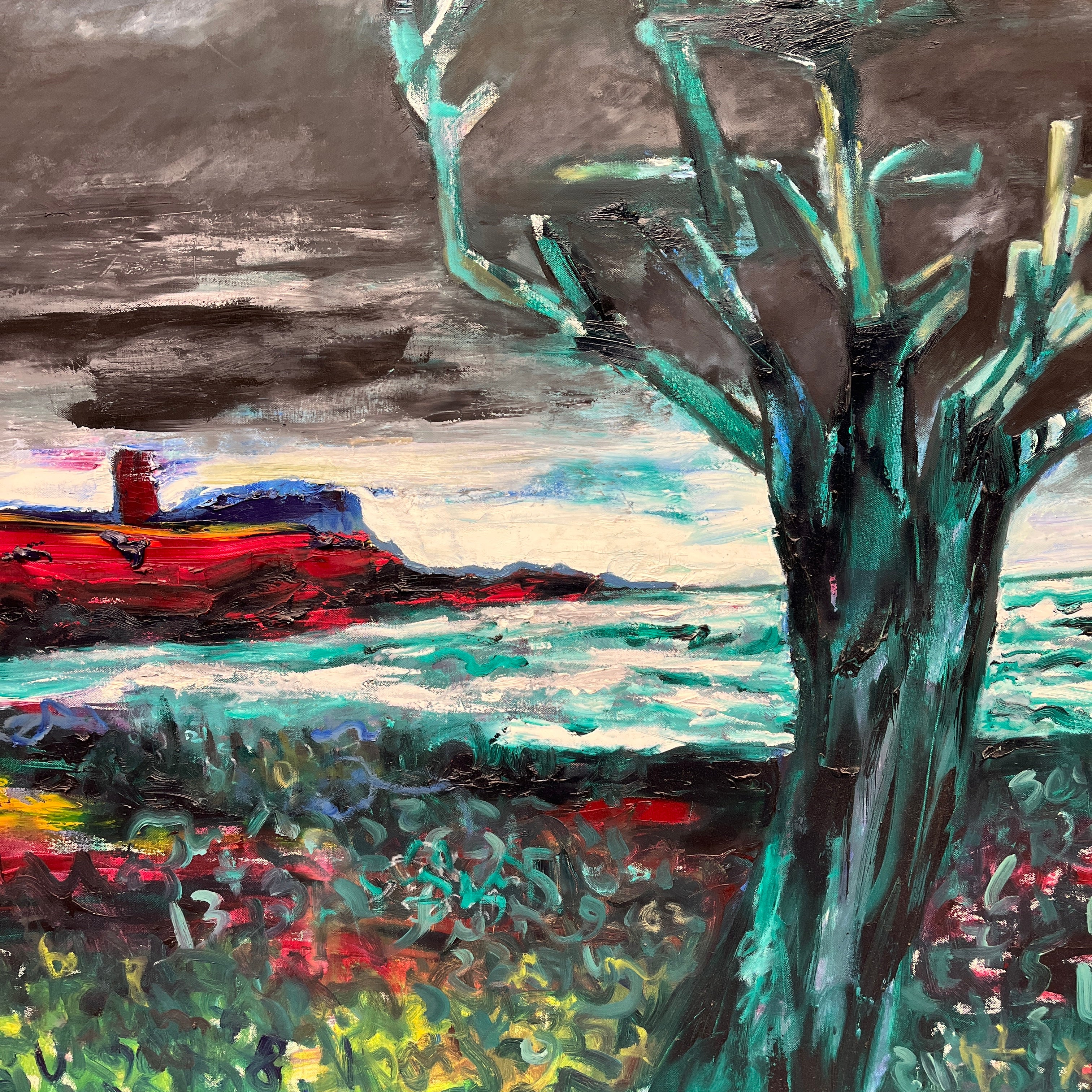 Óleo sobre tela del pintor chileno Luis Márquez P, representando un paisaje con un árbol sin hojas y un horizonte de cielo oscuro. La obra destaca por su elección de colores, que le da al paisaje un carácter onírico. Además, el pintor utiliza trazos cargados de materia que le dan relieve y textura al paisaje, haciendo el gesto de despegarse de la realidad incluso más excesivo.
