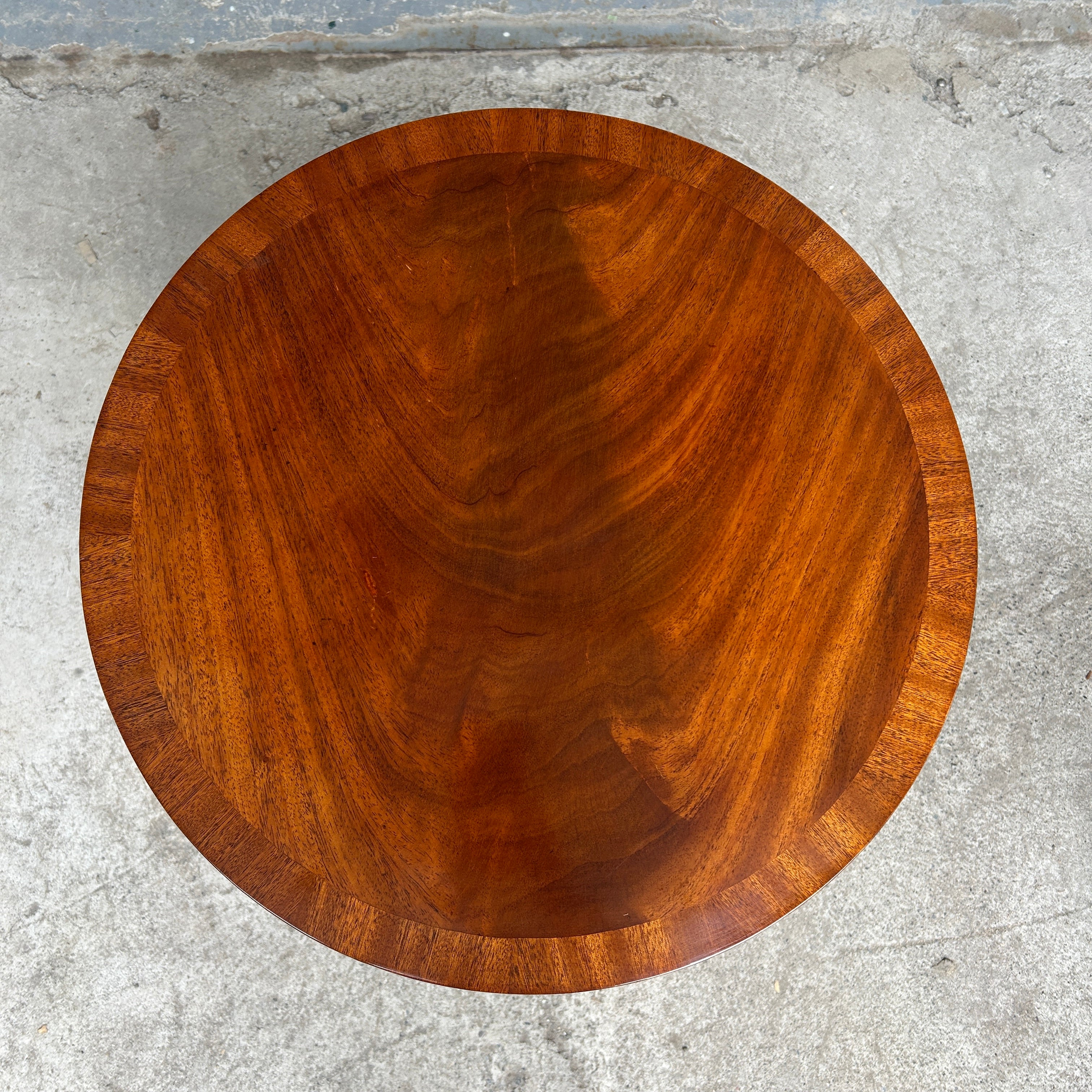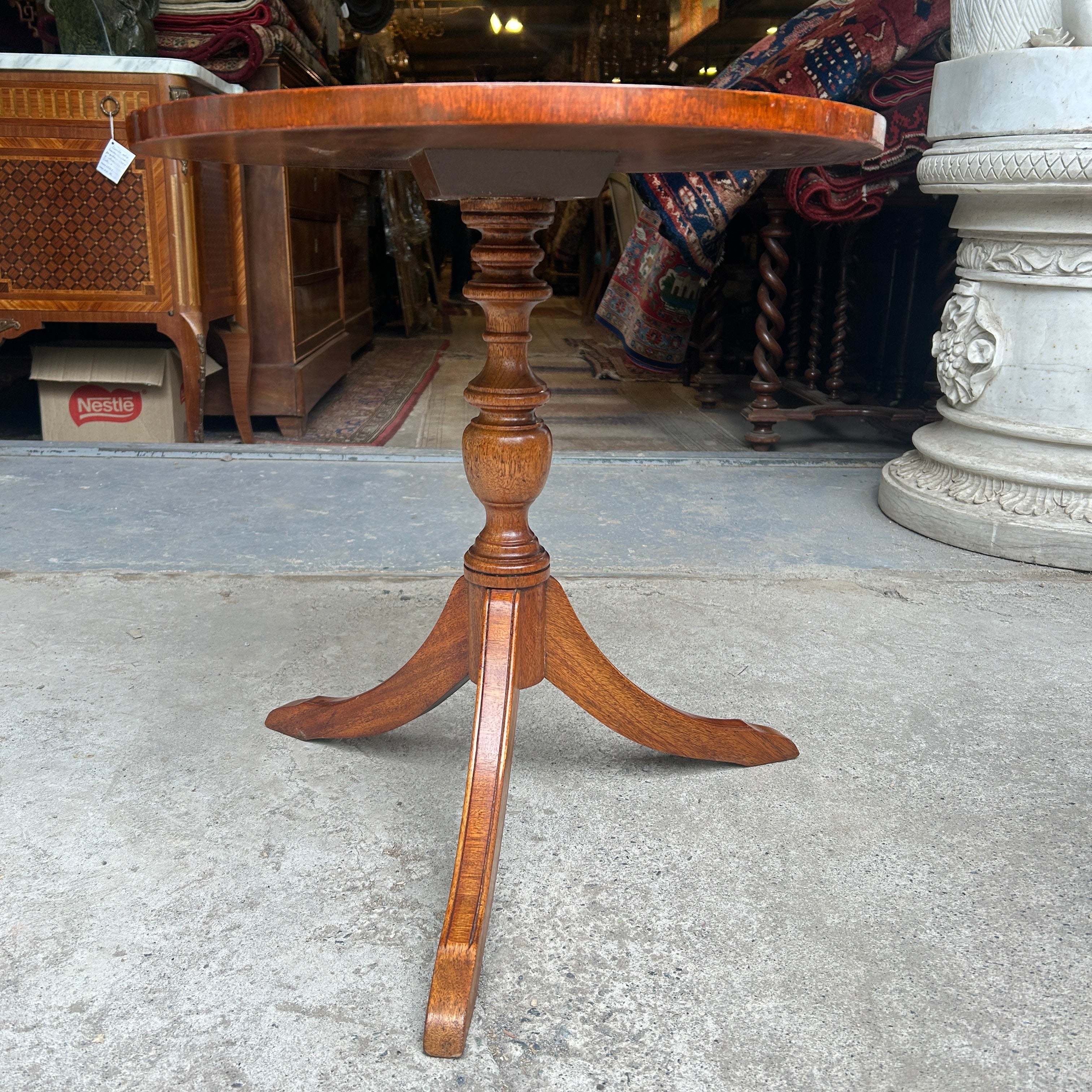 Bonita mesa lateral de apoyo de madera de caoba con cubierta circular y patas trípodes. Inglaterra, años 50.