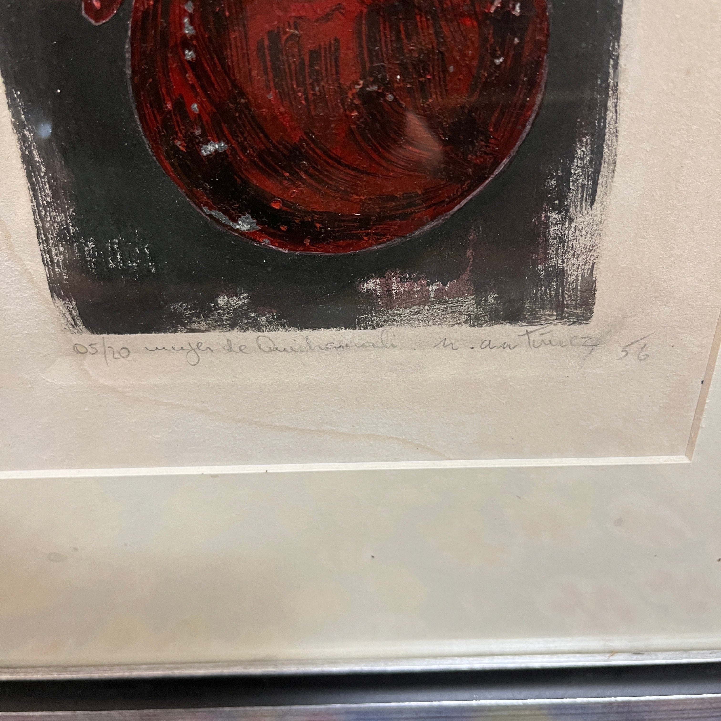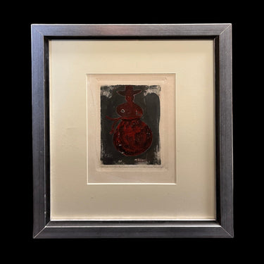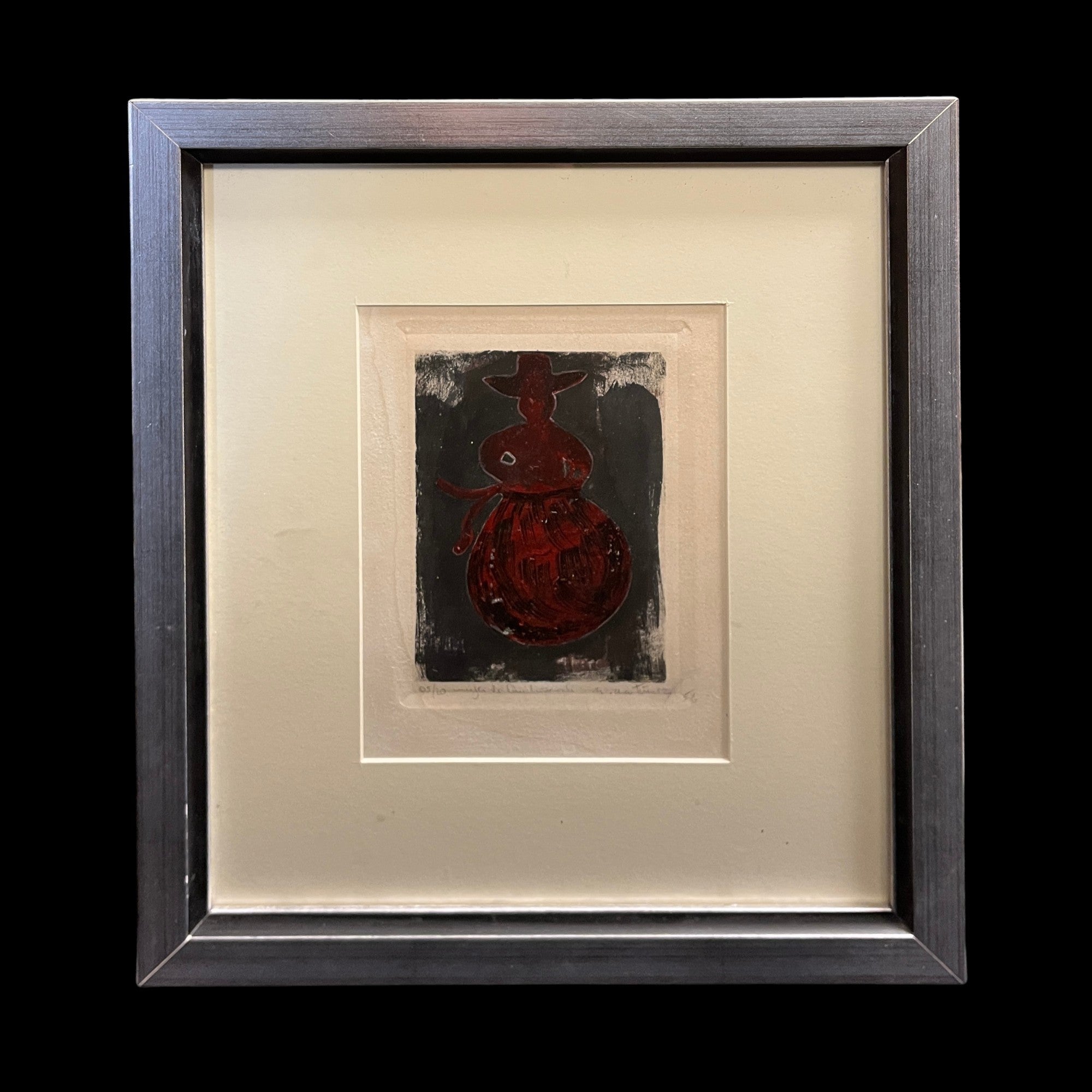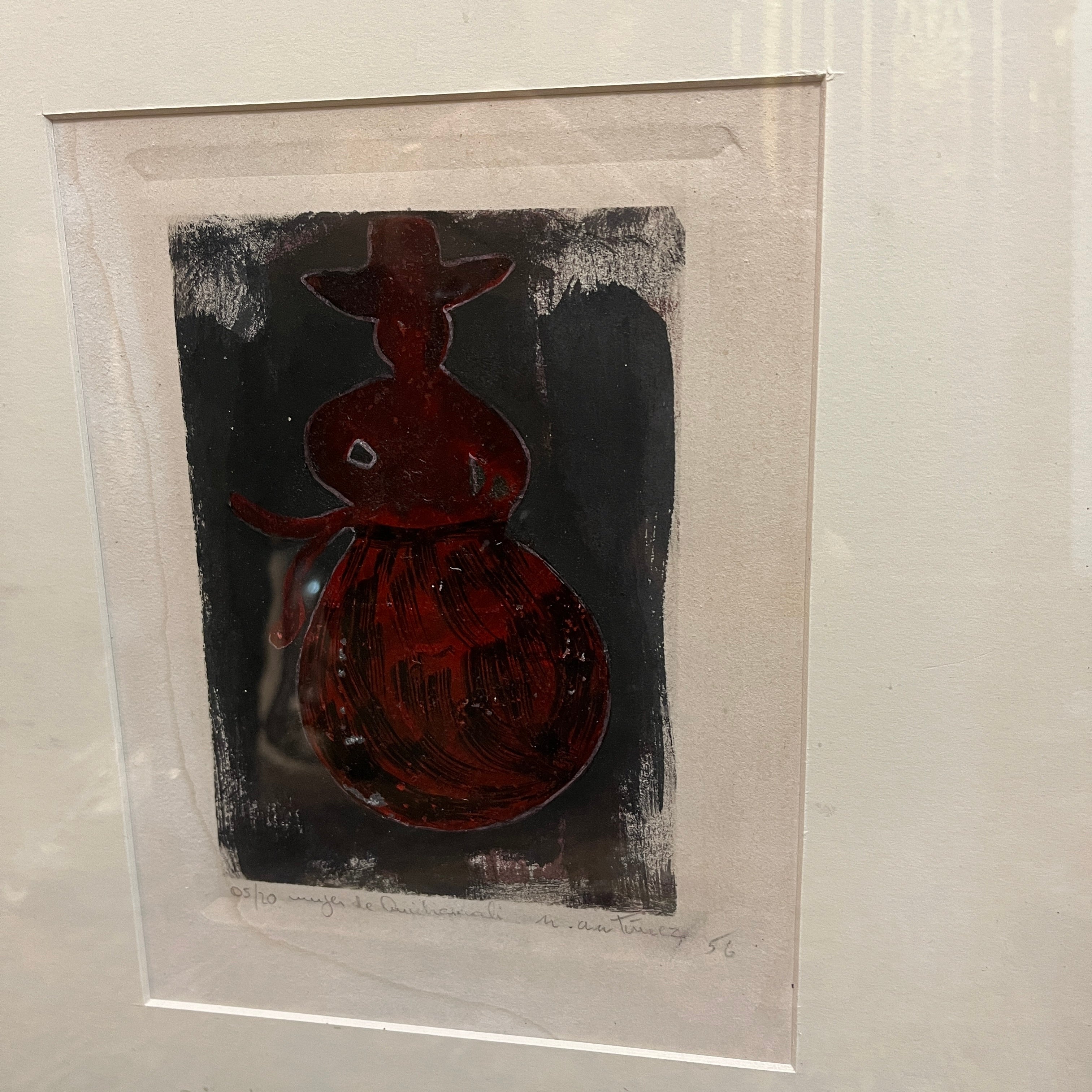 Grabado sobre papel, firmado y numerado con el ejemplar 5/20, del reconocido artista de origen chileno Nemesio Antúnez (1918-1993), representando una figura femenina con las formas de las figuras de greda de Quinchamalí. Esta forma, homenaje a la artesanía y patrimonio de esa zona de Chile, es típica de los grabados del artista, repitiéndose en varias de sus obras. En este caso, la figura en rojo sobre un fondo negro, presenta la textura imperfecta y artesanal de la técnica de impresión, dándole su carácter único. La obra está enmarcada en madera terminada en pintura plateada.