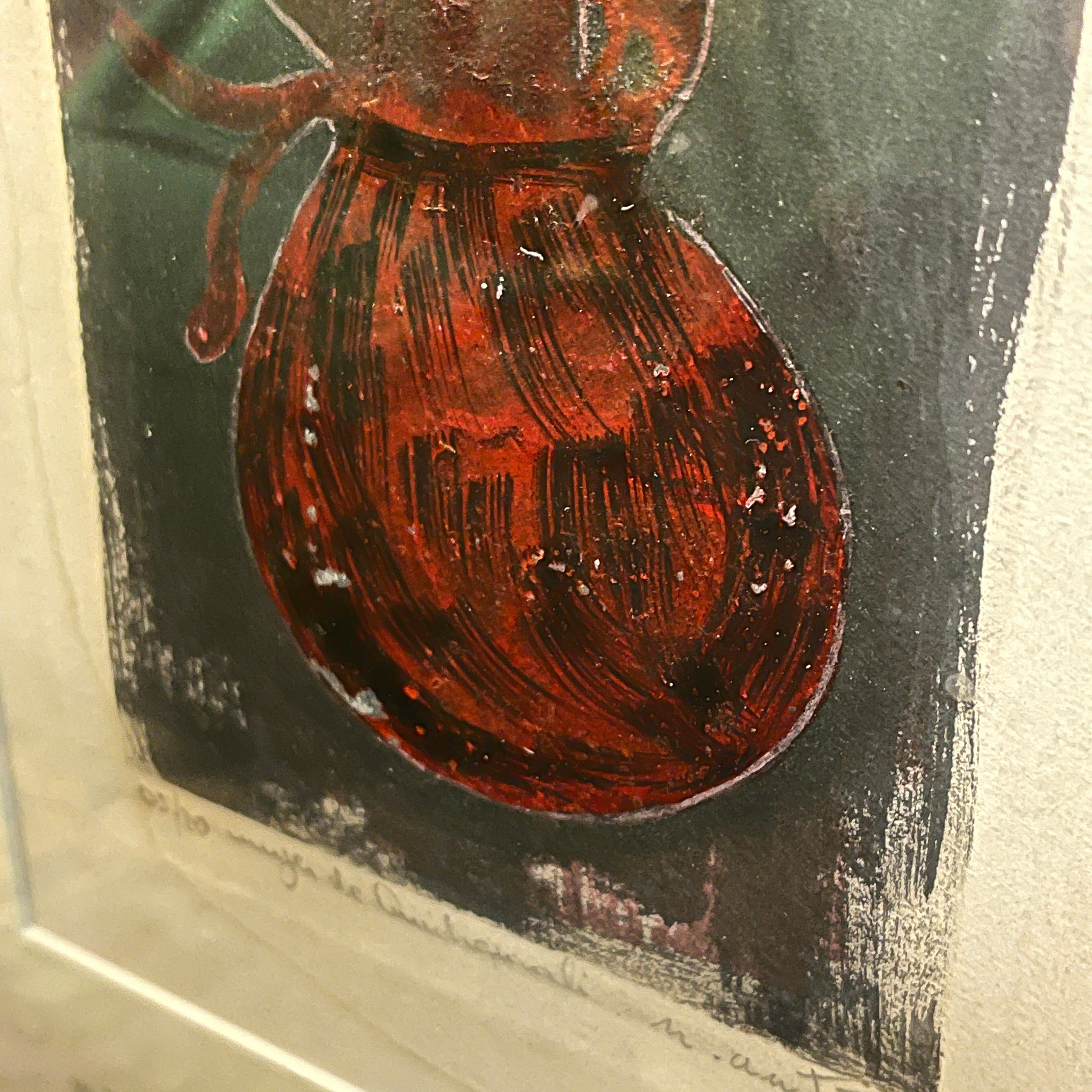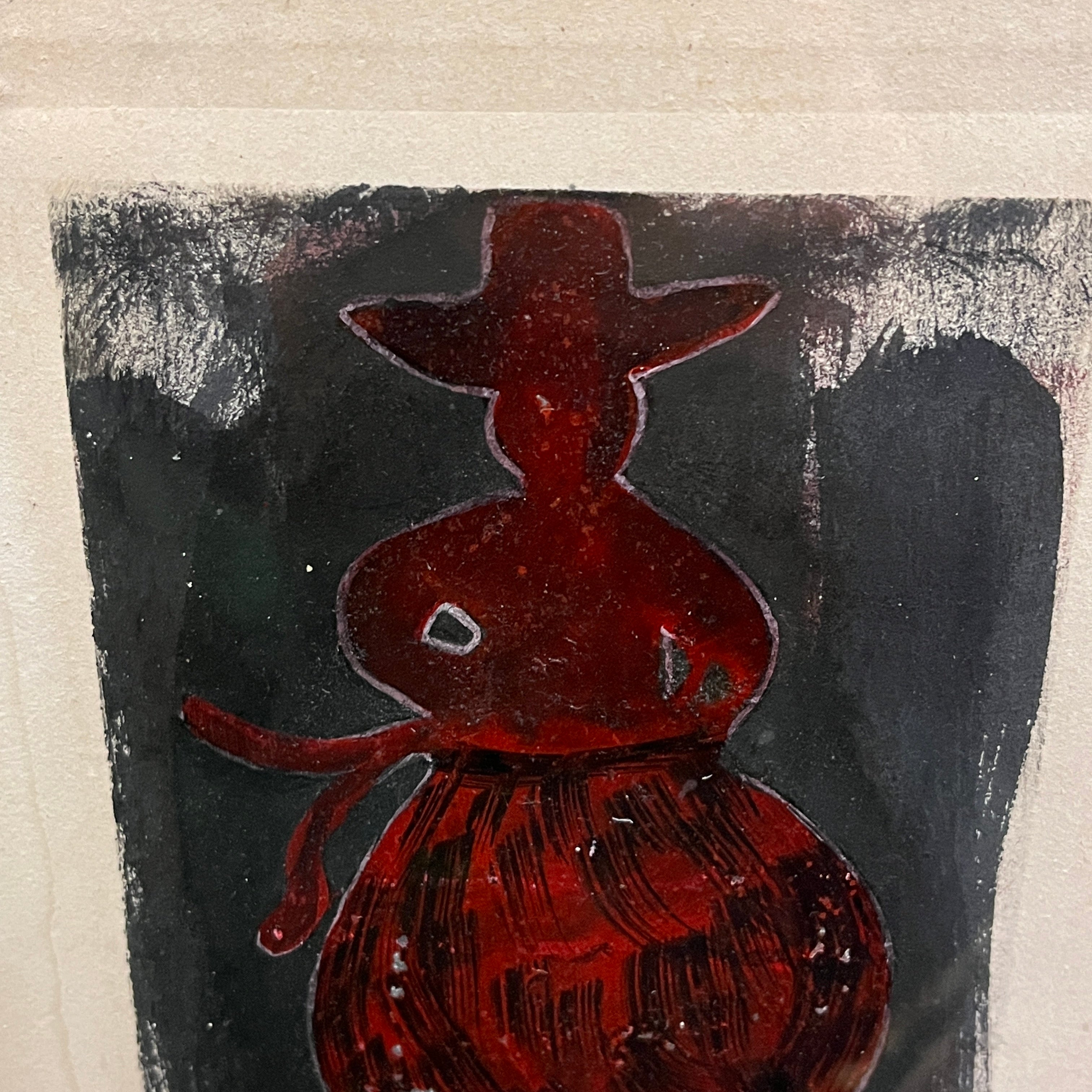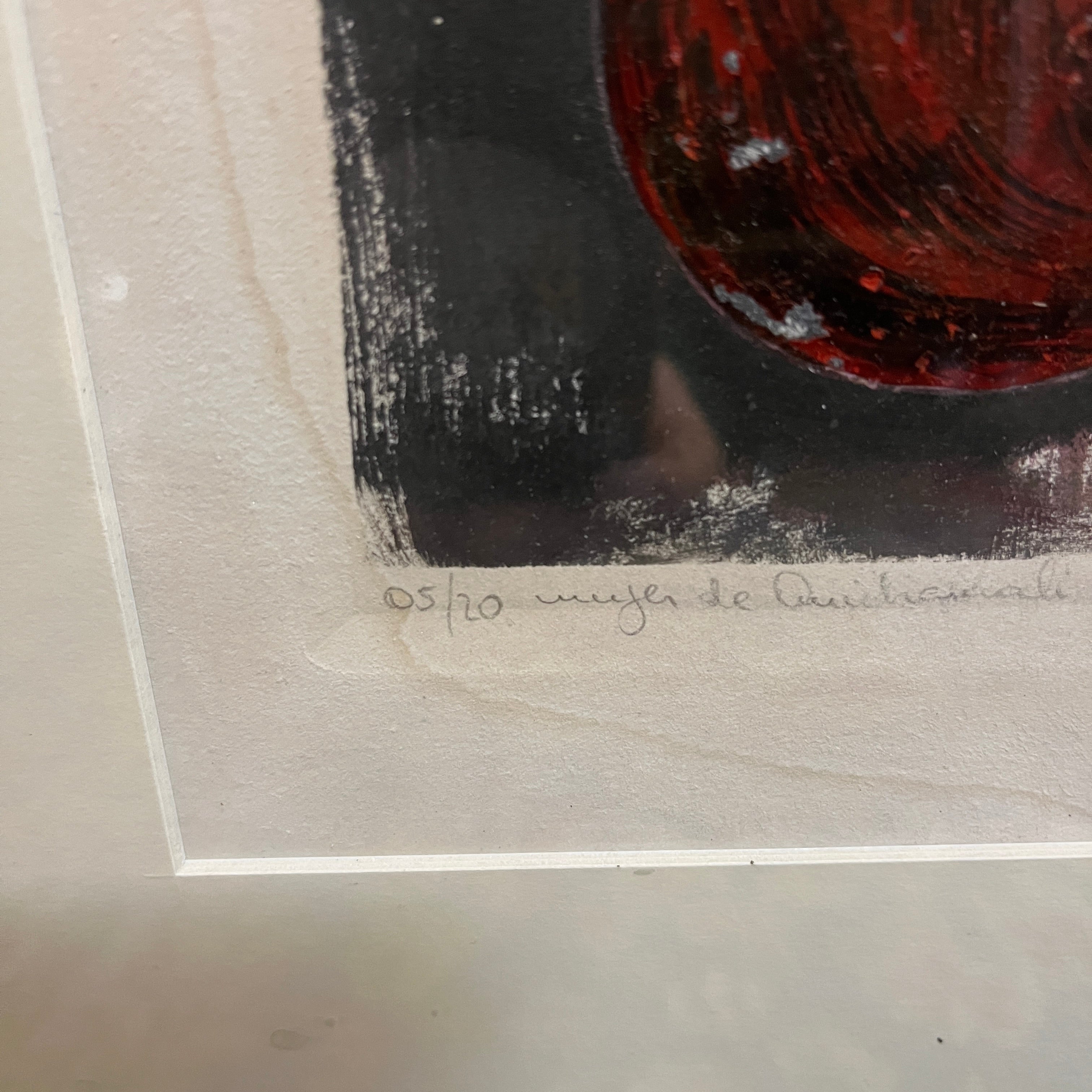 Grabado sobre papel, firmado y numerado con el ejemplar 5/20, del reconocido artista de origen chileno Nemesio Antúnez (1918-1993), representando una figura femenina con las formas de las figuras de greda de Quinchamalí. Esta forma, homenaje a la artesanía y patrimonio de esa zona de Chile, es típica de los grabados del artista, repitiéndose en varias de sus obras. En este caso, la figura en rojo sobre un fondo negro, presenta la textura imperfecta y artesanal de la técnica de impresión, dándole su carácter único. La obra está enmarcada en madera terminada en pintura plateada.