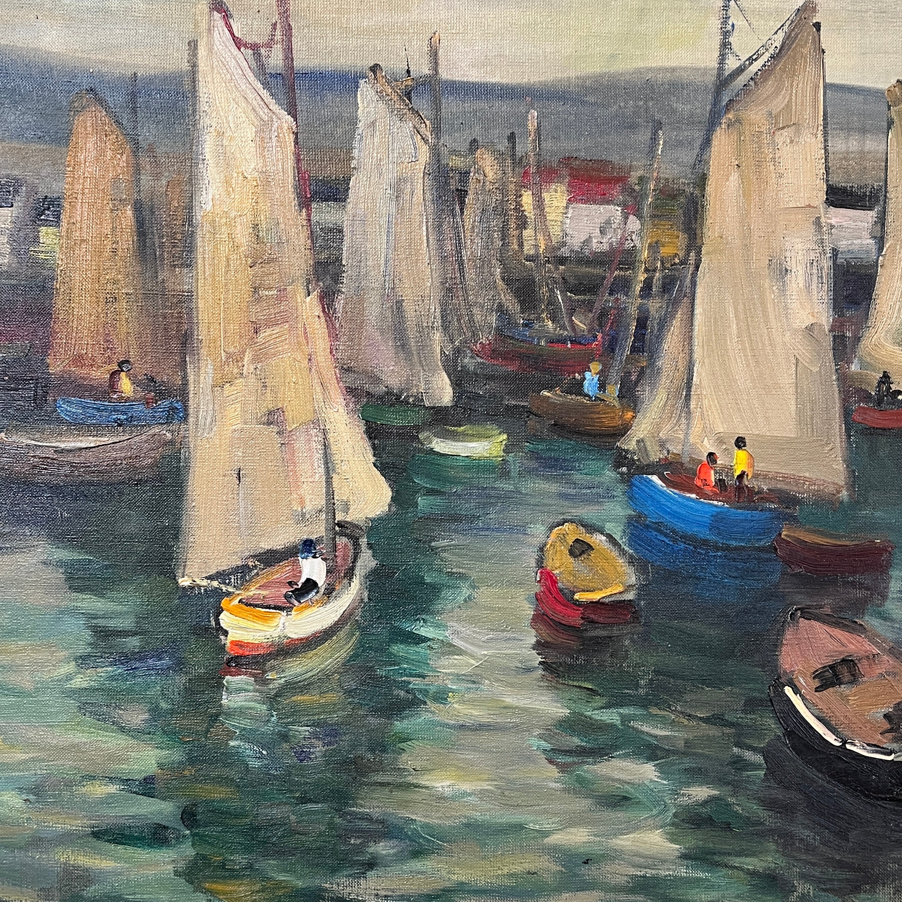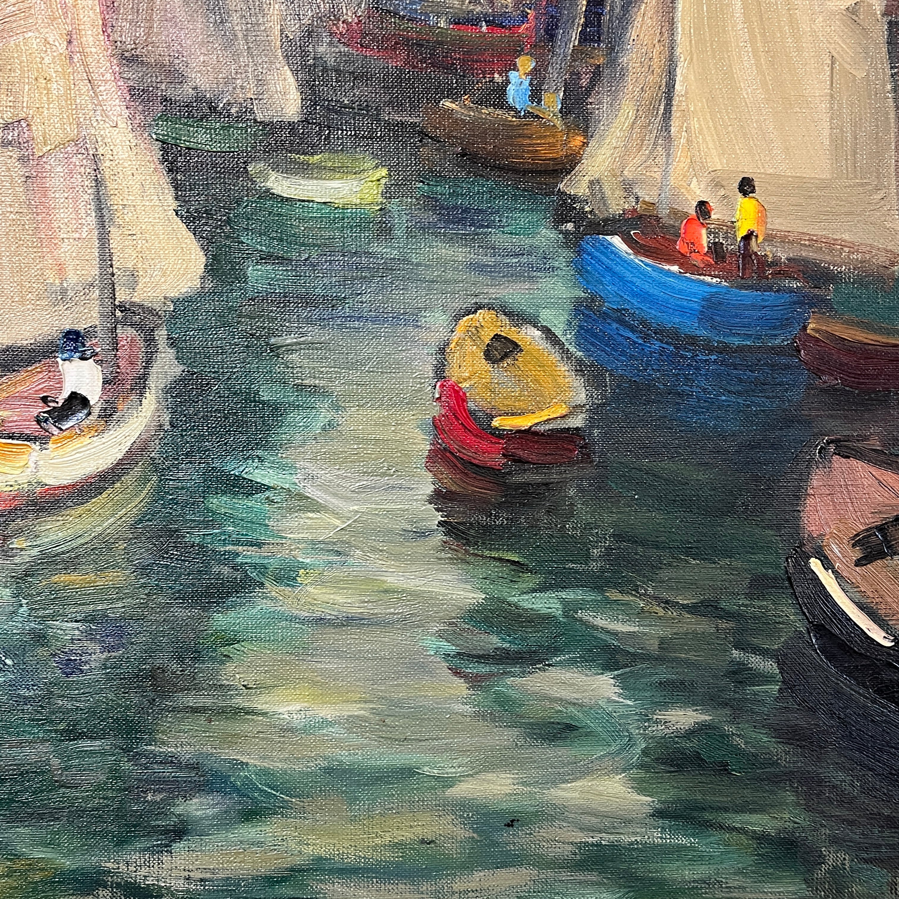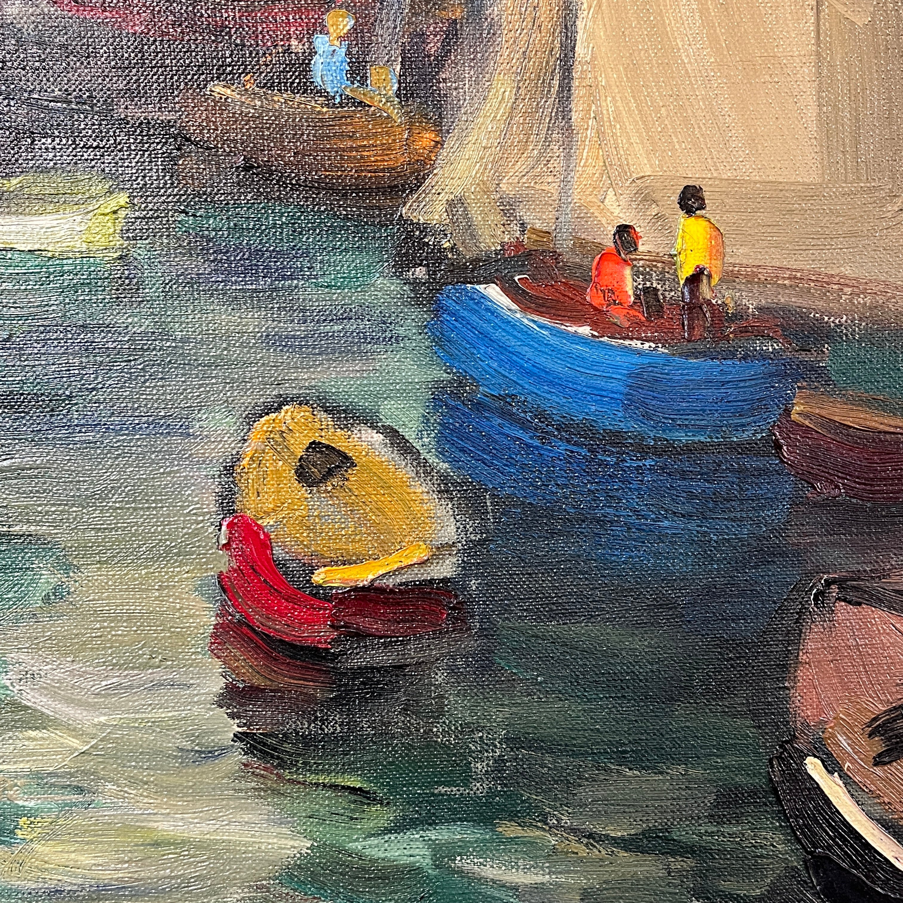 Hermoso óleo del artista chileno Pacheco Altamirano de un colorido muelle con sus respectivas embarcaciones detenidas y pescadores dentro de ellas trabajando.
