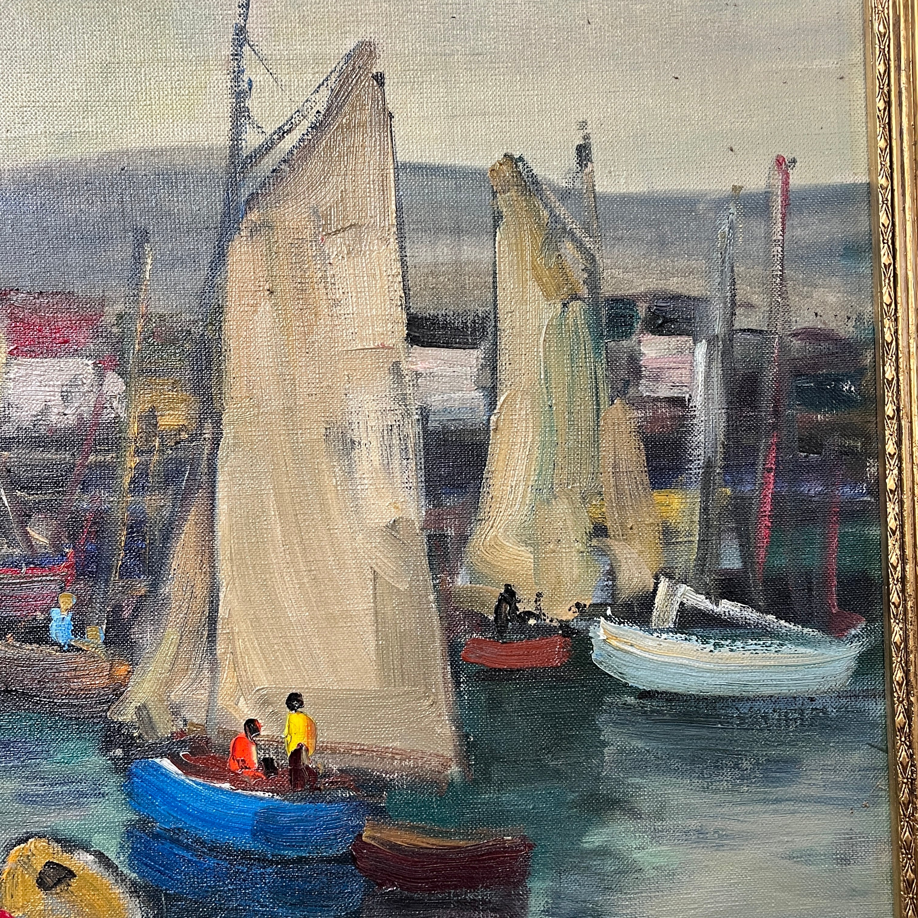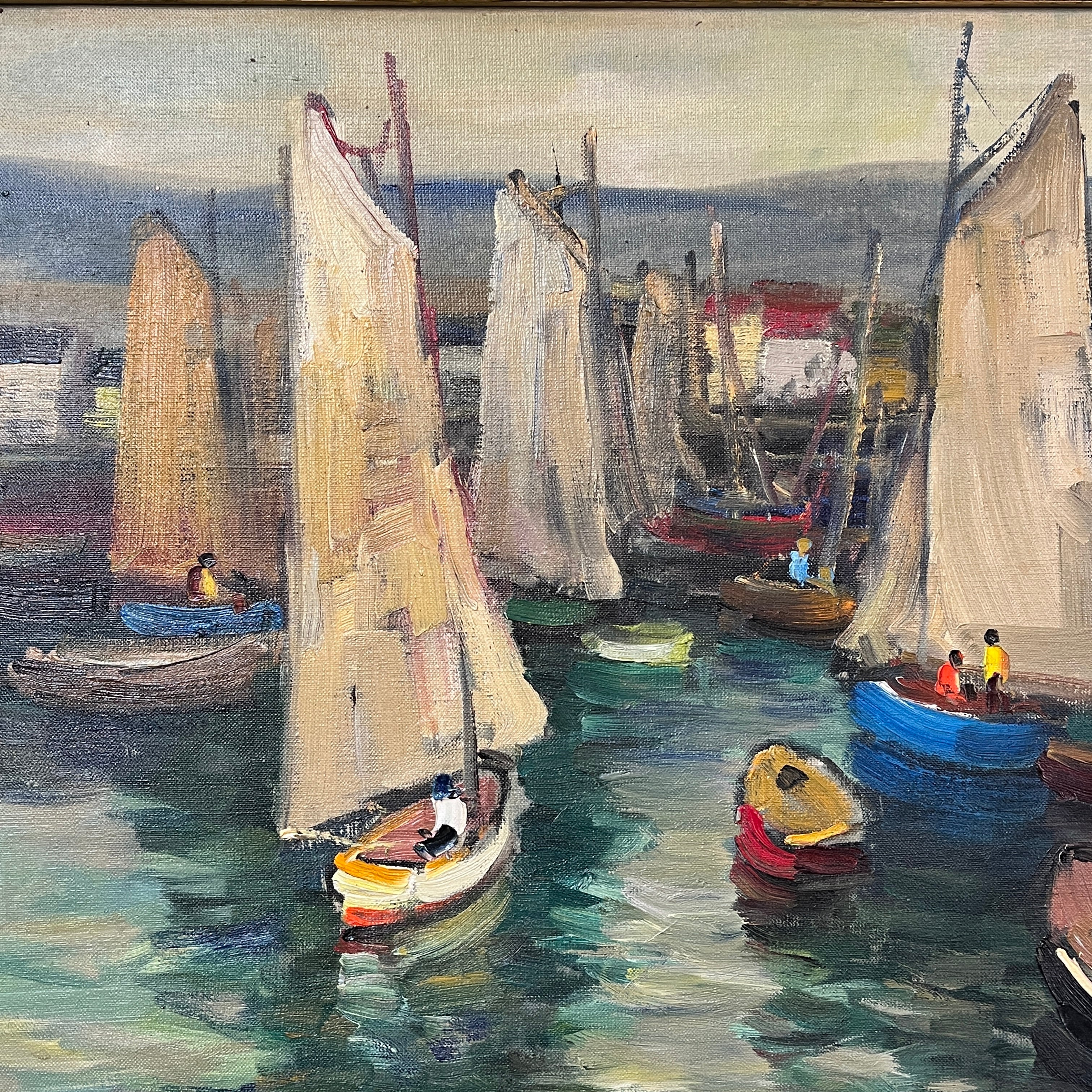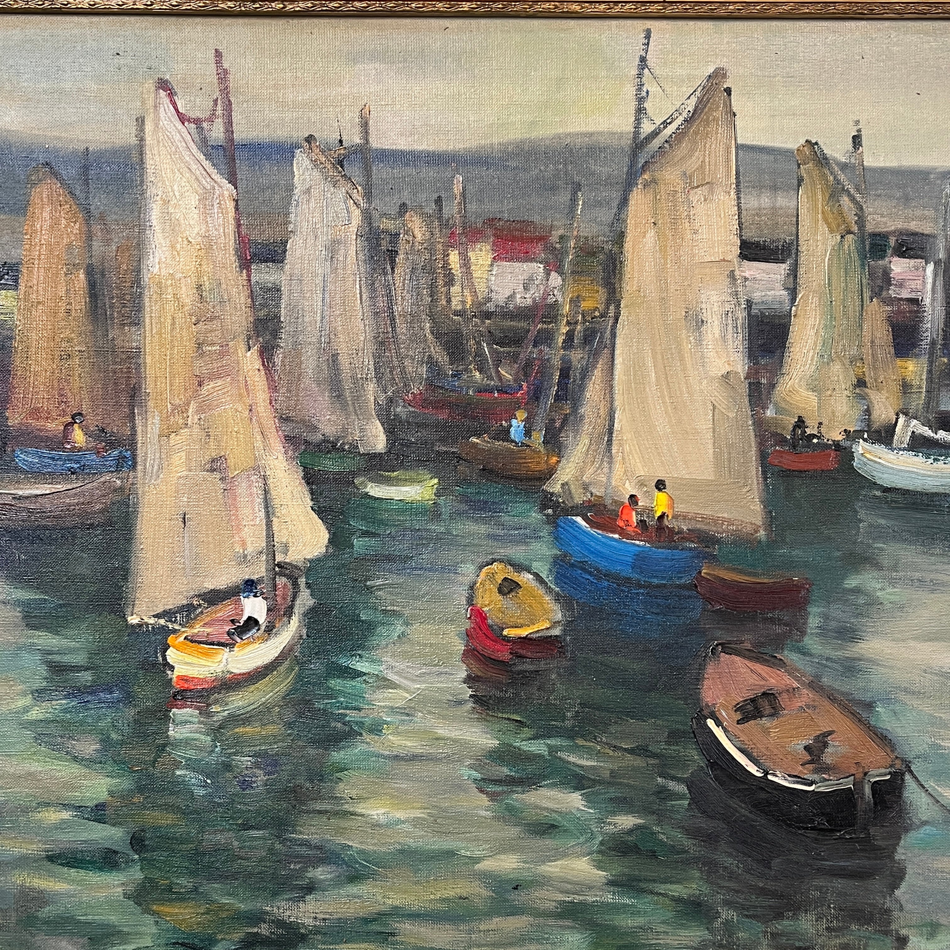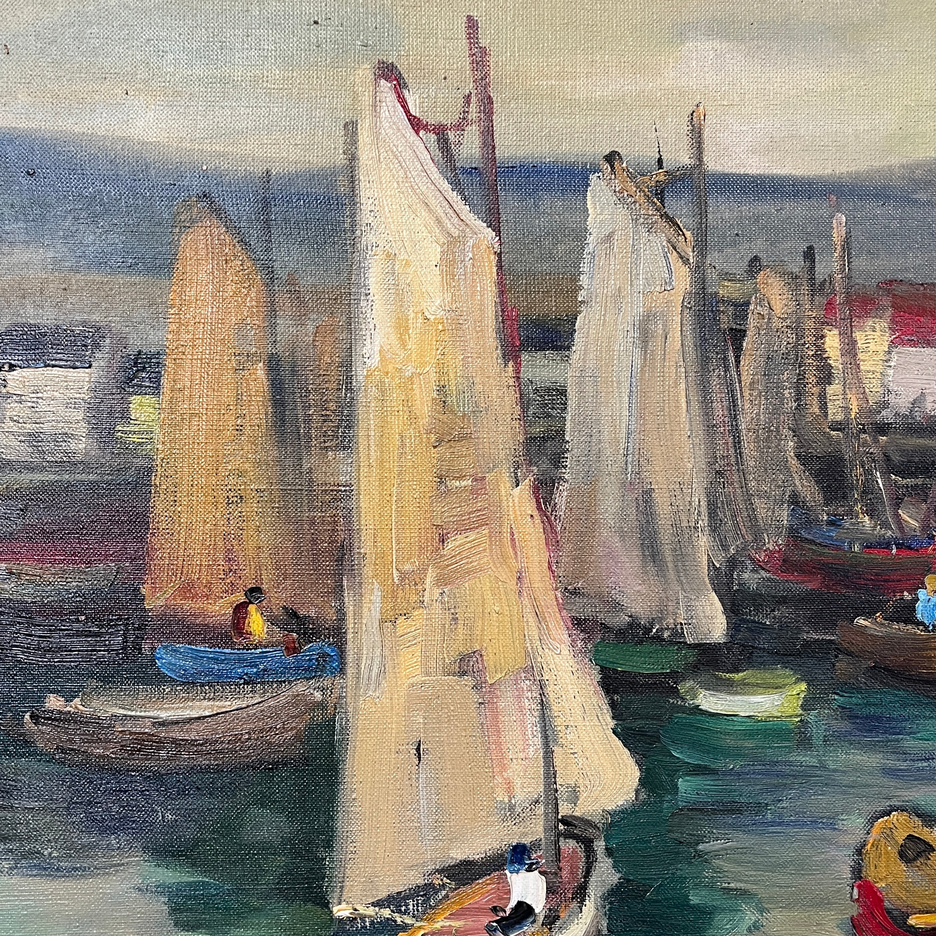 Hermoso óleo del artista chileno Pacheco Altamirano de un colorido muelle con sus respectivas embarcaciones detenidas y pescadores dentro de ellas trabajando.