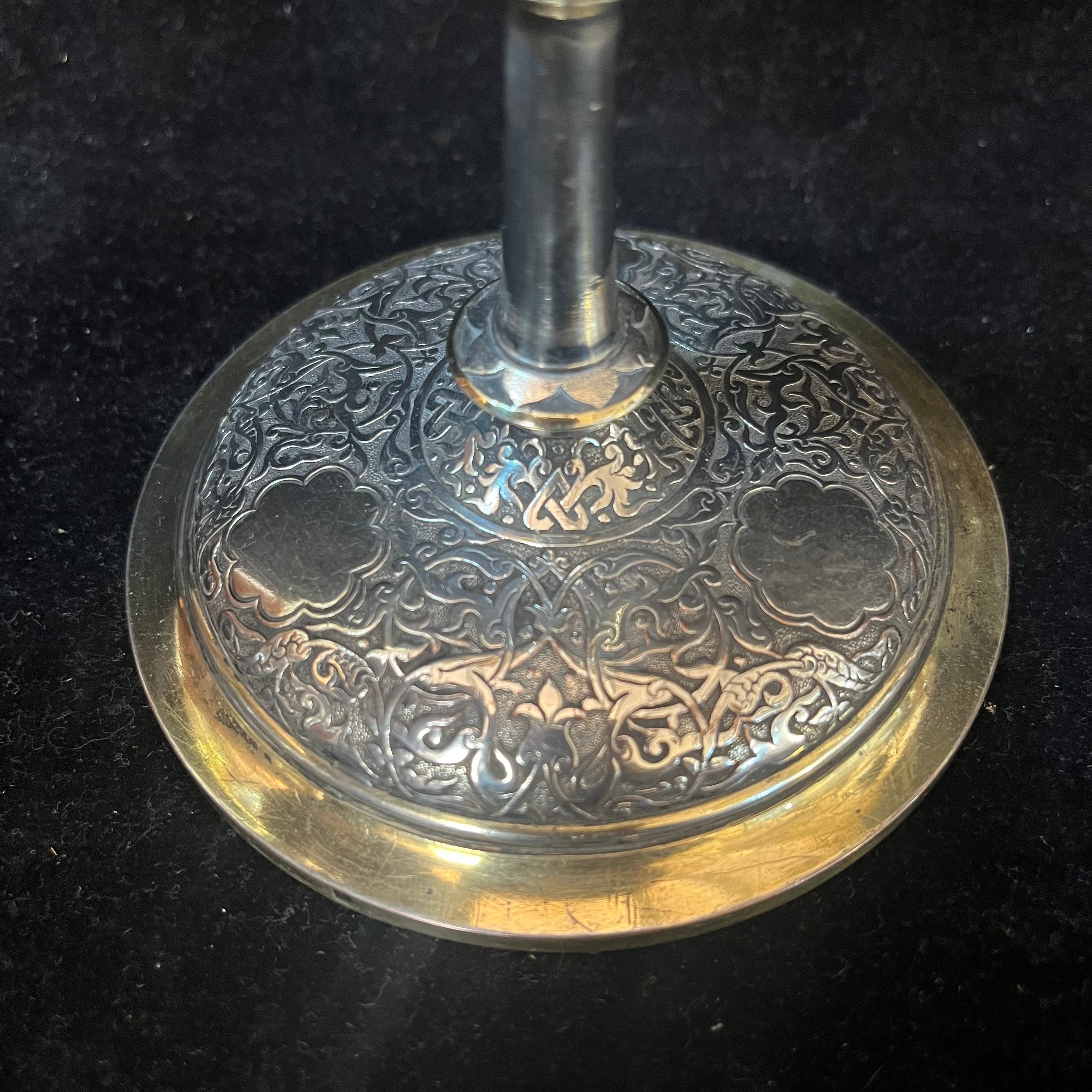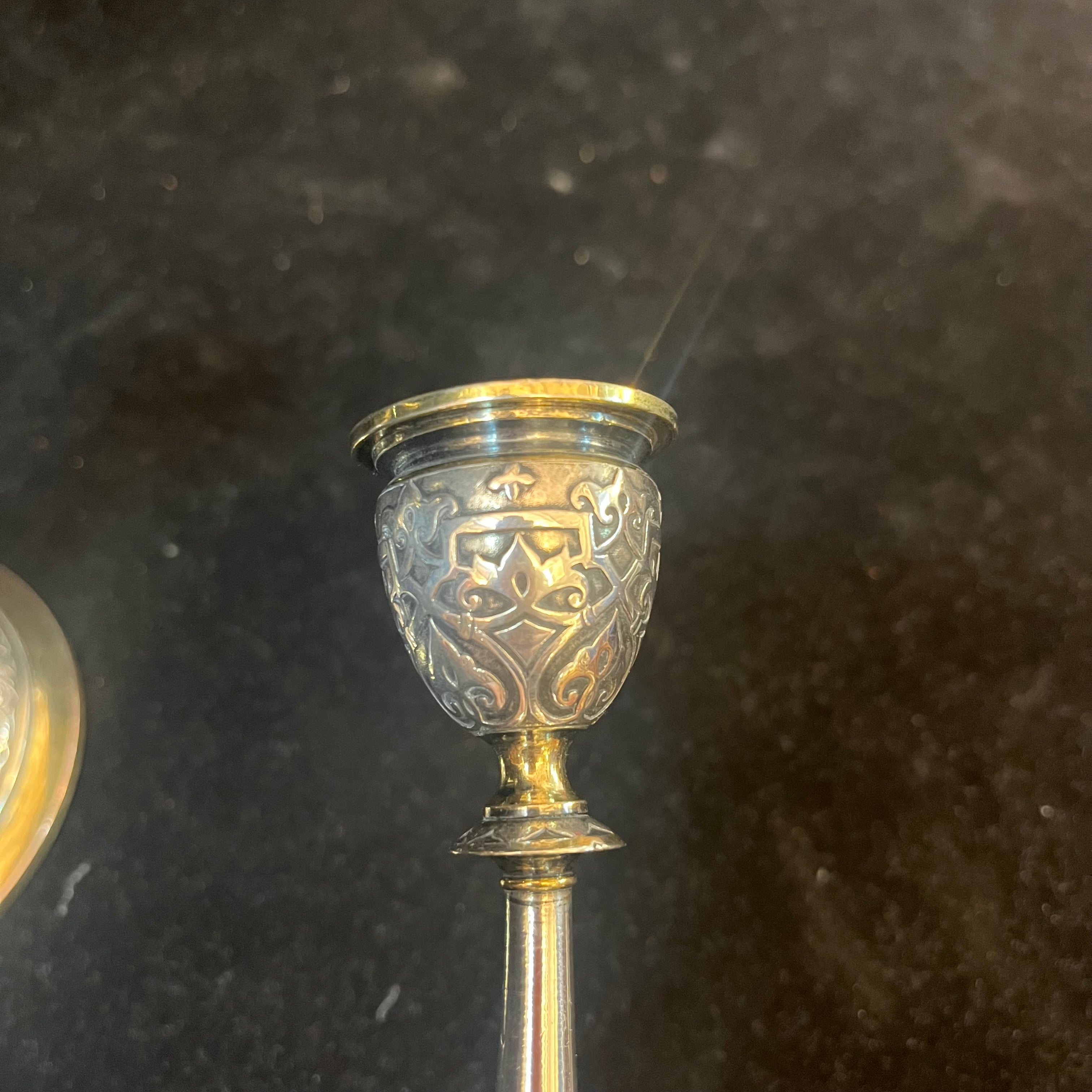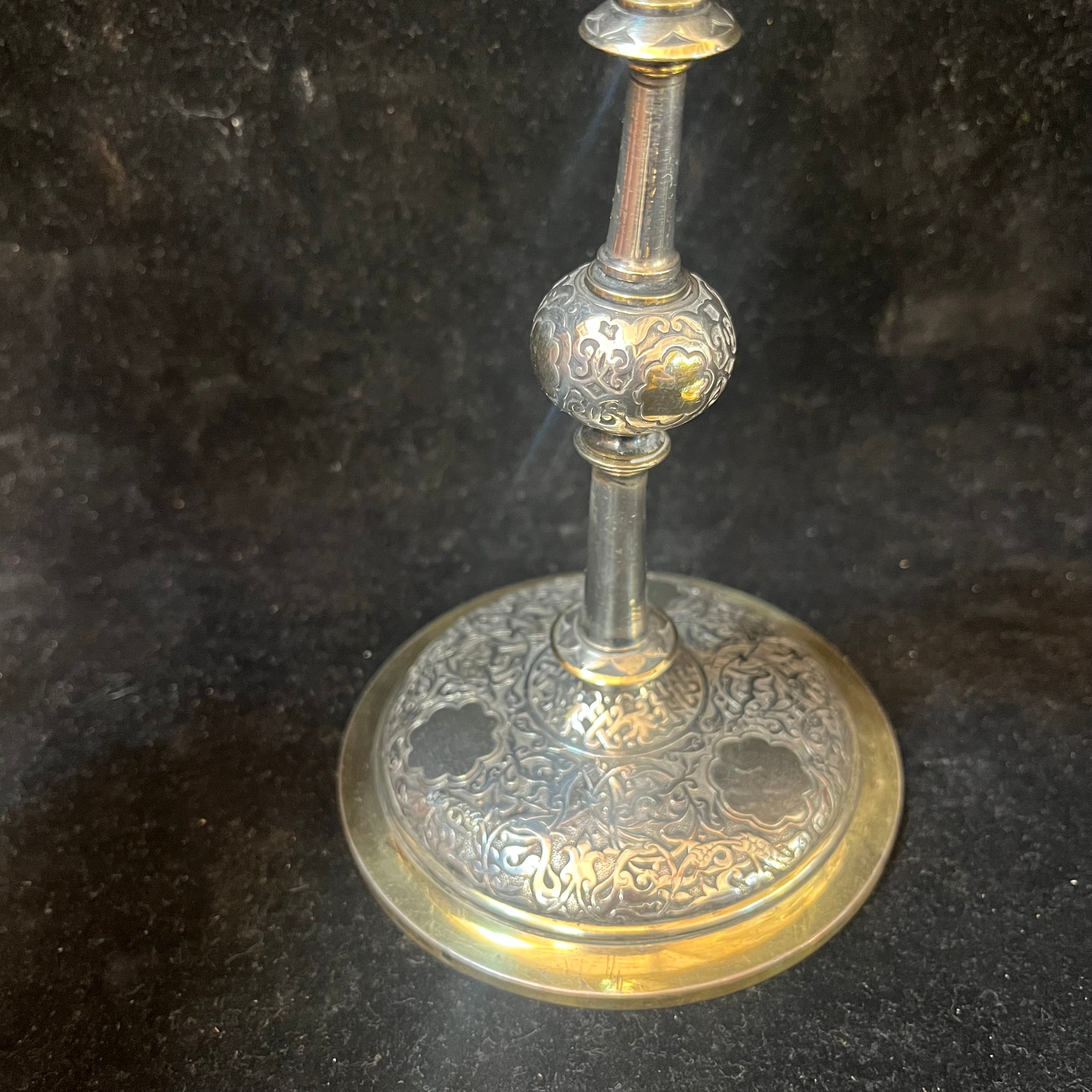 Elegante pareja de pequeños candelabros franceses,de una luz, de la famosa marca Christofle. Las piezas, hechas de plaqué y bronce, tienen un decorado de relieve y bordes de bronce dorado. En su base se encuentra el sello de la marca y la numeración del objeto en su parte inferior.