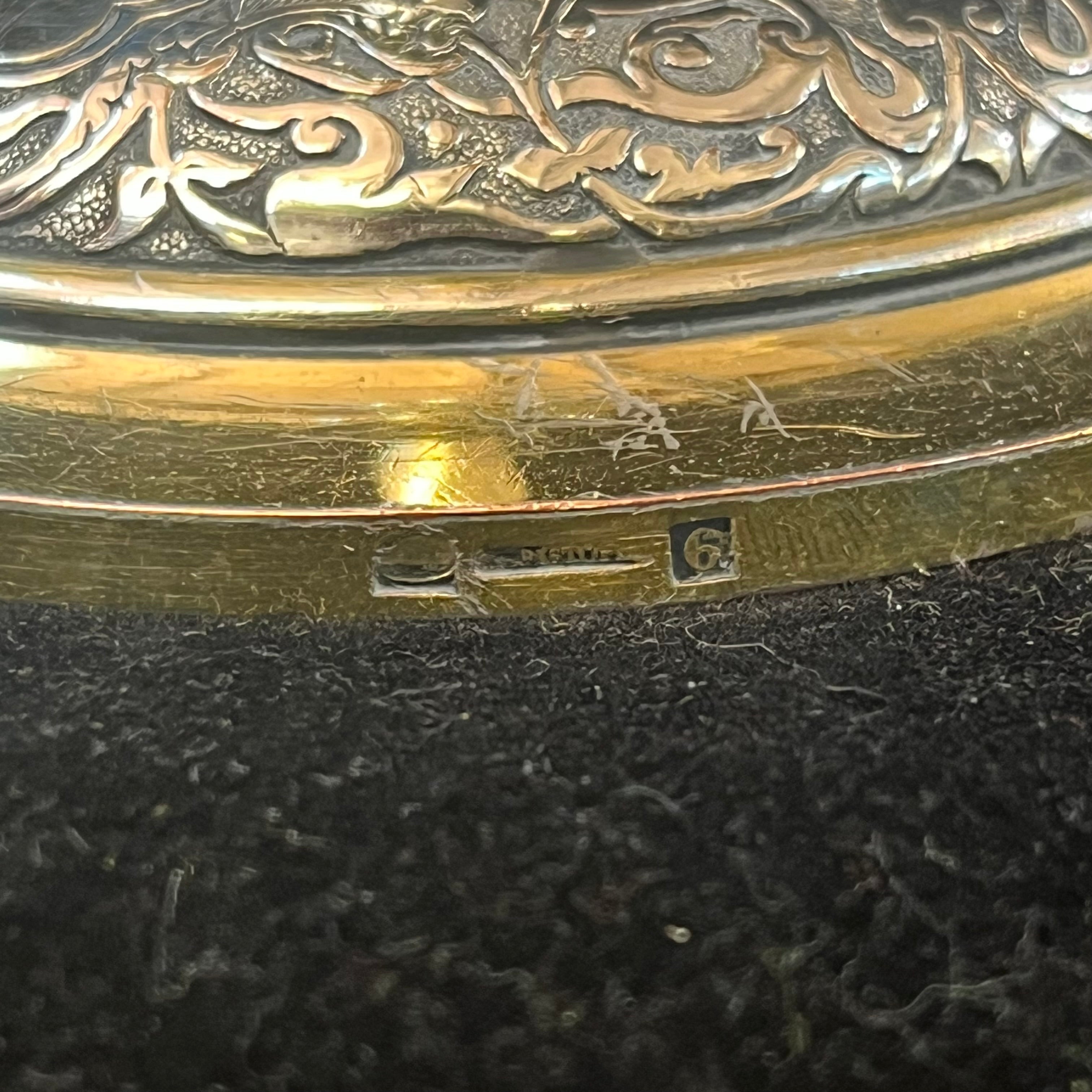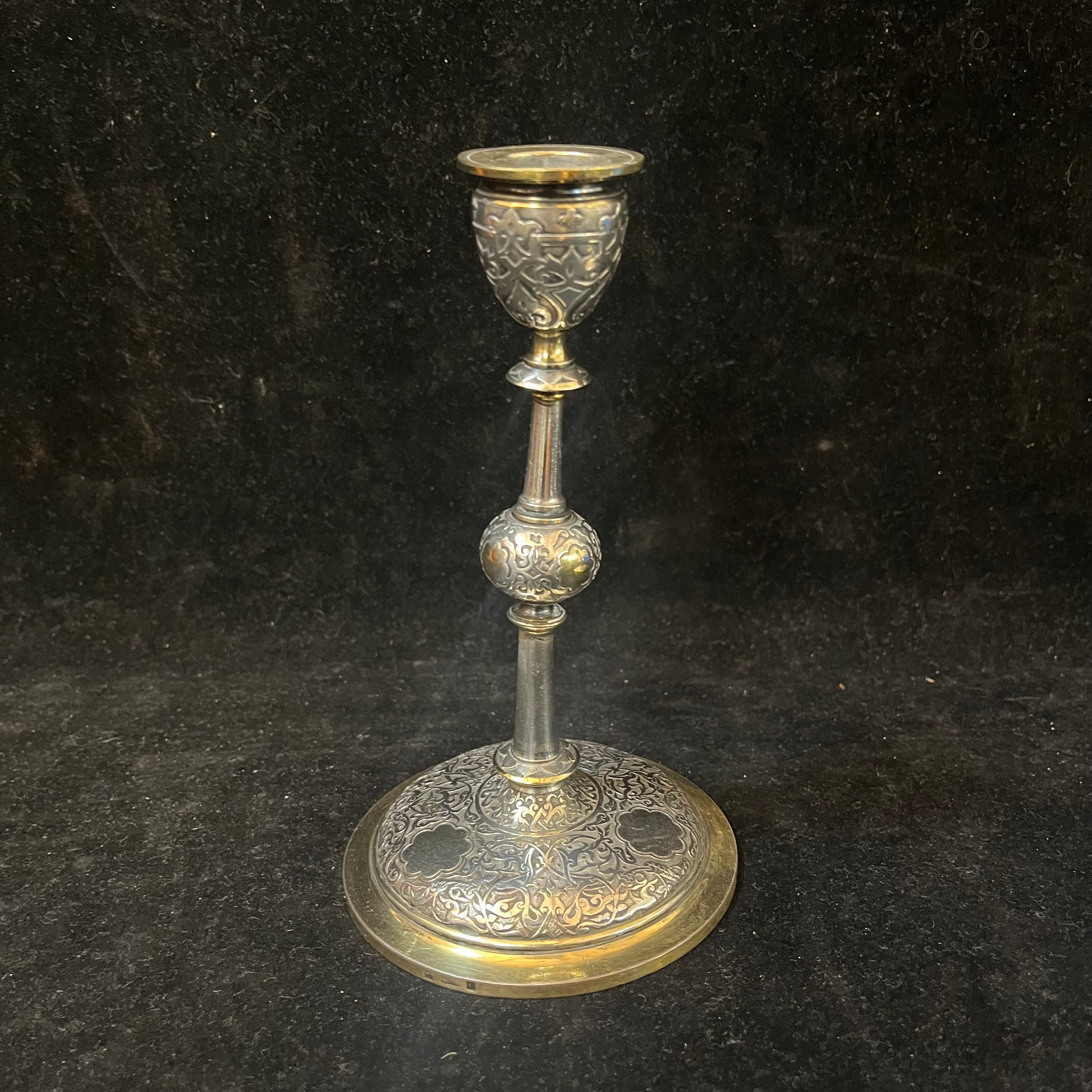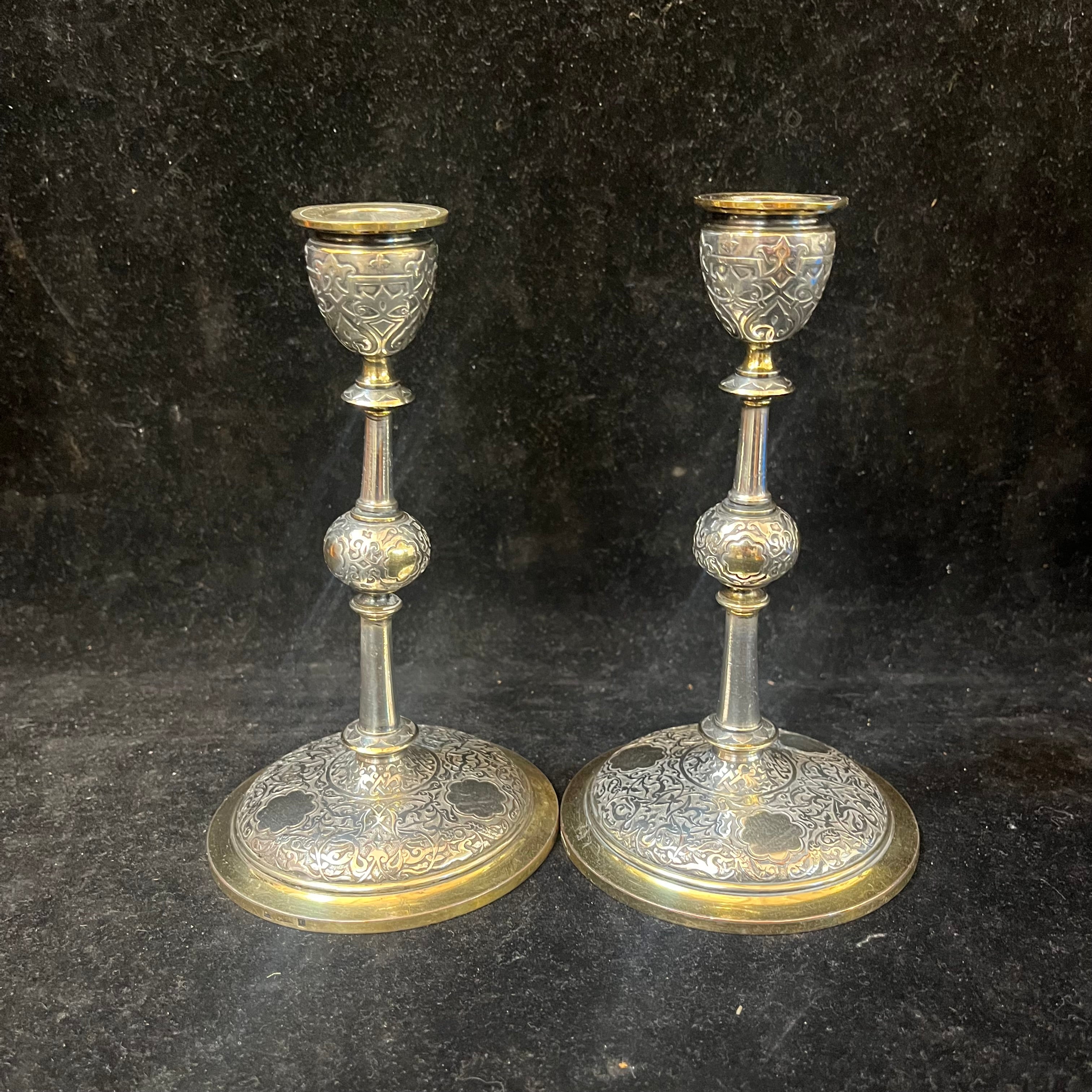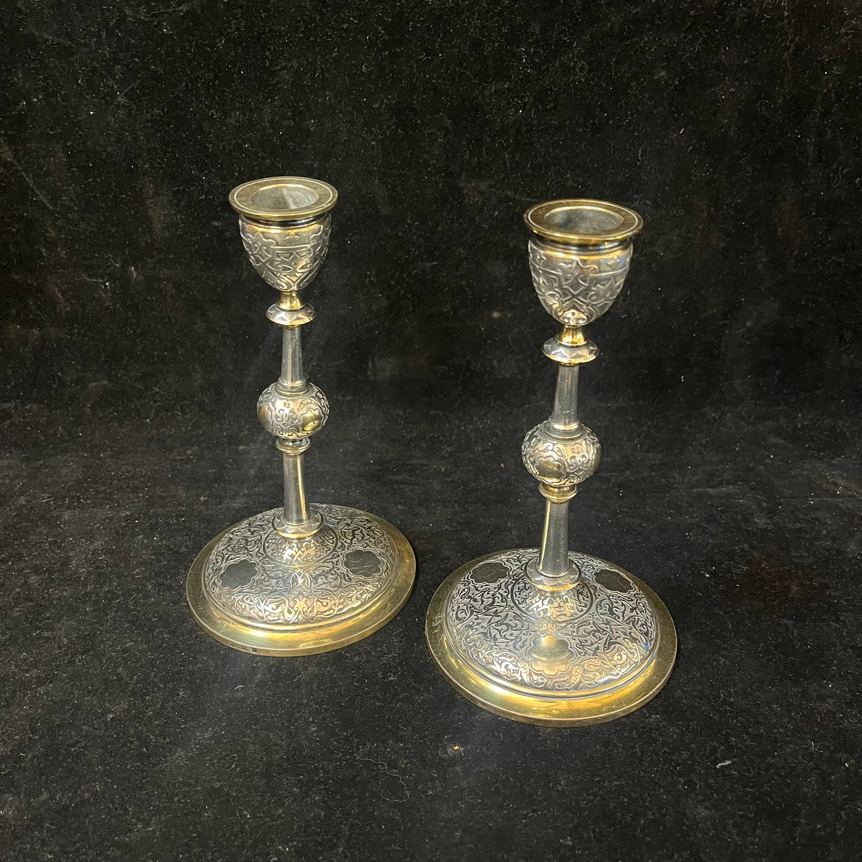 Elegante pareja de pequeños candelabros franceses,de una luz, de la famosa marca Christofle. Las piezas, hechas de plaqué y bronce, tienen un decorado de relieve y bordes de bronce dorado. En su base se encuentra el sello de la marca y la numeración del objeto en su parte inferior.