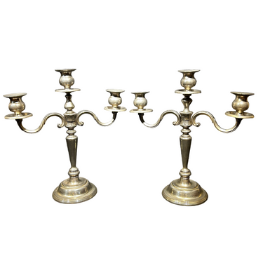 Bella pareja de candelabros de plaque con un diseño en decoraciones curvas de tres luces y base redonda.