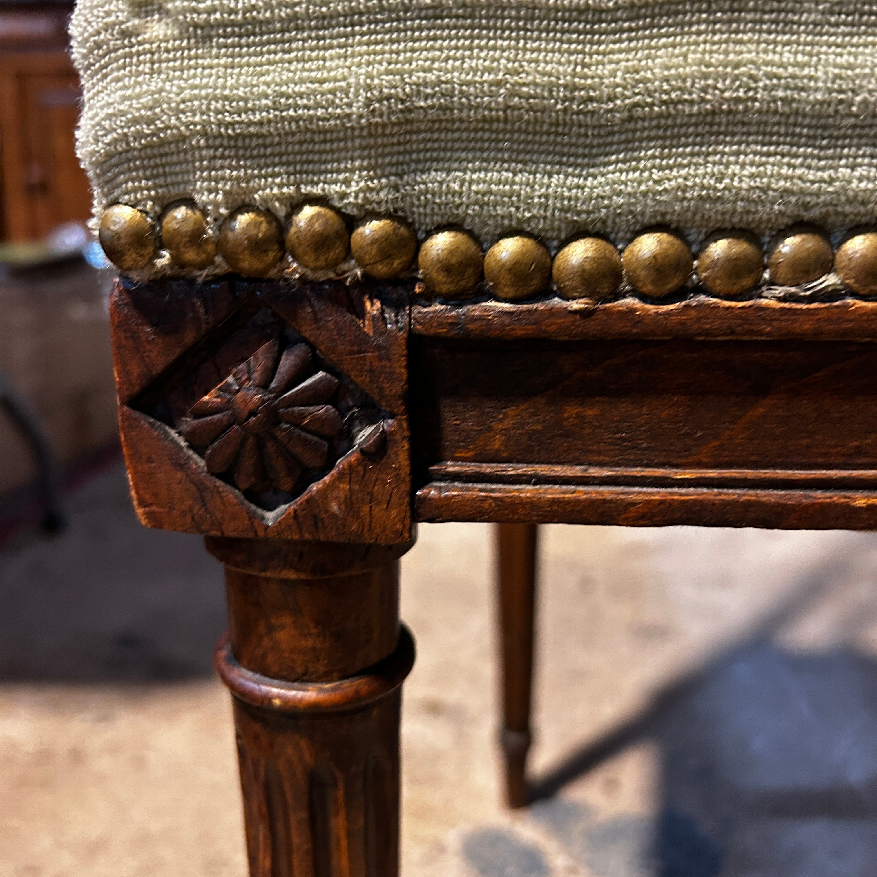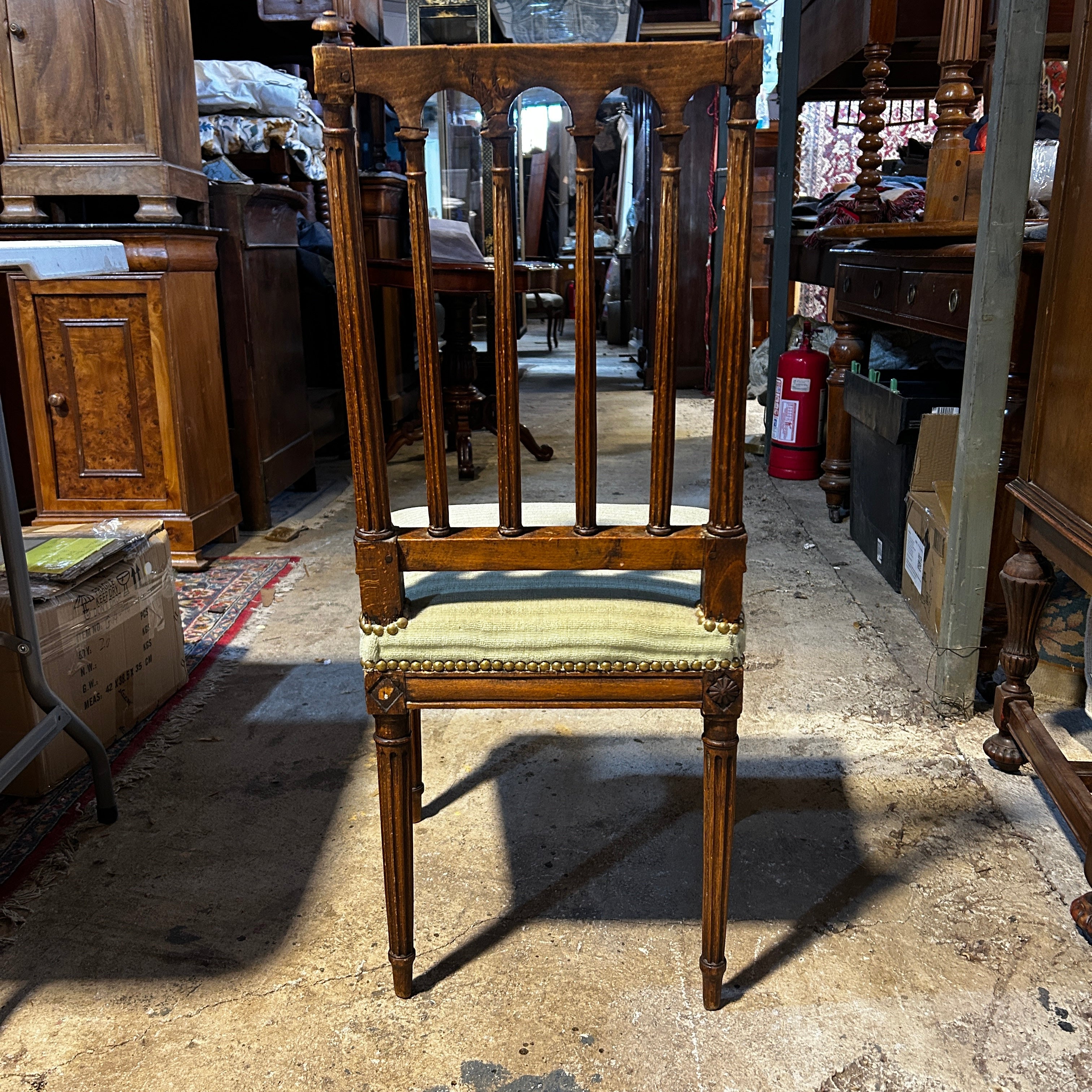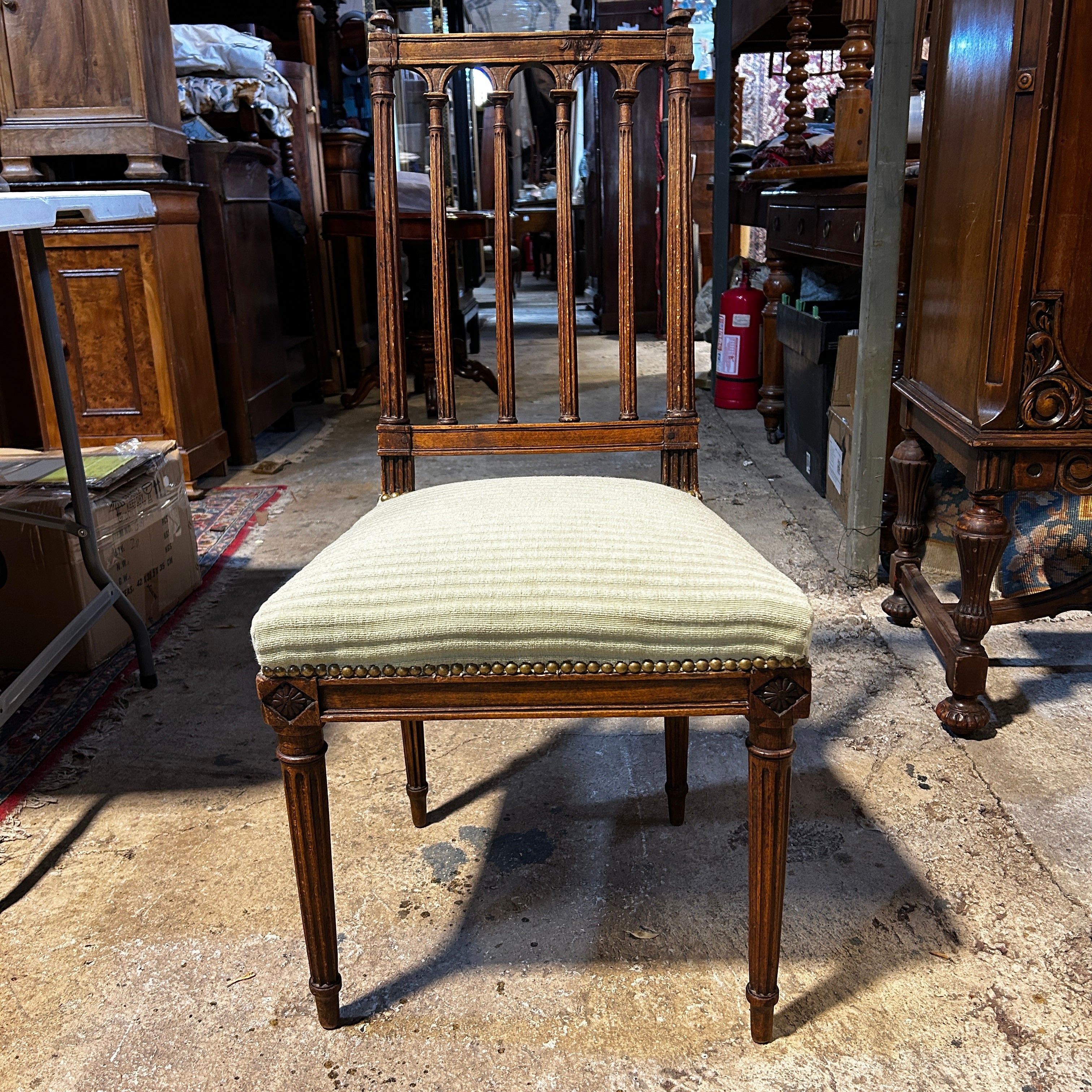 Preciosa pareja de sillas francesas estilo Luís XVI, probablemente de principios del siglo XX en madera de nogal, con su tapiz de origen. Su respaldo cuenta con dos columnas levemente más gruesas en los costados y tres columnas capiteles en el centro, lo que logra una hermosa combinación. El tapiz es de un suave tono verde agua. Uno de los respaldos posee pequeños detalles que se pueden notar en las fotografías.