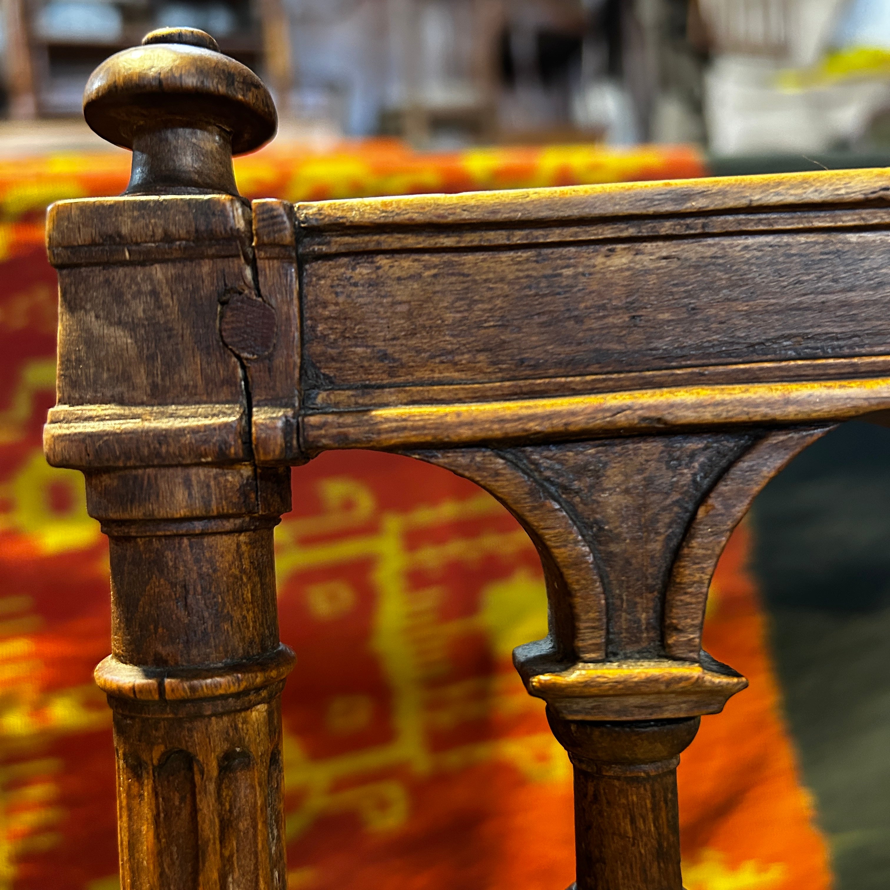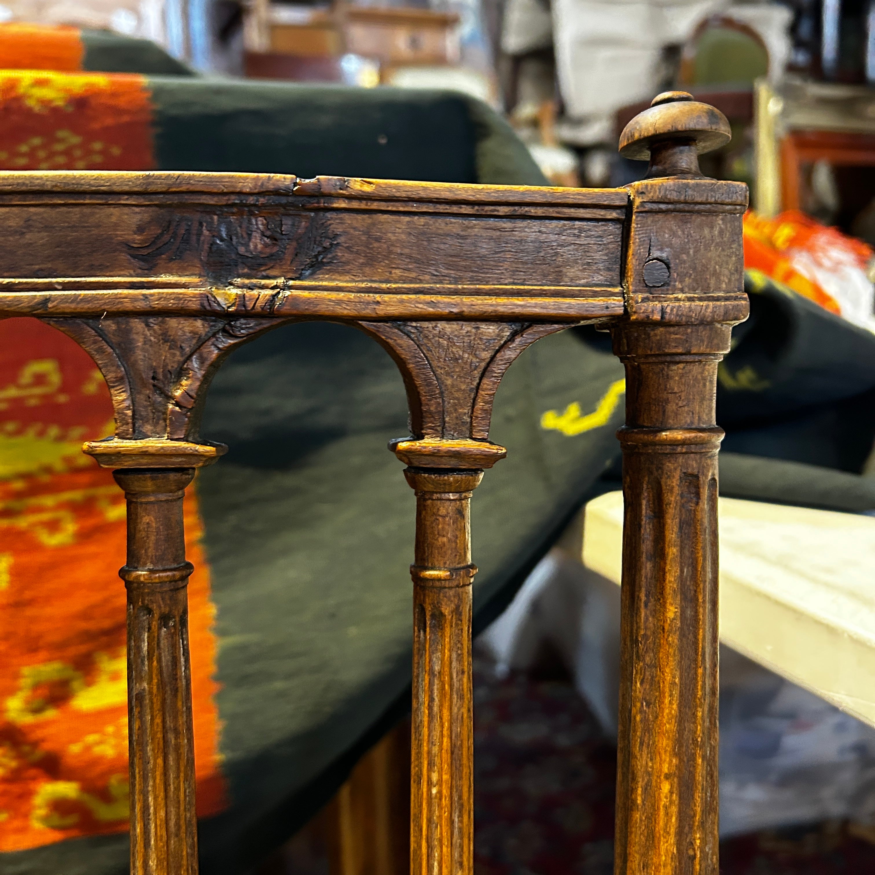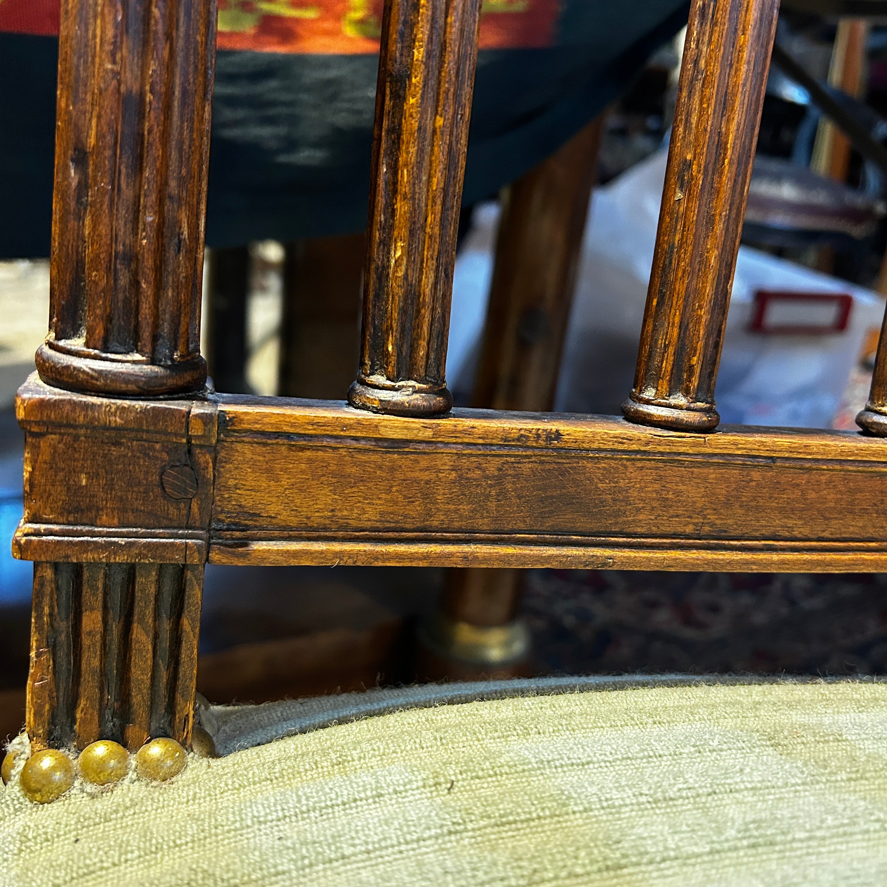 Preciosa pareja de sillas francesas estilo Luís XVI, probablemente de principios del siglo XX en madera de nogal, con su tapiz de origen. Su respaldo cuenta con dos columnas levemente más gruesas en los costados y tres columnas capiteles en el centro, lo que logra una hermosa combinación. El tapiz es de un suave tono verde agua. Uno de los respaldos posee pequeños detalles que se pueden notar en las fotografías.