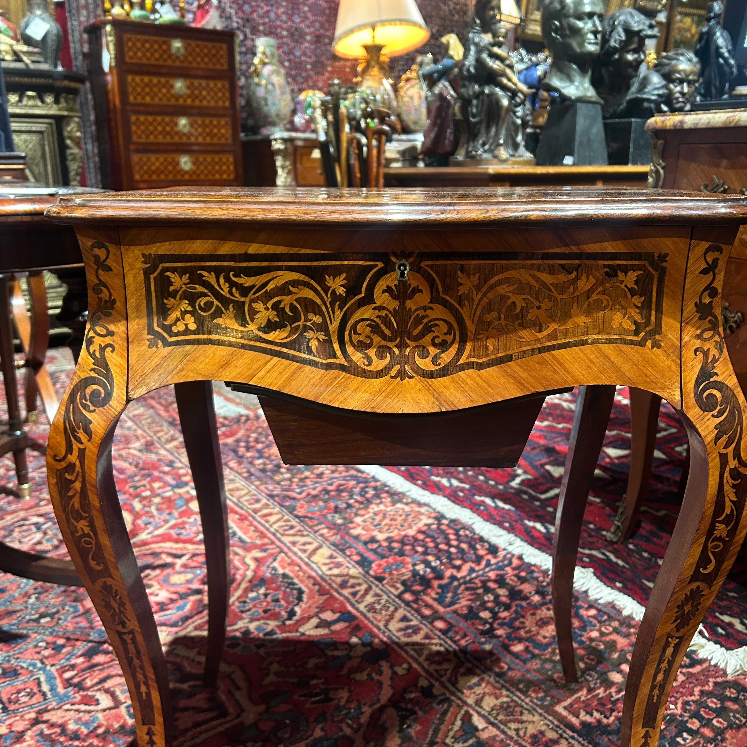 Maravilloso Costurero, peinador o joyero estilo Napoleón III con marquetería de palisandro y bois de rose representando follaje. Tapa con espejo, interior con enchapado de raíz de olmo, cajón frontal y un cajón tipo costurero debajo. Decoración de latón grabado 'EC'. Francia, 1930s.