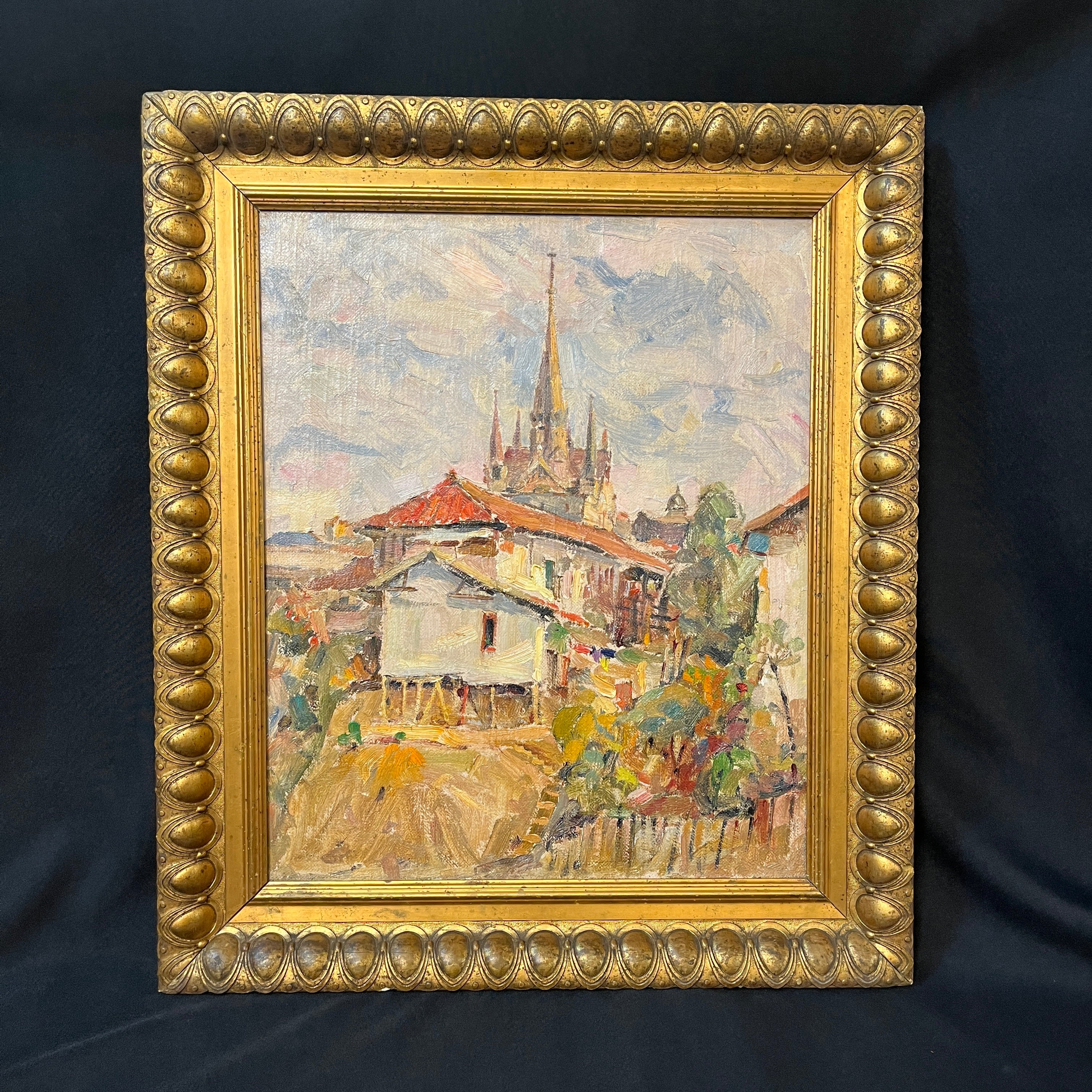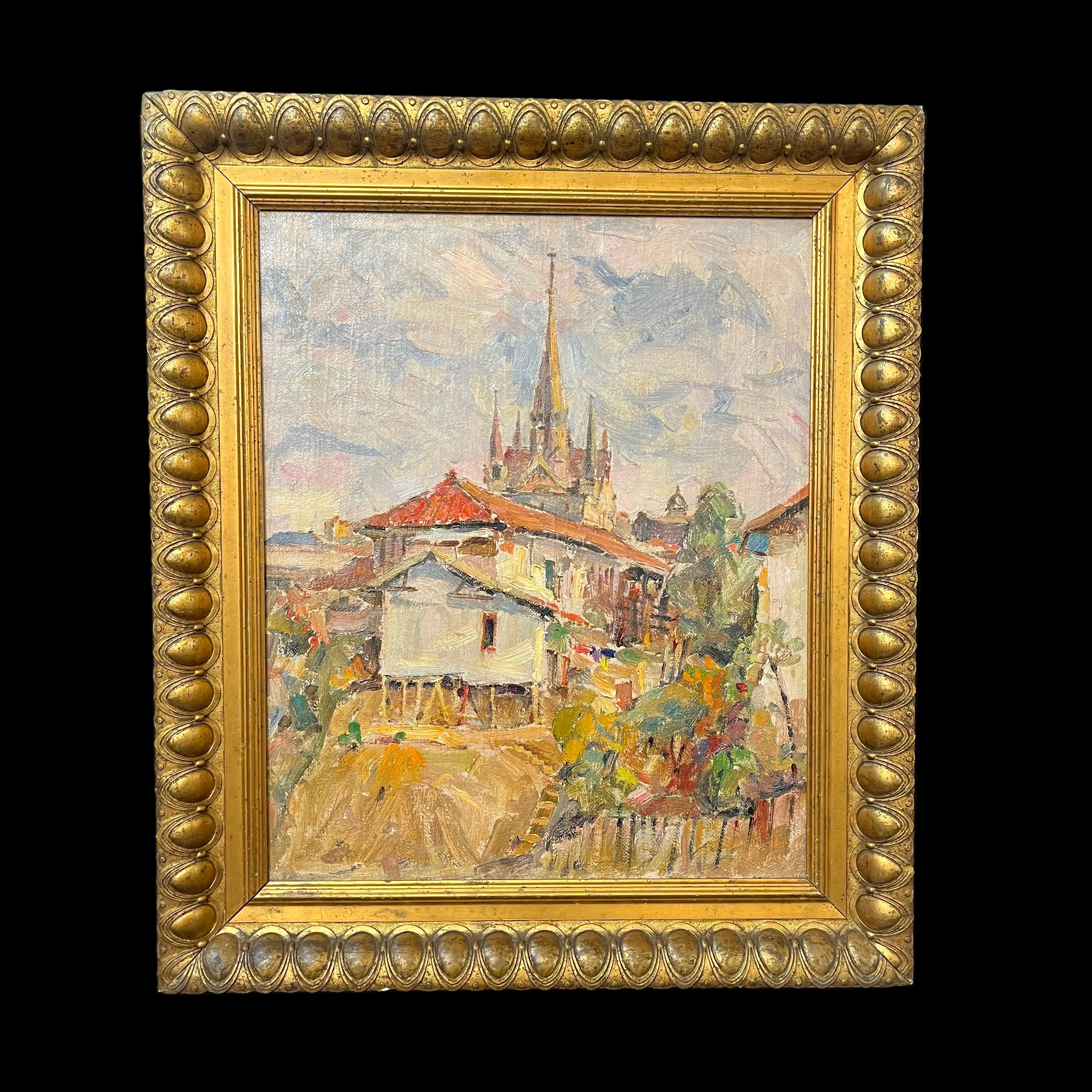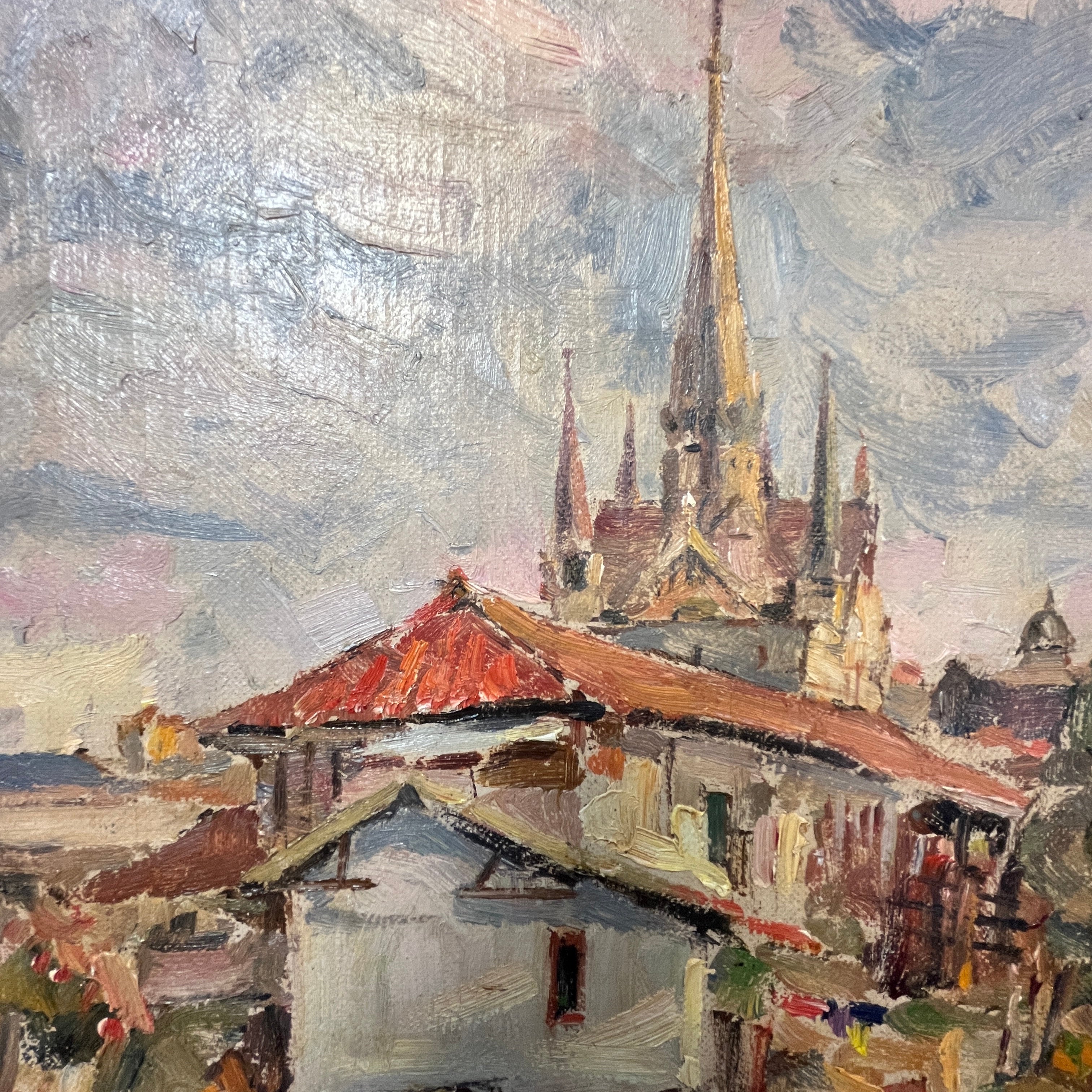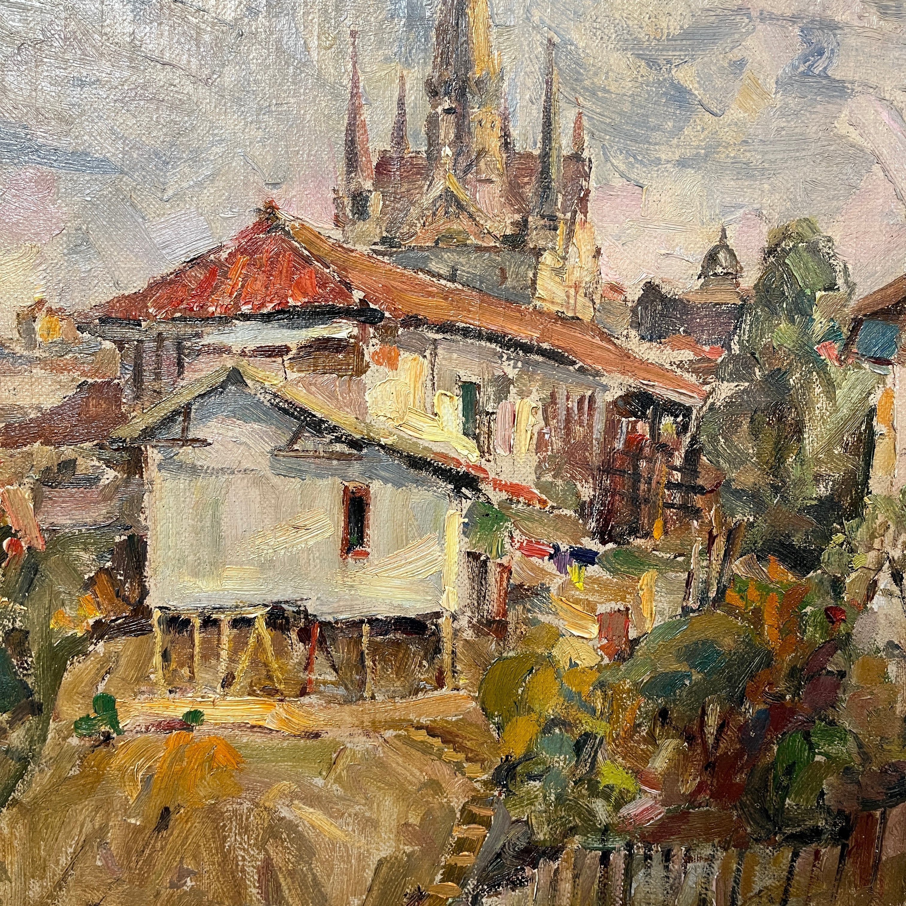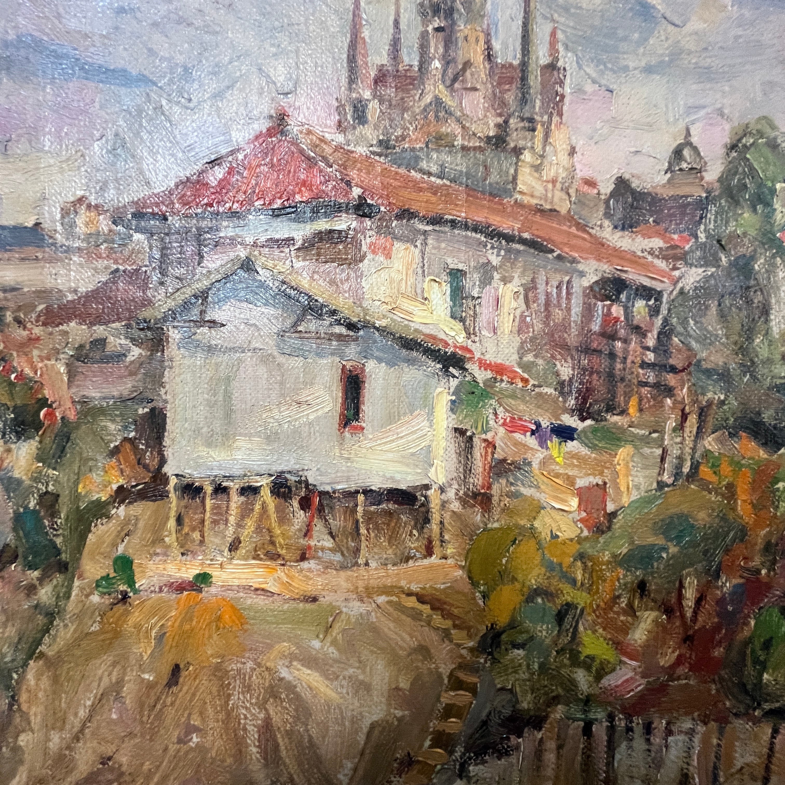 Bello óleo del pintor chileno Roko Matjasic que retrata una escena del puerto chileno, Valparaíso, posiblemente la Iglesia Luterana de la Santa Cruz, en el Cerro Concepción. Es una obra donde vemos la marcada pincelada del artista, que le otorgan mayor fuerza al paisaje.