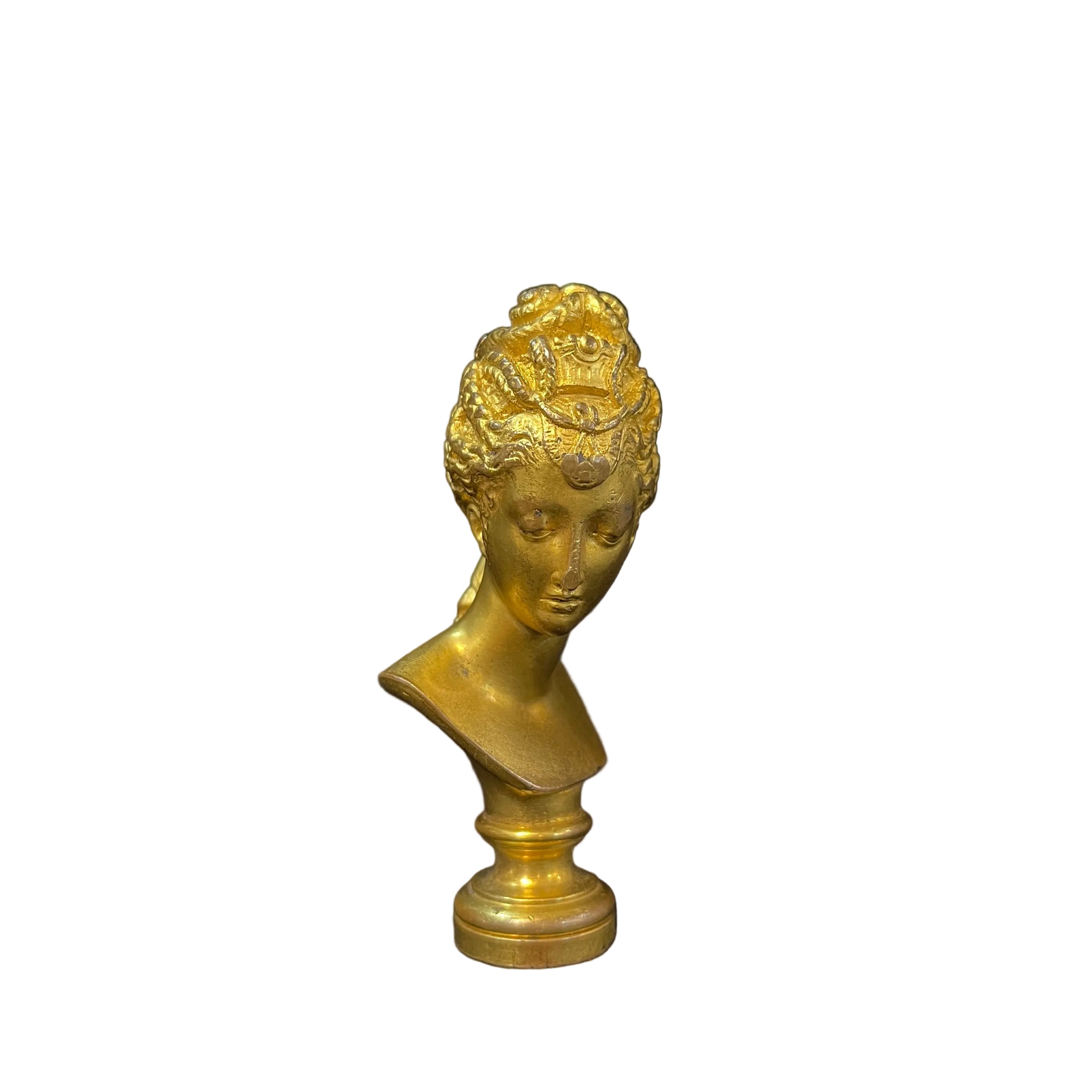 Precioso sello de bronce ormolú, firmado Ferdinand Barbedienne, uno de los fundidores de bronce más prestigiosos del siglo XIX en Francia. El sello tiene la forma de un busto de una dama, tallada en detalle y con delicadeza.