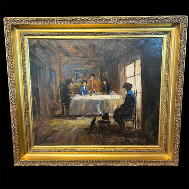 Óleo sobre tela del artista chileno Raúl Ulloa Burgos, representando una escena hogareña en la que una familia comparte en torno a una mesa. La escena tiene un exquisito trabajo de luz y sombra, haciendo que sea la luz exterior, que entra por la ventana de este comedor, la que ilumina a los personajes. La obra tiene un marco de madera tallada en relieves y pintada de dorado.