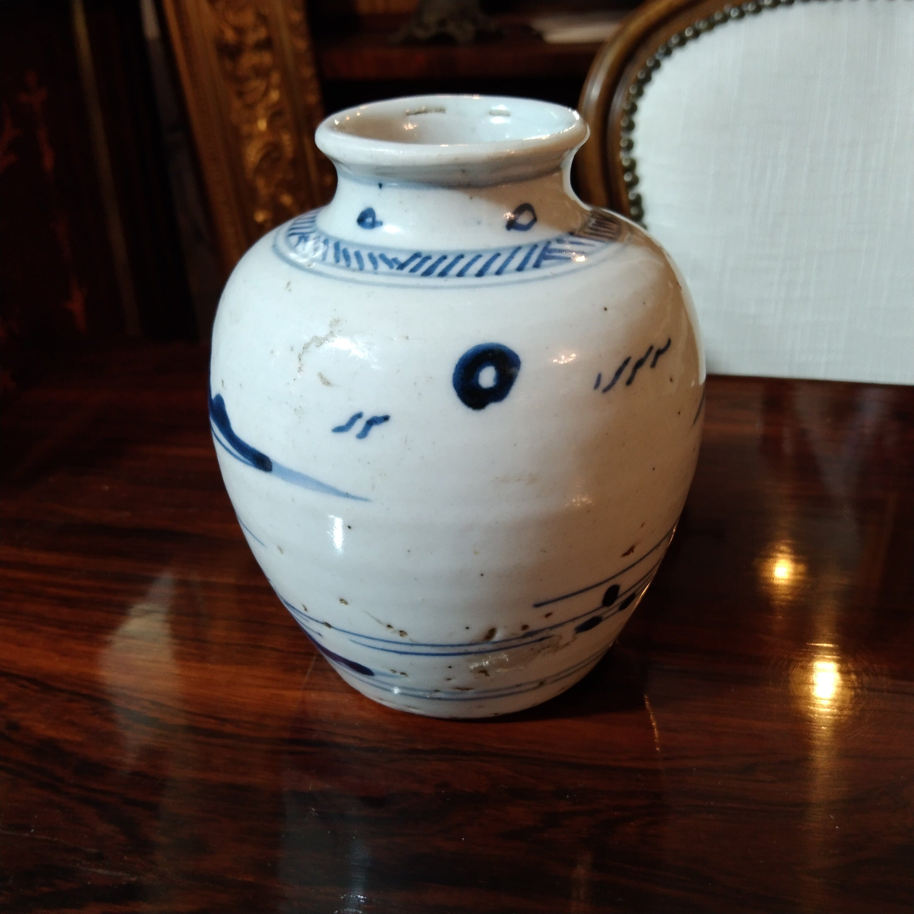 Bello violetero de cerámica china antigua pintado a mano en el tradicional color azul, típico de este estilo de cerámicas. La pieza a muestra un paisaj costero, en el que una figura trabaja la tierra.