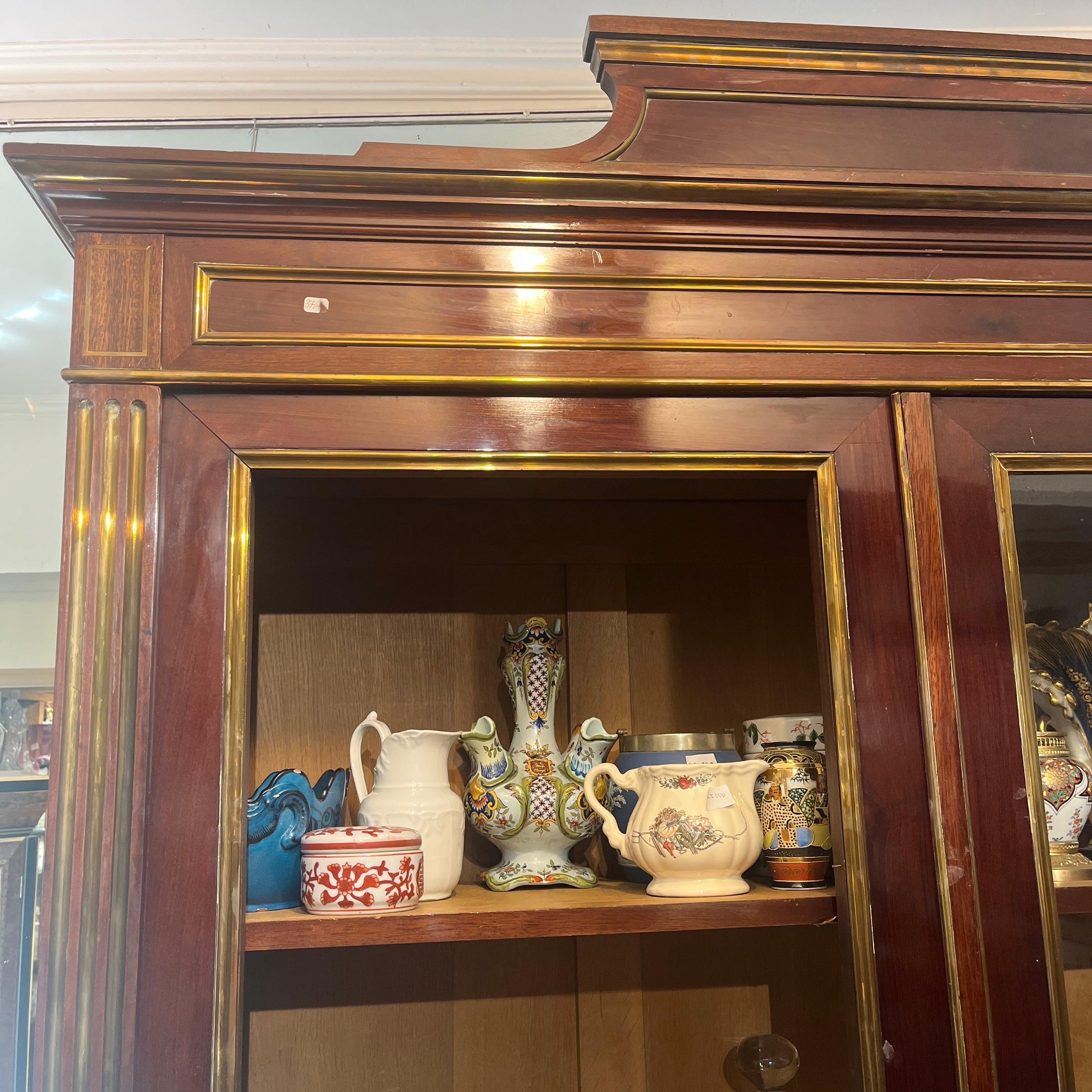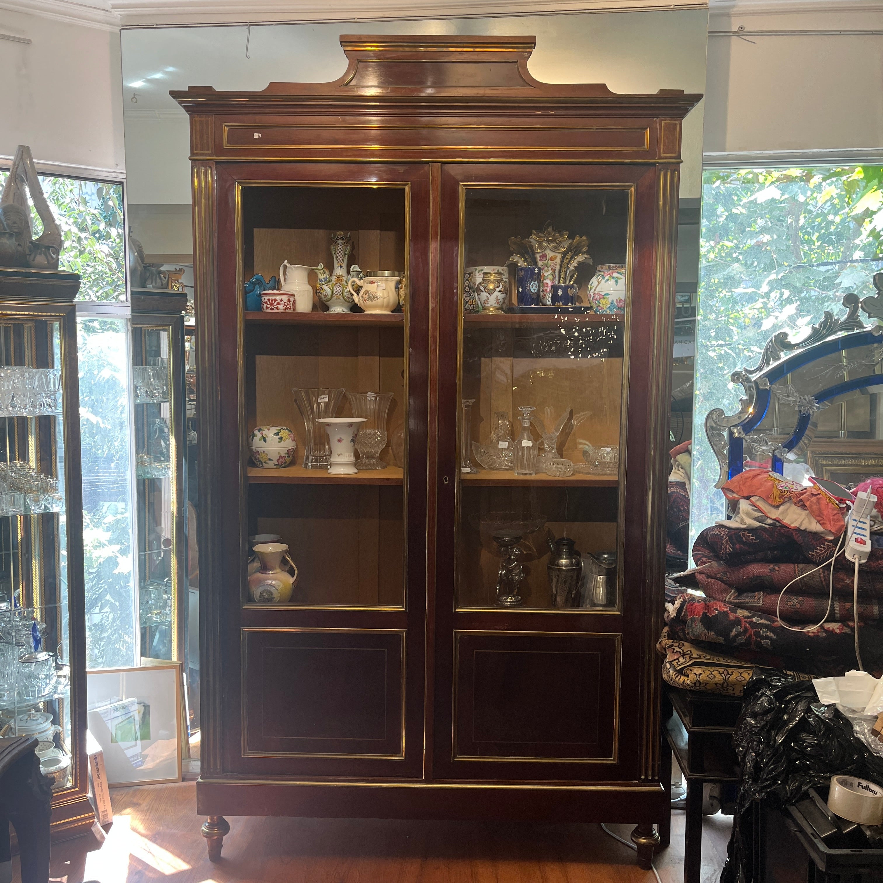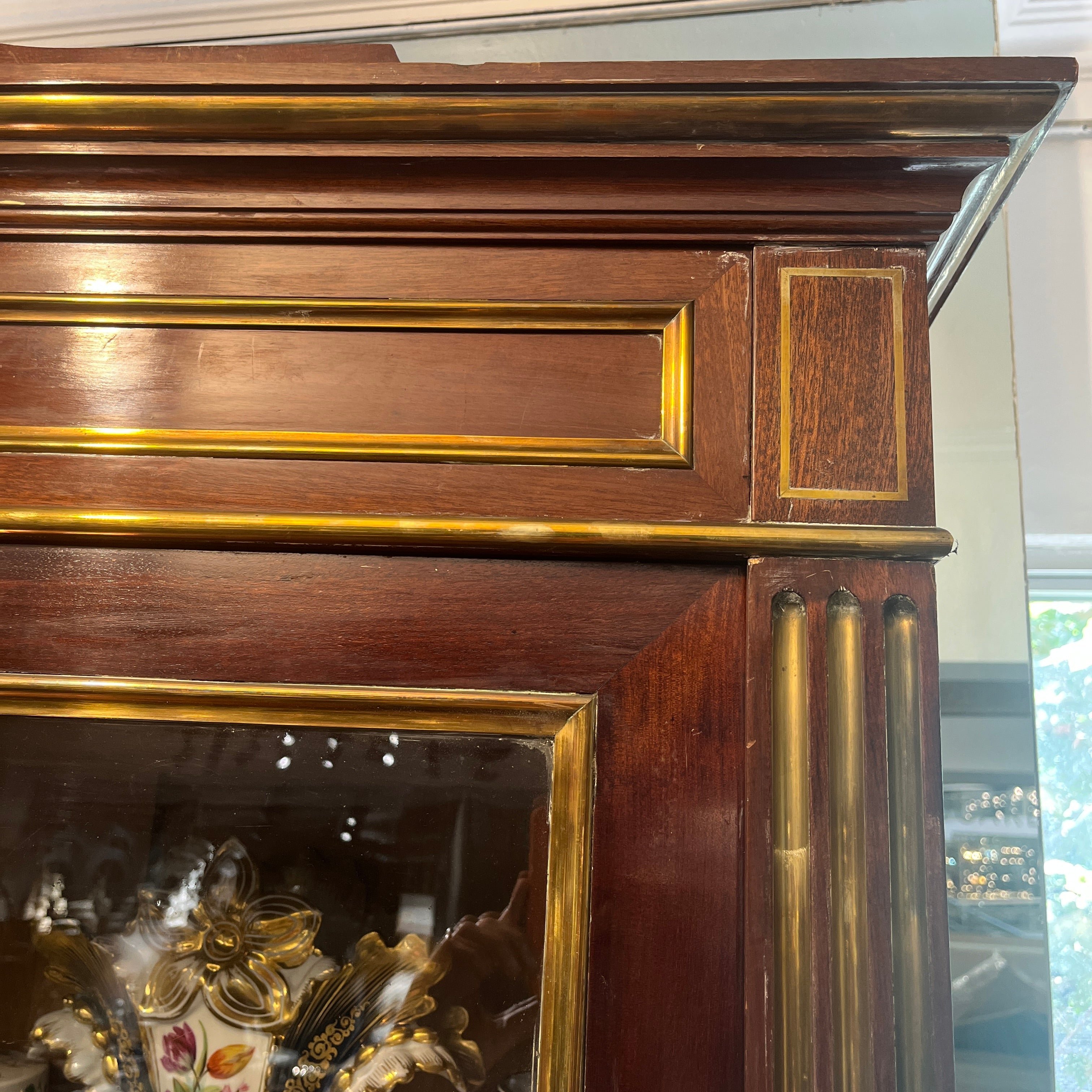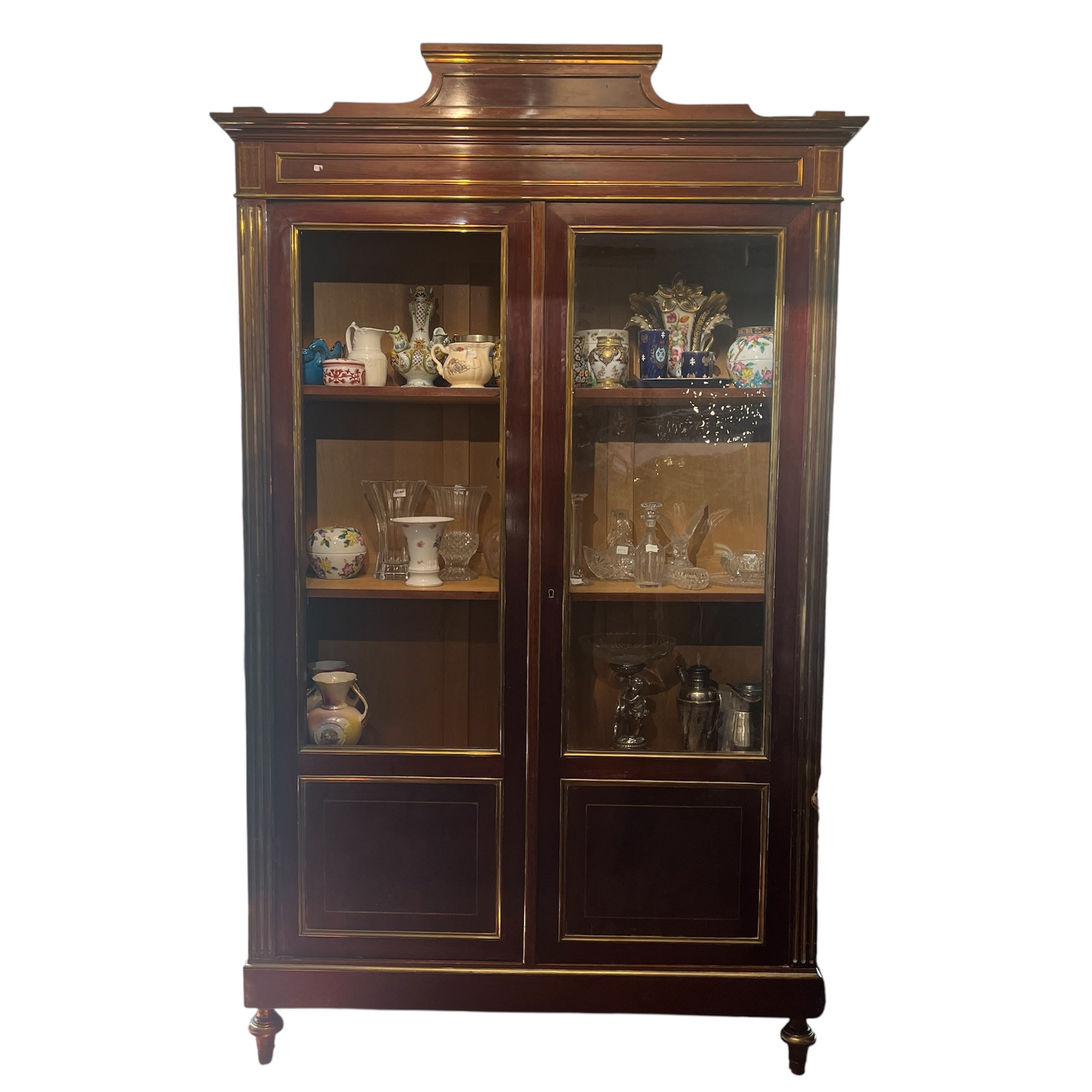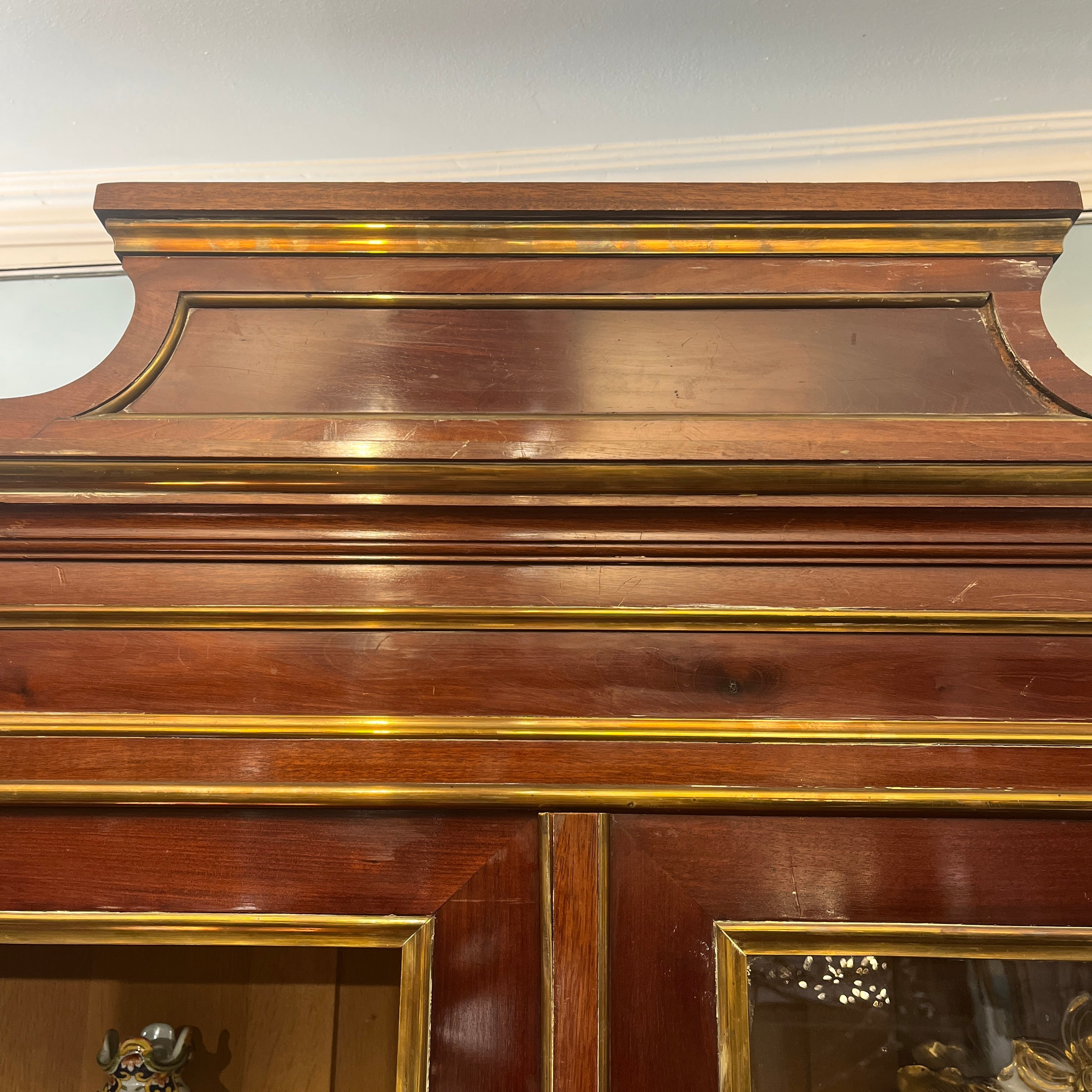 Elegante biblioteca o vitrina francesa estilo Directorio madera de caoba, finamente decorada en bronce. Tiene dos puertas frontales de madera y su vidrio enmarcado bronce. Su interior cuenta con repisas de roble enchapadas en caoba. Hermoso capitel central. Sus costados con ornamentación en forma de pilares acanalados y molduras decoradas en bronce. Francia, circa 1900.