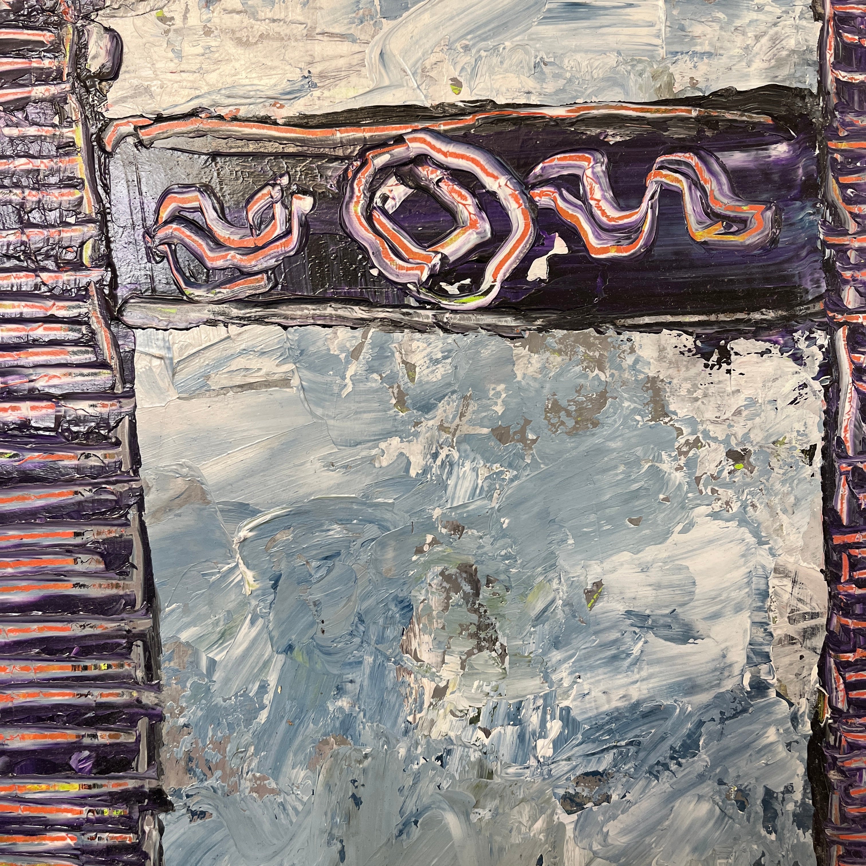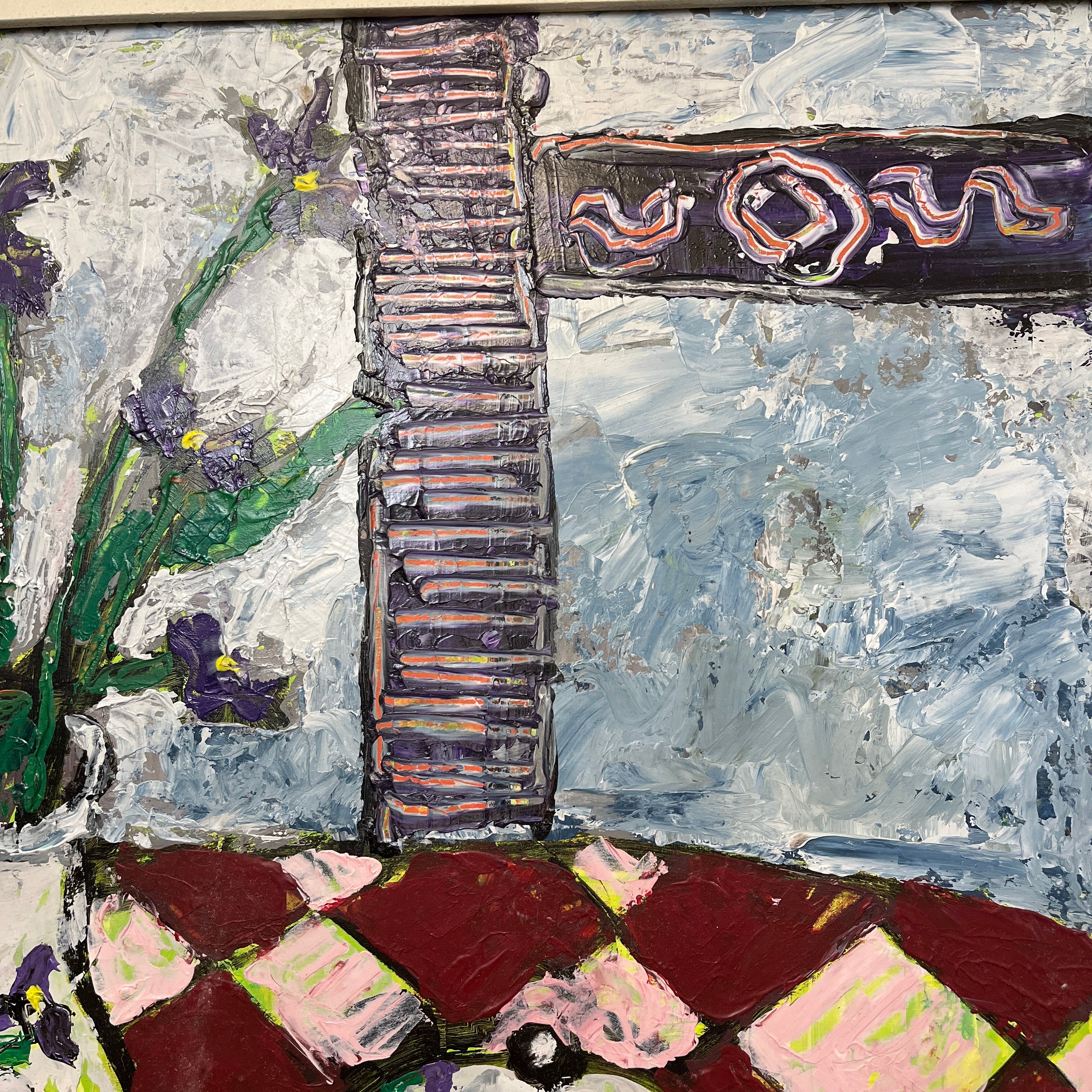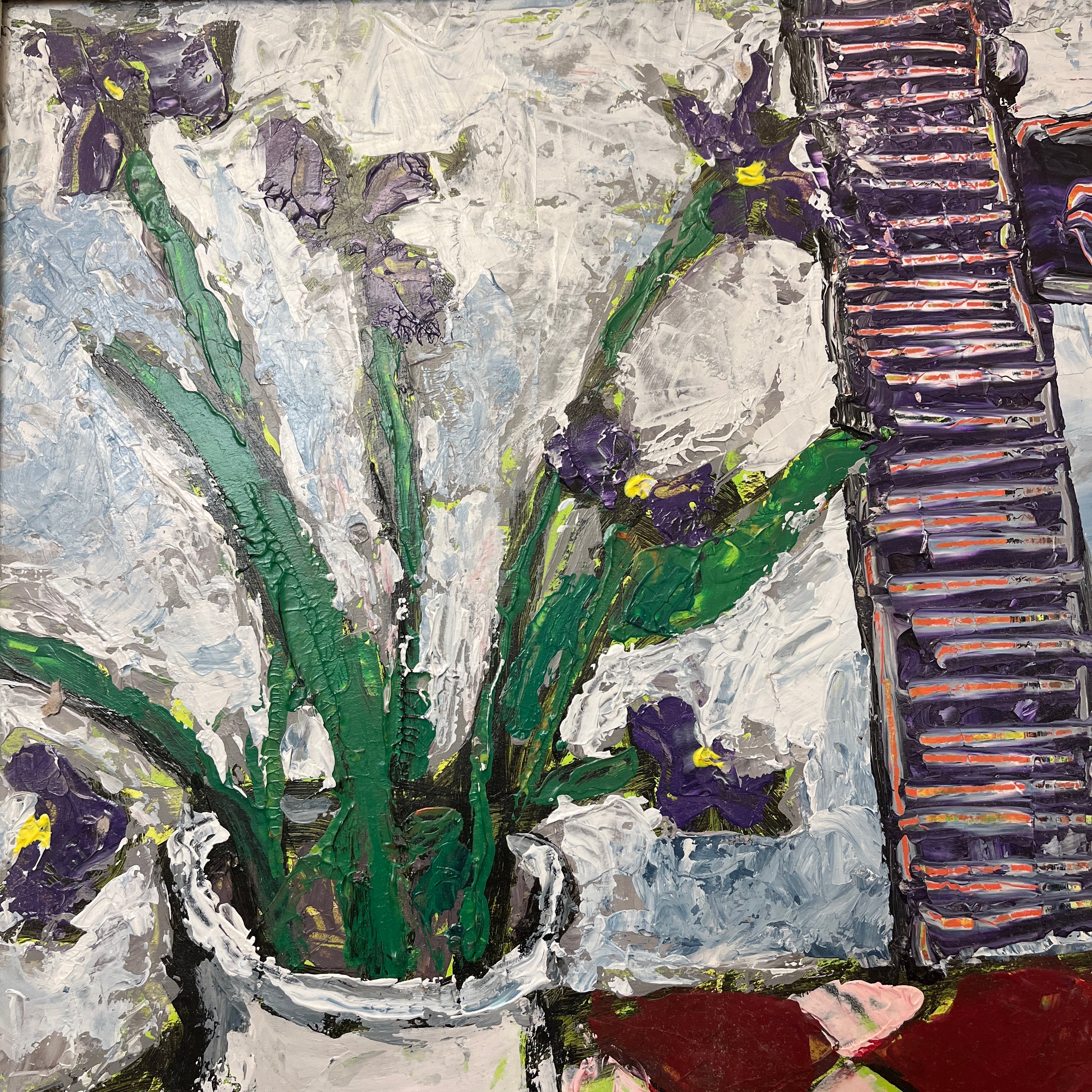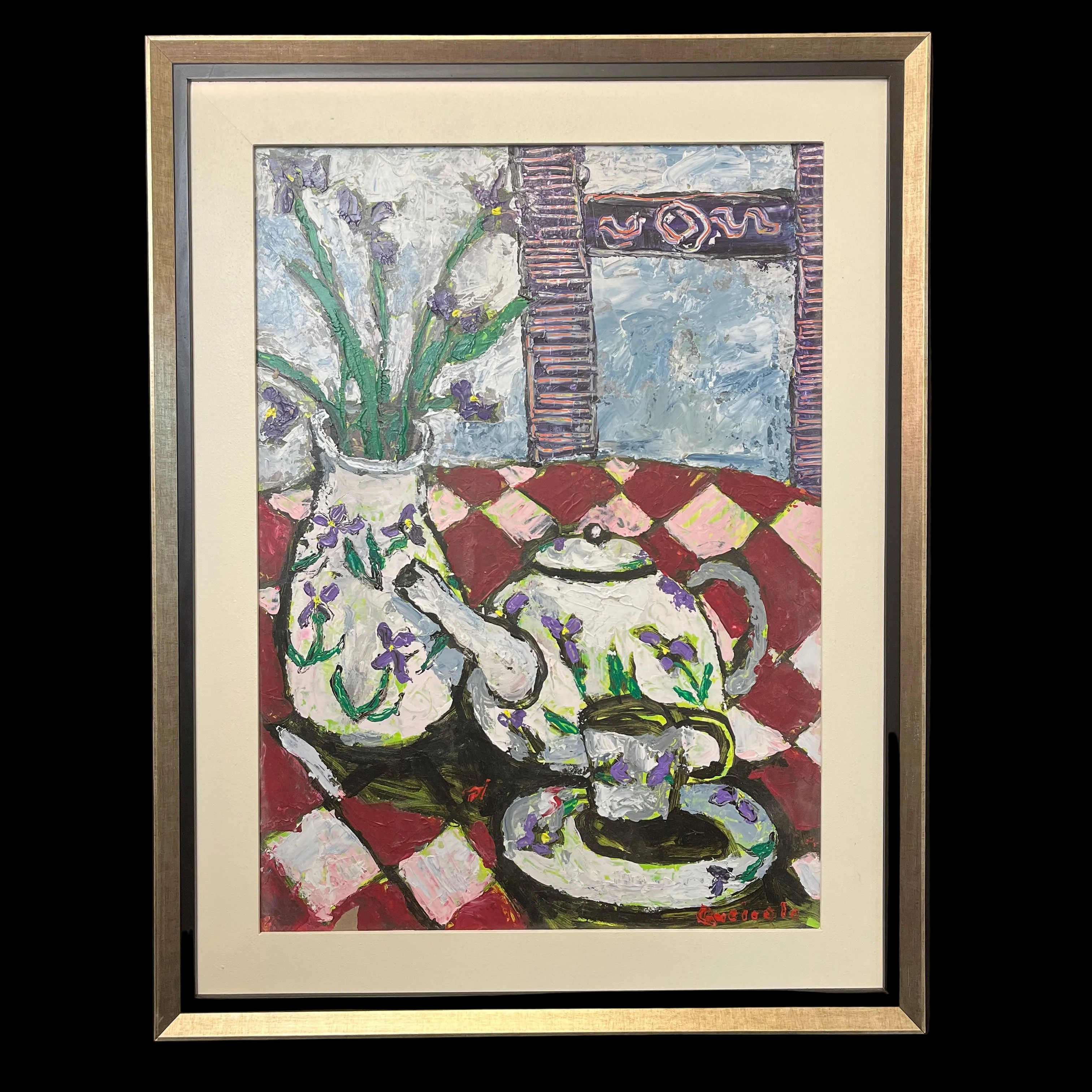 Vittorio Queirolo - Acrílico sobre cartón ‘Bodegón tetera y lirios morados’