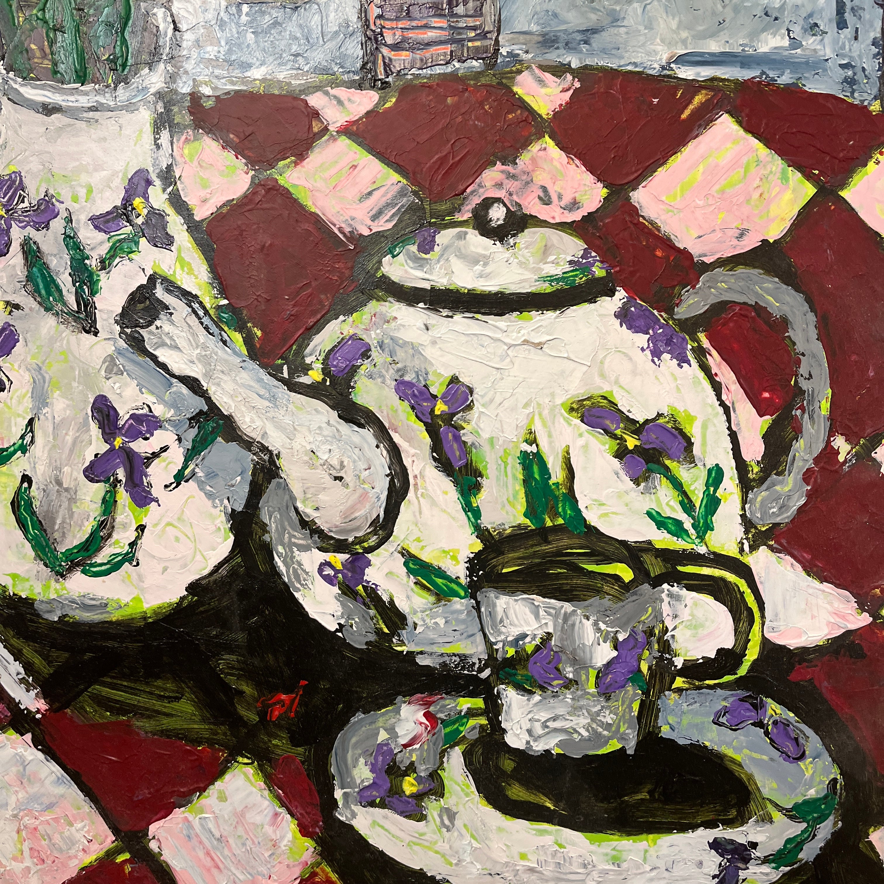 Bello bodegón del reconocido artista chileno Vittorio Queirolo. Es una escena muy hogareña en la que podemos observar una mesa con decorada con dos teteras y un florero piezas que tienen en su decoración las mismas flores que sostiene el florero. Todo en un cautivador contraste con el mantel de cuadros blancos y rojos.
