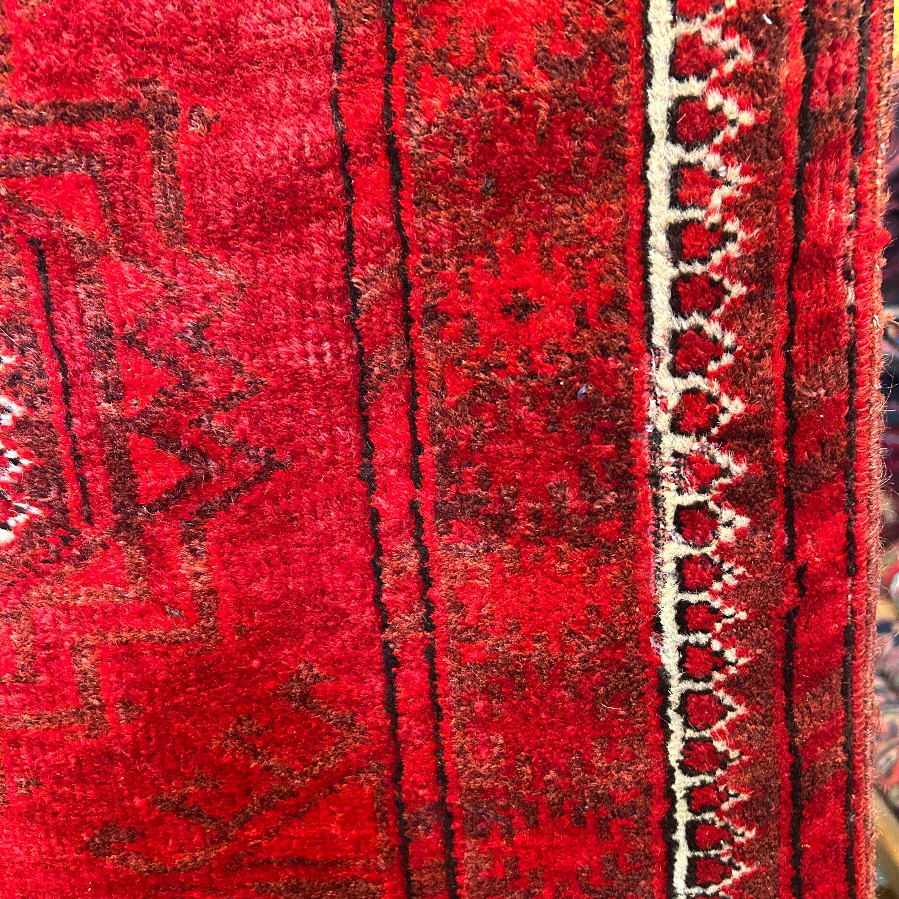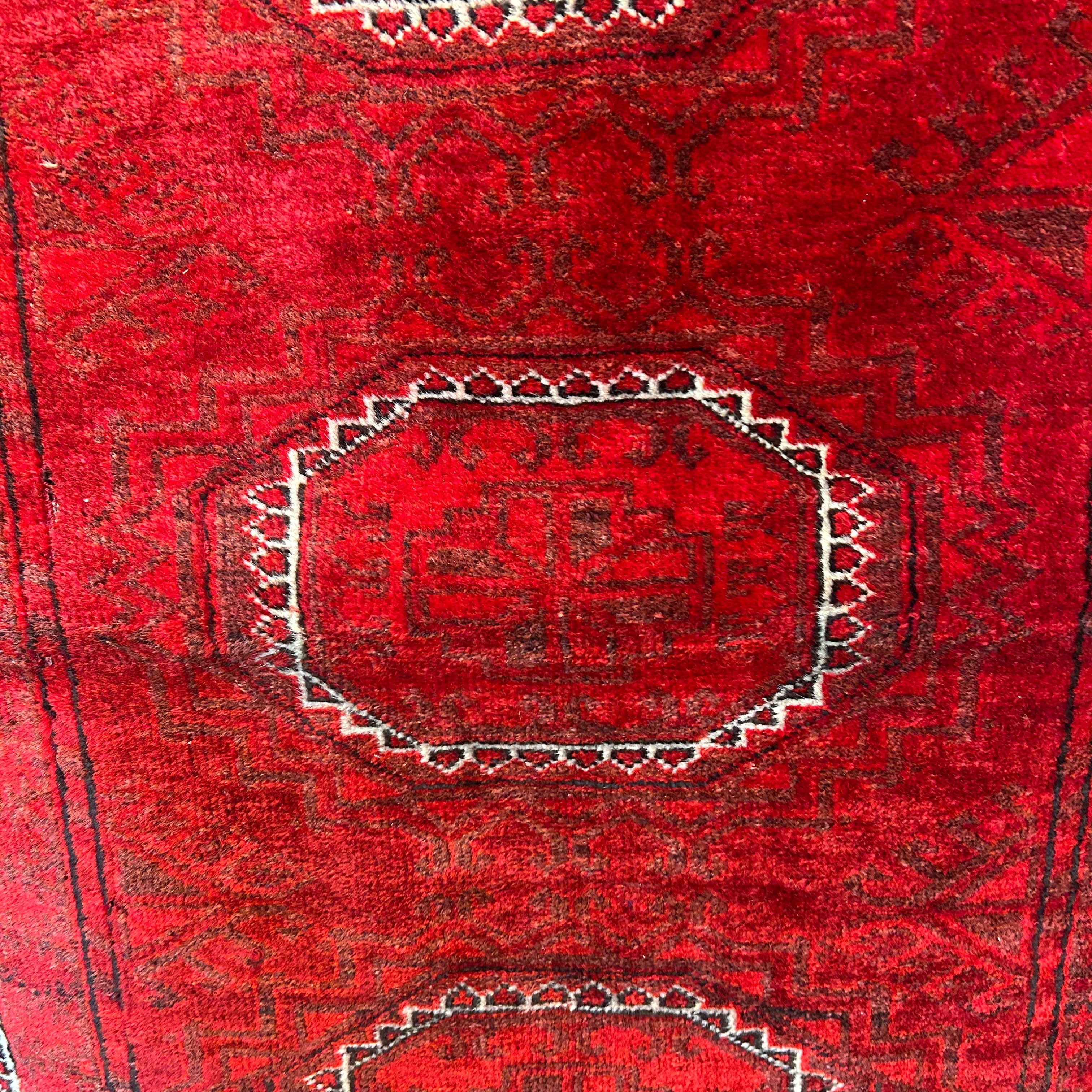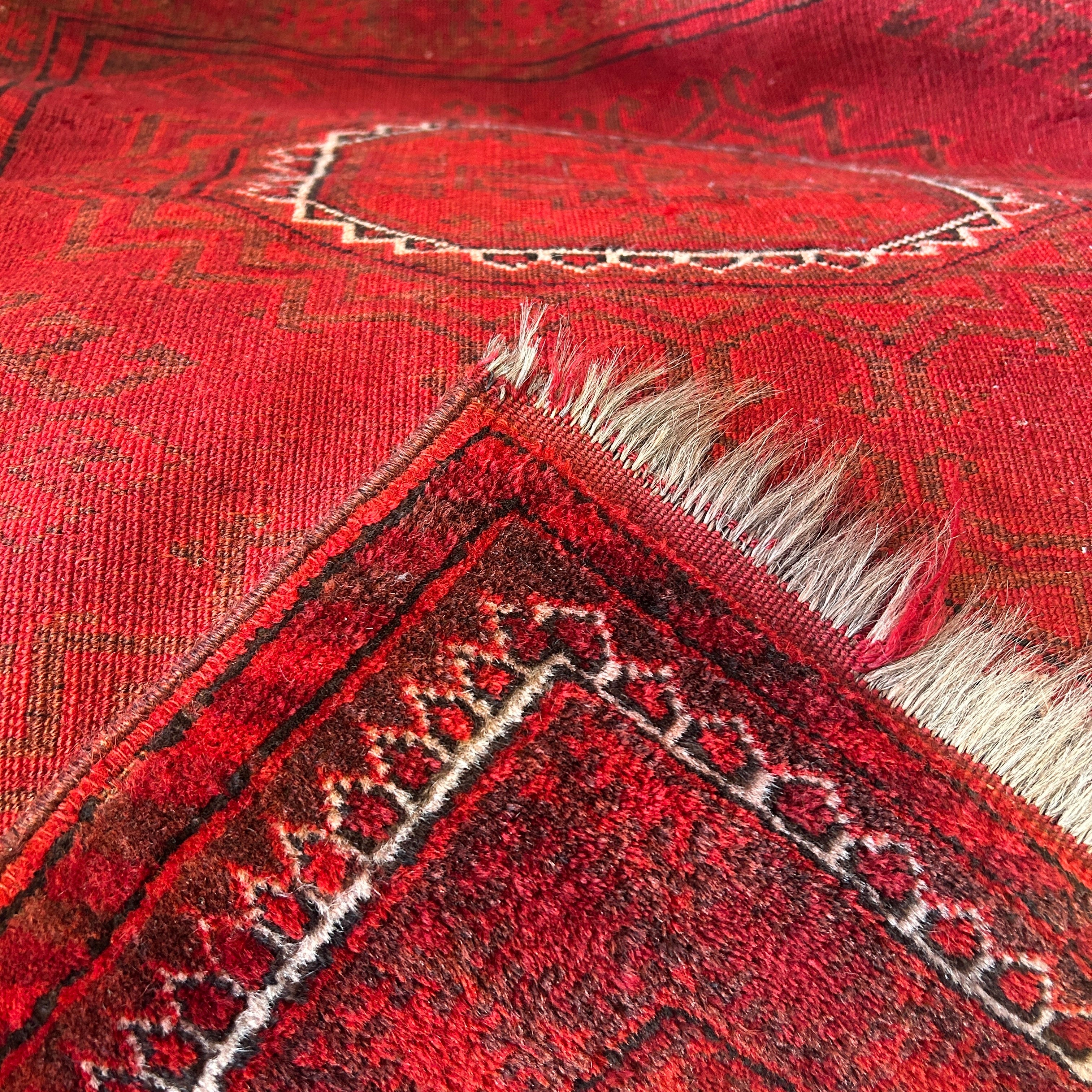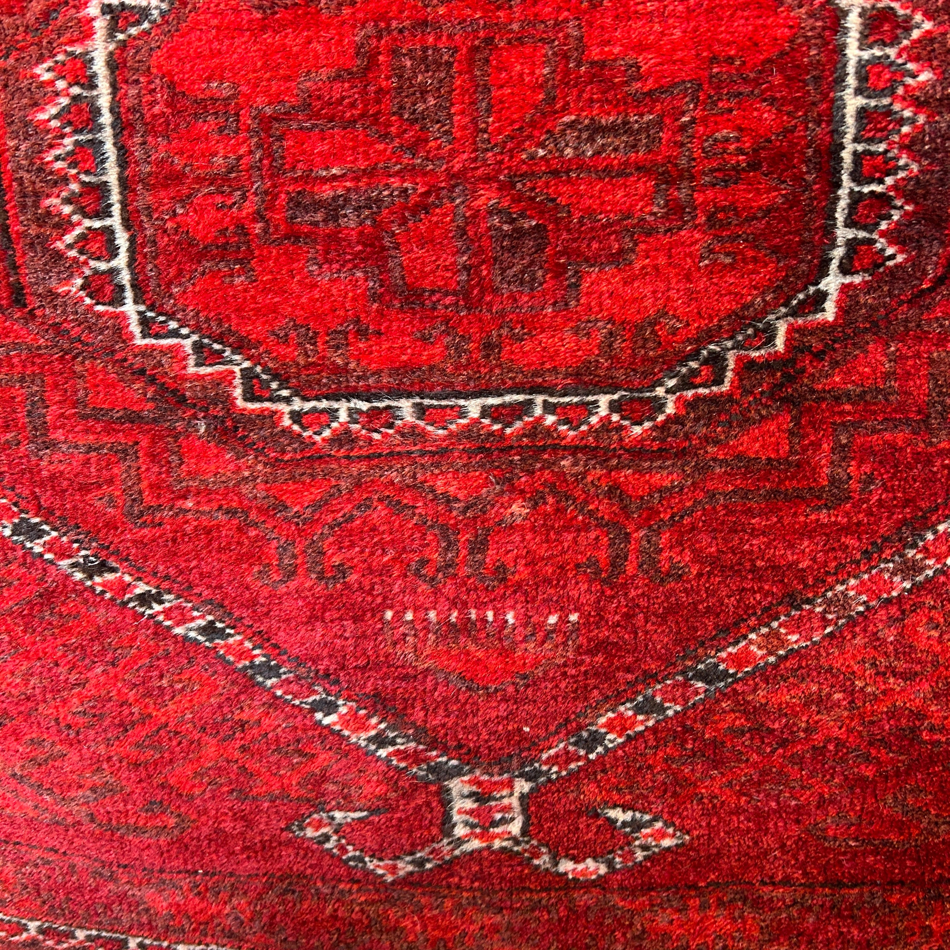 Bellísima alfombra de origen Cáucaso Ruso, tejida a mano en lana y pelo de camello, teñidos de un llamativo e intenso rojo, con detalles en blanco. La pieza tiene tres figuras circulares centrales, con un borde blanco, rodeado de diseños tejidos en negro y bordes en blanco y negro, cerrando la pieza. En sus extremos, a la vista, las fibras de pelo camello, elemento distintivo de esta alfombra.