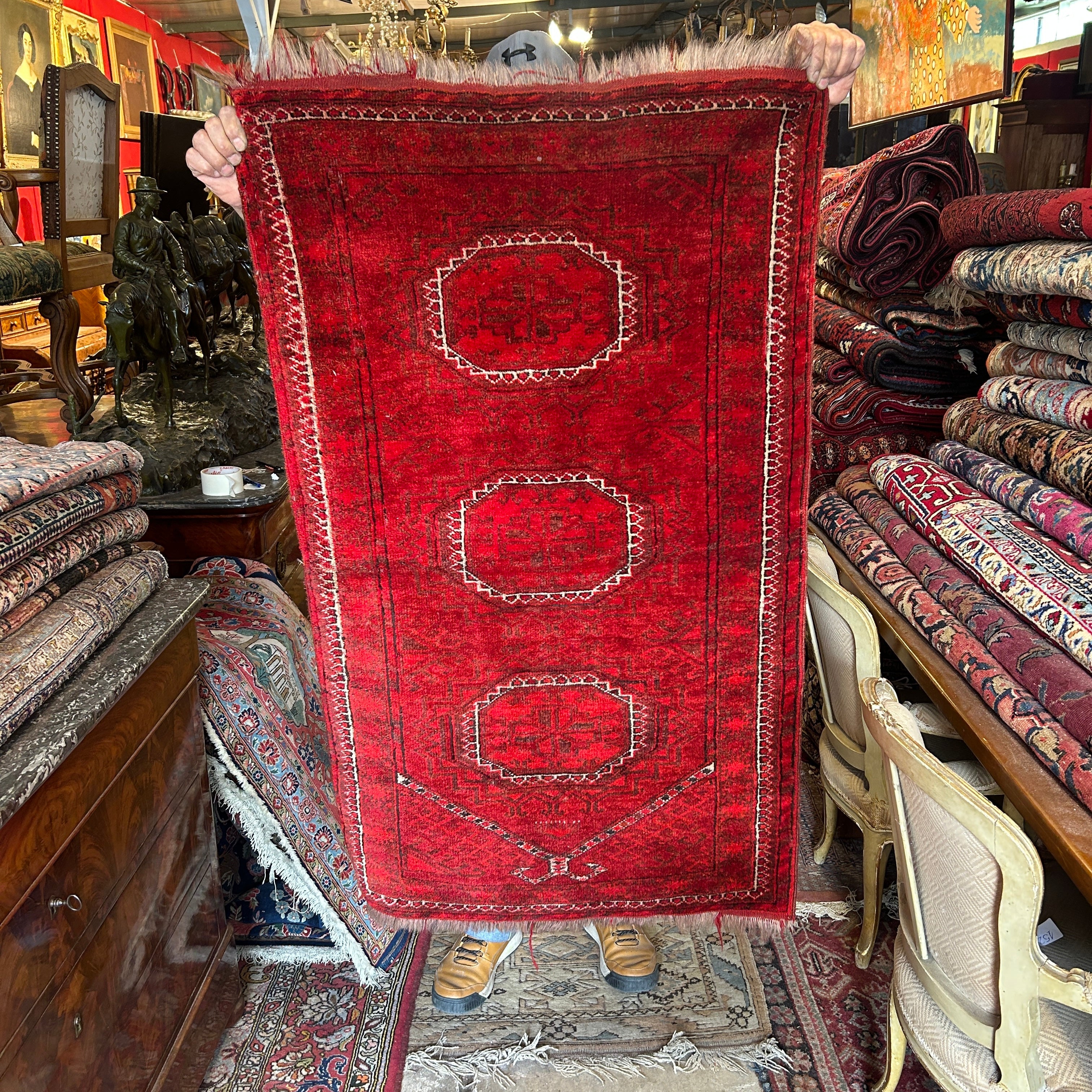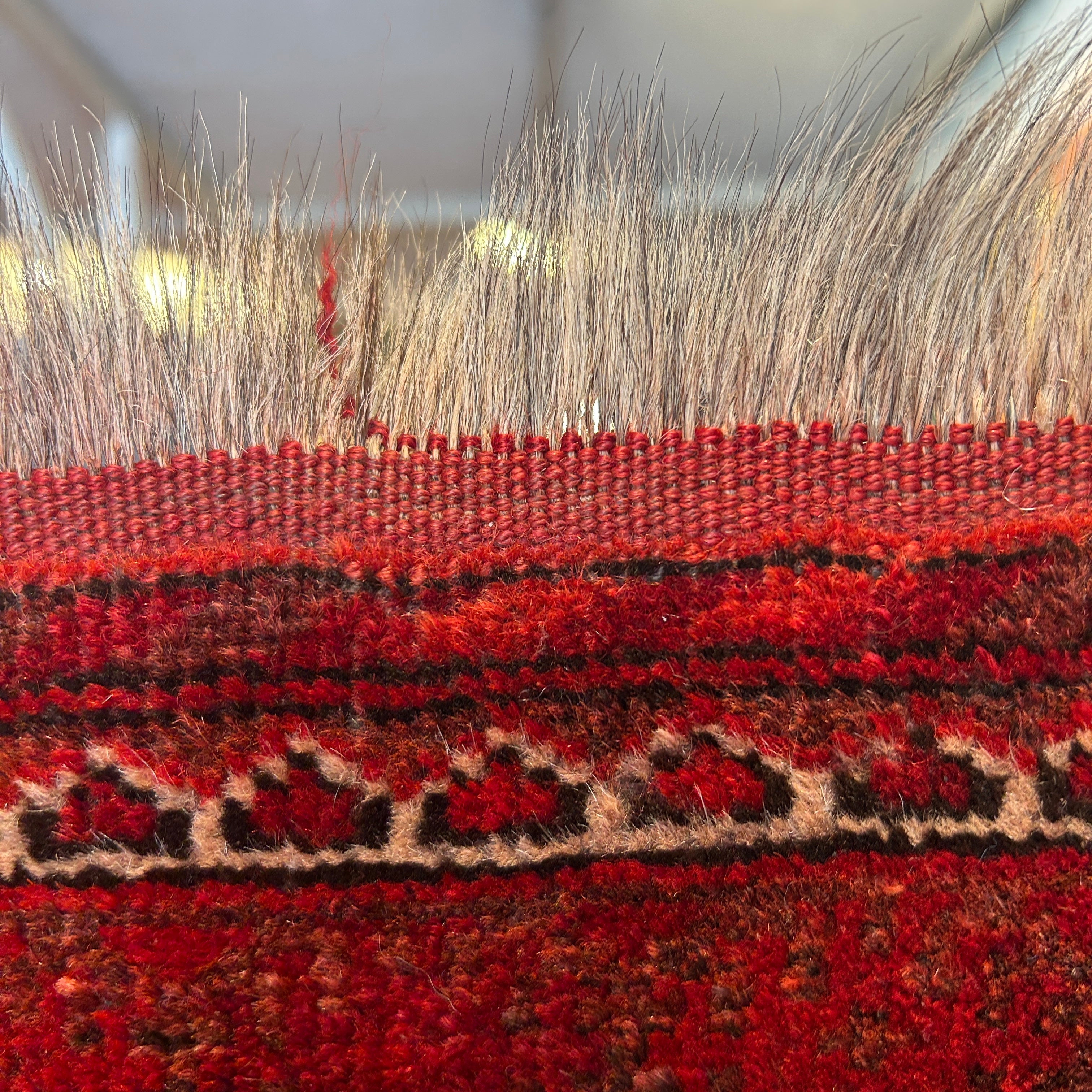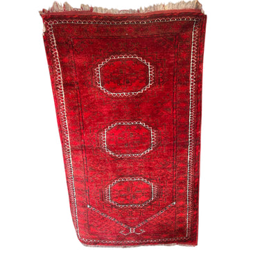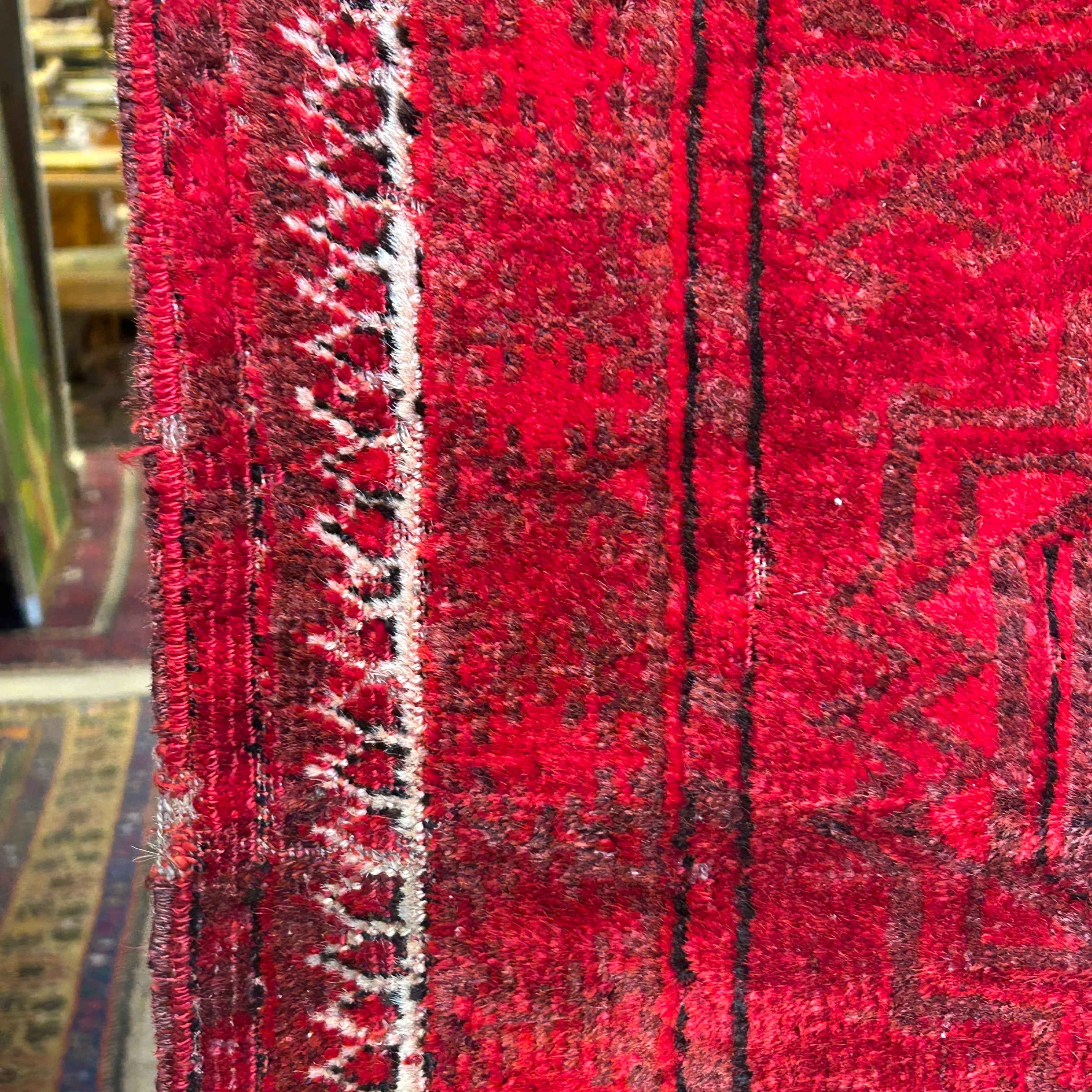 Bellísima alfombra de origen Cáucaso Ruso, tejida a mano en lana y pelo de camello, teñidos de un llamativo e intenso rojo, con detalles en blanco. La pieza tiene tres figuras circulares centrales, con un borde blanco, rodeado de diseños tejidos en negro y bordes en blanco y negro, cerrando la pieza. En sus extremos, a la vista, las fibras de pelo camello, elemento distintivo de esta alfombra.