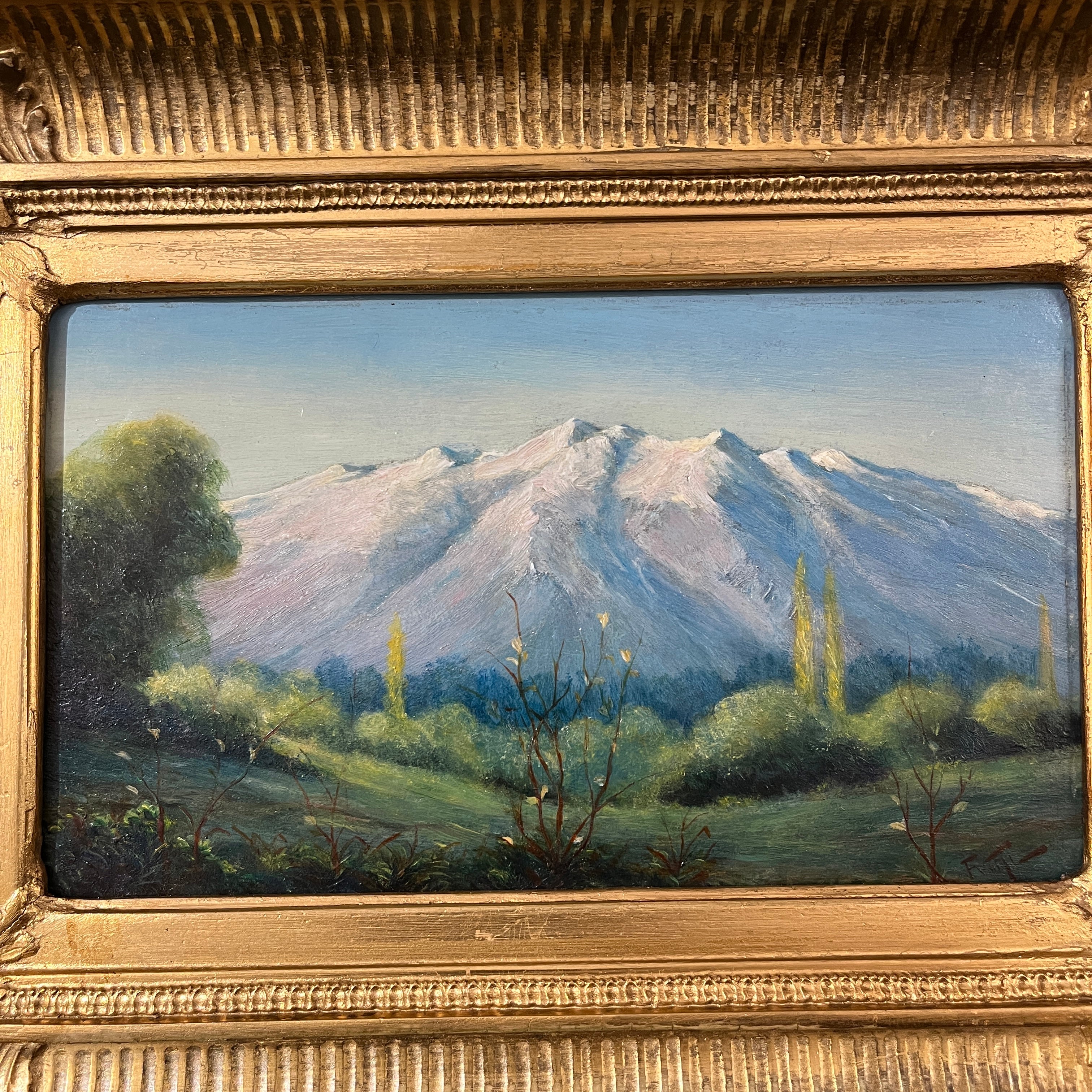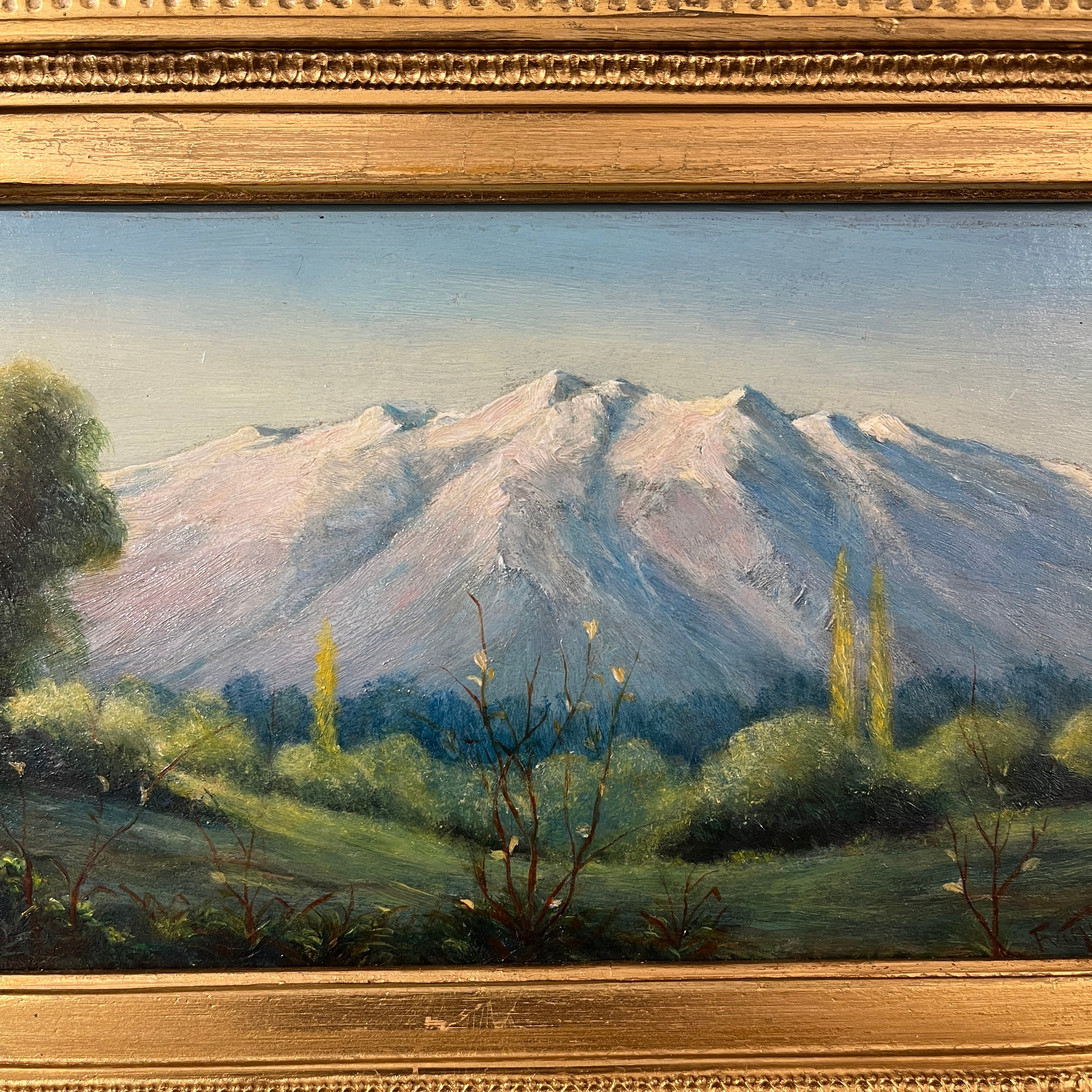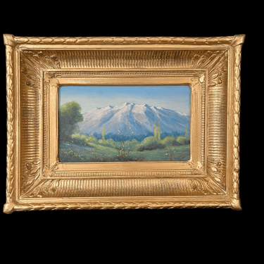 Óleo de pequeño formato de una vista al valle con una prominente cordillera de fondo. En la obra se puede destacar sus intensos verdes que se matizan con una cordillera en tonos suaves pero aun así con el fuerte relieve que la caracteriza. Es una que puede otorgar luminosidad al espacio donde se desee exponer. El marco dorado otorga una especial profundidad que permite dar más notoriedad a la obra.