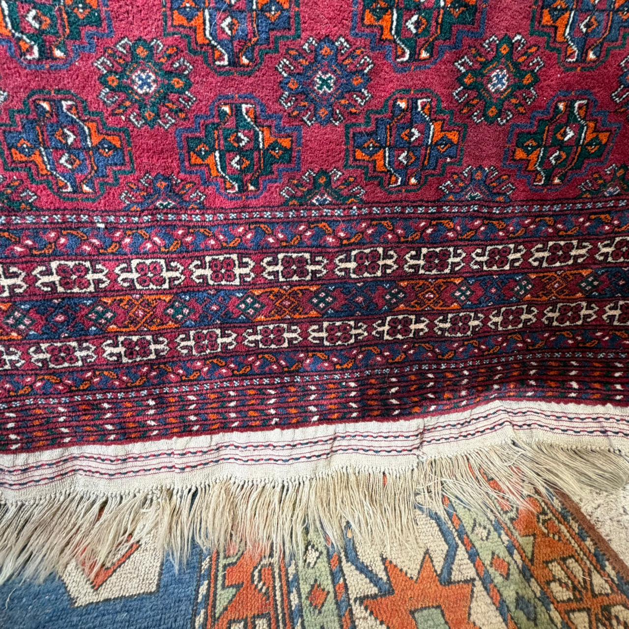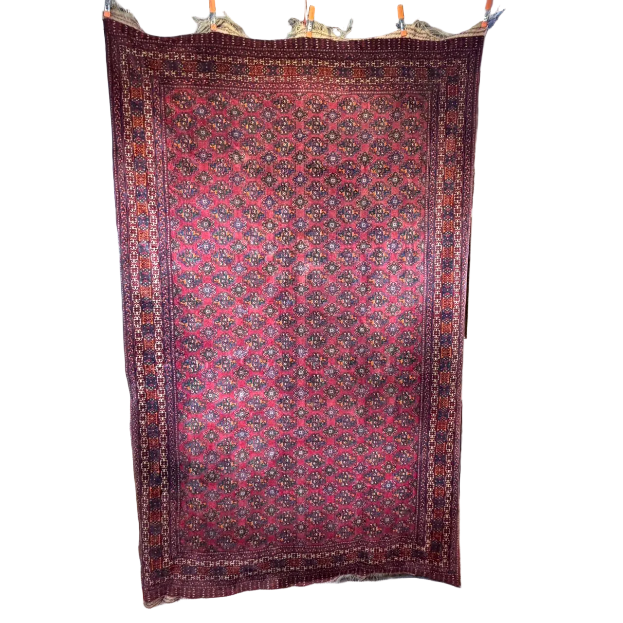 Hermosa alfombra de la tribu nómada Baluch (también se puede escribir Beluch, Balochi o Belochi) del noreste de Irán bordeando la frontera con Afganistán. Es una alfombra que se caracteriza por su especial suavidad debido a la técnica de nudaje particularmente compacto, lo que la vuelve más liviana y flexible. Se calcula que debe tener más de cuarenta años, sin embargo su excelente estado permite que pueda seguir utilizándose en salones y espacios amplios en general, donde se pueda apreciar su magnificencia. Es una pieza manufacturada, que destaca por el uso de pigmentos naturales, predominando el rojo y con pequeñas geometrías que acompañan todo el paño. La guarda juega con tonos azul cobalto y otros terrosos.