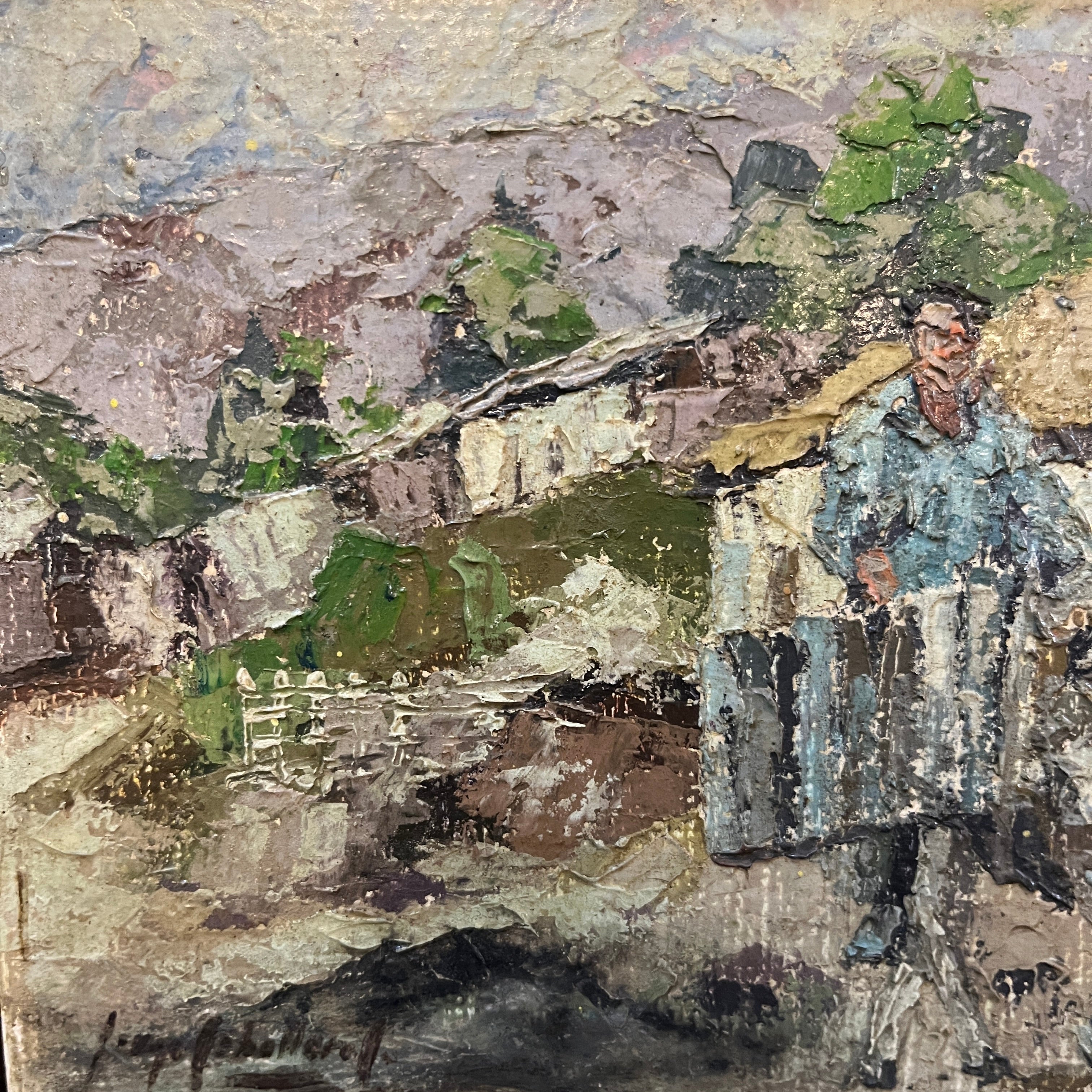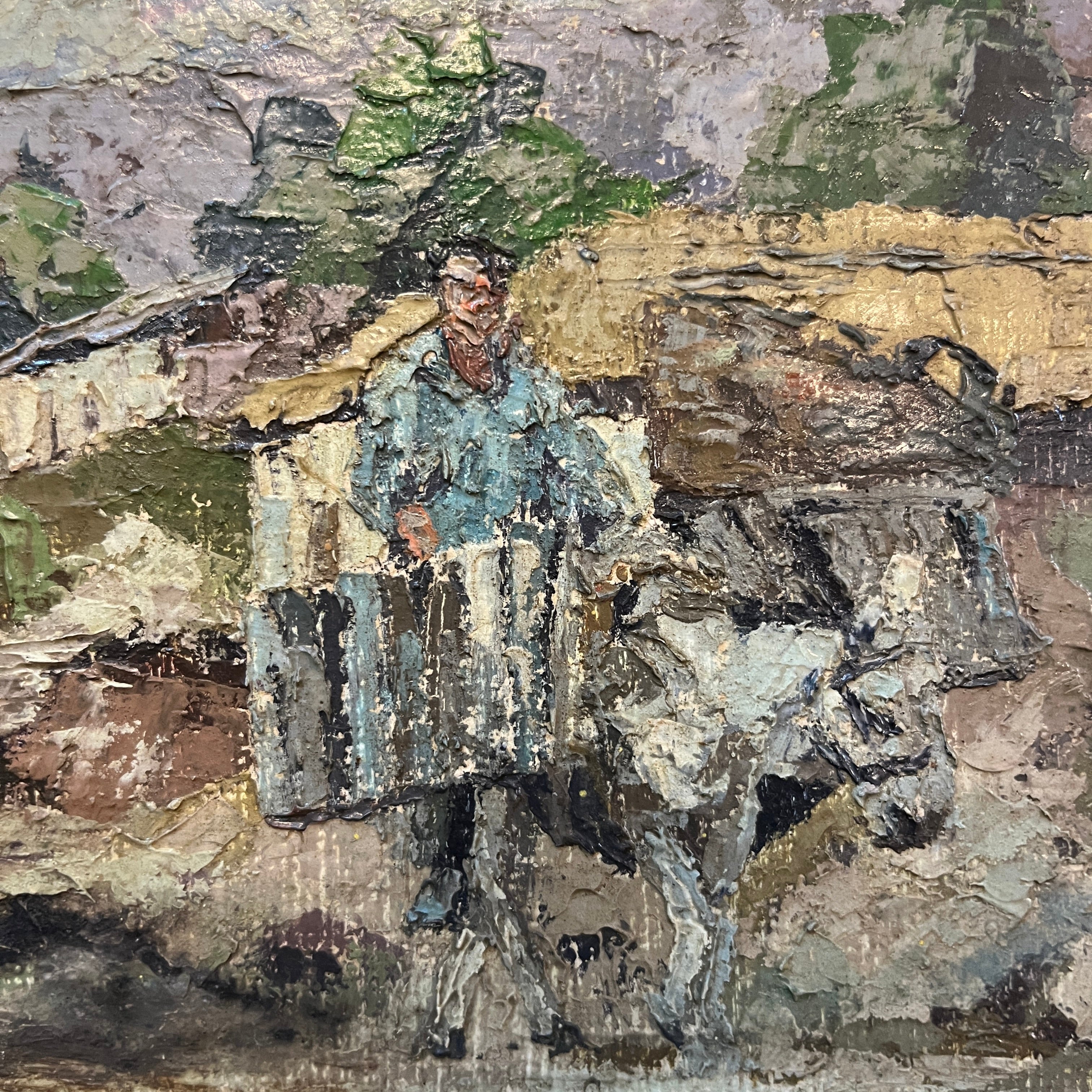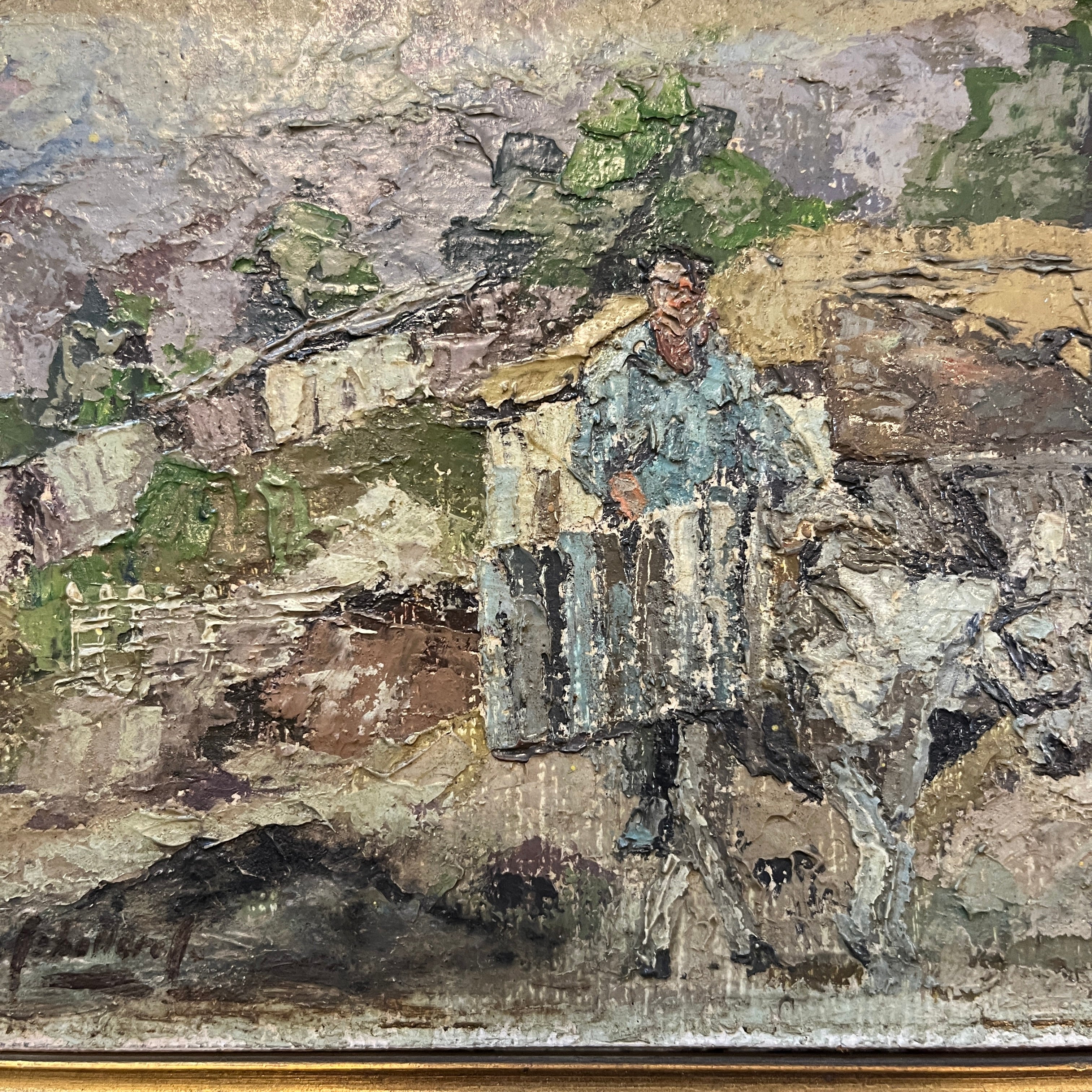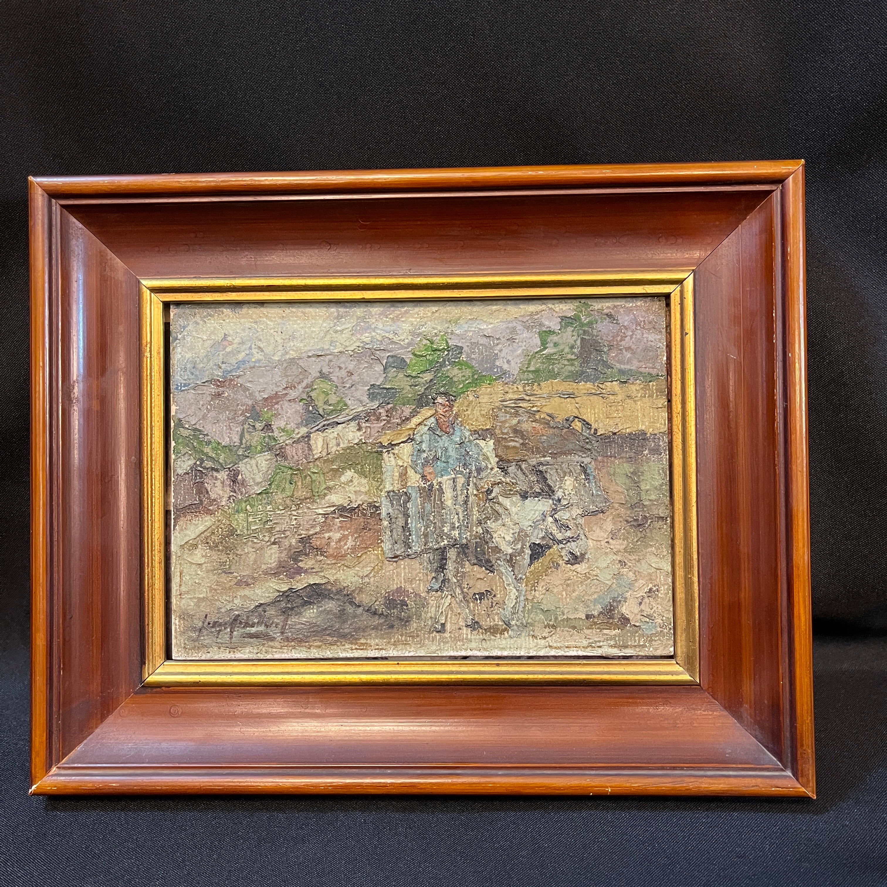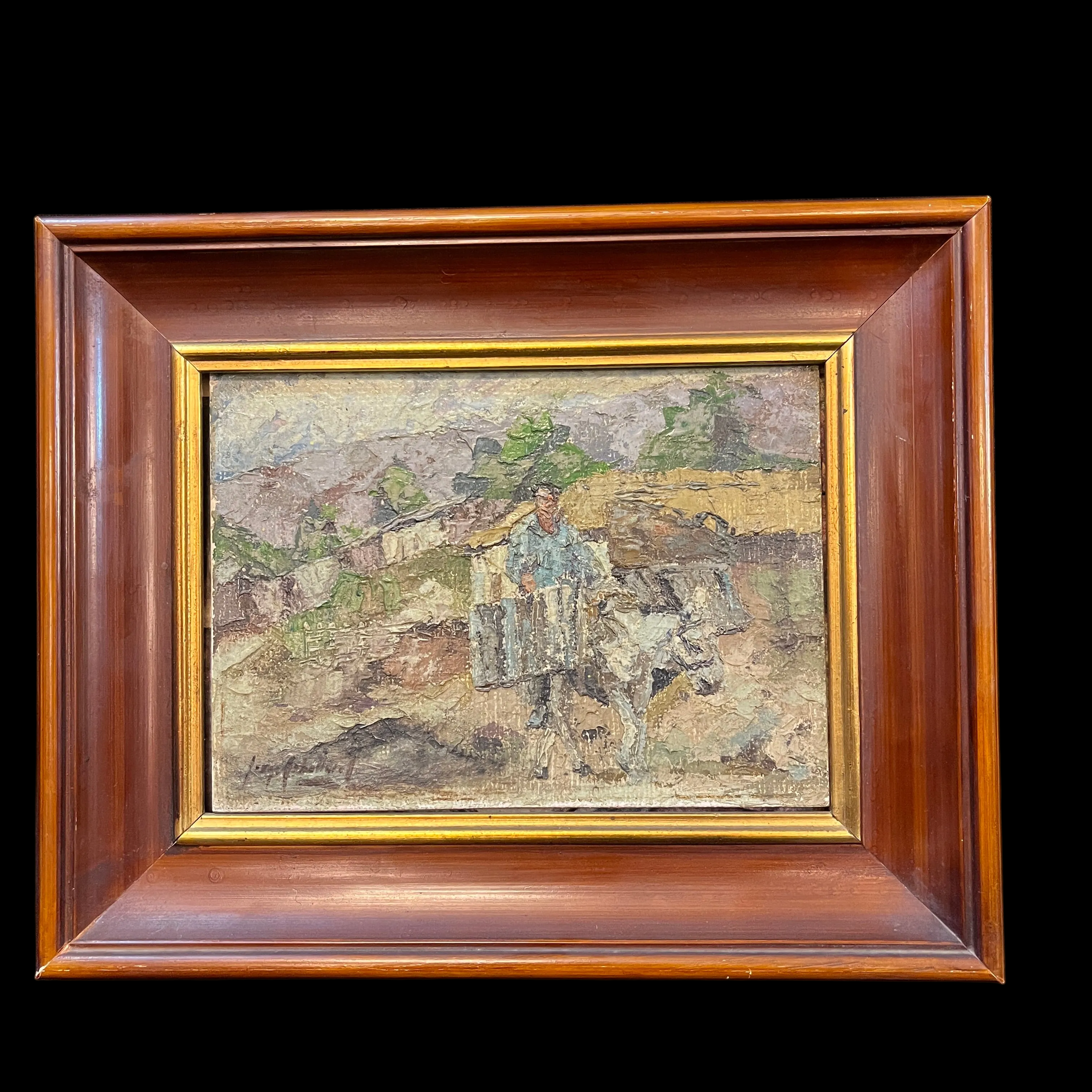 A beautiful small-format oil painting of a peasant on his donkey. A traditional scene from the Chilean countryside. The faithful pack donkey, head down, moves along the streets. In the background, a house and some trees can be seen peeking out from behind the roof. The painting is framed in a simple wooden frame with a gilded border, allowing the artwork to take center stage.