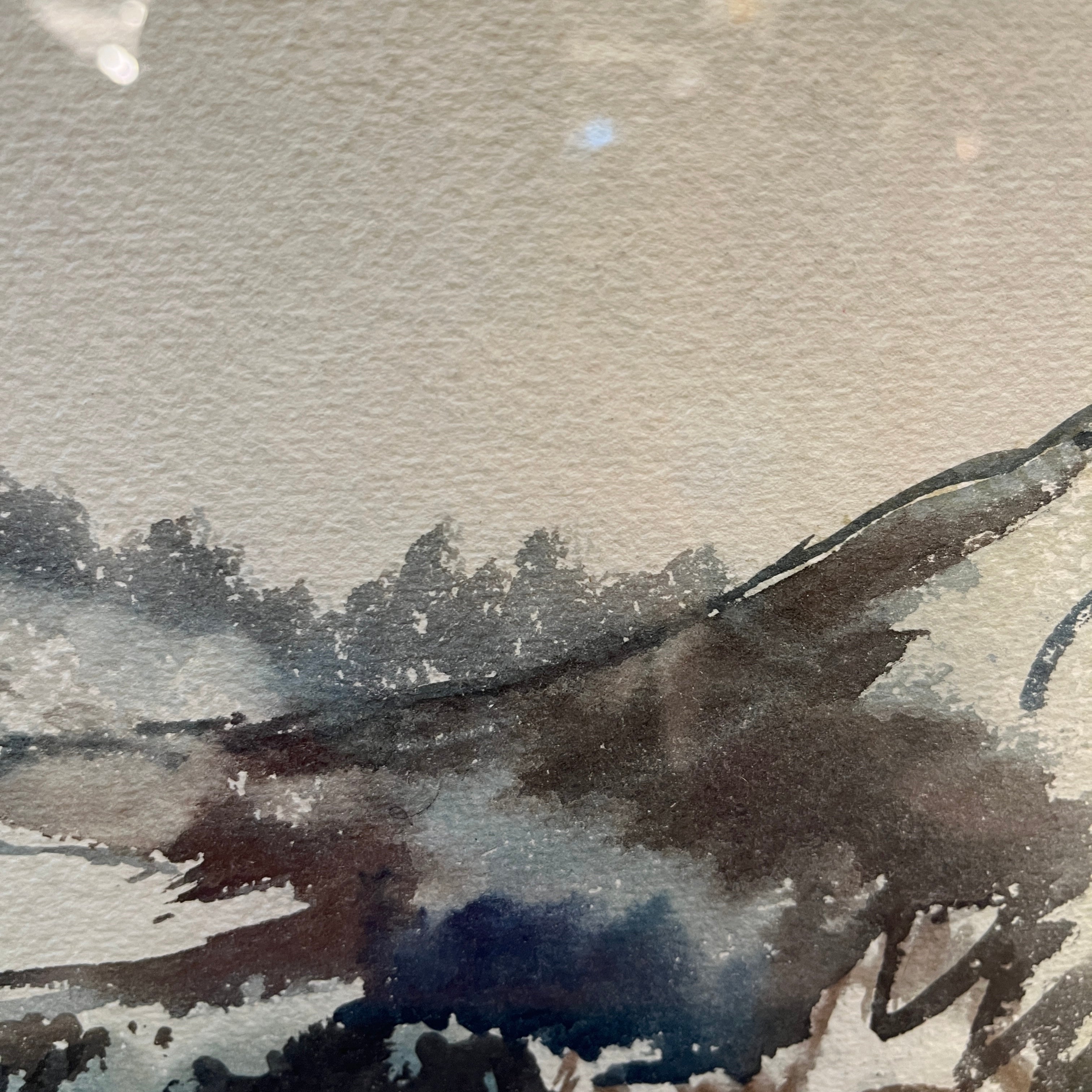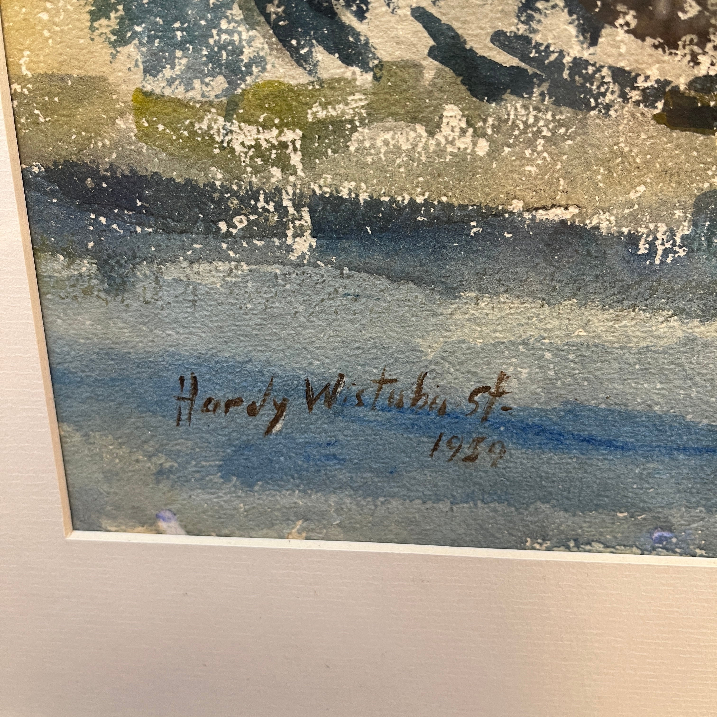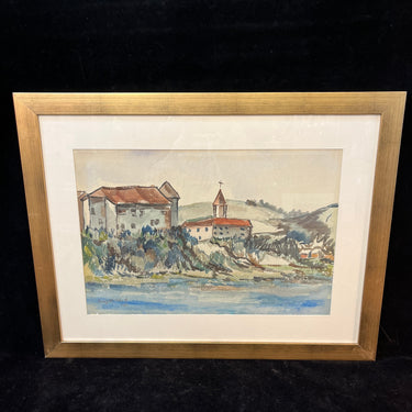 Aquarelle sur papier de l'artiste chilien Hardy Wistuba (1925-2010), peinte en 1959, représentant un paysage, probablement du sud du Chili, avec un bâtiment et une église au bord d'une colline surplombant un plan d'eau. Cette peinture utilise la technique de l'aquarelle, lui conférant une texture humide et des couleurs froides, transmettant ainsi une impression de paysage au spectateur. L'œuvre est présentée dans un cadre contemporain en bois au design sobre et à la finition dorée.