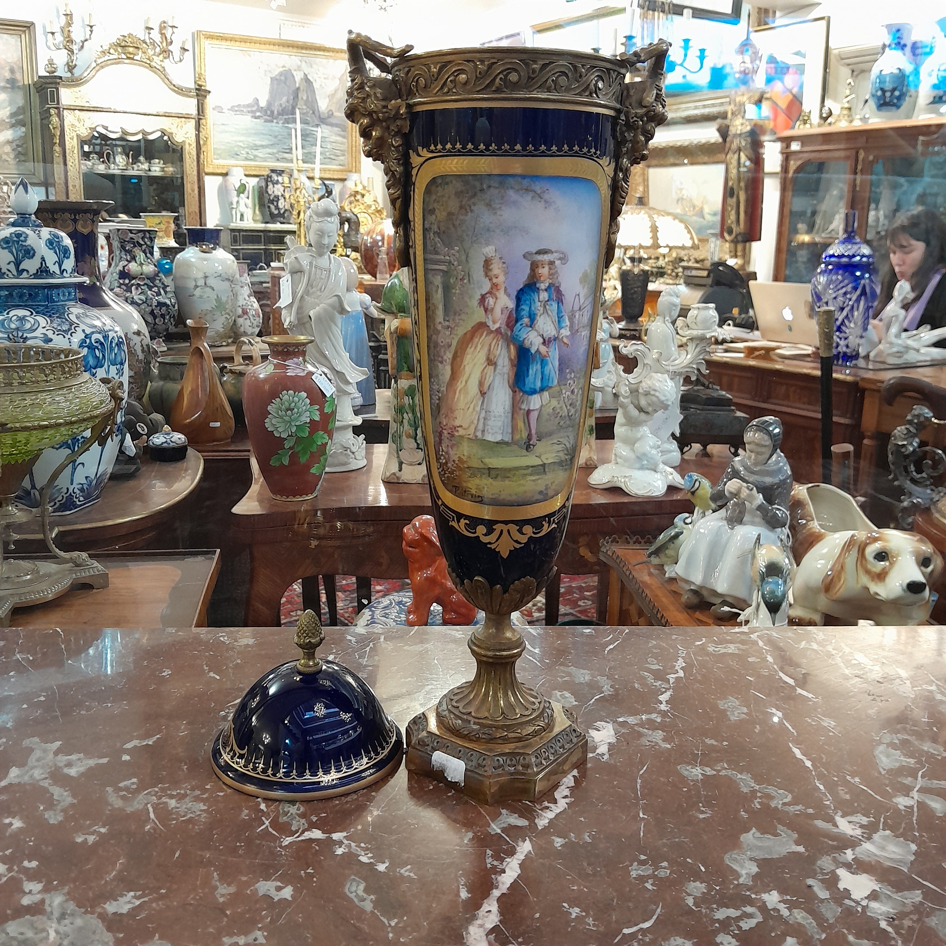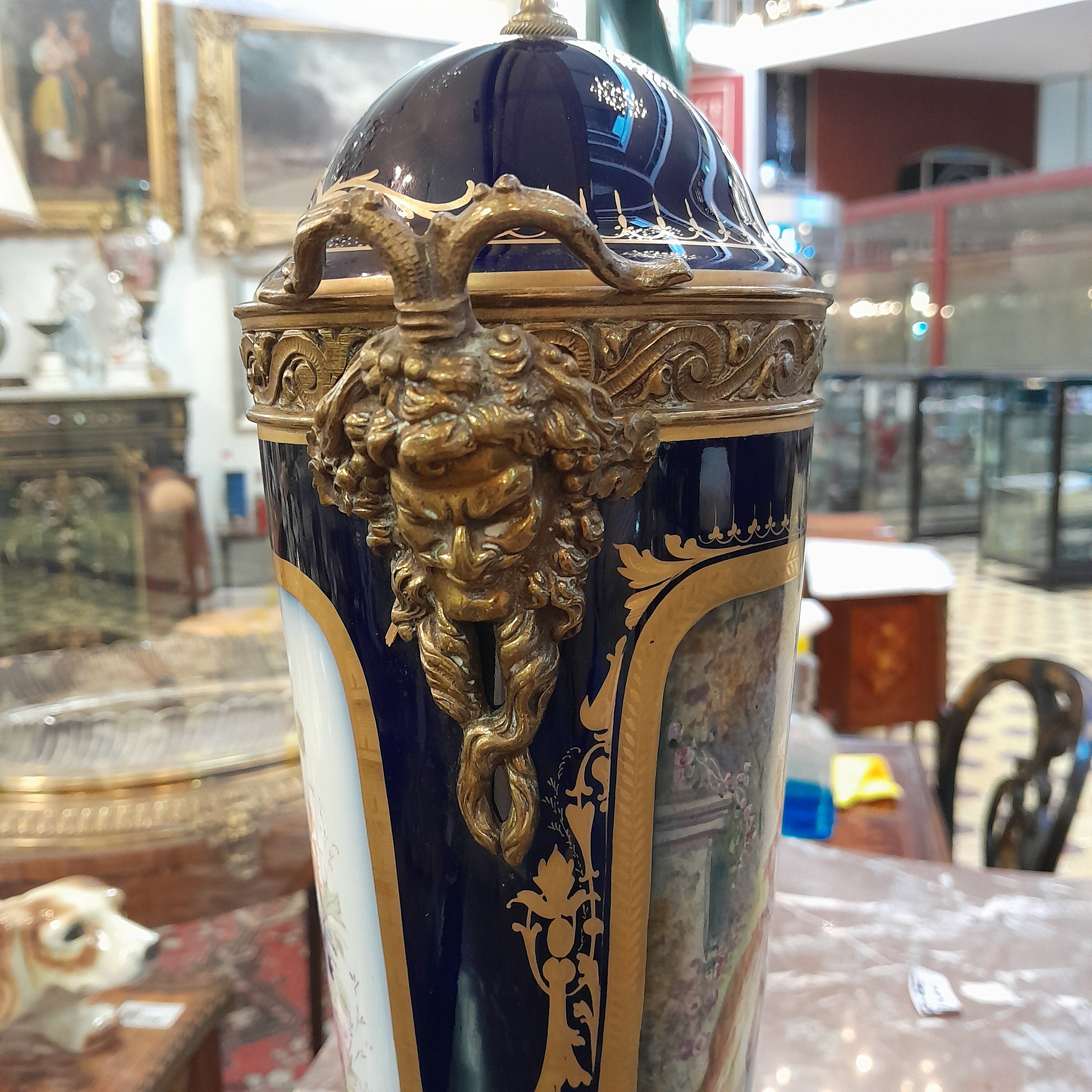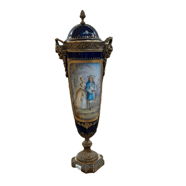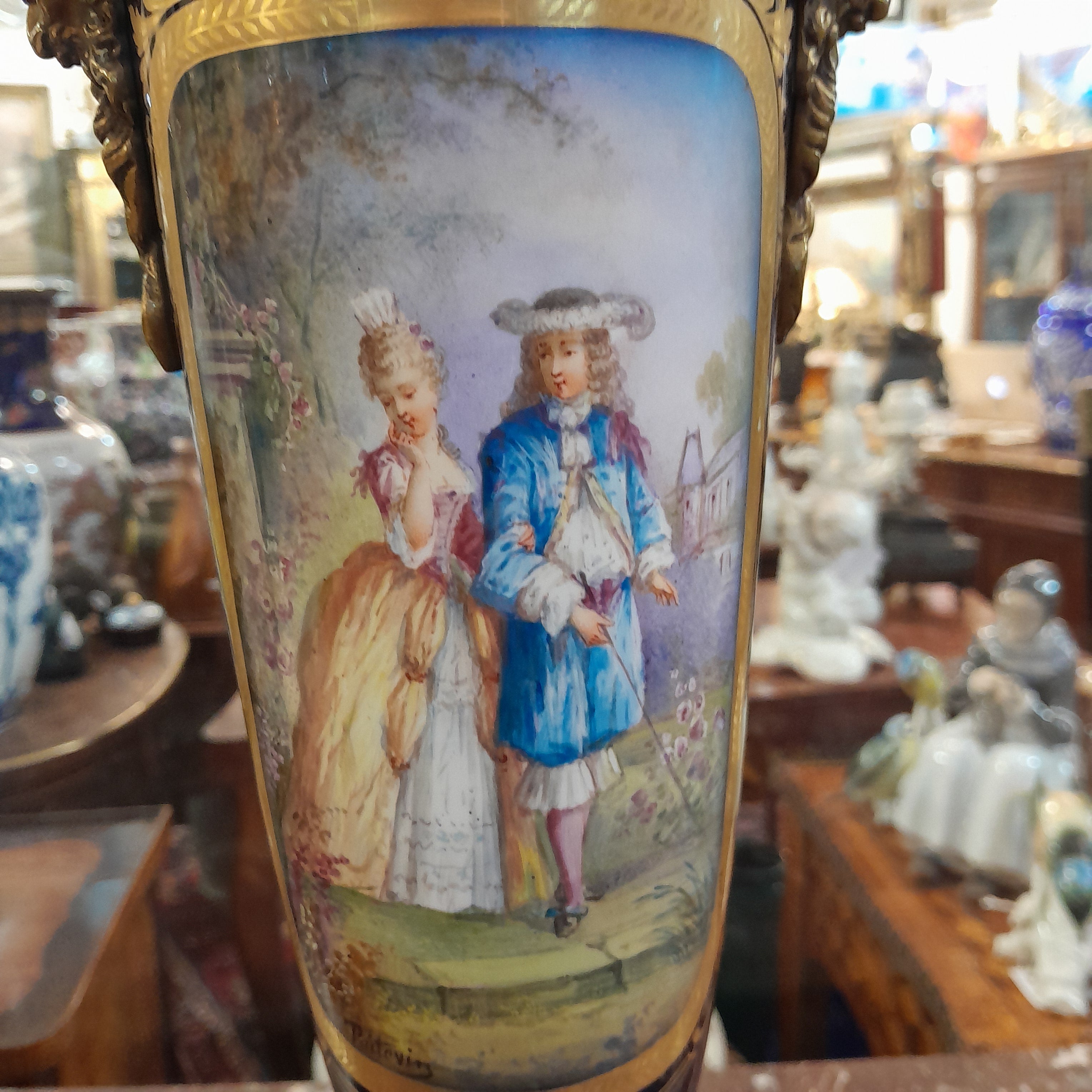 Magnifique amphore à fond bleu cobalt et détails dorés. Le compartiment central présente un portrait en céramique émaillée d'un couple coquet se promenant, tandis qu'un autre compartiment présente un décor floral. Le couvercle, les anses, les montures et la base sont en bronze ciselé. Les anses présentent deux figures masculines. Signée « Sèvres ».