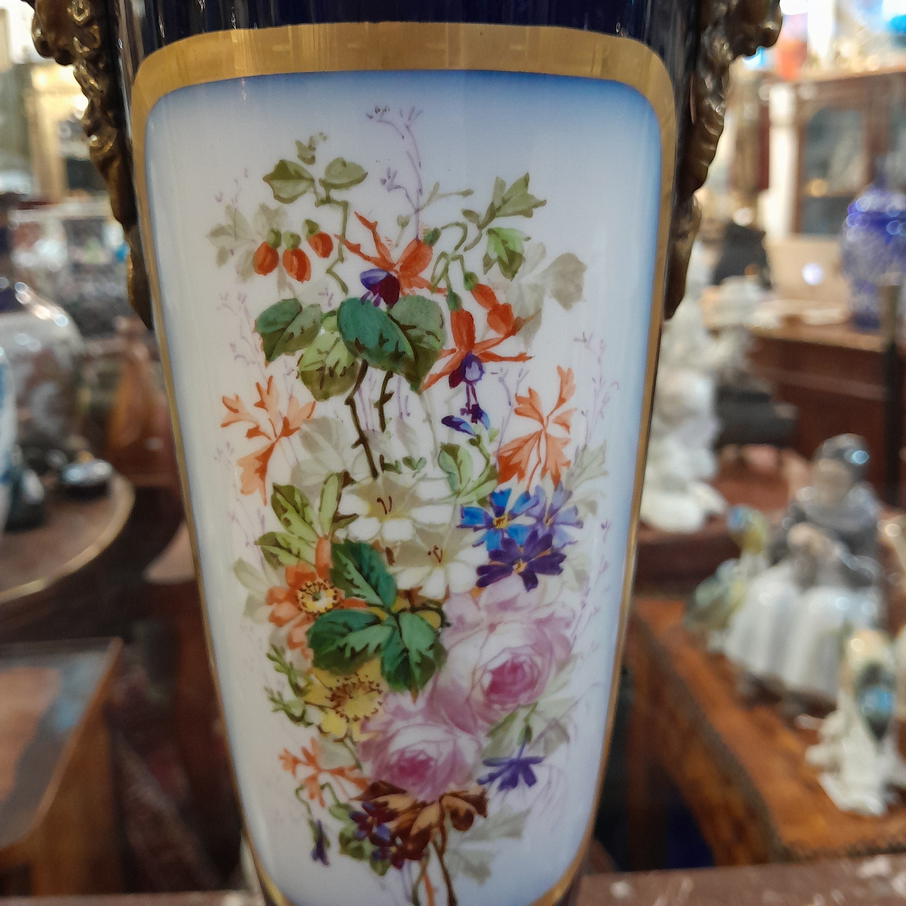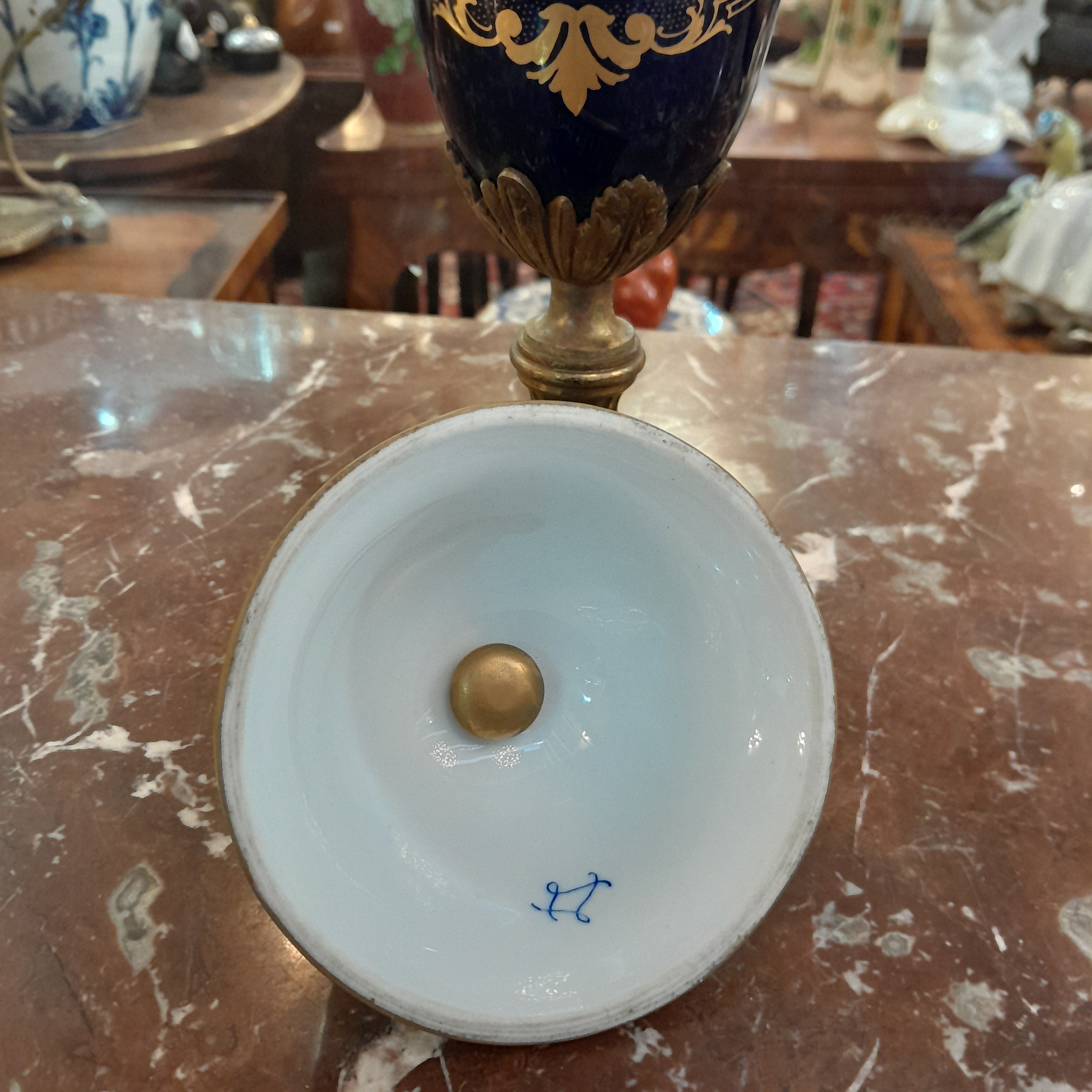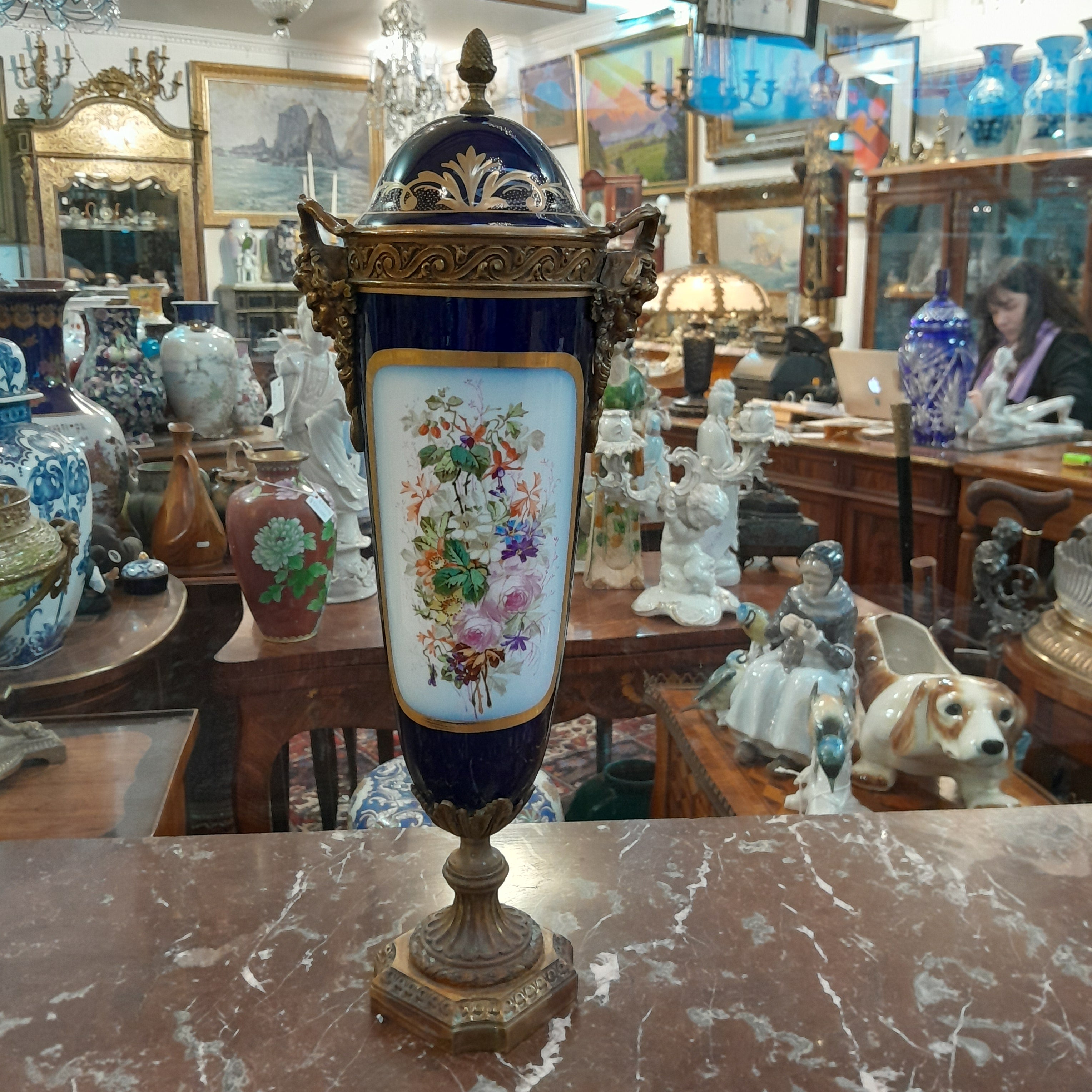 Magnifique amphore à fond bleu cobalt et détails dorés. Le compartiment central présente un portrait en céramique émaillée d'un couple coquet se promenant, tandis qu'un autre compartiment présente un décor floral. Le couvercle, les anses, les montures et la base sont en bronze ciselé. Les anses présentent deux figures masculines. Signée « Sèvres ».