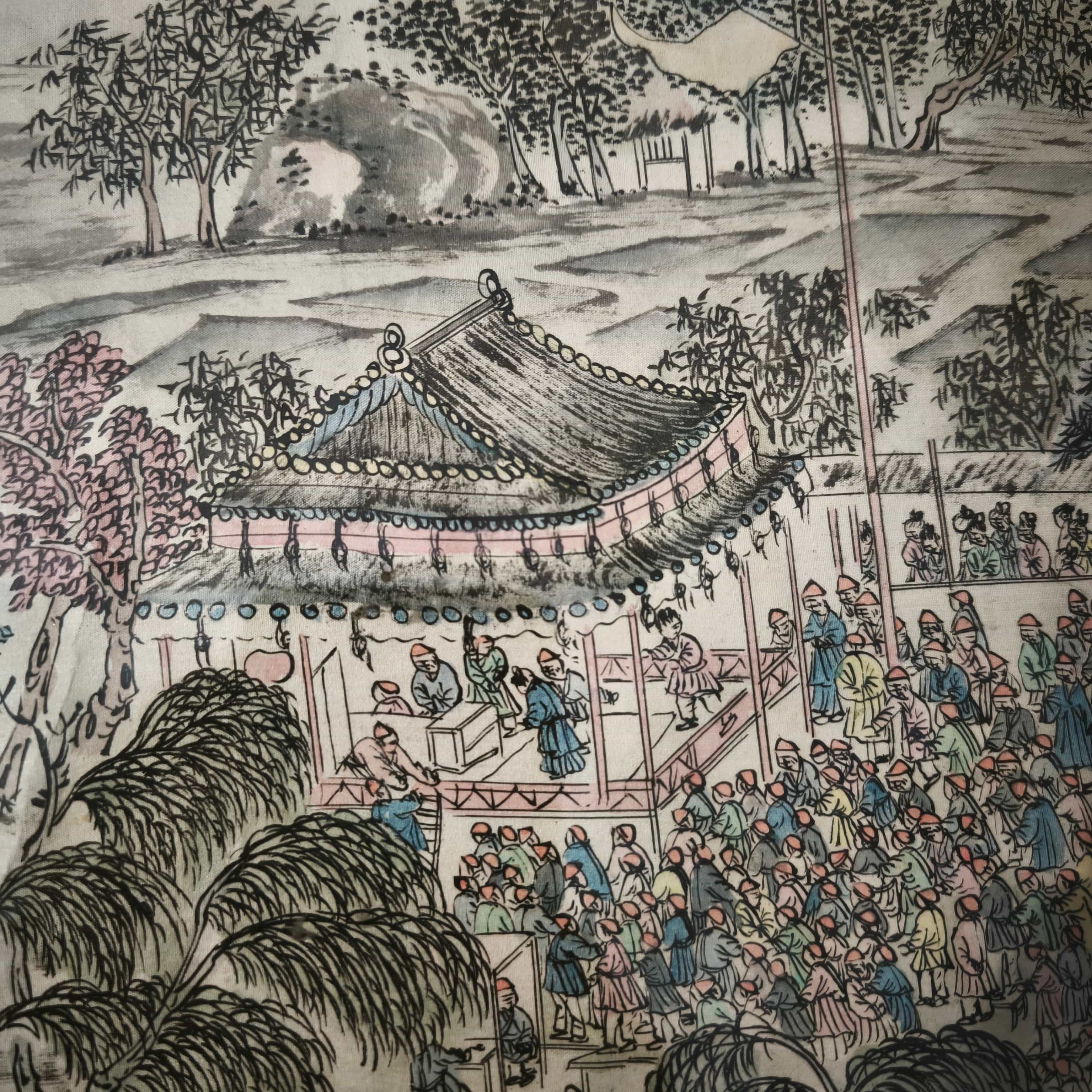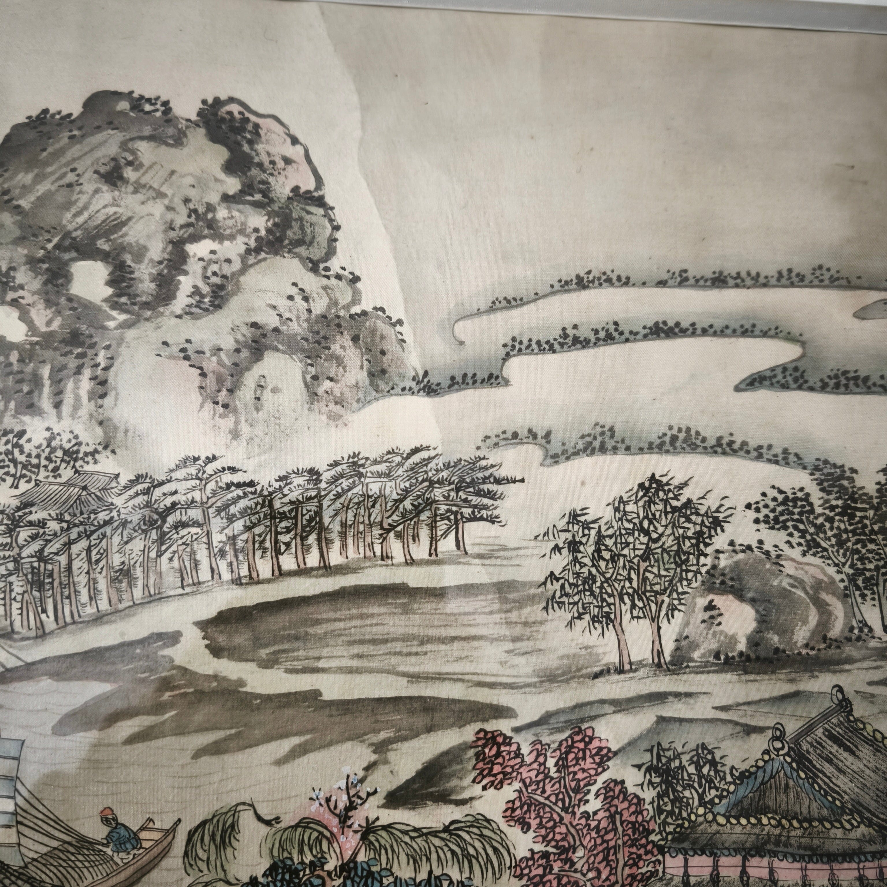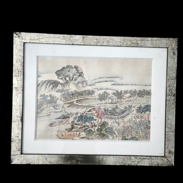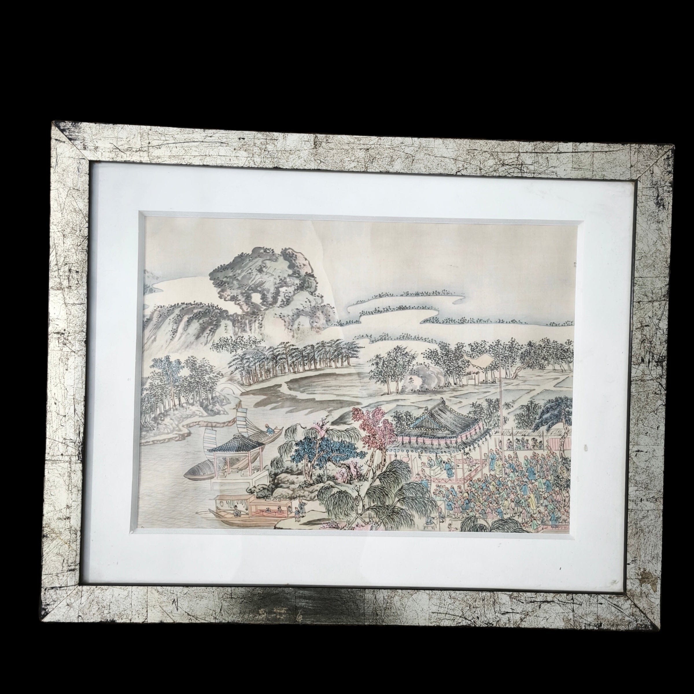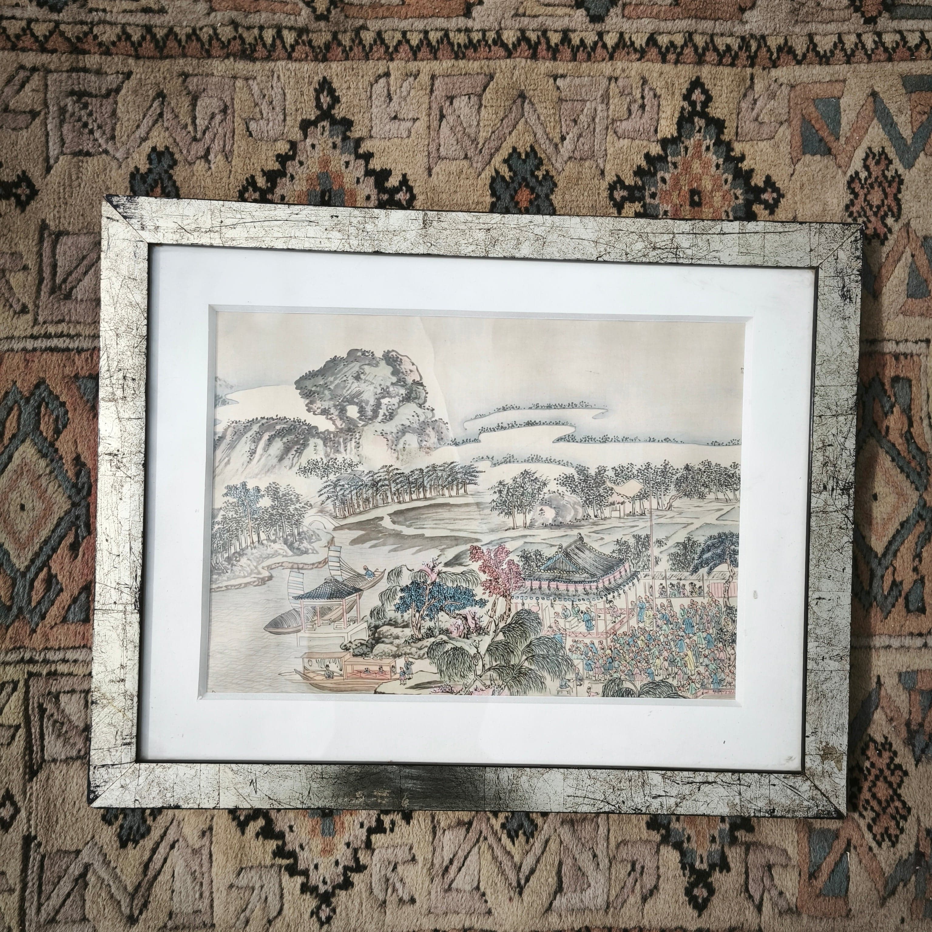 Magnifique estampe chinoise sur toile représentant un paysage naturel, la mer et la forêt. Couleurs magnifiques et lignes délicates, caractéristiques des origines de la gravure. L'œuvre est encadrée dans un cadre métallique.
