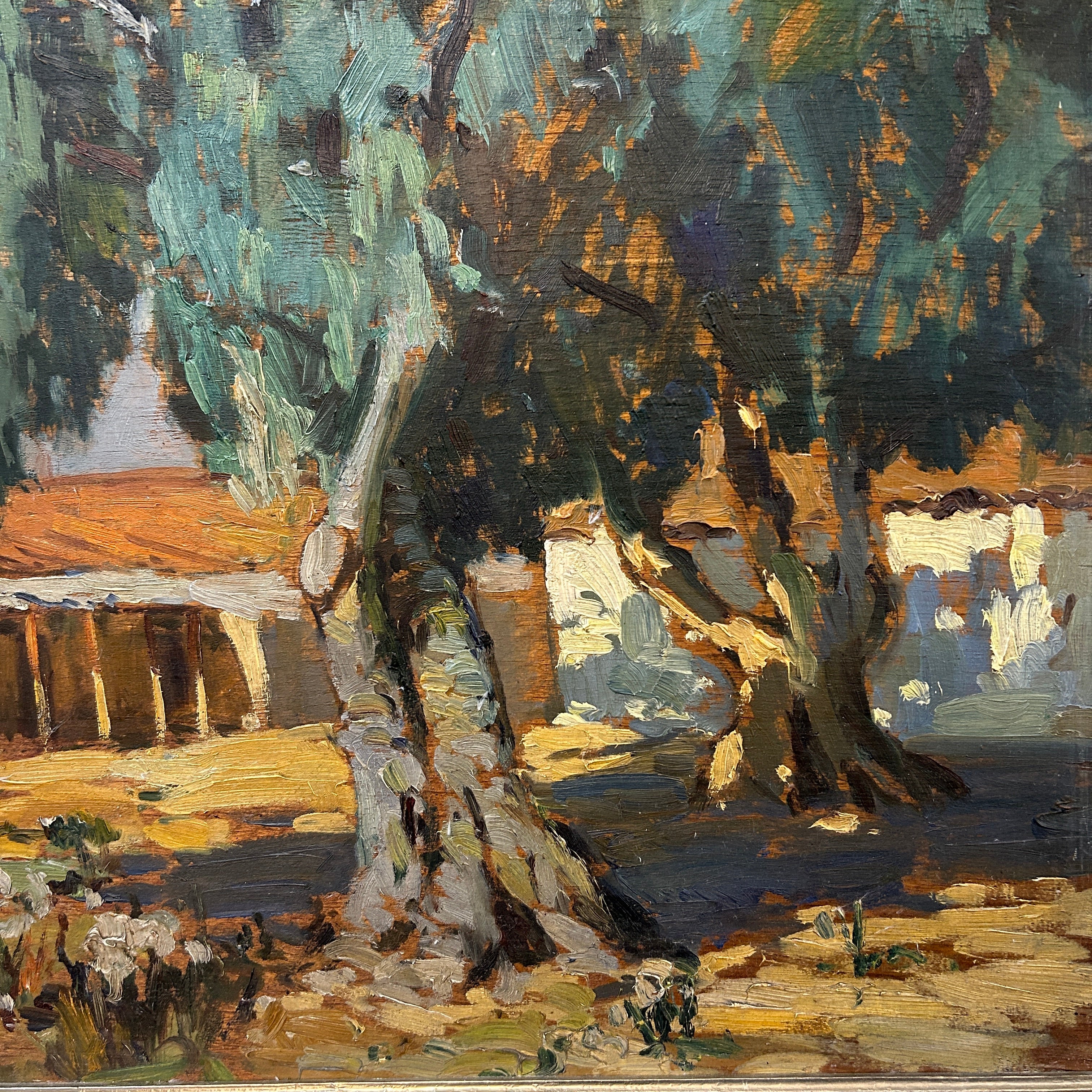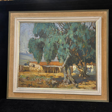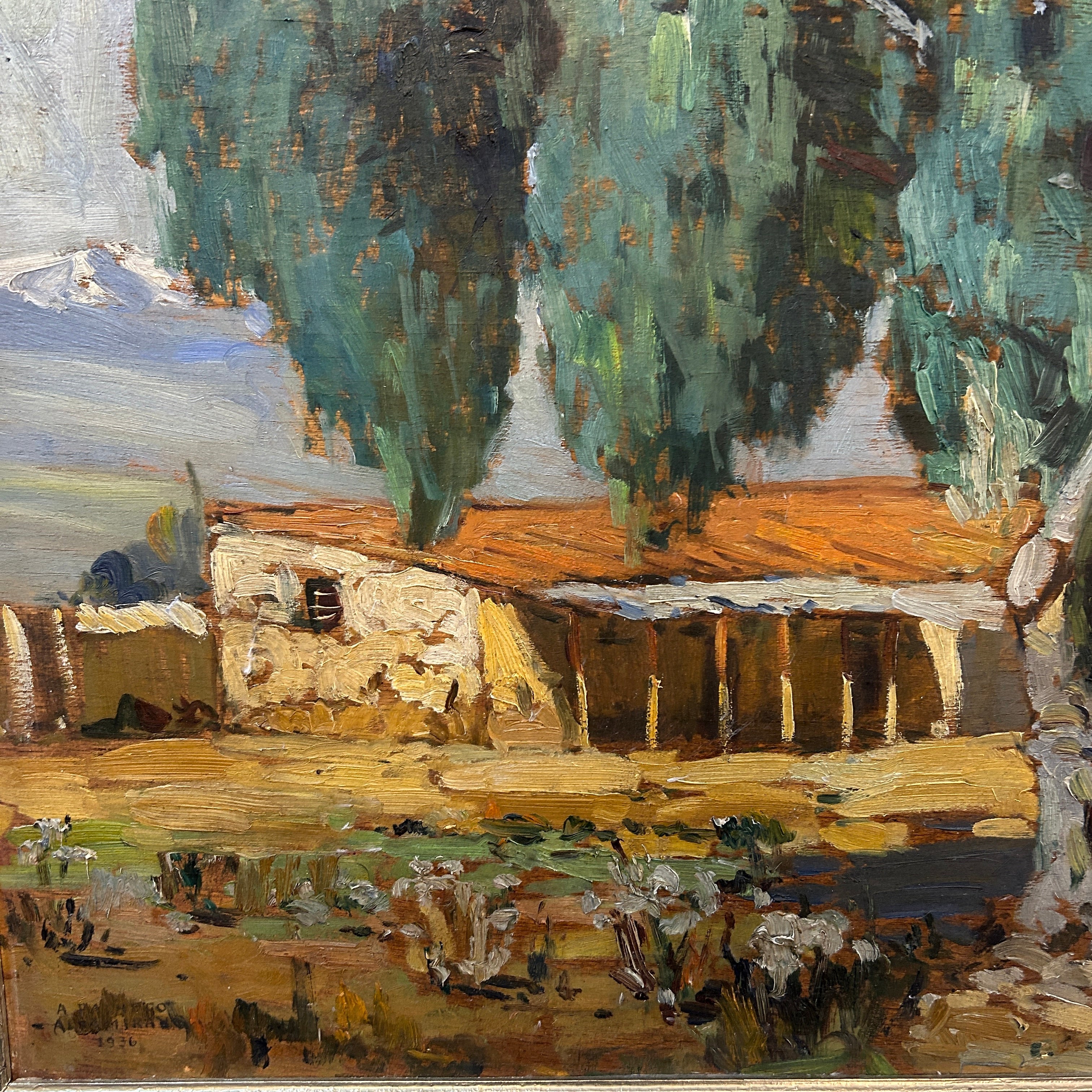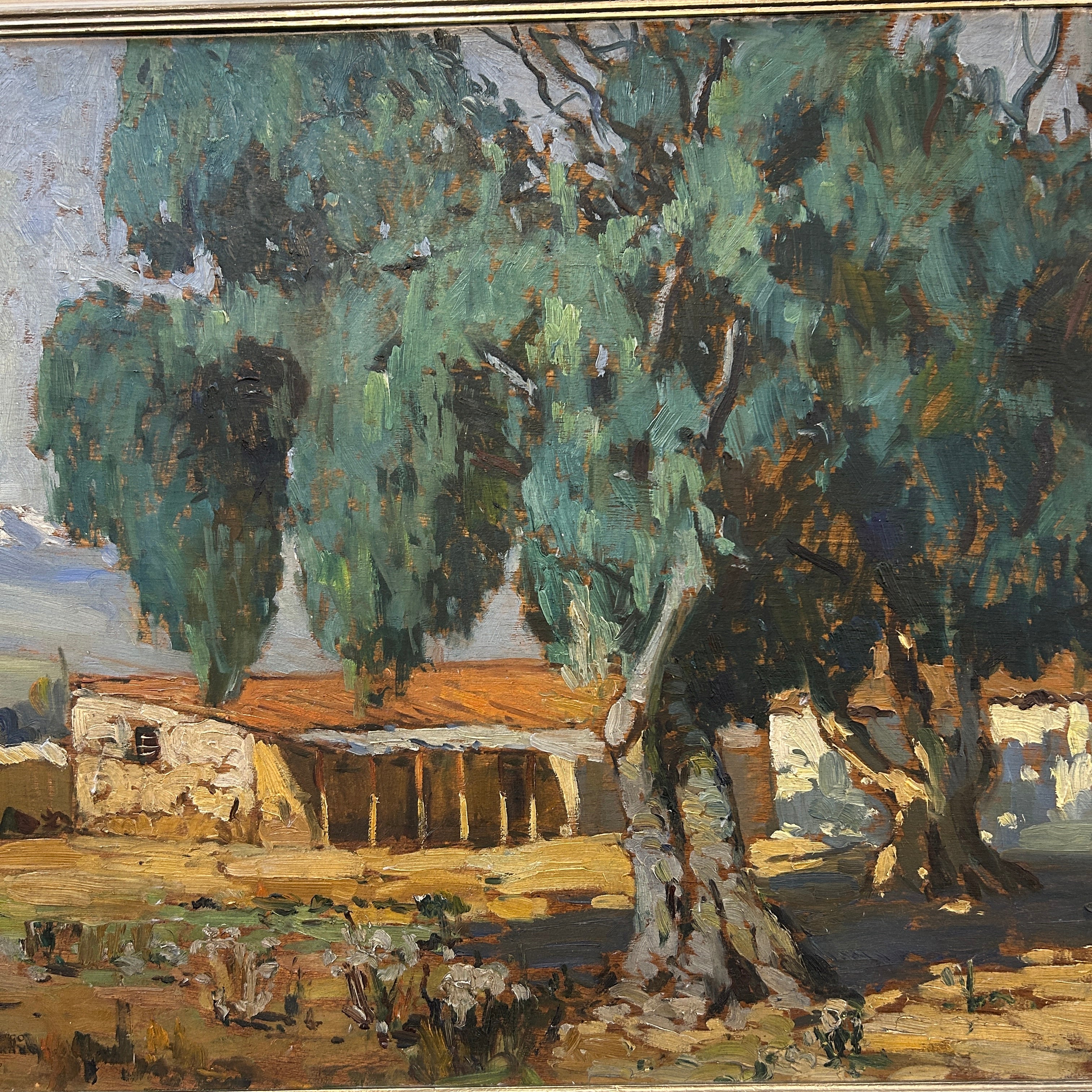 Óleo sobre tela del artista chileno Arturo Pacheco Altamirano, representando un tranquilo paisaje rural, con un par de sauces pintados con trazos expresivos y una típica casa de campo chilena, hecha de adobe, en el fondo. El suelo de tierra proyecta la sombra de los árboles, mostrando el fino trabajo de luz del artista. La obra está enmarcada en madera y fibras naturales.