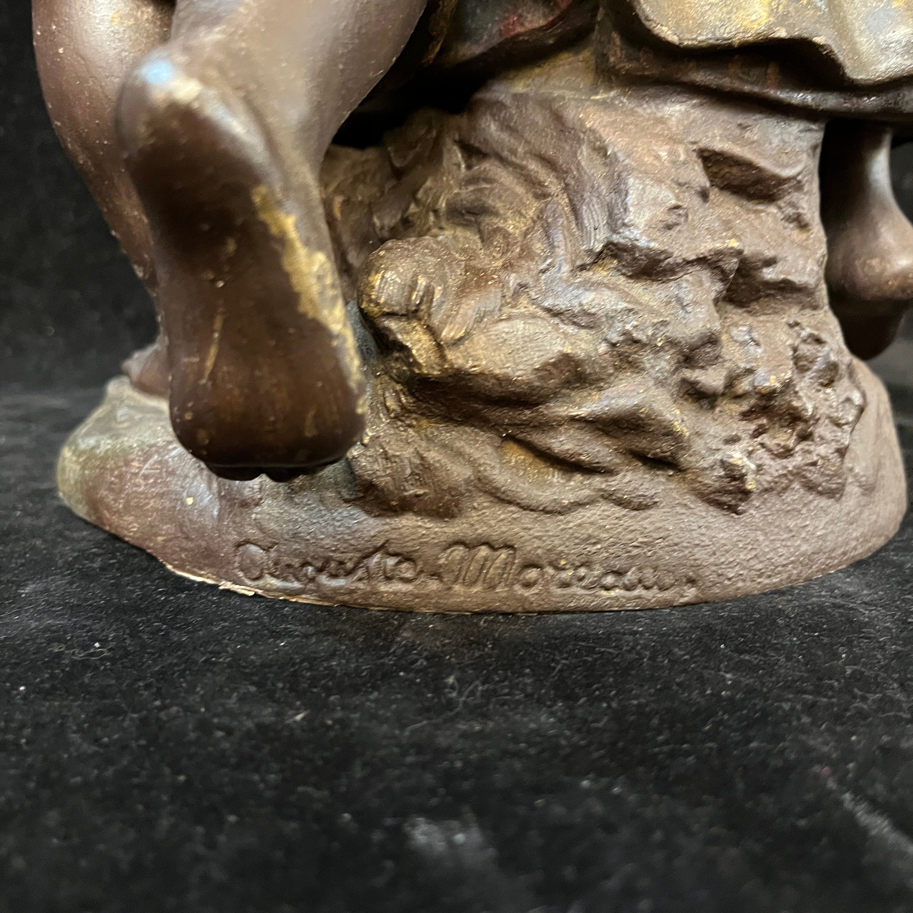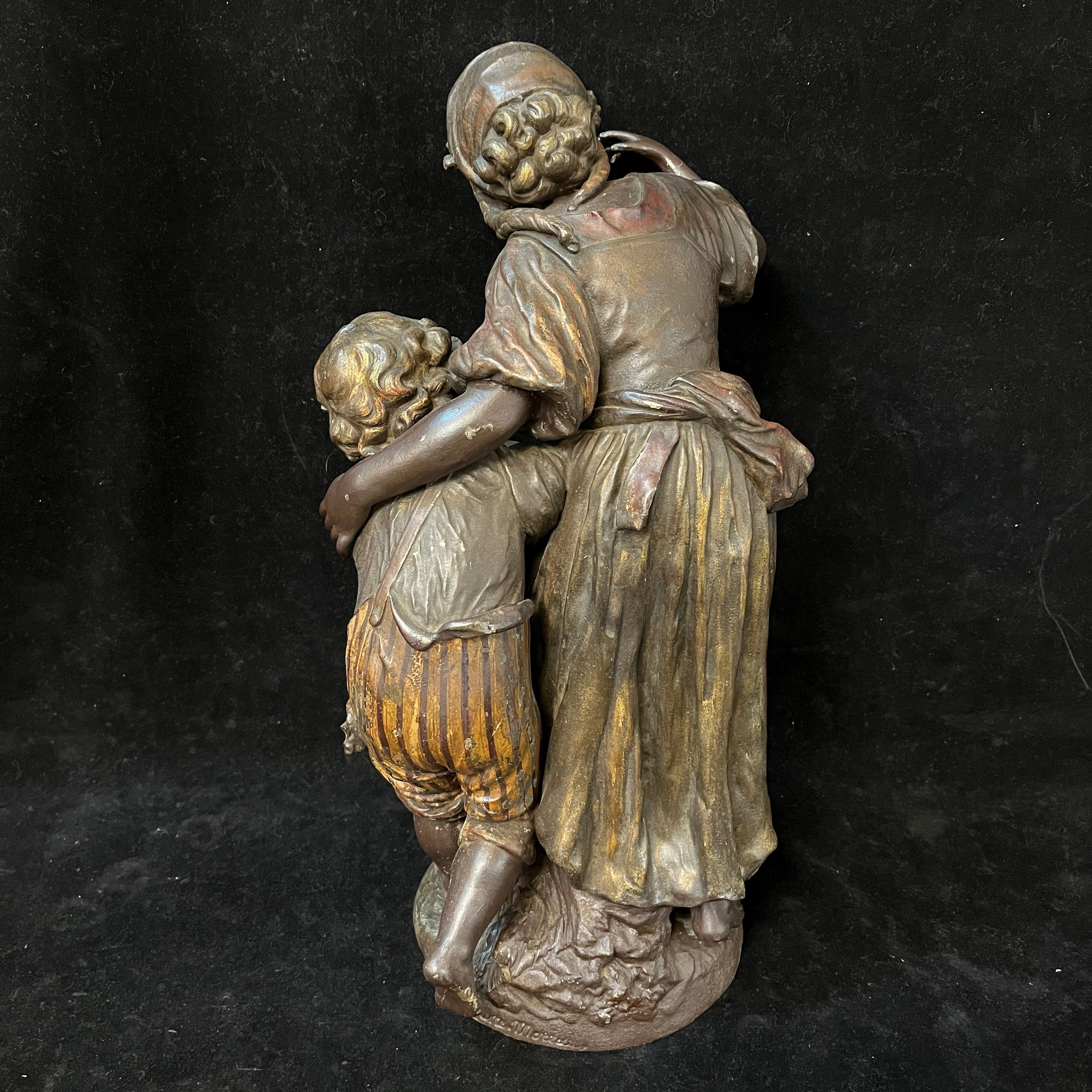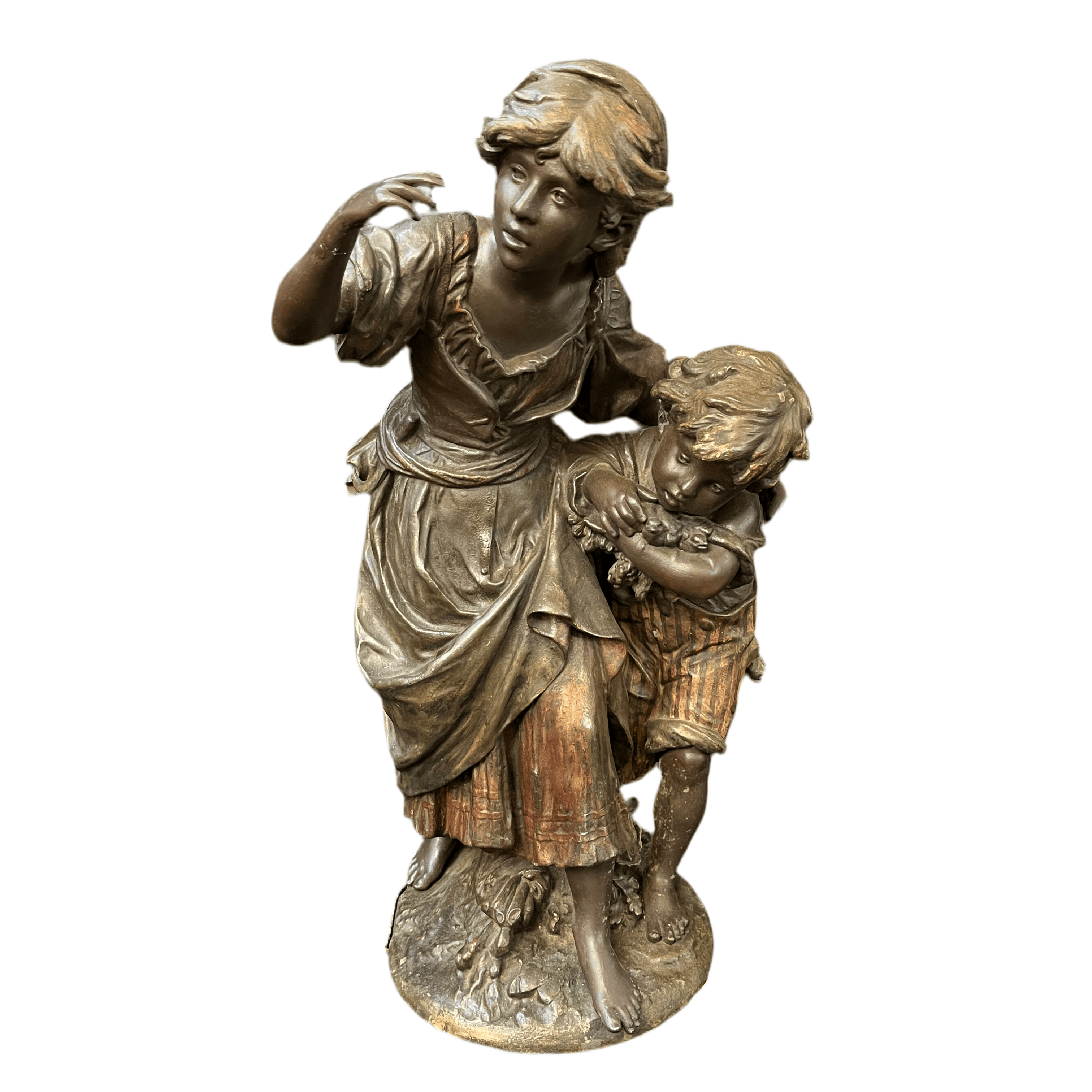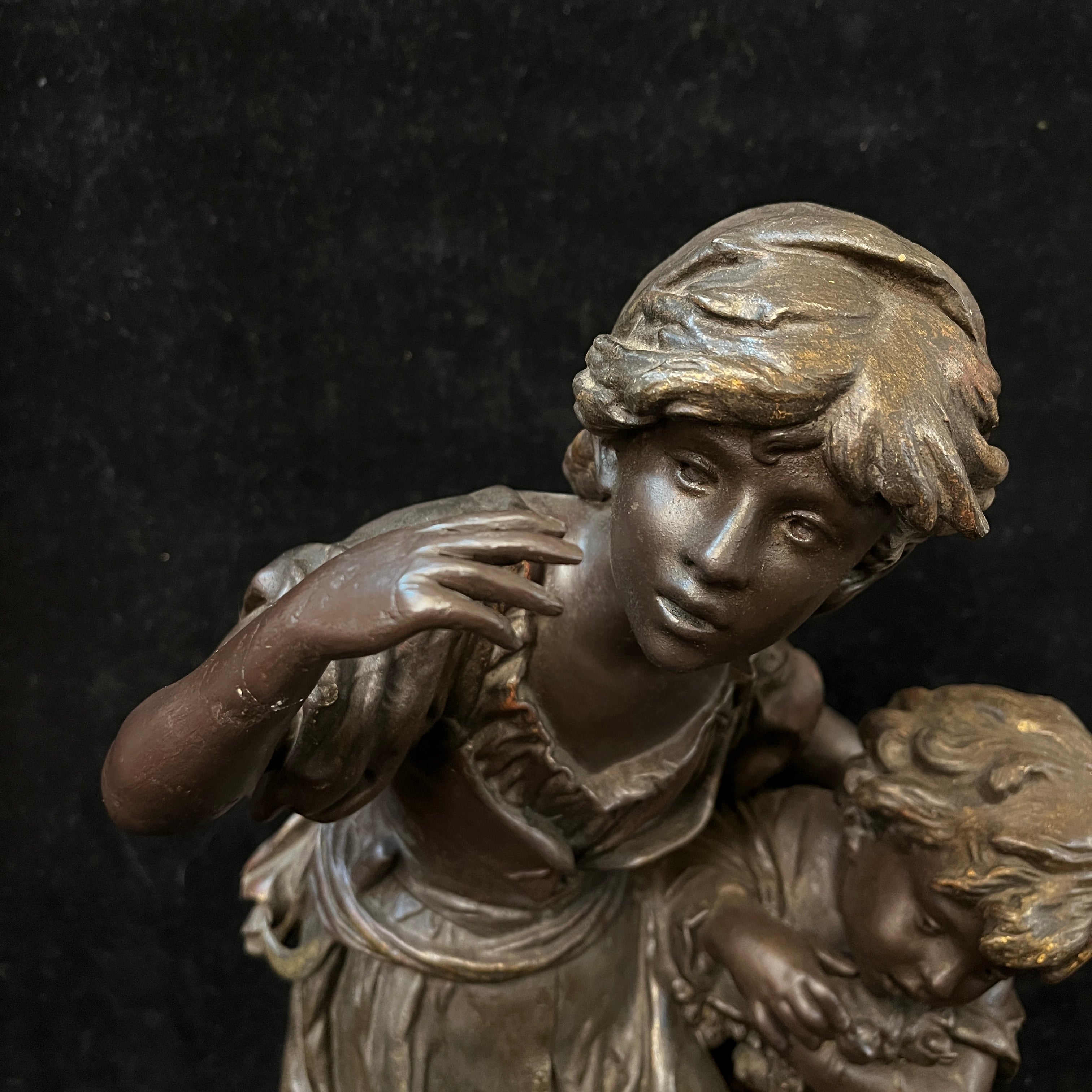Escultura en bronce firmada por August Moreau (1834-1917) escultor y pintor francés conocido por sus obras de estilo realista. Sus obras fueron especialmente populares durante el período de Napoleón III en el siglo XIX. En esta pieza podemos ver a una madre resguardando a su hijo, que a su vez lleva un pequeño animal entre sus brazos. El artista imprime el gesto de urgencia y preocupación de ambos personajes, además de la textura de sus vestimentas.