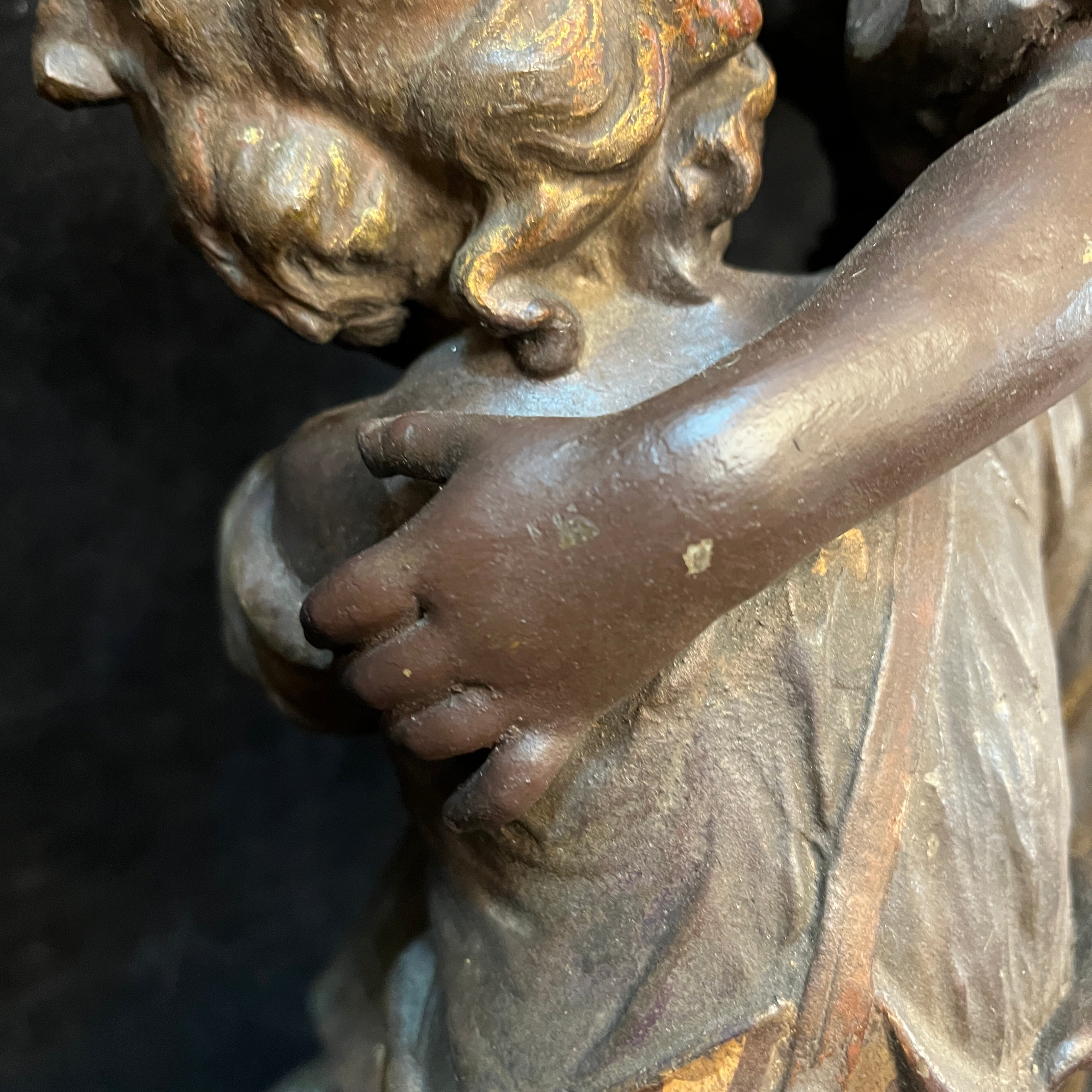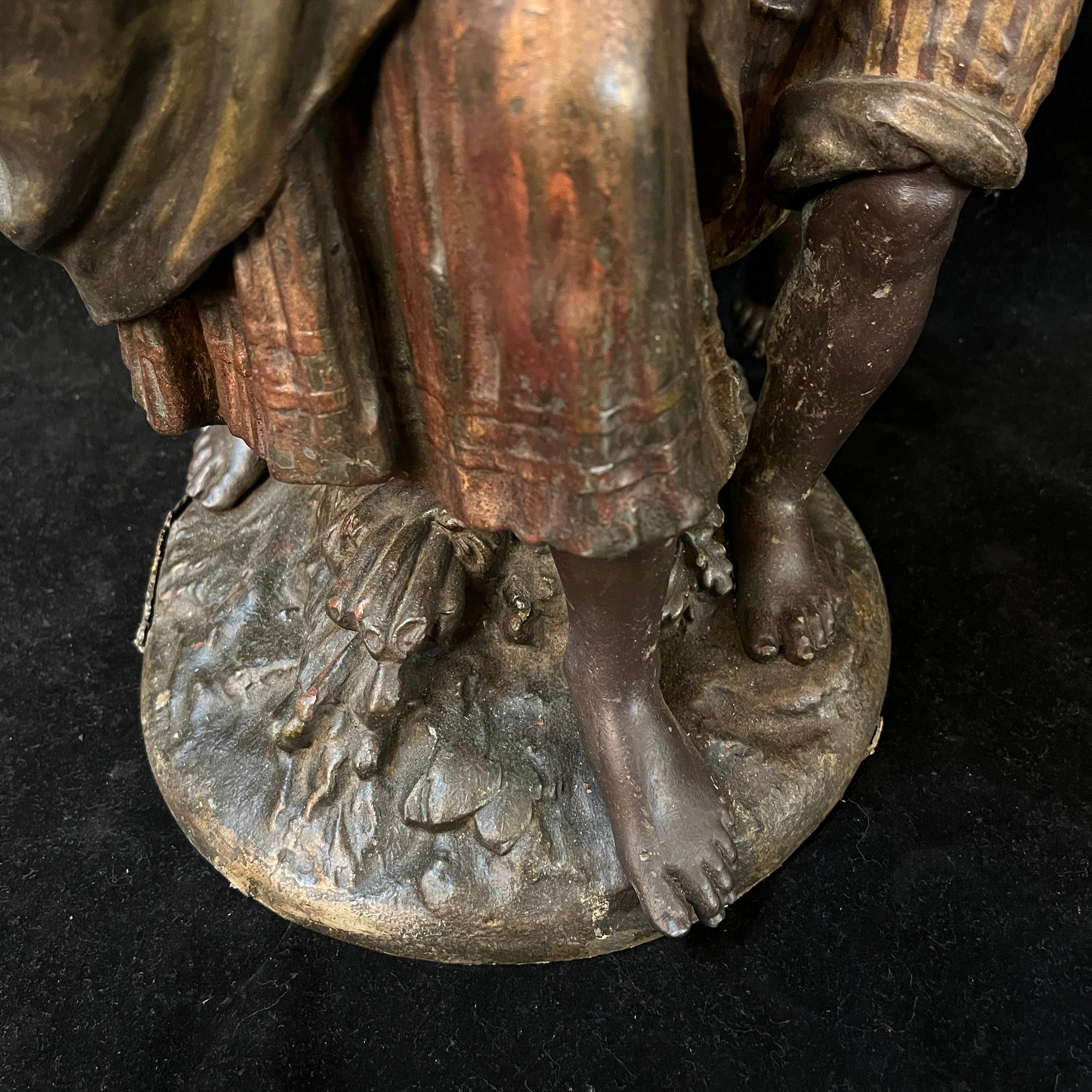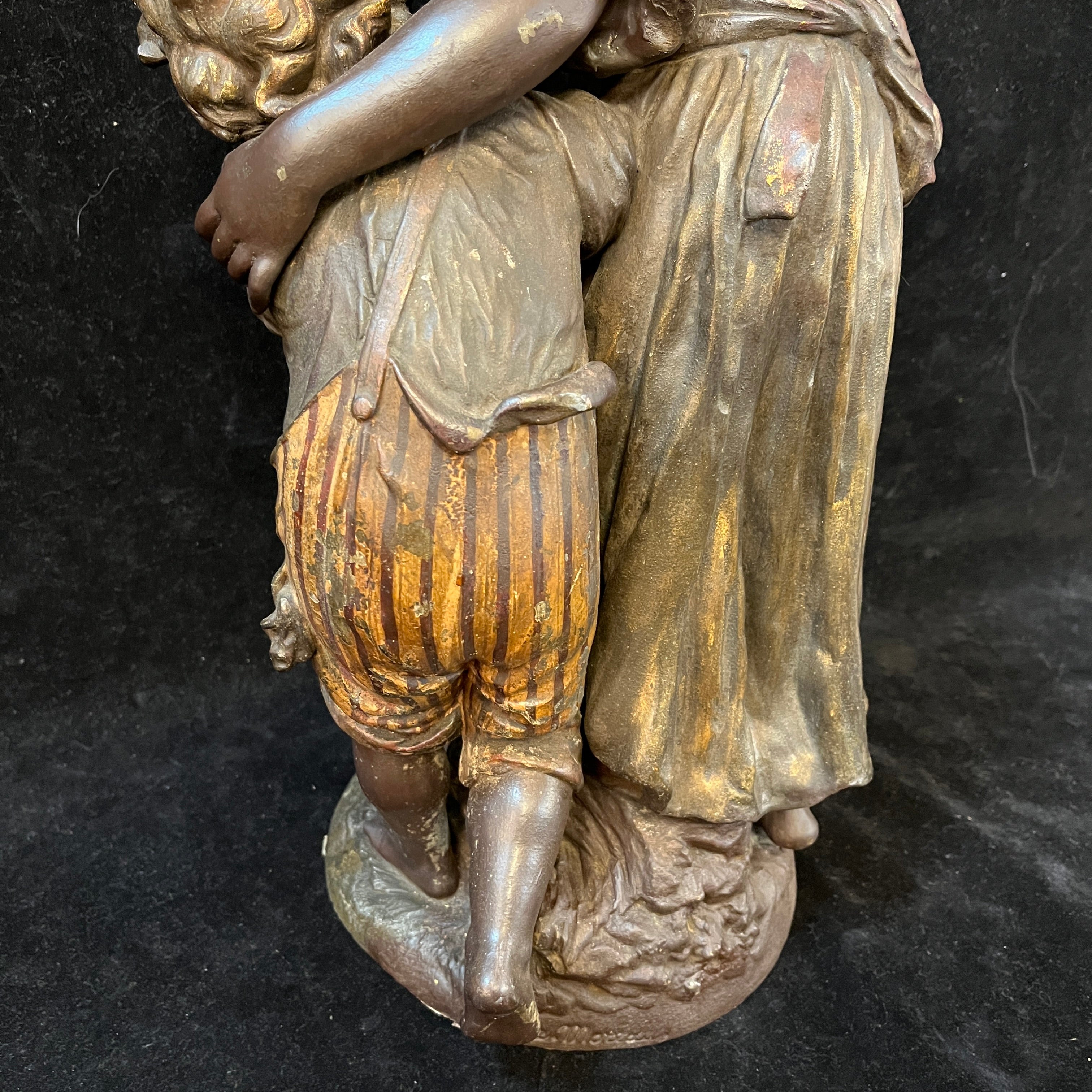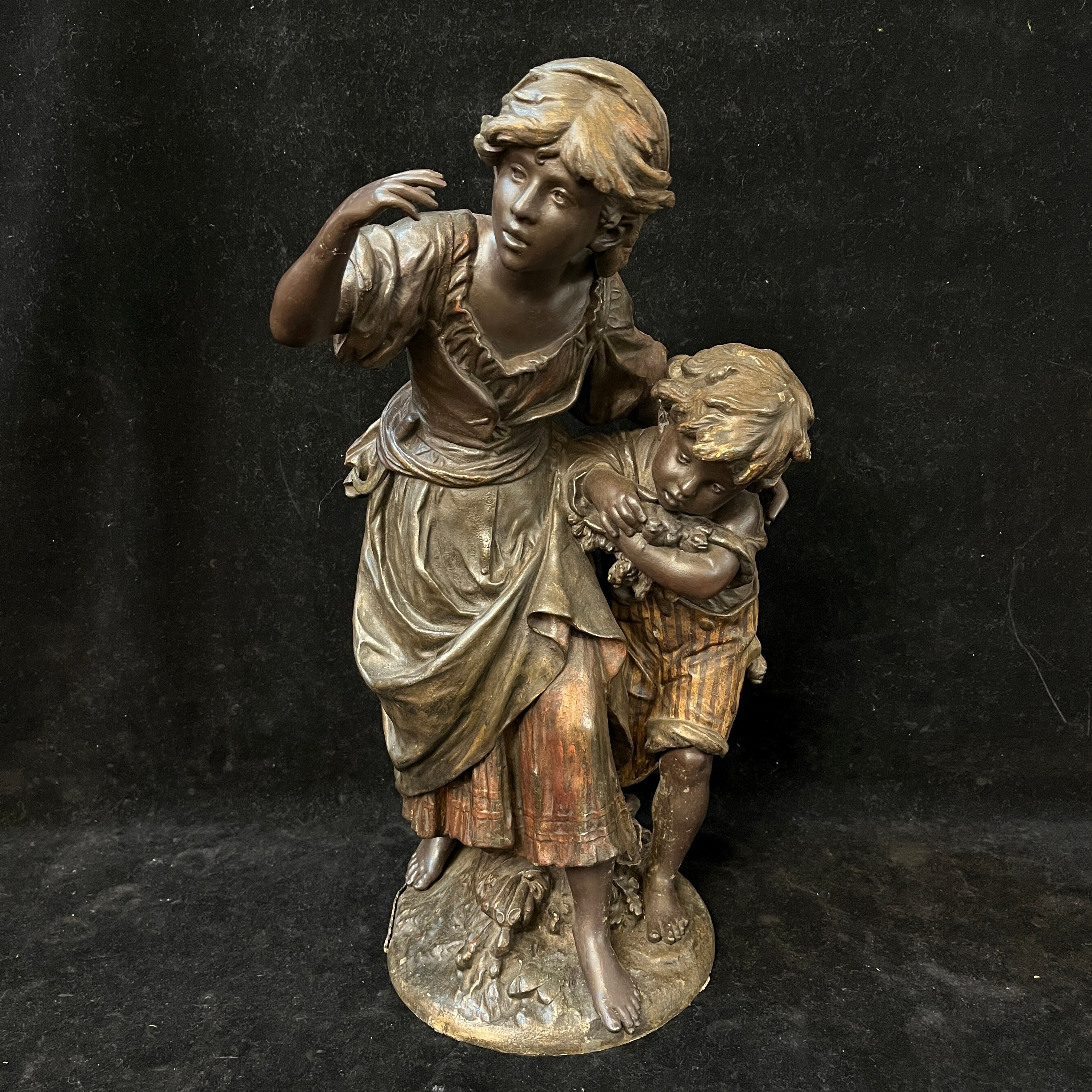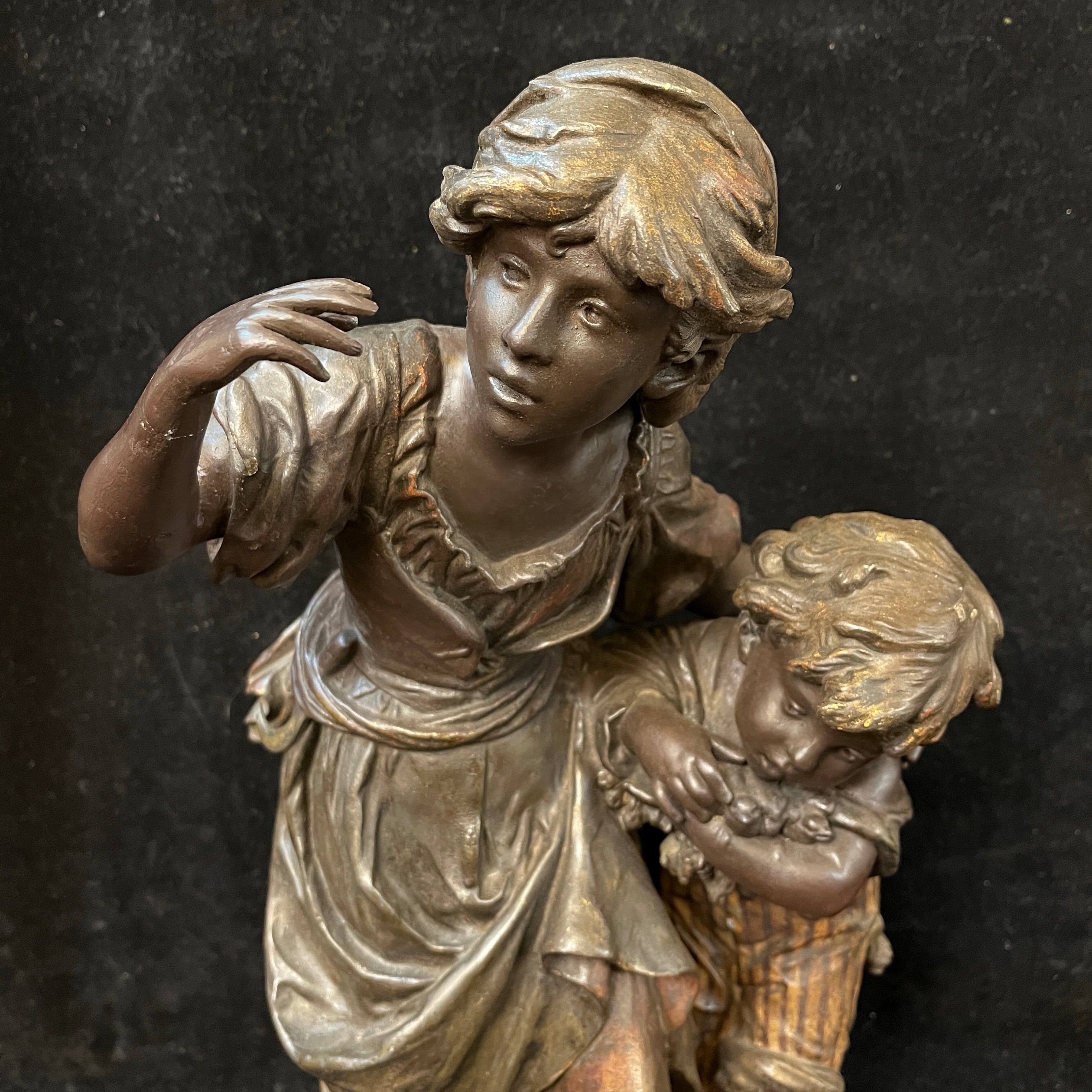 Escultura en bronce firmada por August Moreau (1834-1917) escultor y pintor francés conocido por sus obras de estilo realista. Sus obras fueron especialmente populares durante el período de Napoleón III en el siglo XIX. En esta pieza podemos ver a una madre resguardando a su hijo, que a su vez lleva un pequeño animal entre sus brazos. El artista imprime el gesto de urgencia y preocupación de ambos personajes, además de la textura de sus vestimentas.