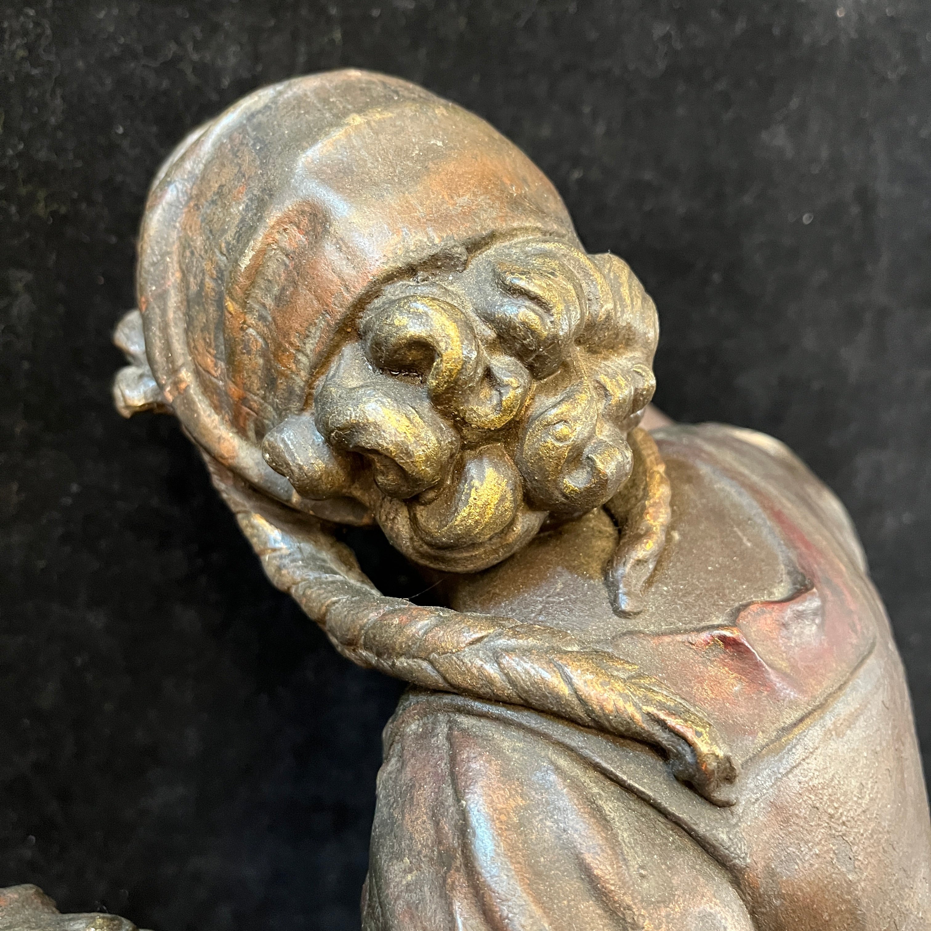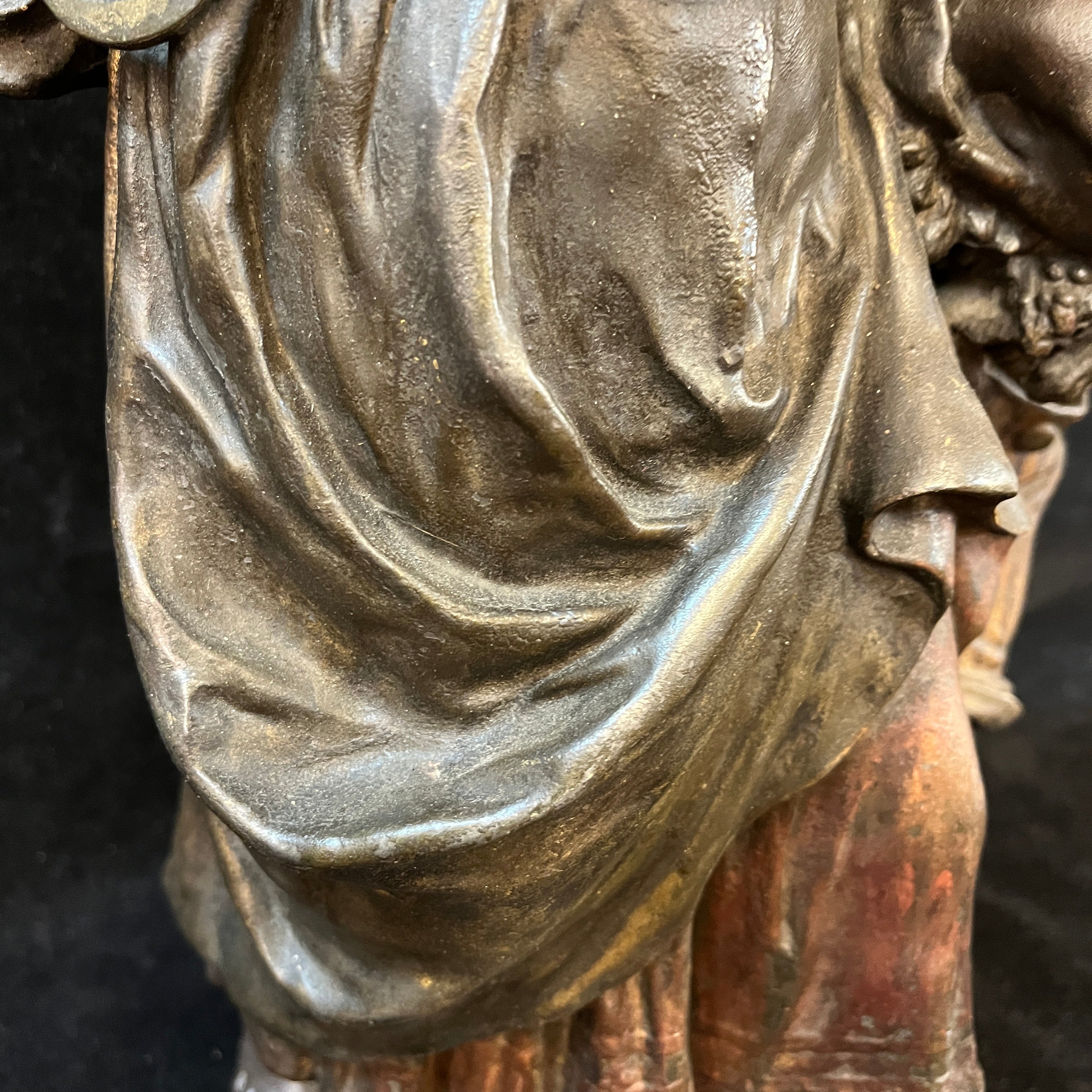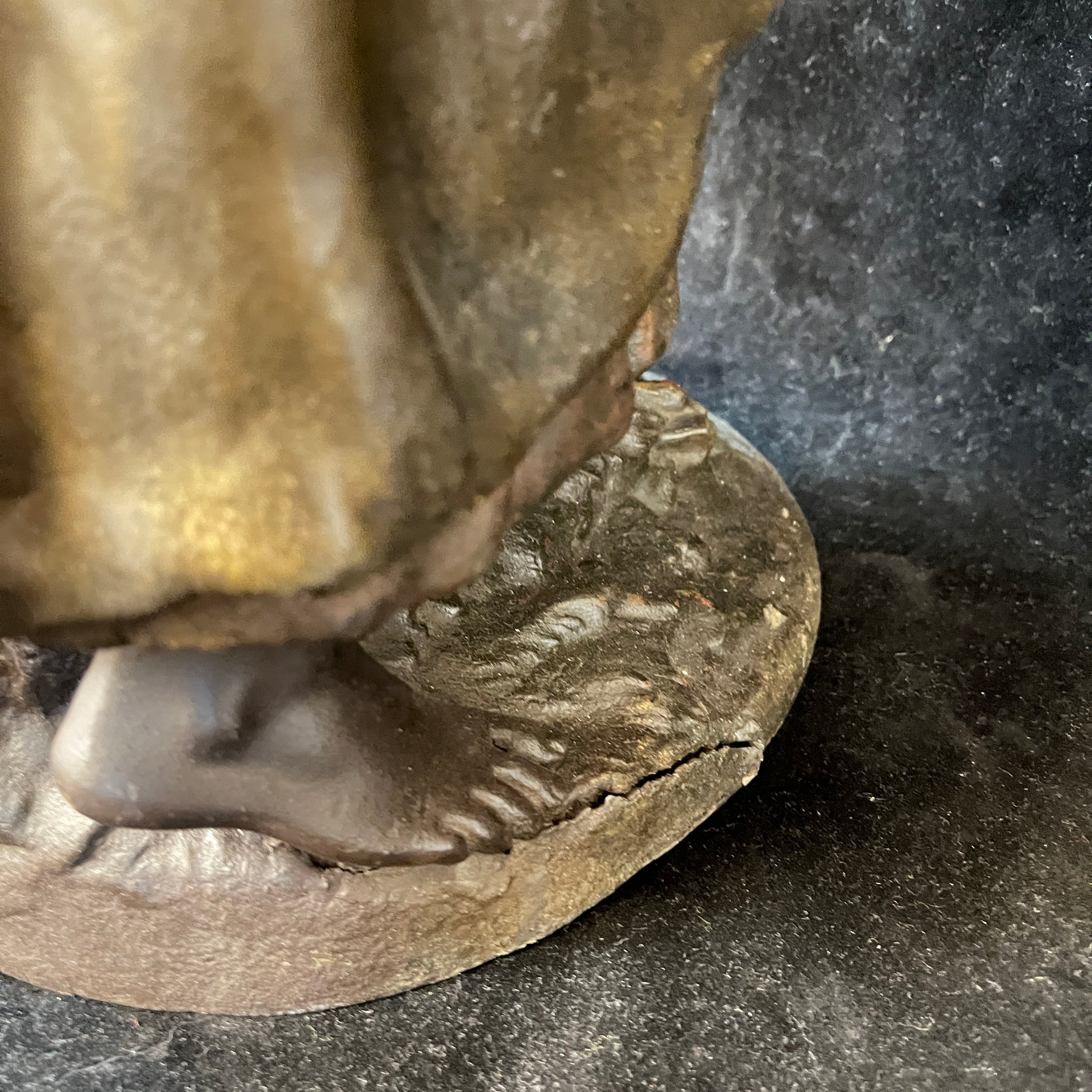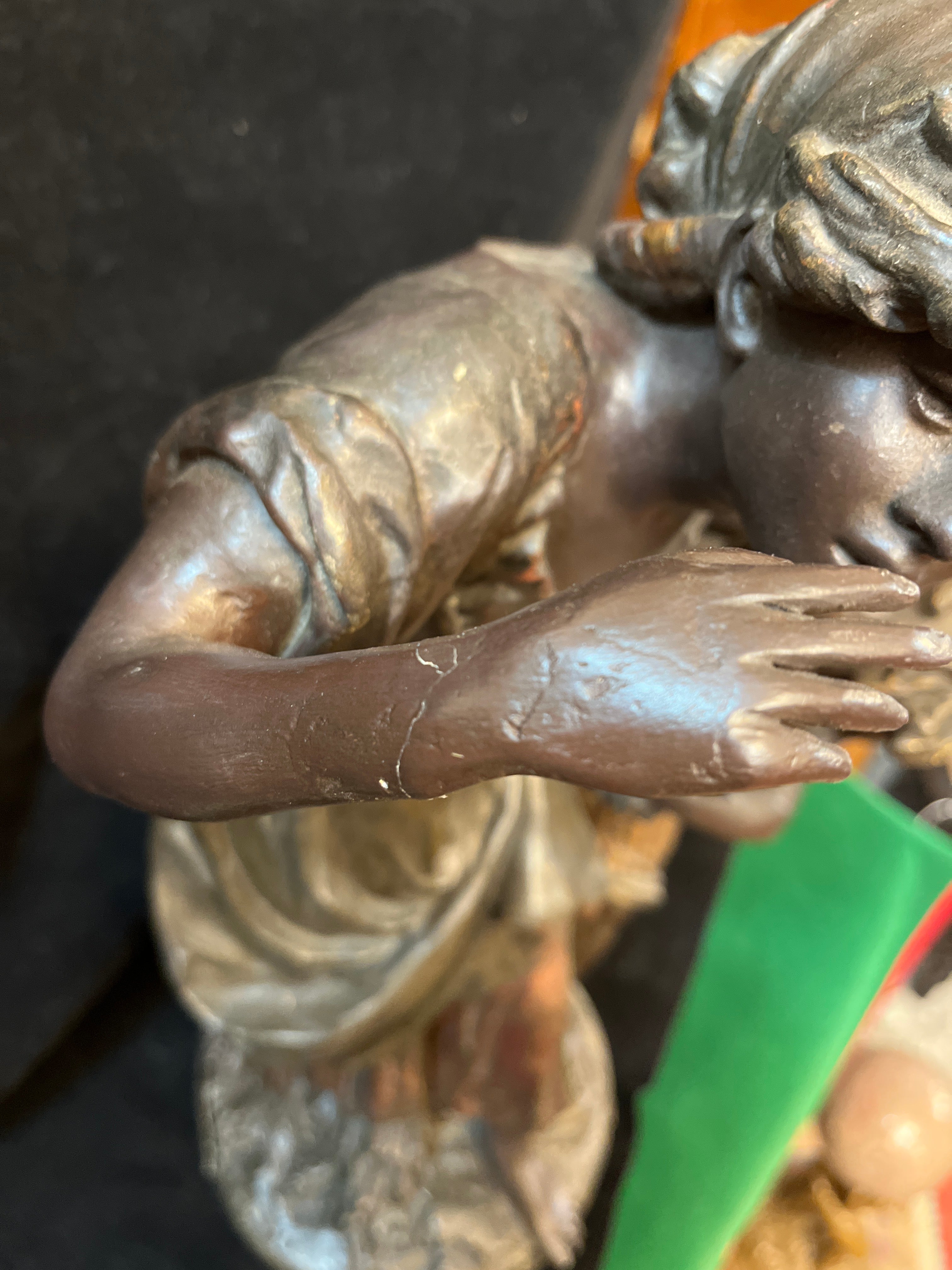 Escultura en bronce firmada por August Moreau (1834-1917) escultor y pintor francés conocido por sus obras de estilo realista. Sus obras fueron especialmente populares durante el período de Napoleón III en el siglo XIX. En esta pieza podemos ver a una madre resguardando a su hijo, que a su vez lleva un pequeño animal entre sus brazos. El artista imprime el gesto de urgencia y preocupación de ambos personajes, además de la textura de sus vestimentas.
