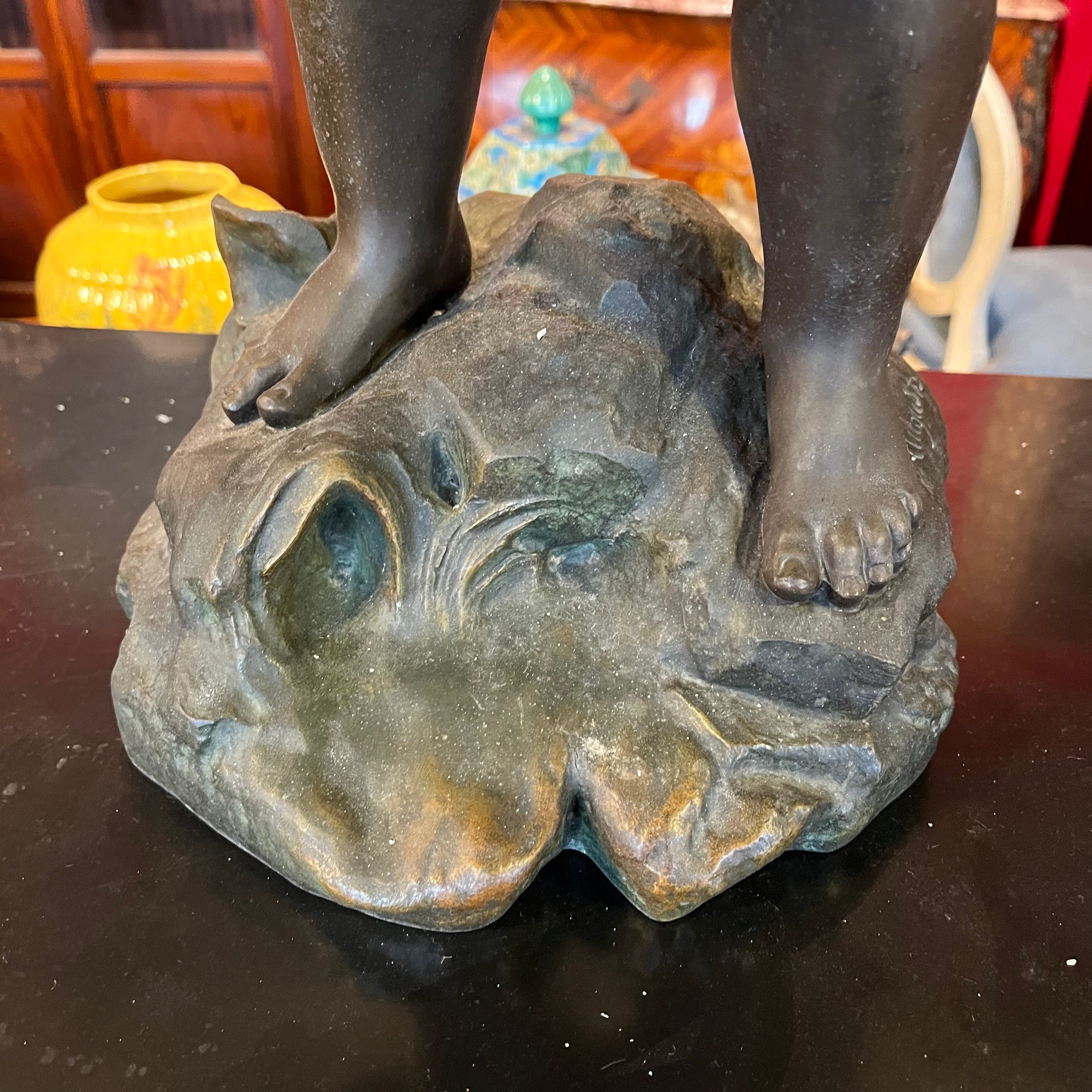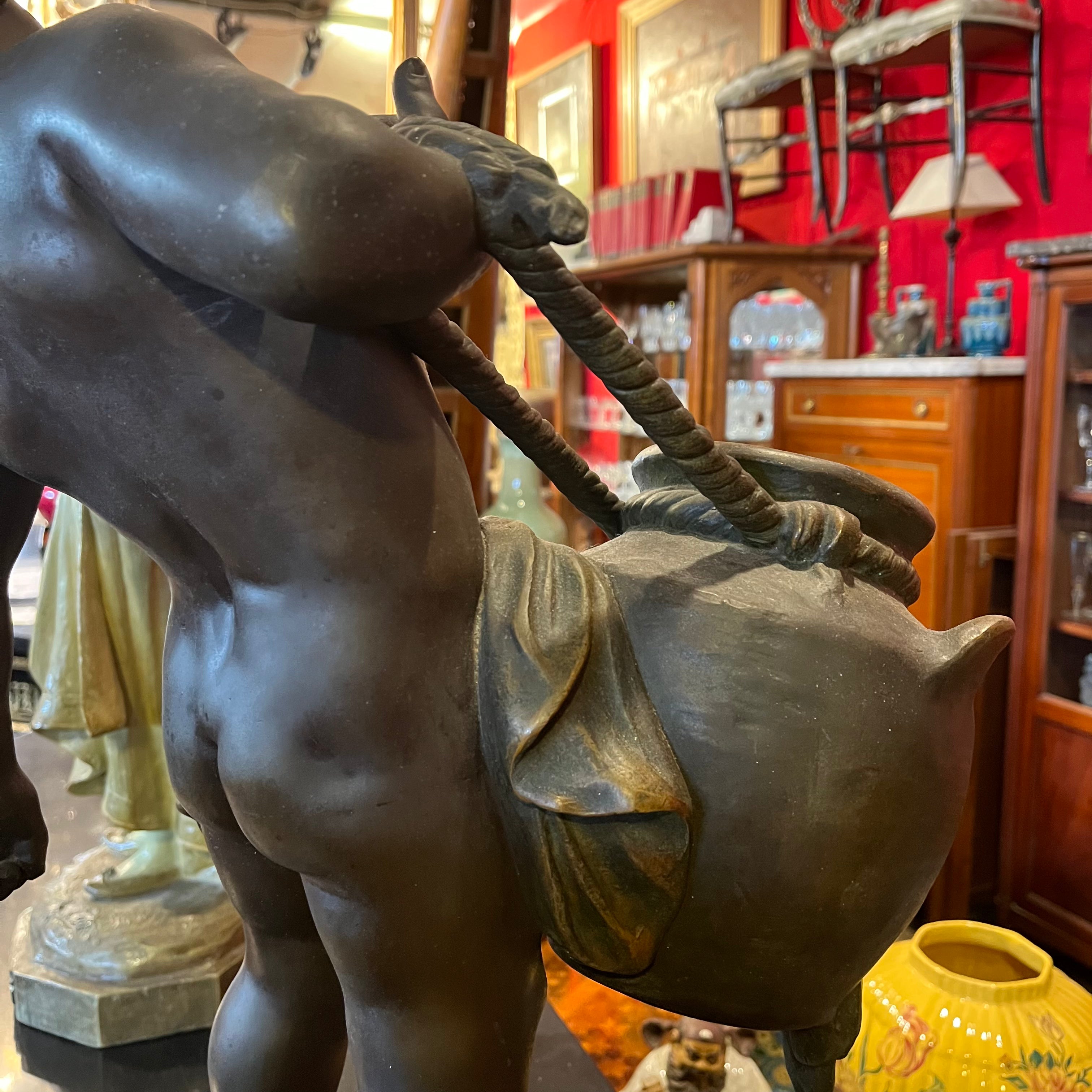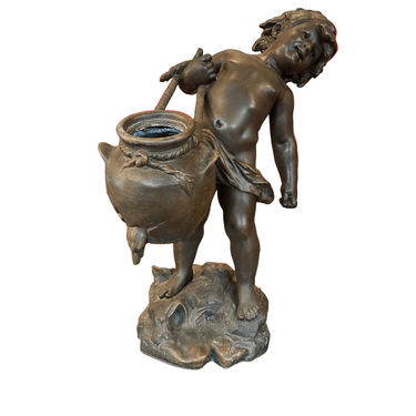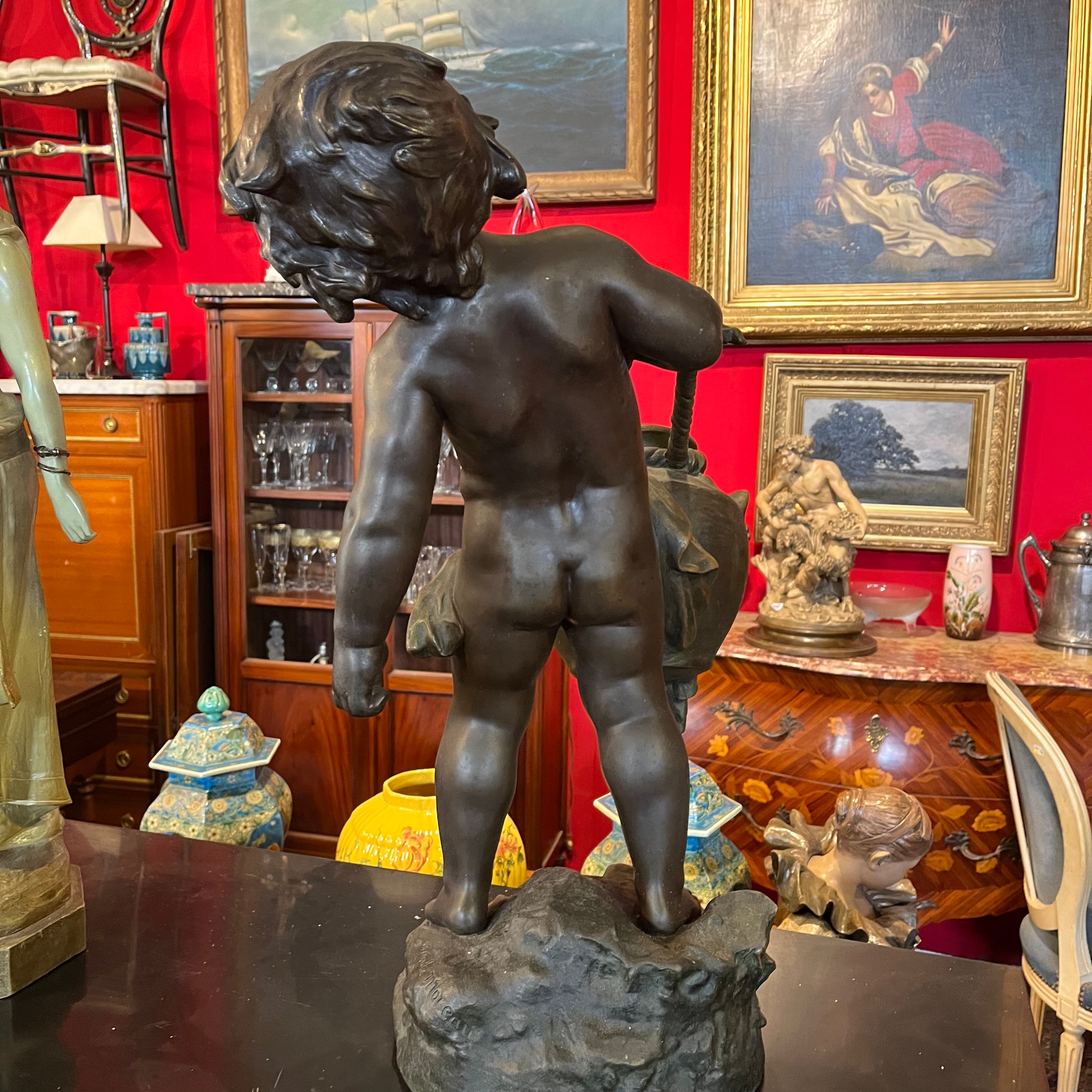 Sculpture en étain représentant un enfant portant une cruche cassée, la cruche déversant son contenu. Signée par le sculpteur, Auguste Moreau.