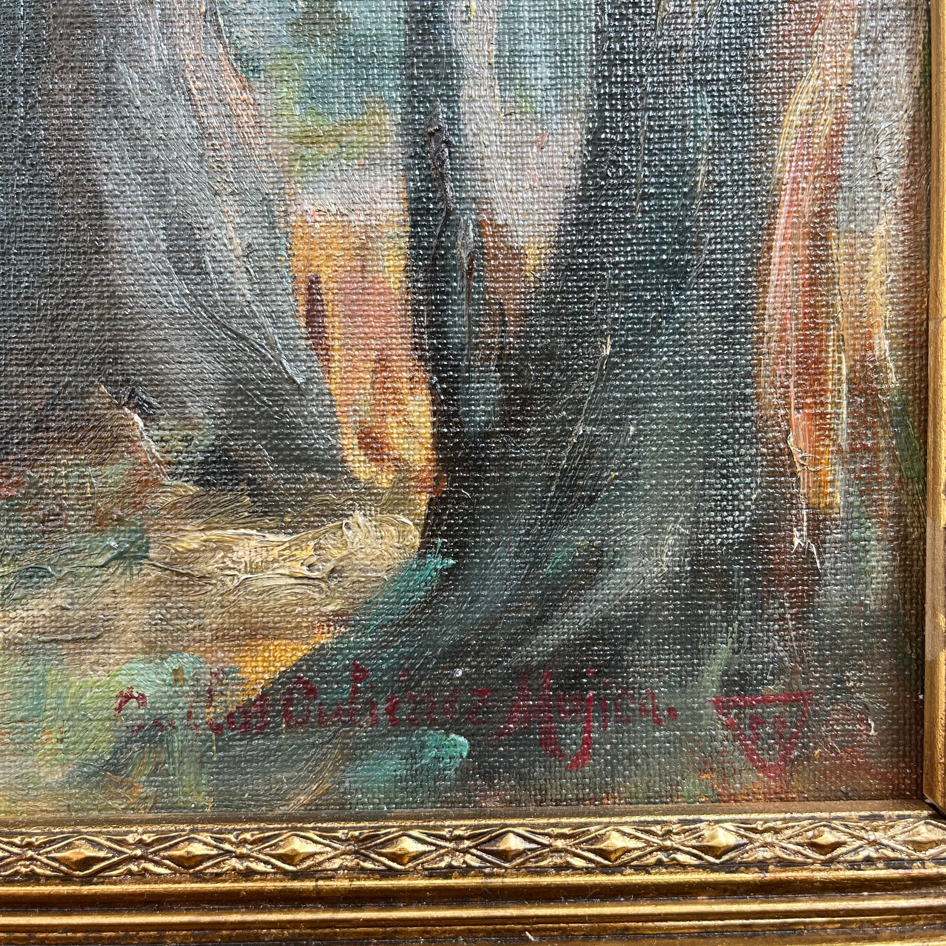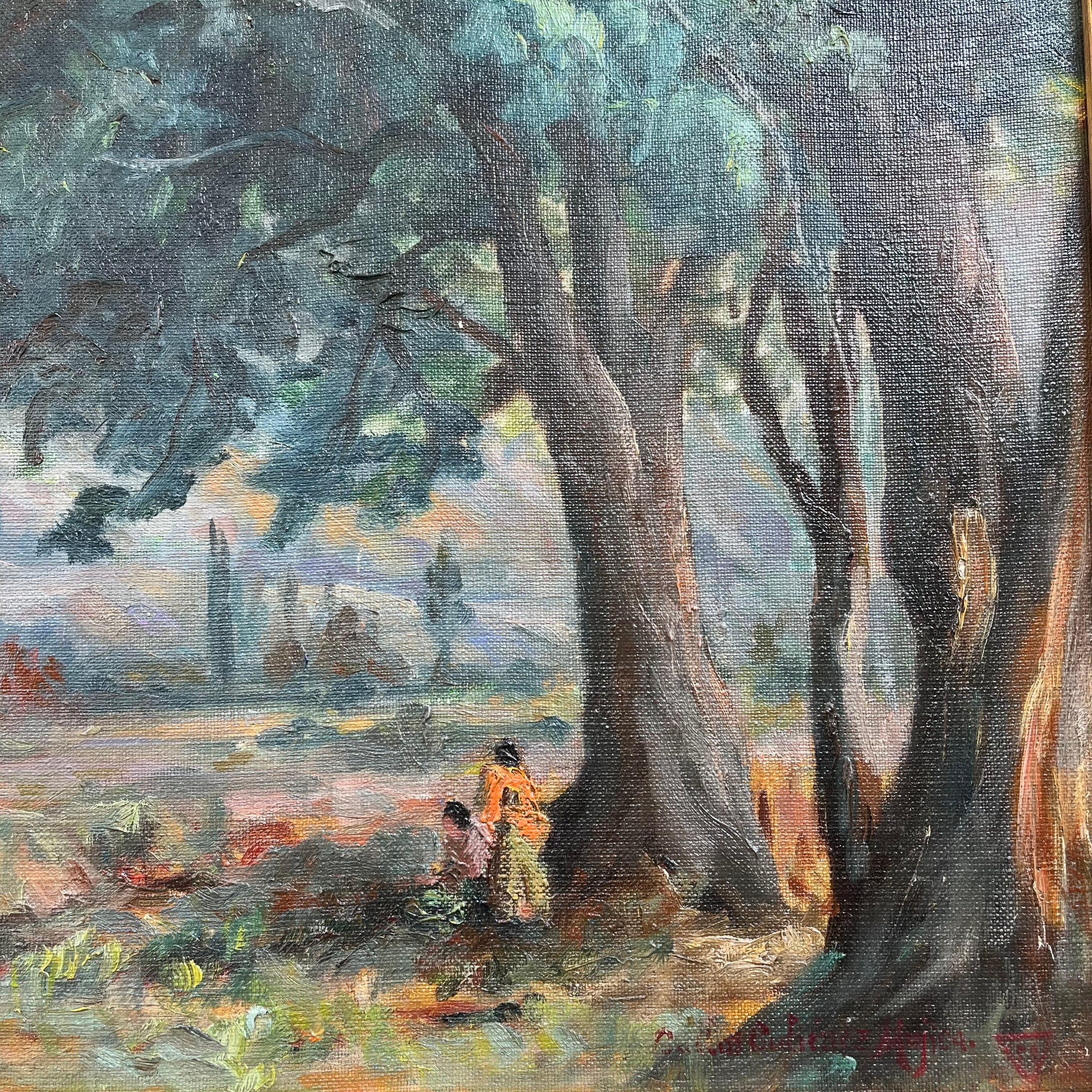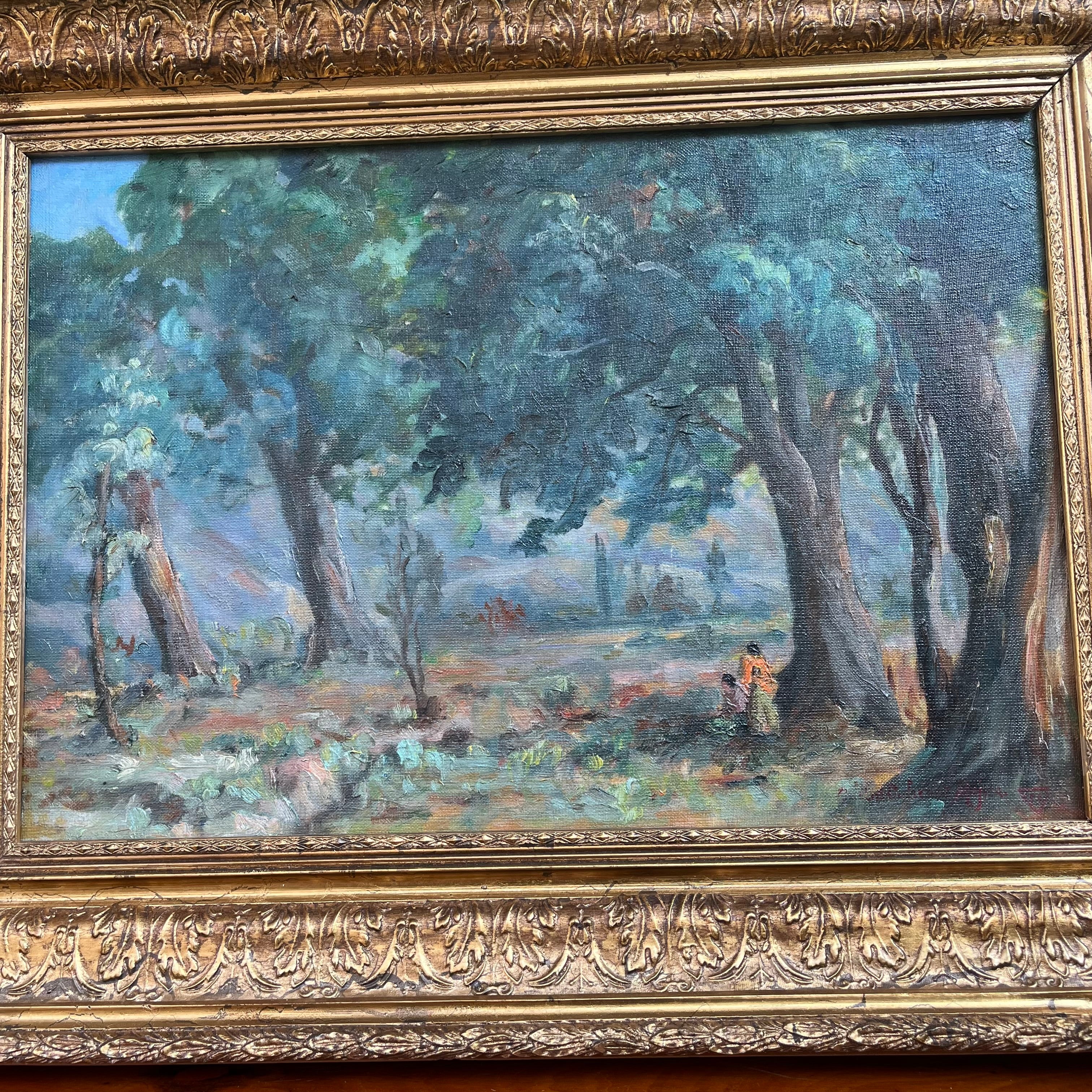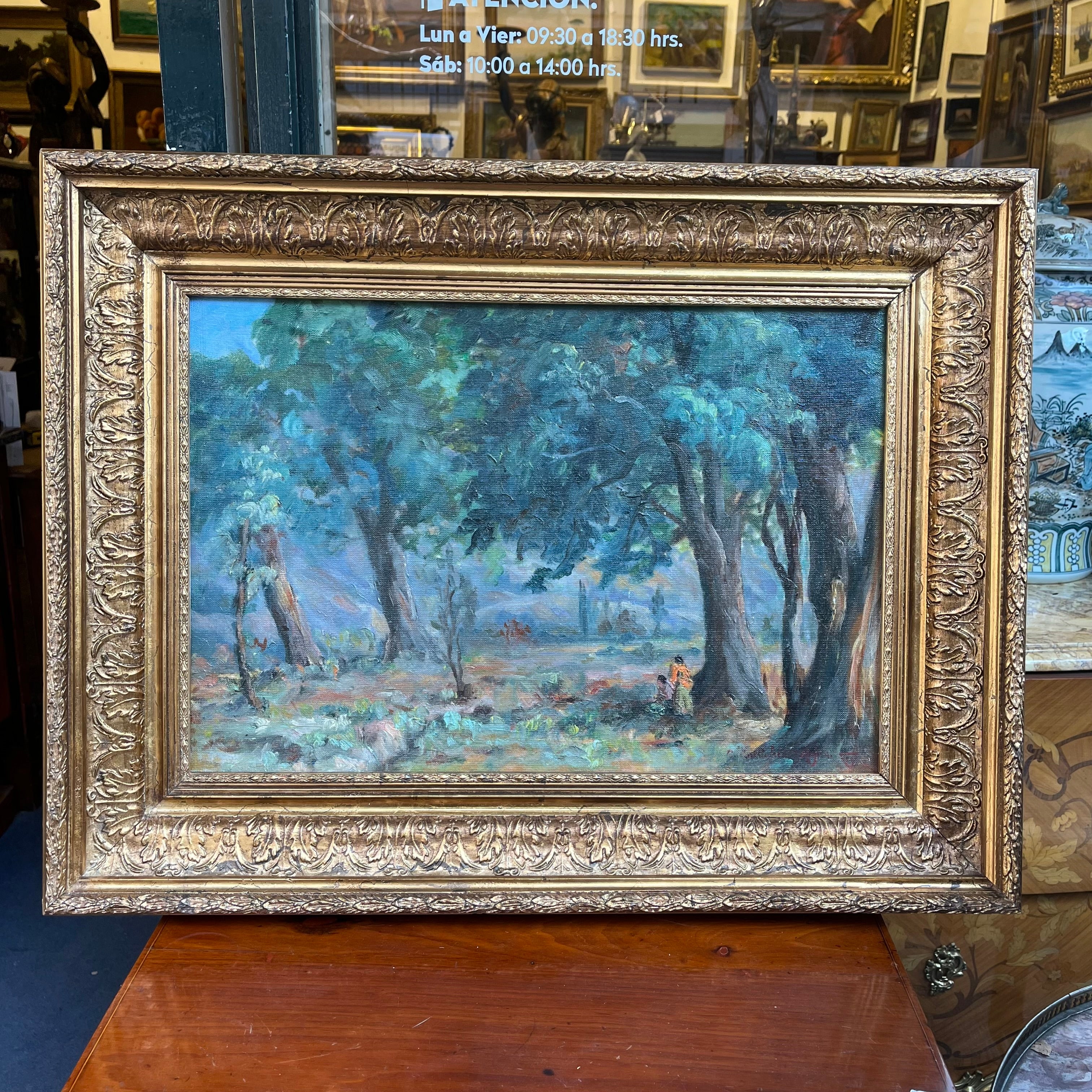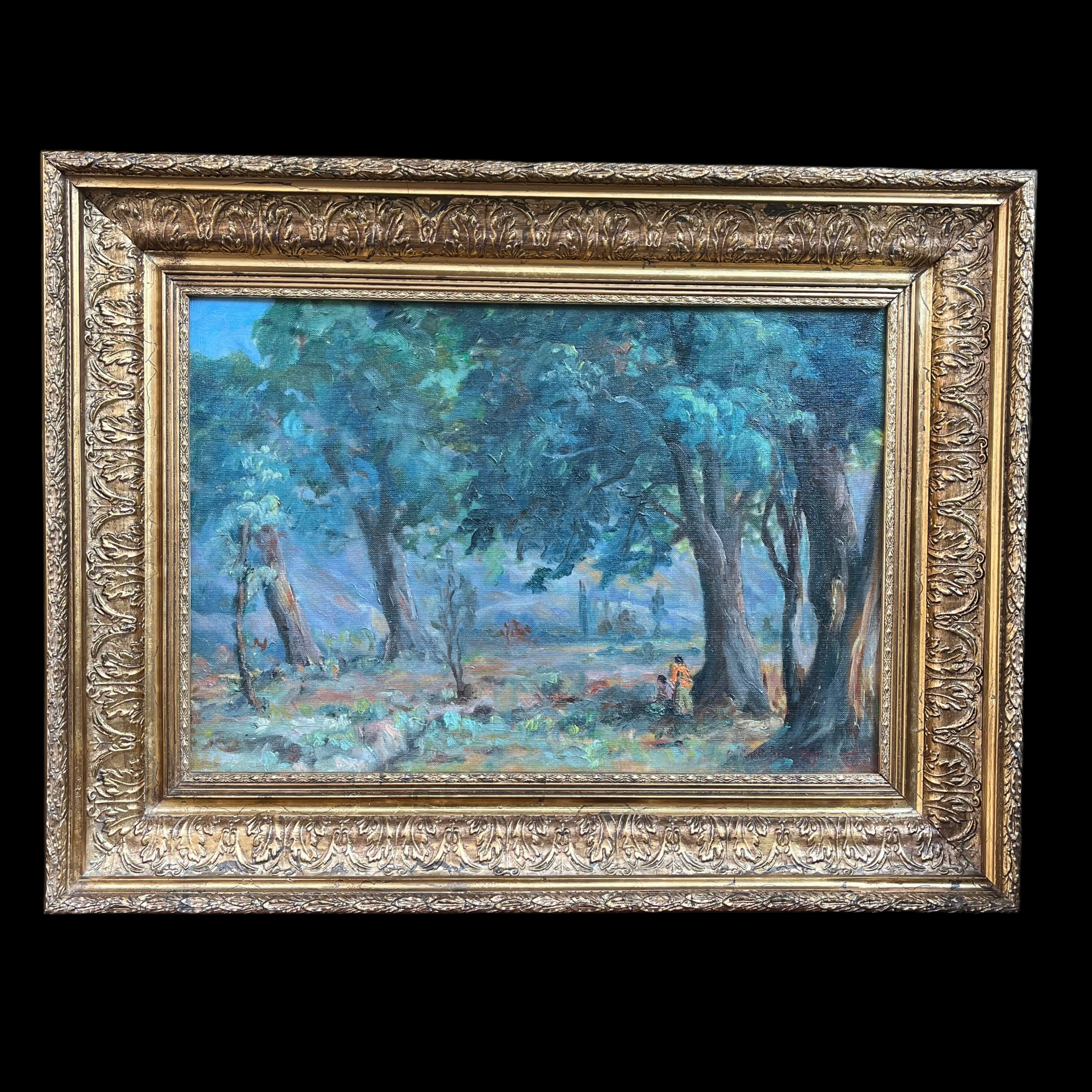 Magnifique paysage naturel représentant un couple. Le cadre en bois est sculpté en relief et peint en or. Il daterait de 1920.