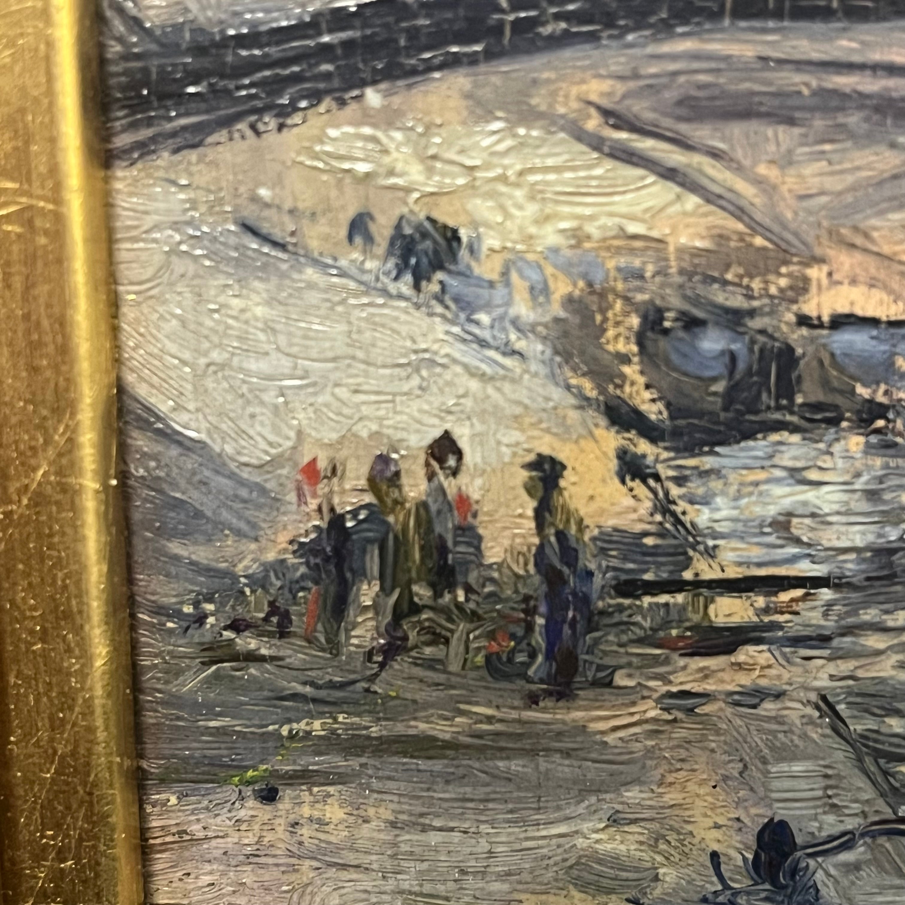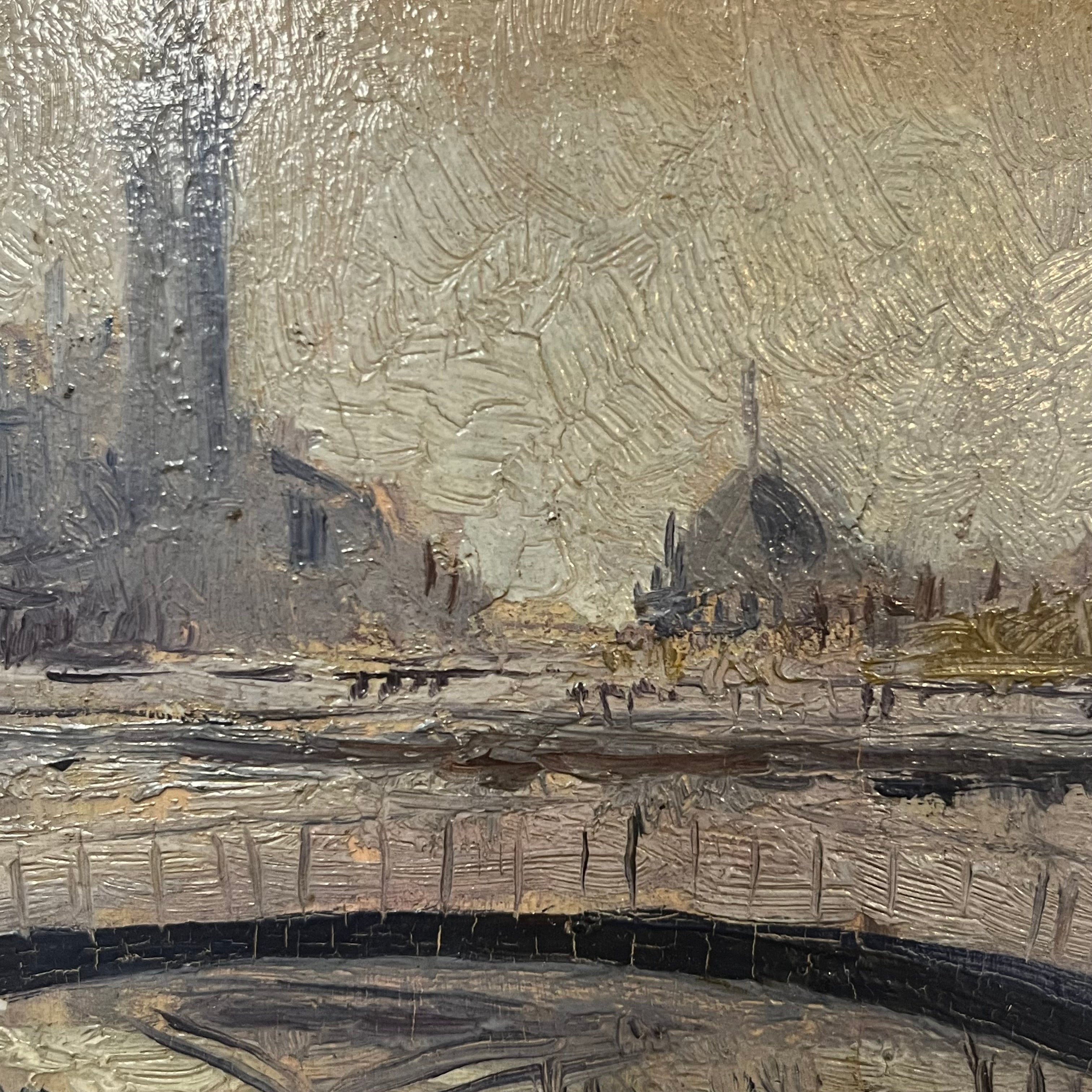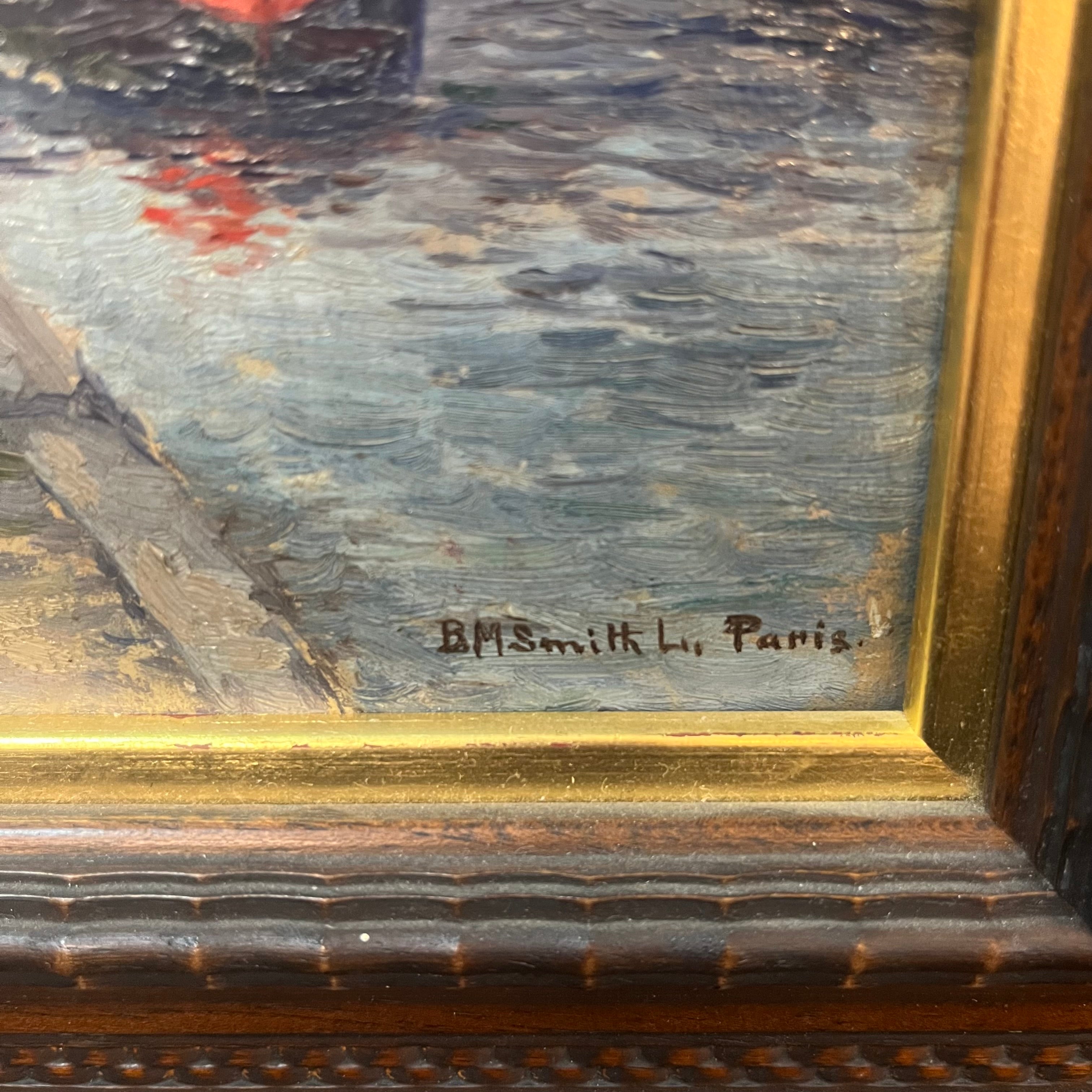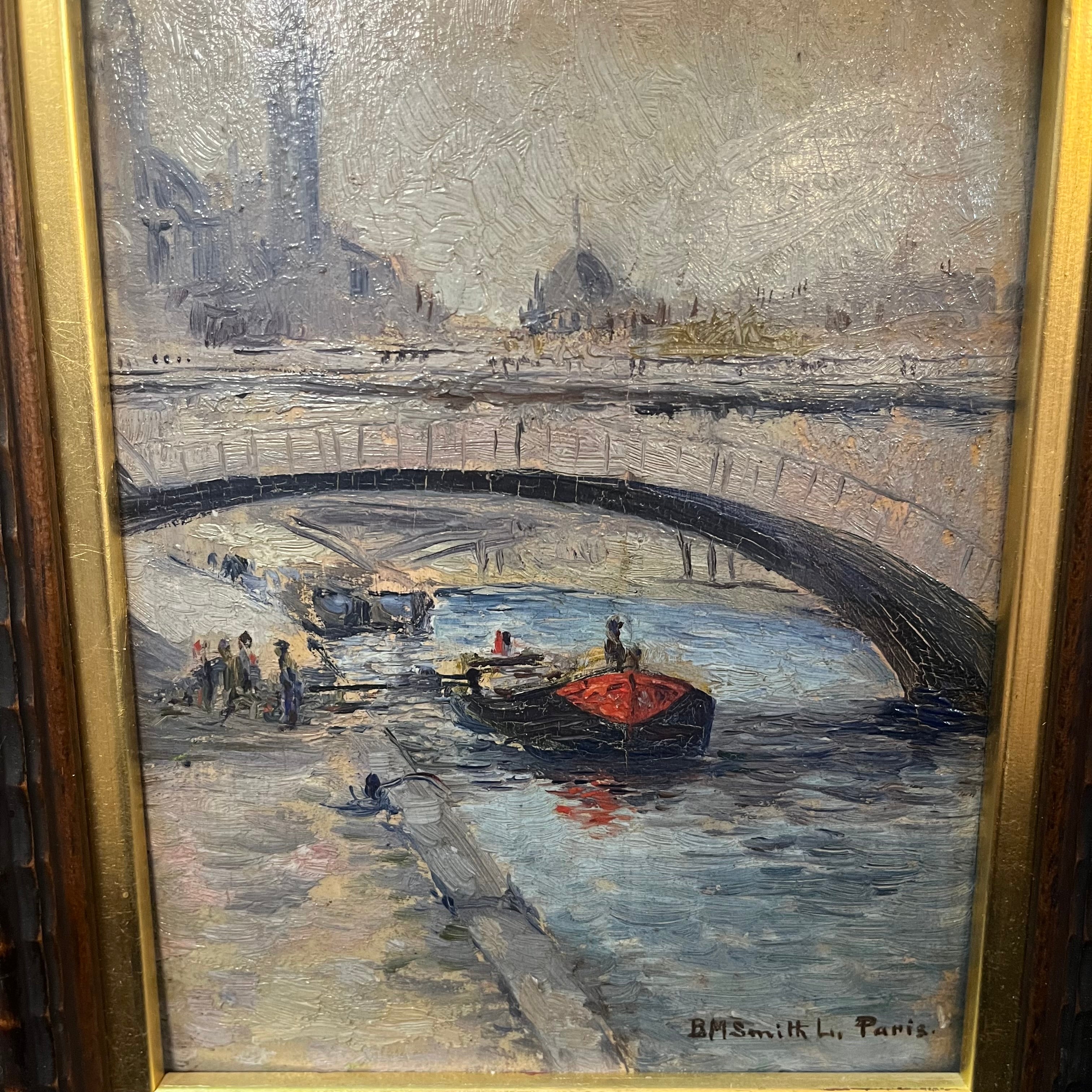 Óleo sobre madera de origen francés, firmado por B. M Smith, representando un bello paisaje parisino del río Sena. Se ven algunos personajes caminando y botes cruzando por debajo de uno de los tantos puentes de la ciudad de las luces. La obra tiene un marco de madera tallada con un borde interior en dorado, que ilumina la obra.