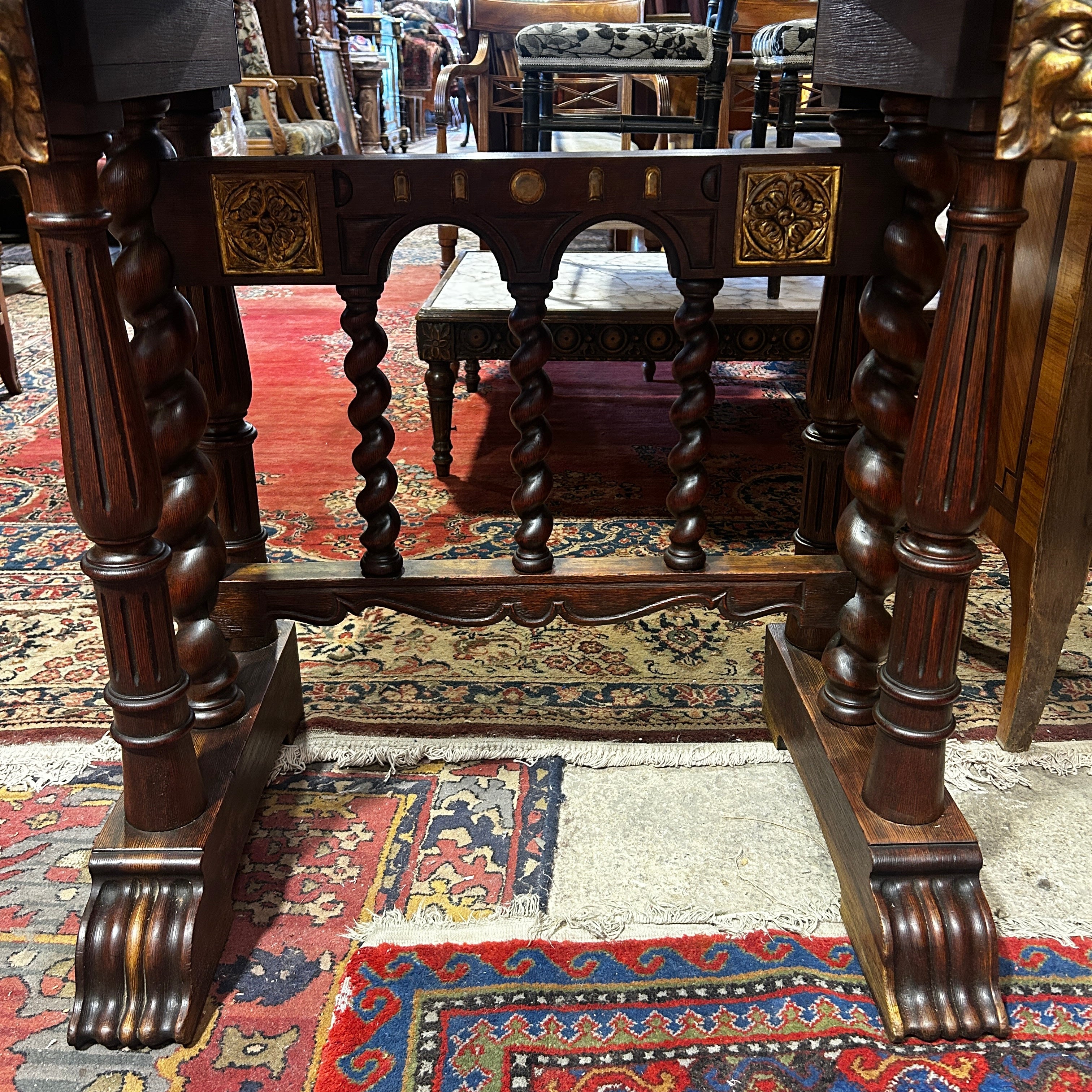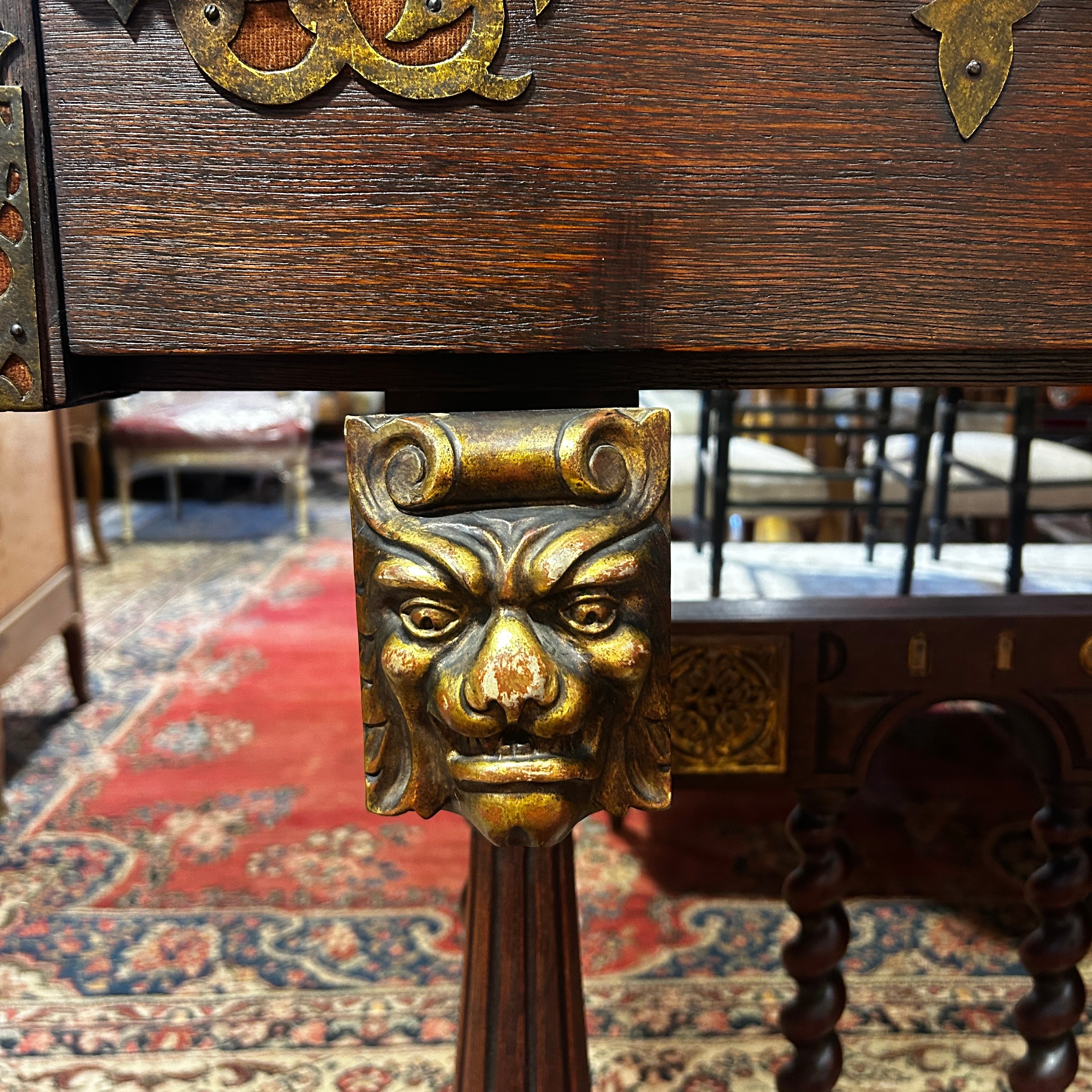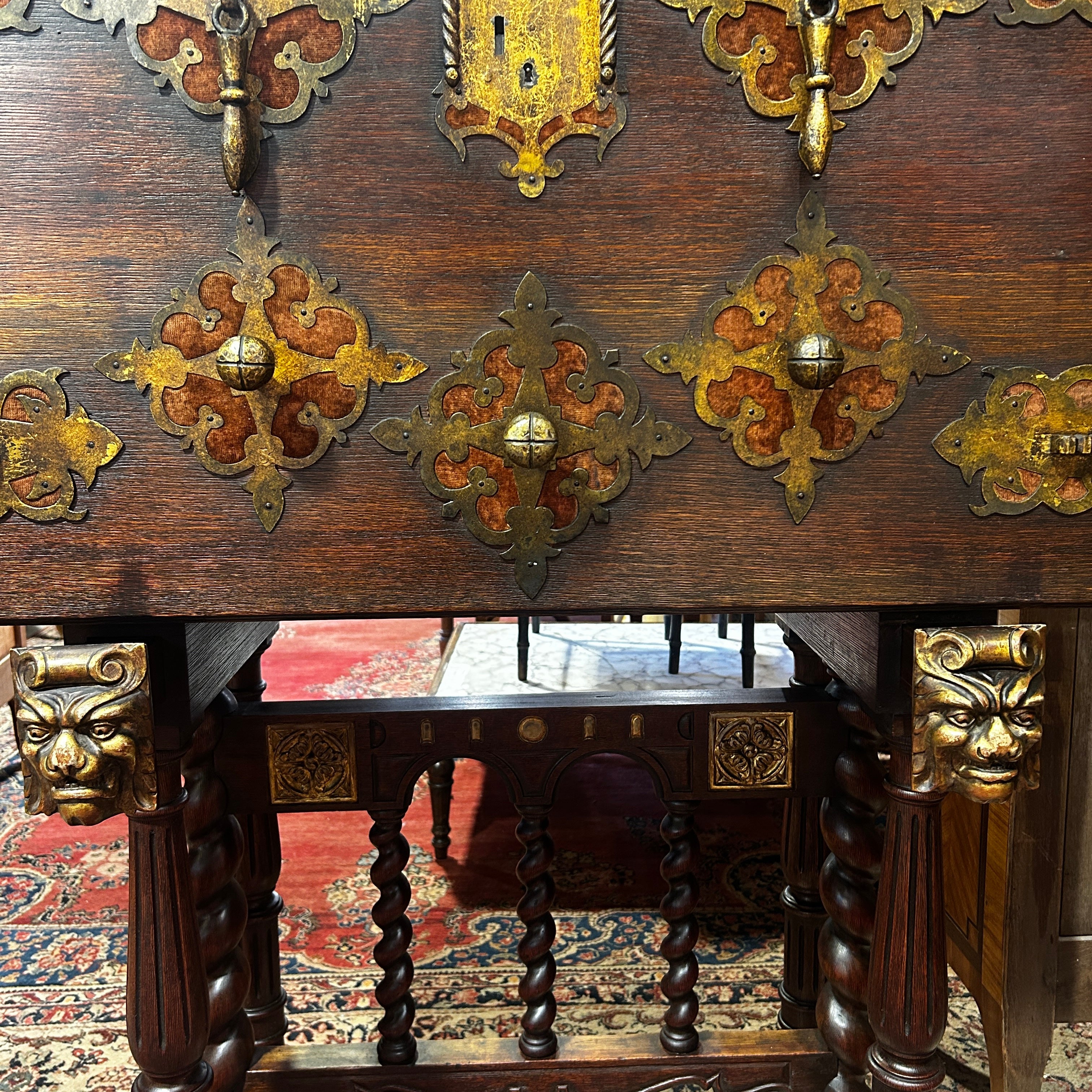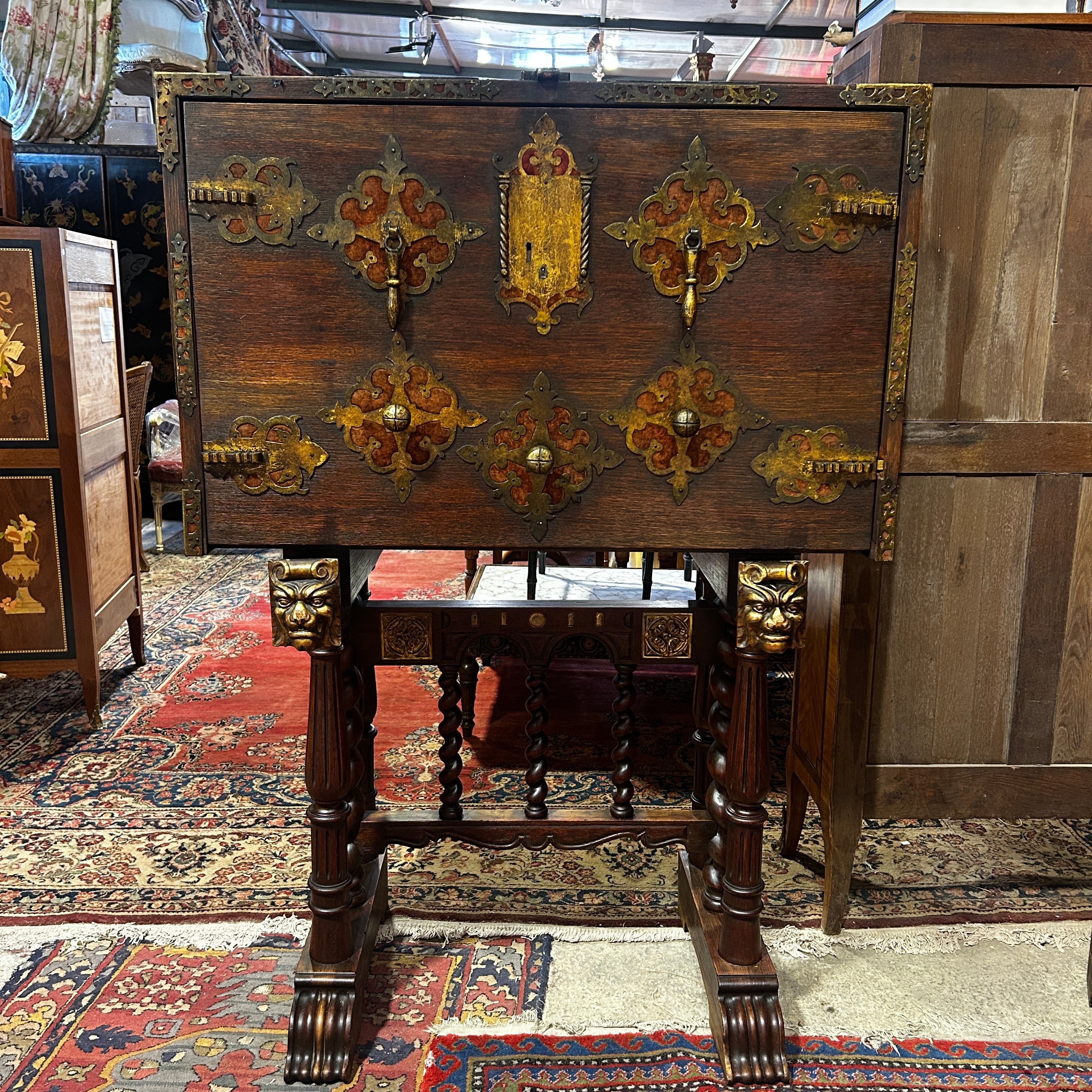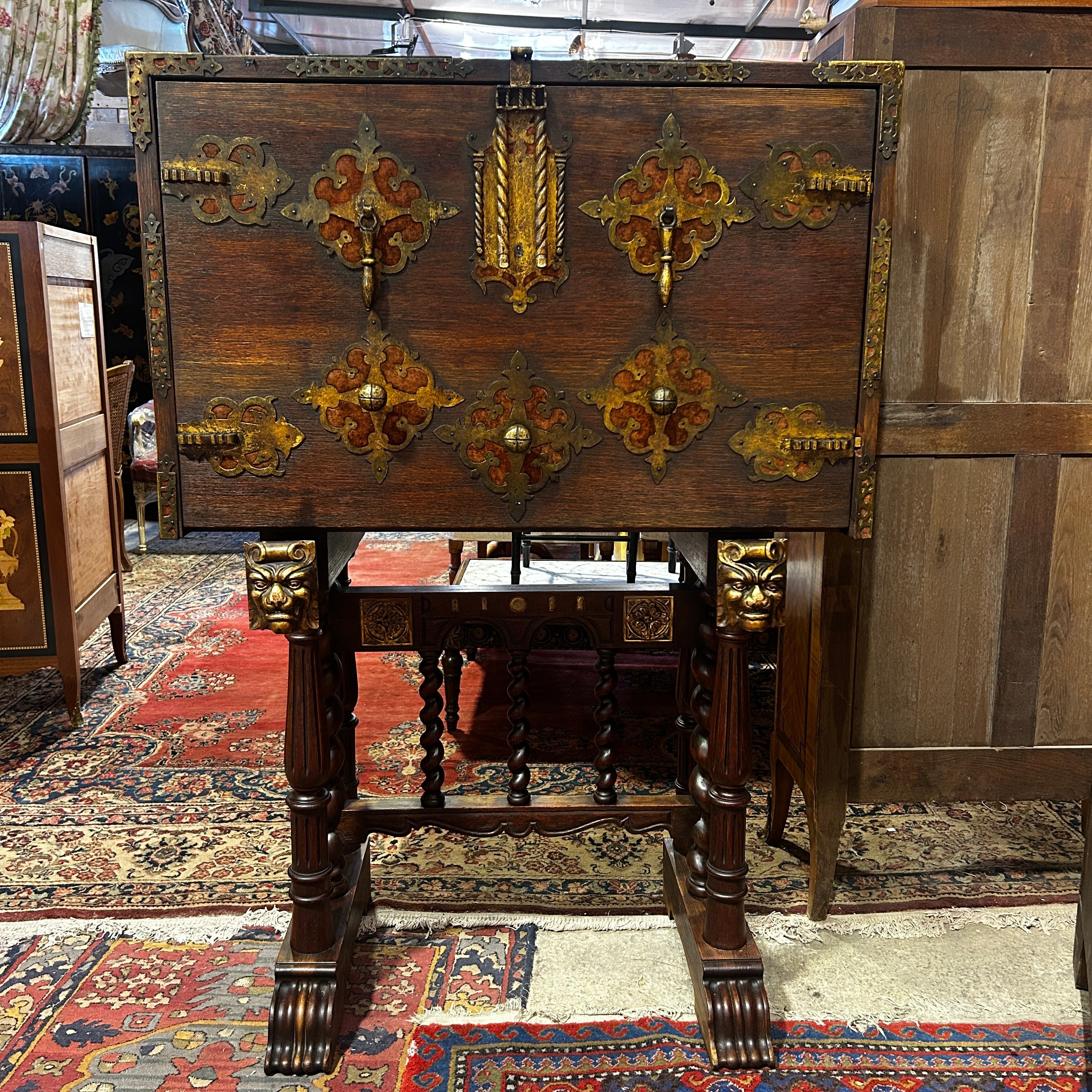 Sus patas simulan las garras de un león y tiene dos soportes extensible con esfinjes de león para dar apoyo a la puerta abatible.