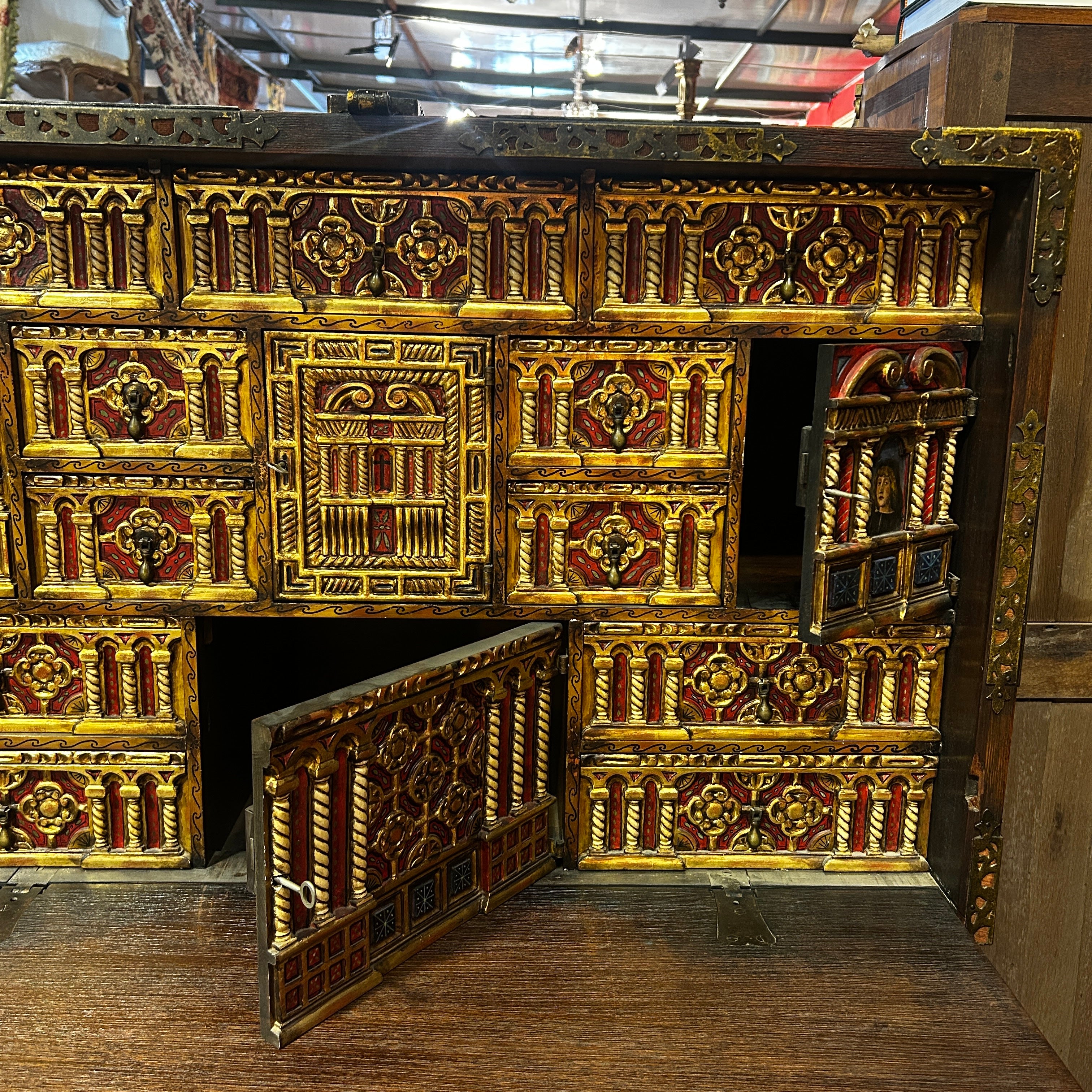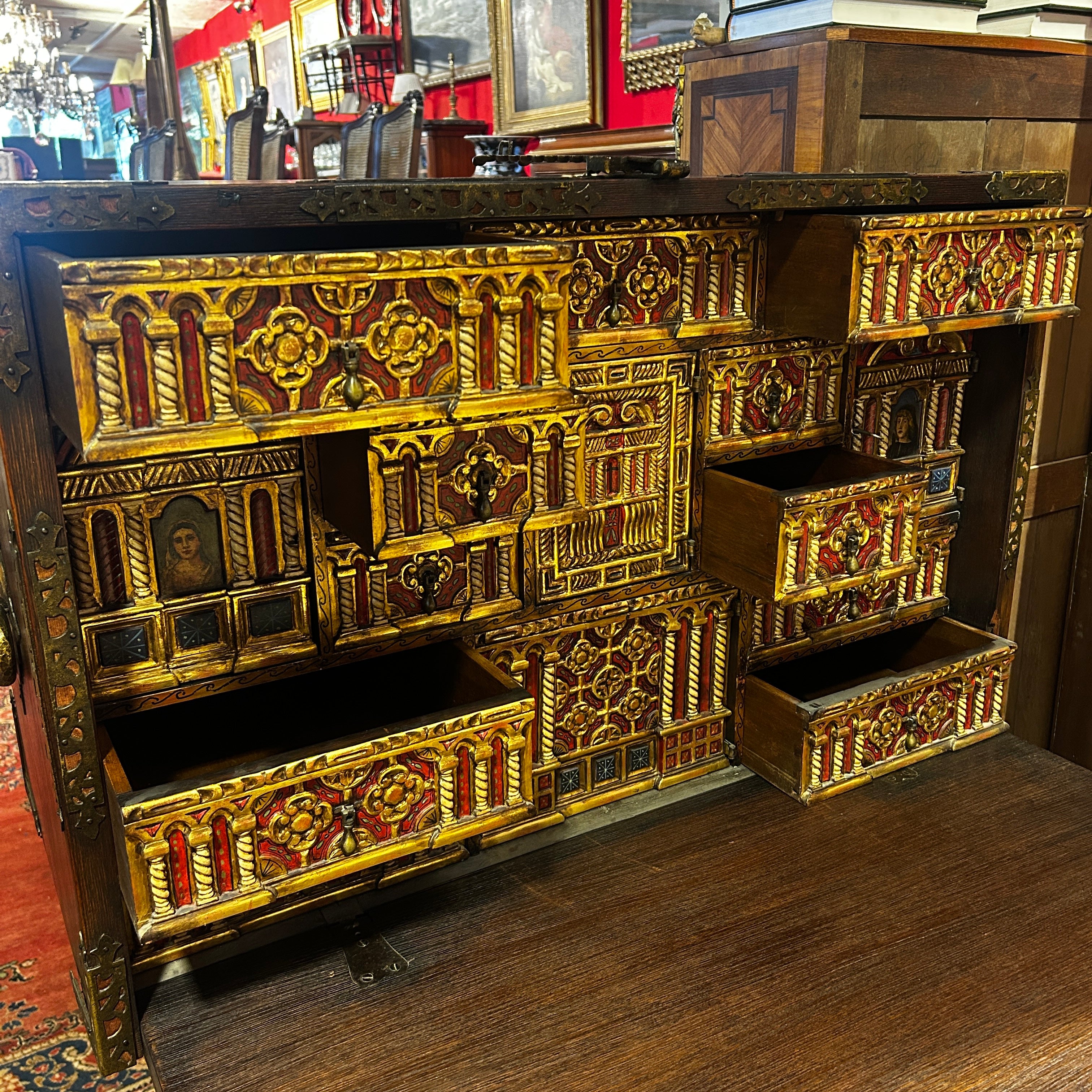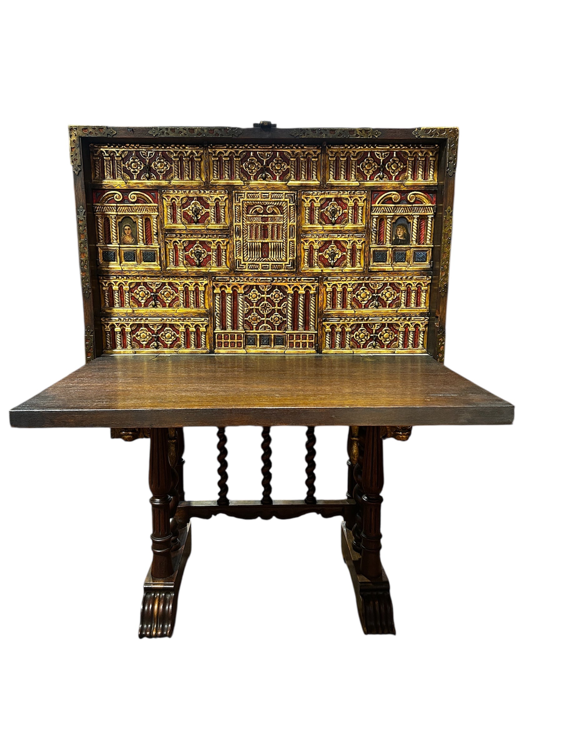 Bargueño español nogal s.XIX detalles policromados aplicaciones bronce y hierro
