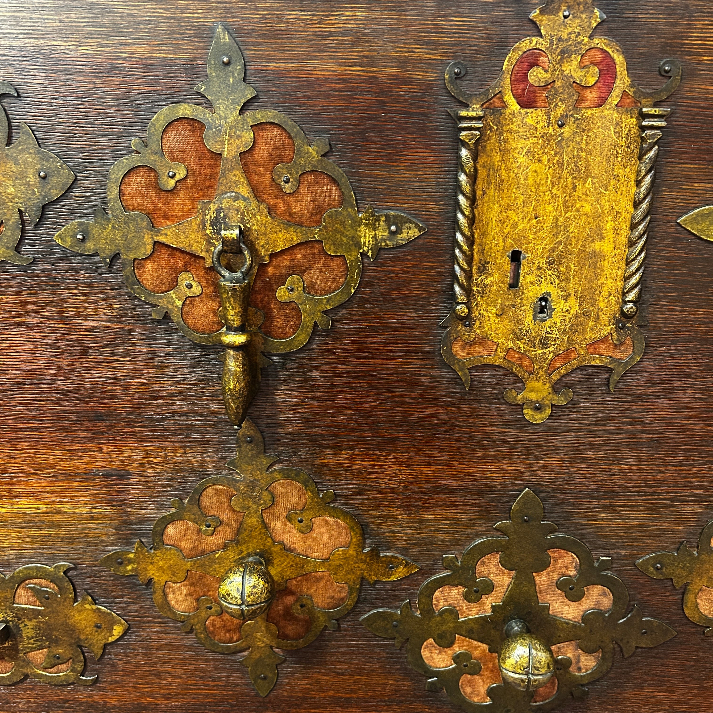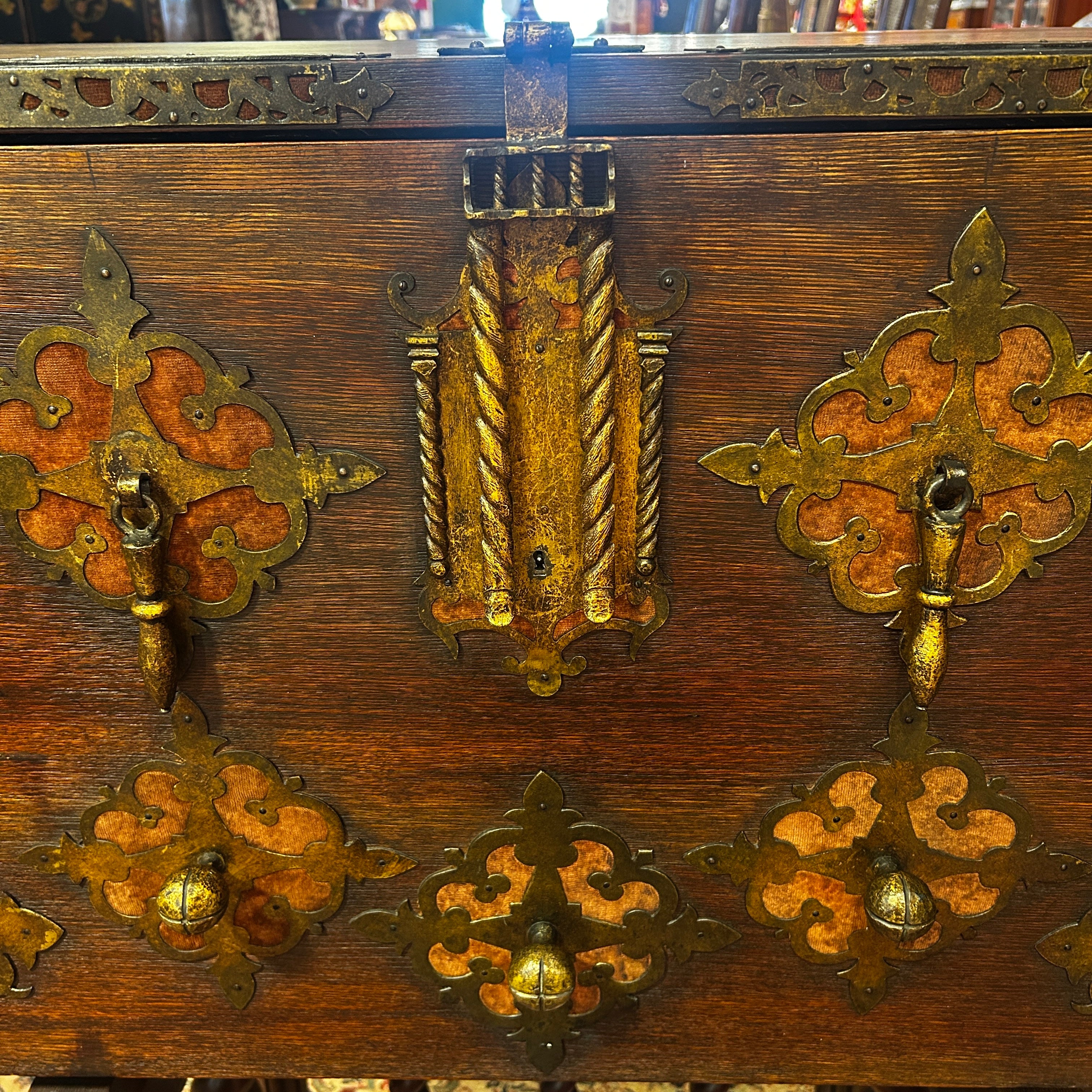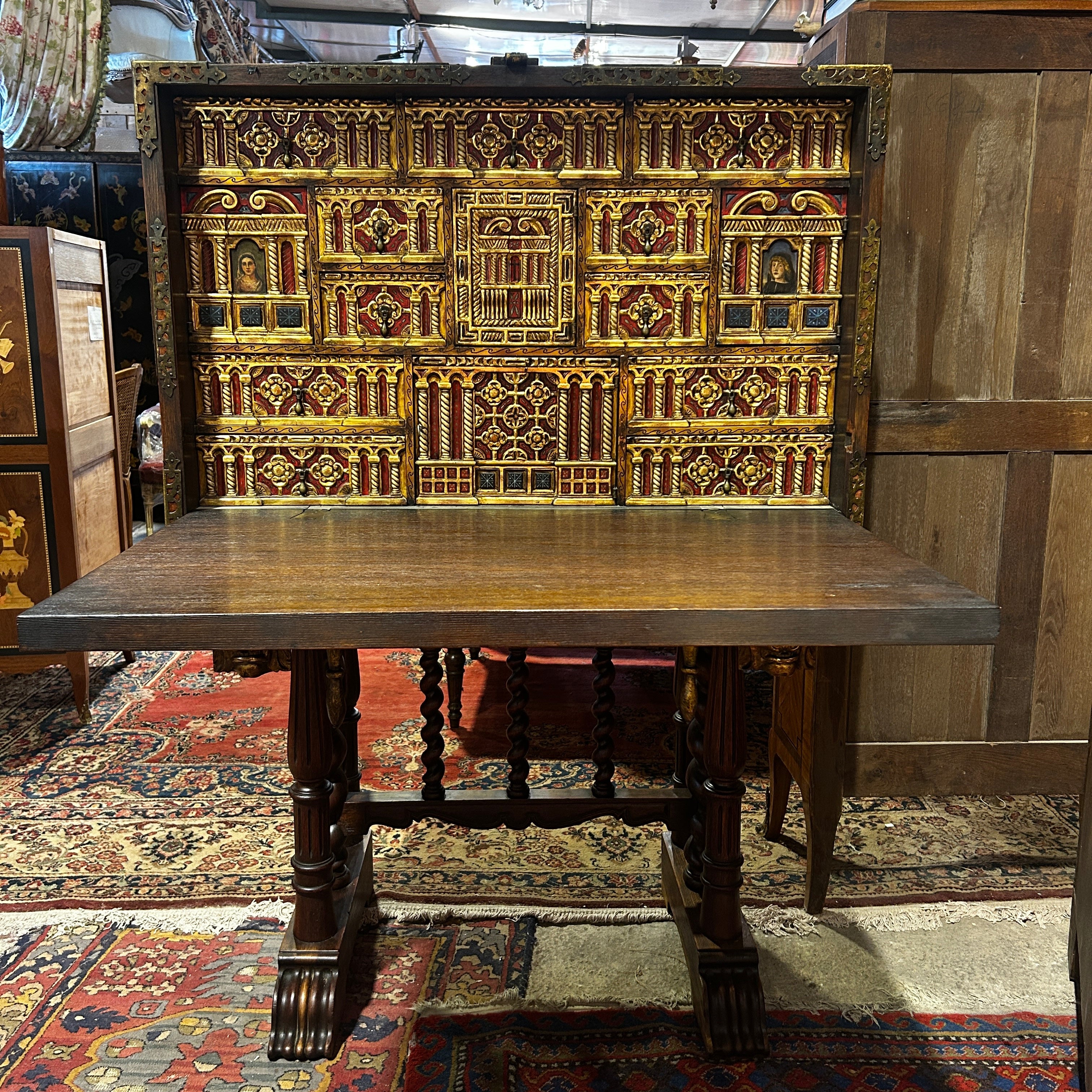 Bargueño español nogal s.XIX detalles policromados aplicaciones bronce y hierro