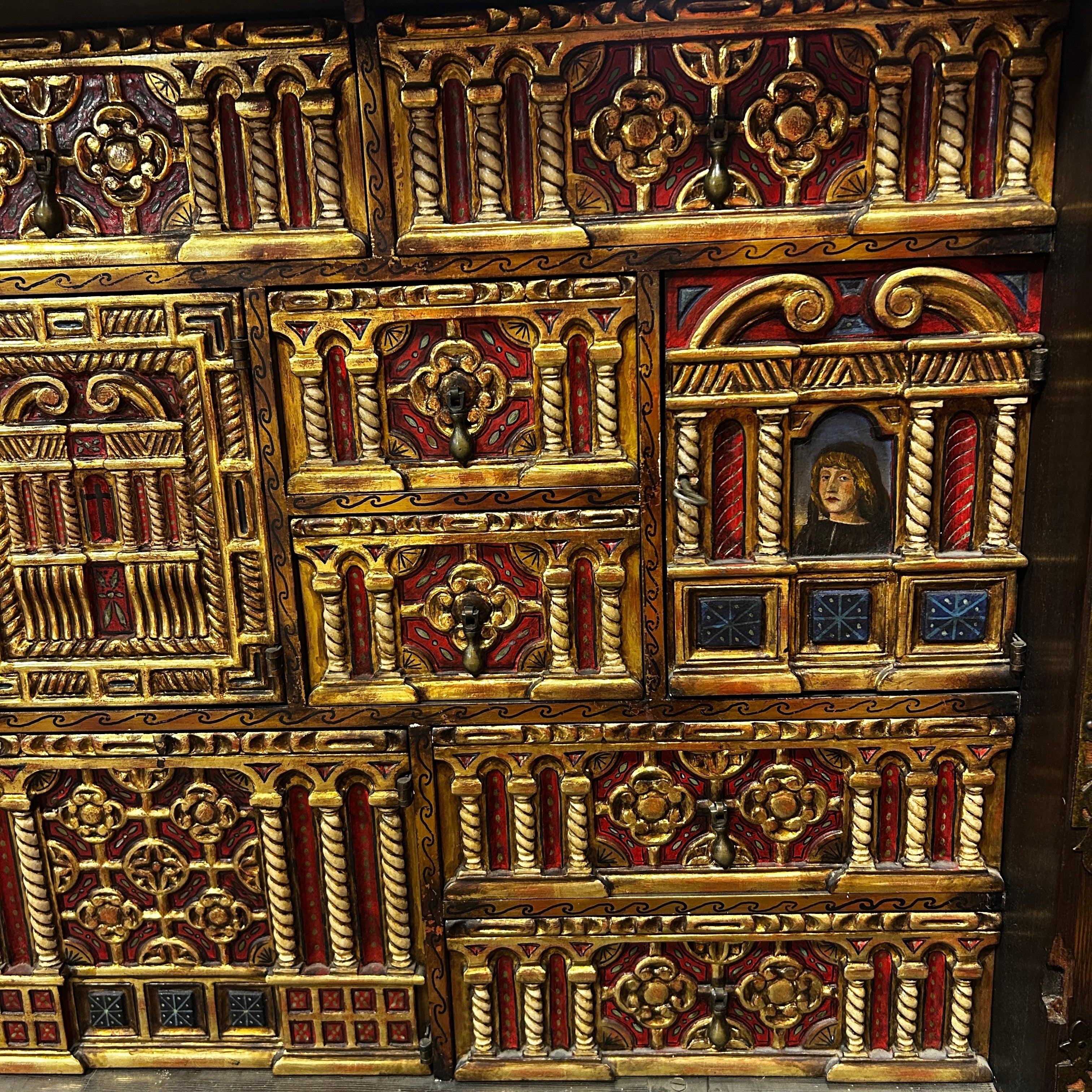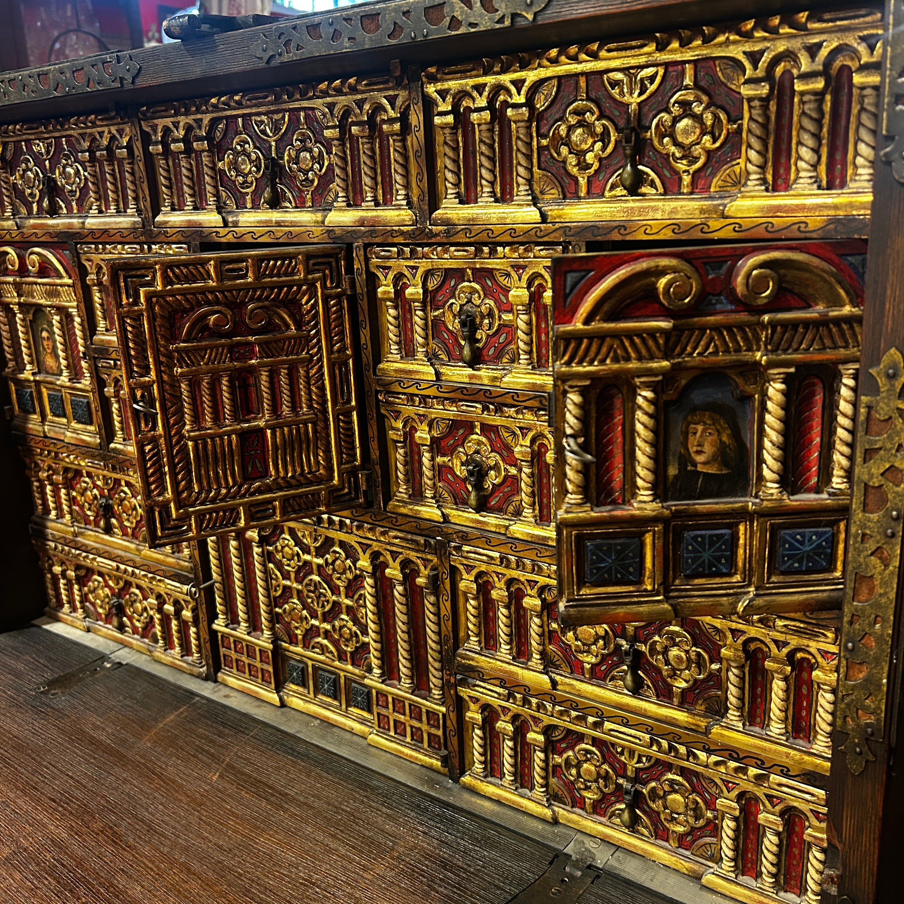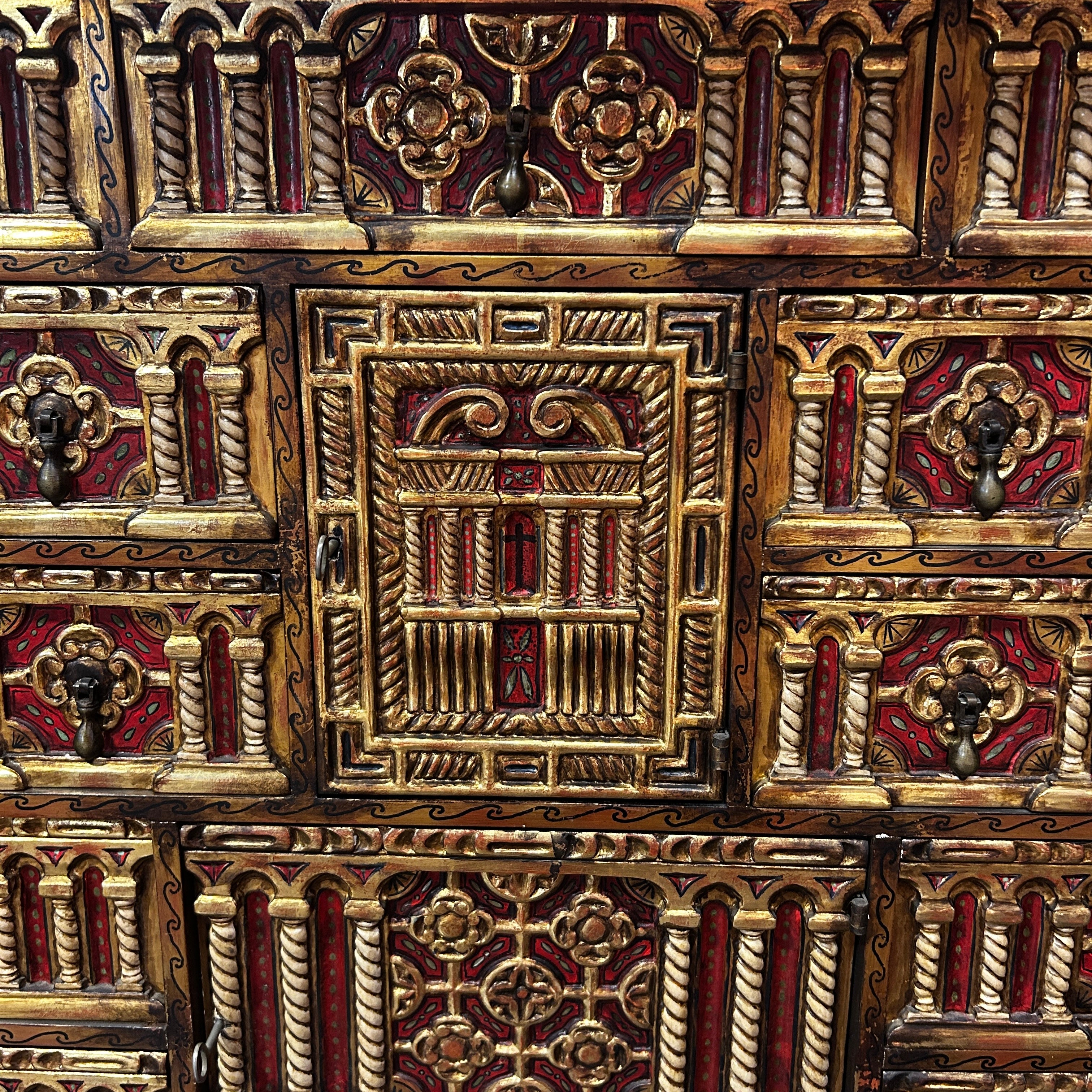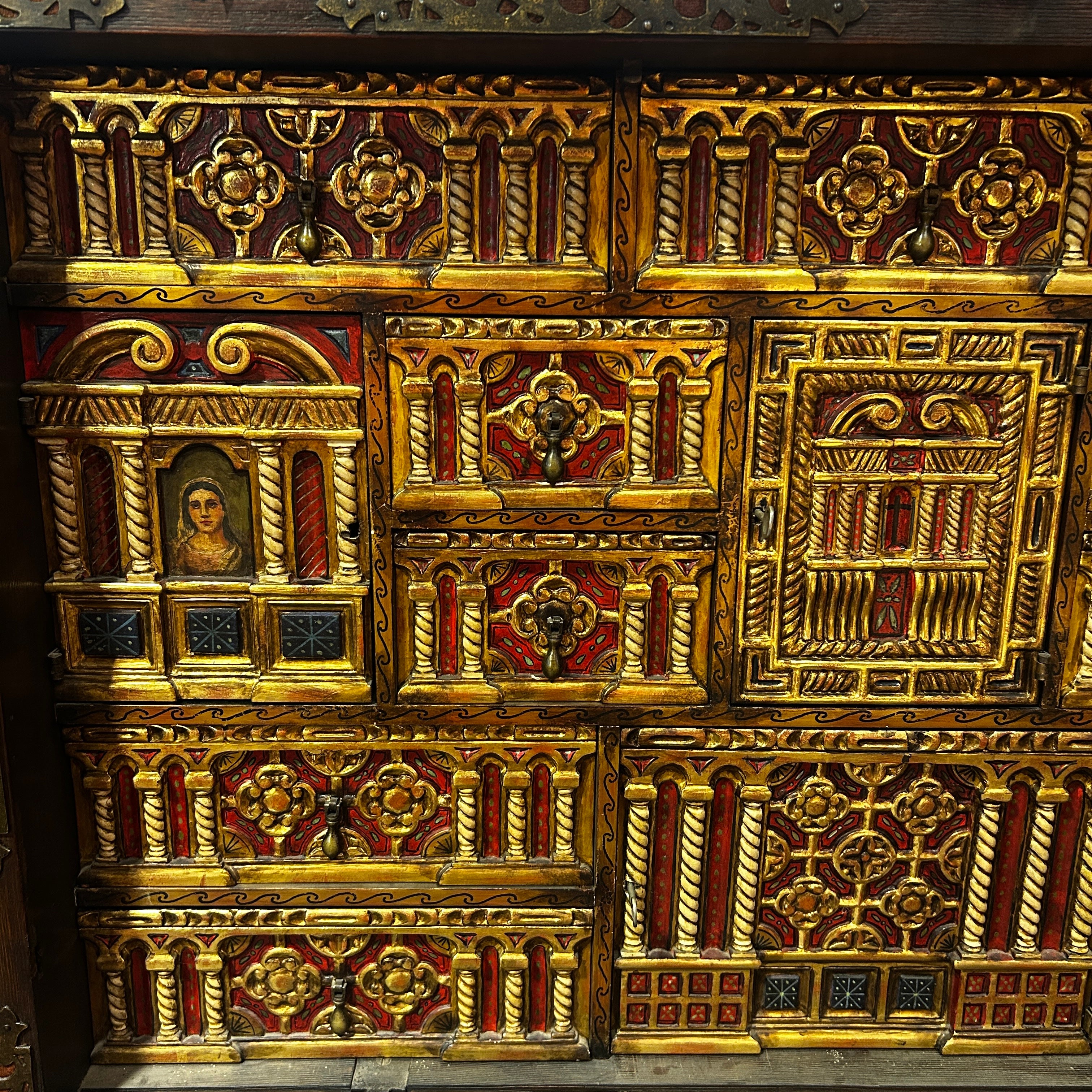 Cuenta con una puerta abatible, un interior con múltiples cajones y compartimentos, profundamente policromados y totalmente pintados a mano. La compuerta frontal está compuesta por tiradores de hierro y aplicaciones de género y hierro masizo. Su base está compuesta por columnas torneadas y otras acanaladas en espiral, una baranda central en la base tallada y con detalles dorados.
