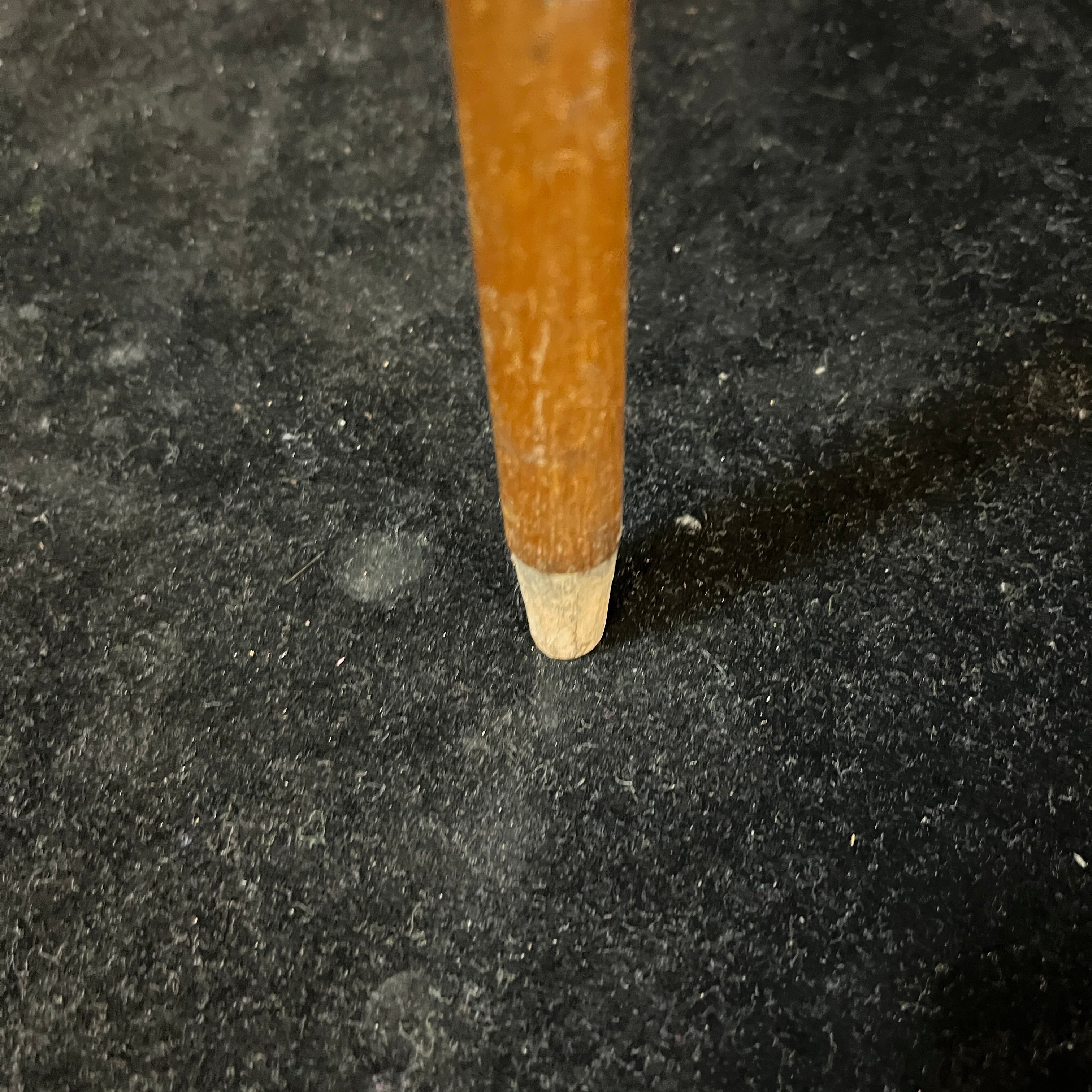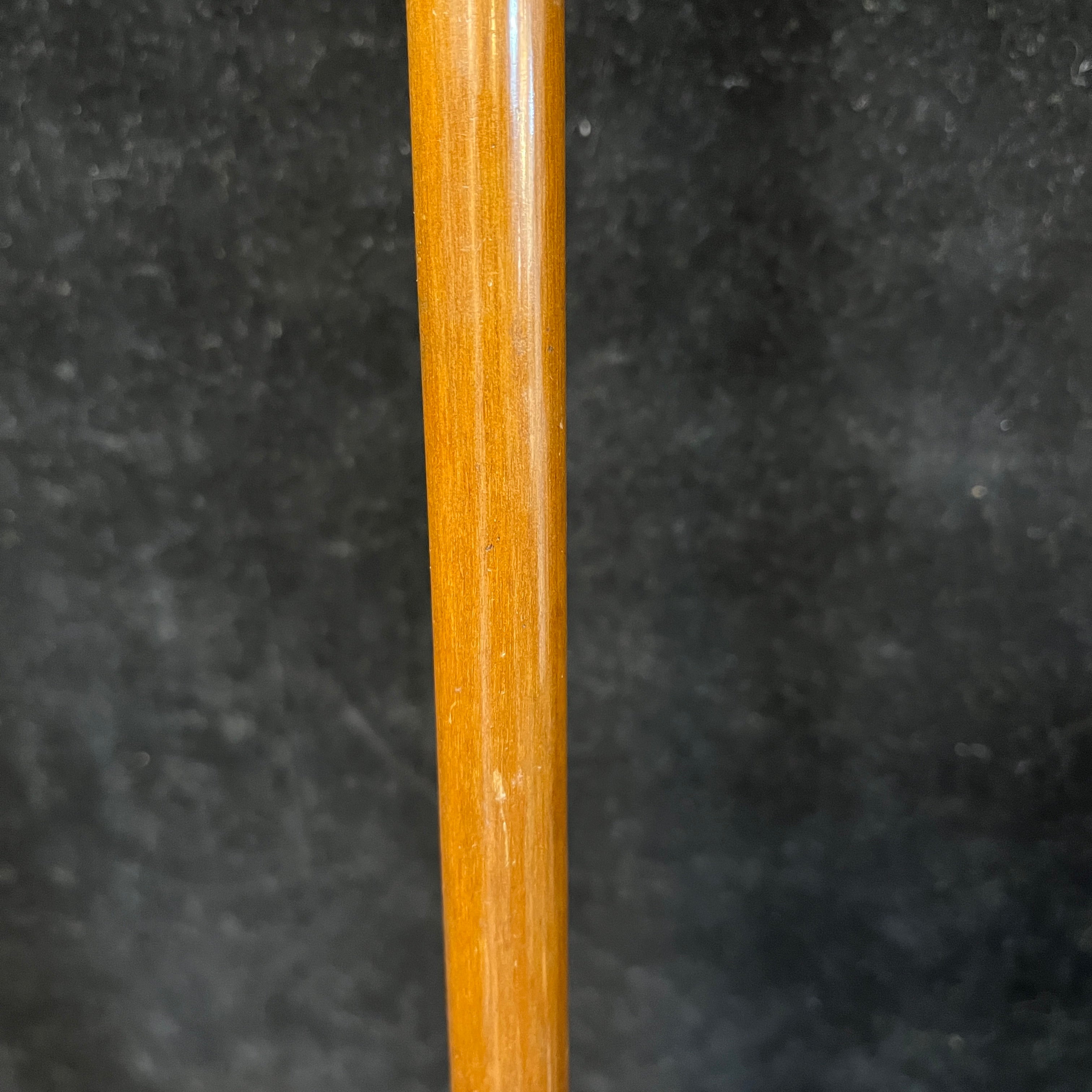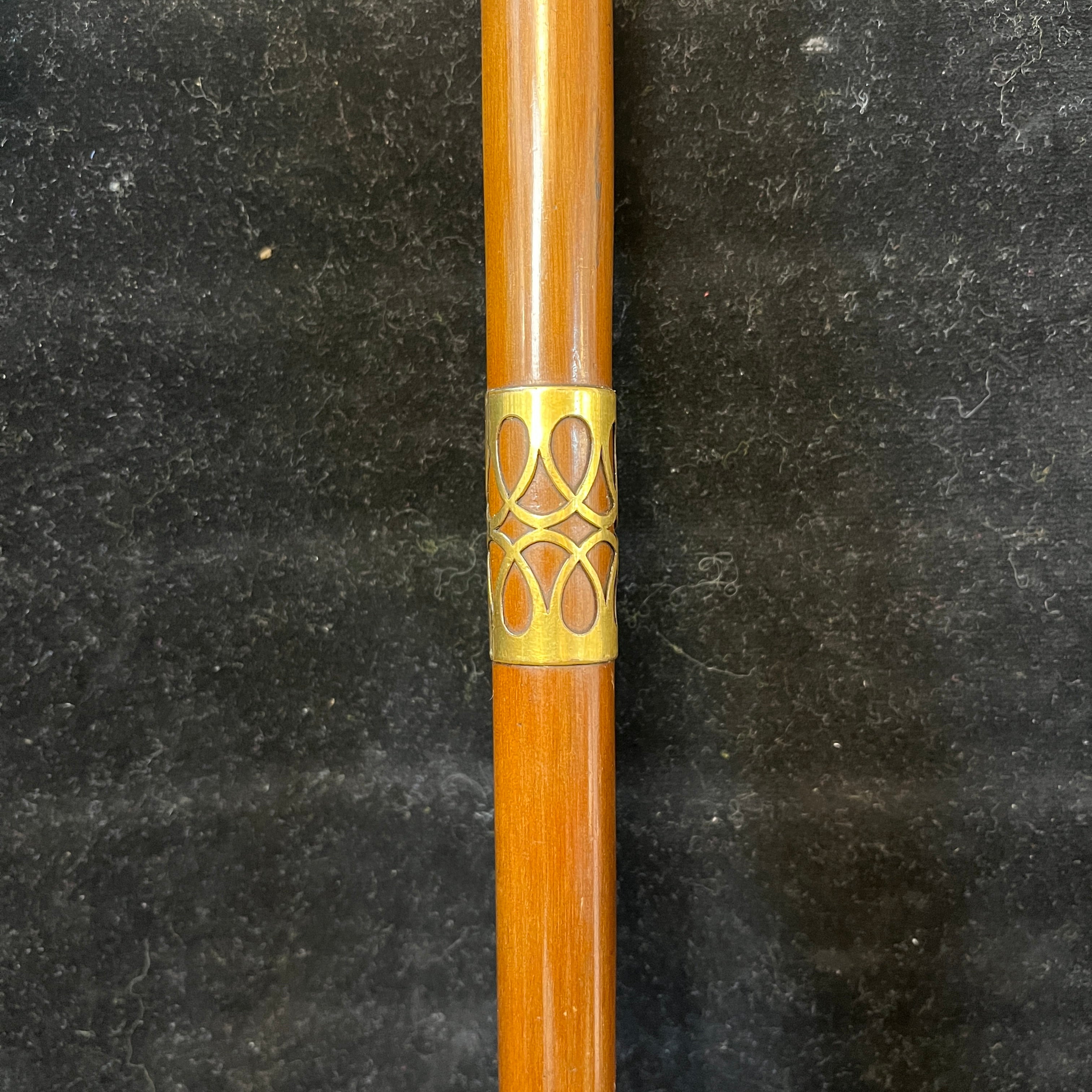 Elegante bastón de madera de caoba con aplicaciones en bronce en su punta, decorado en patrón y mango curvo.