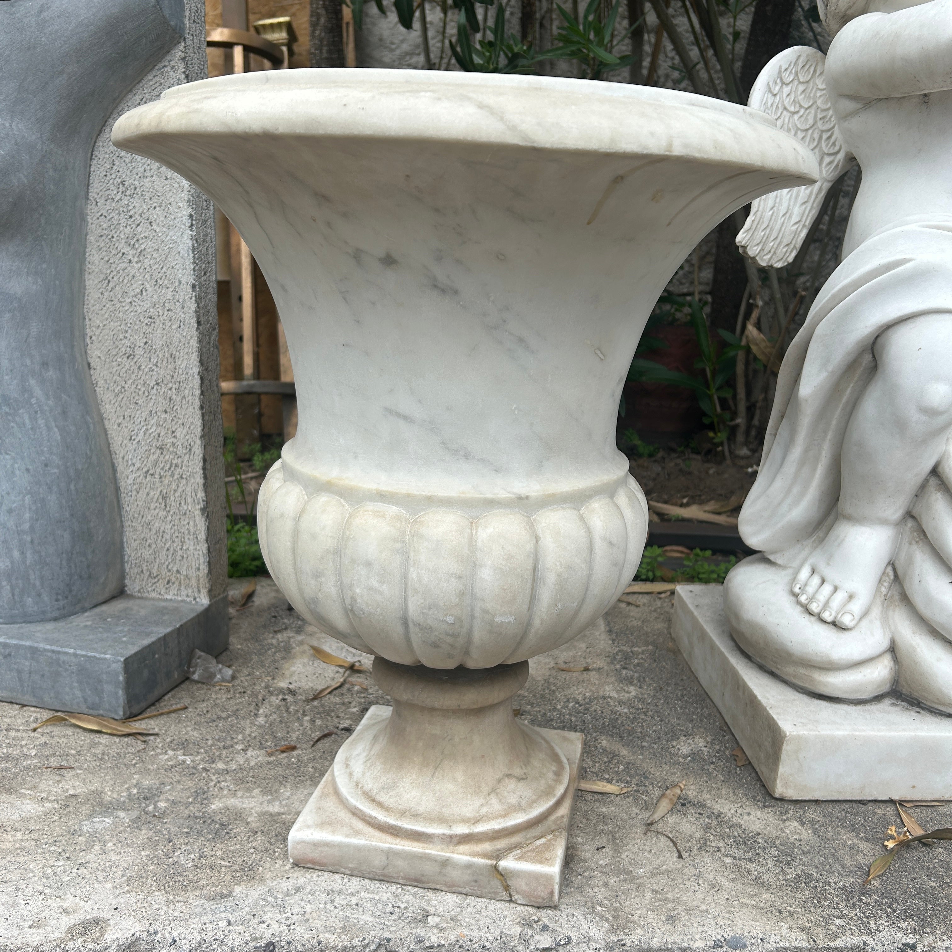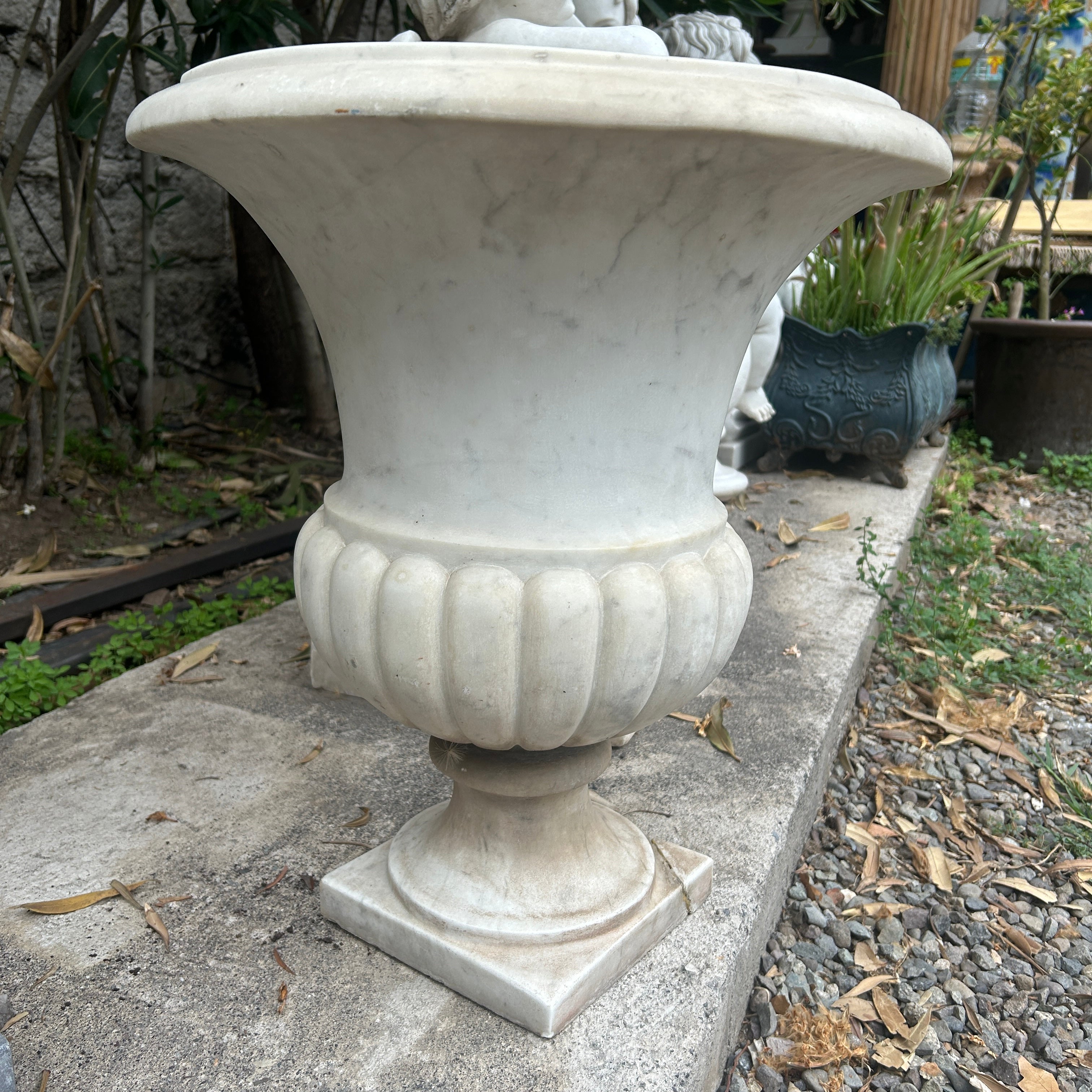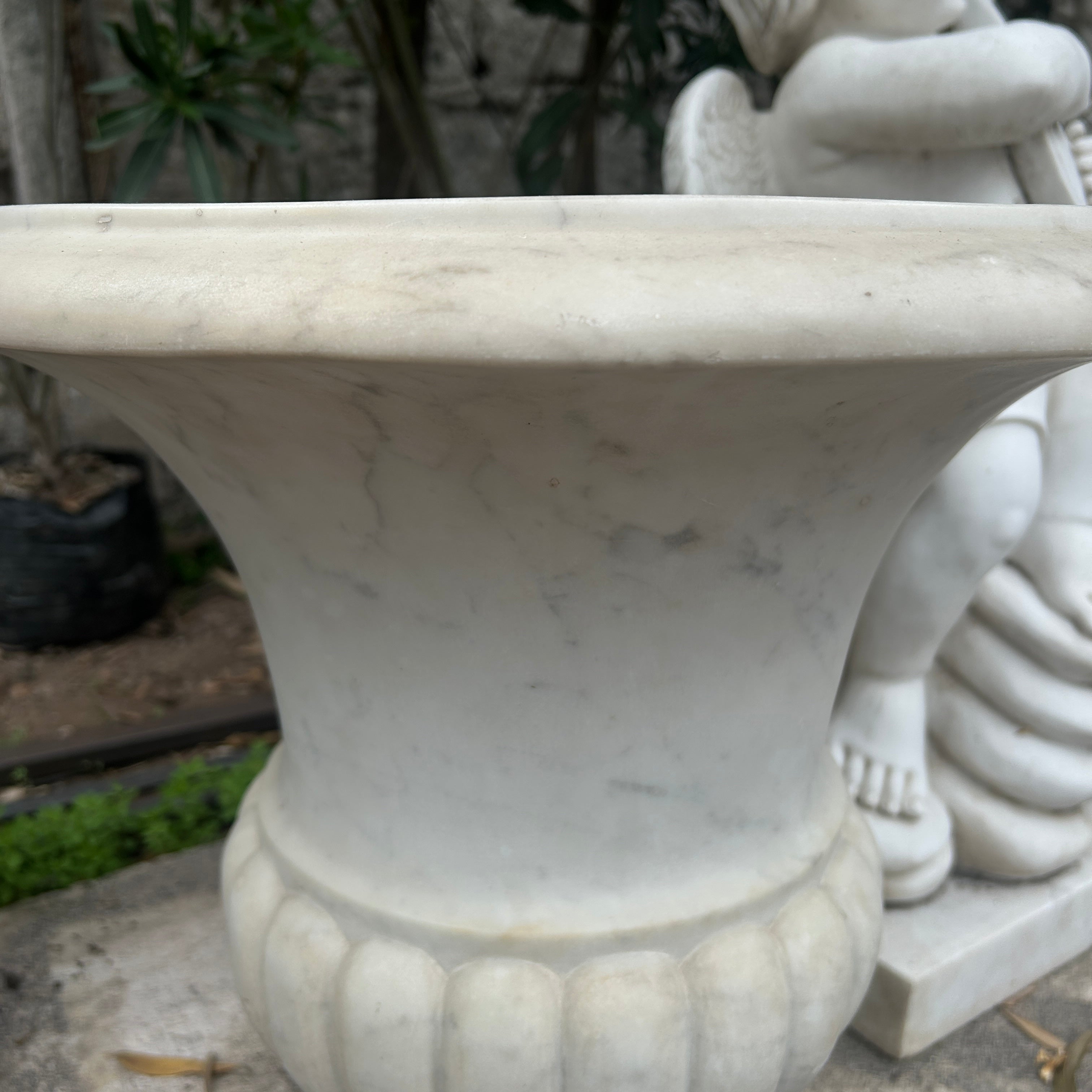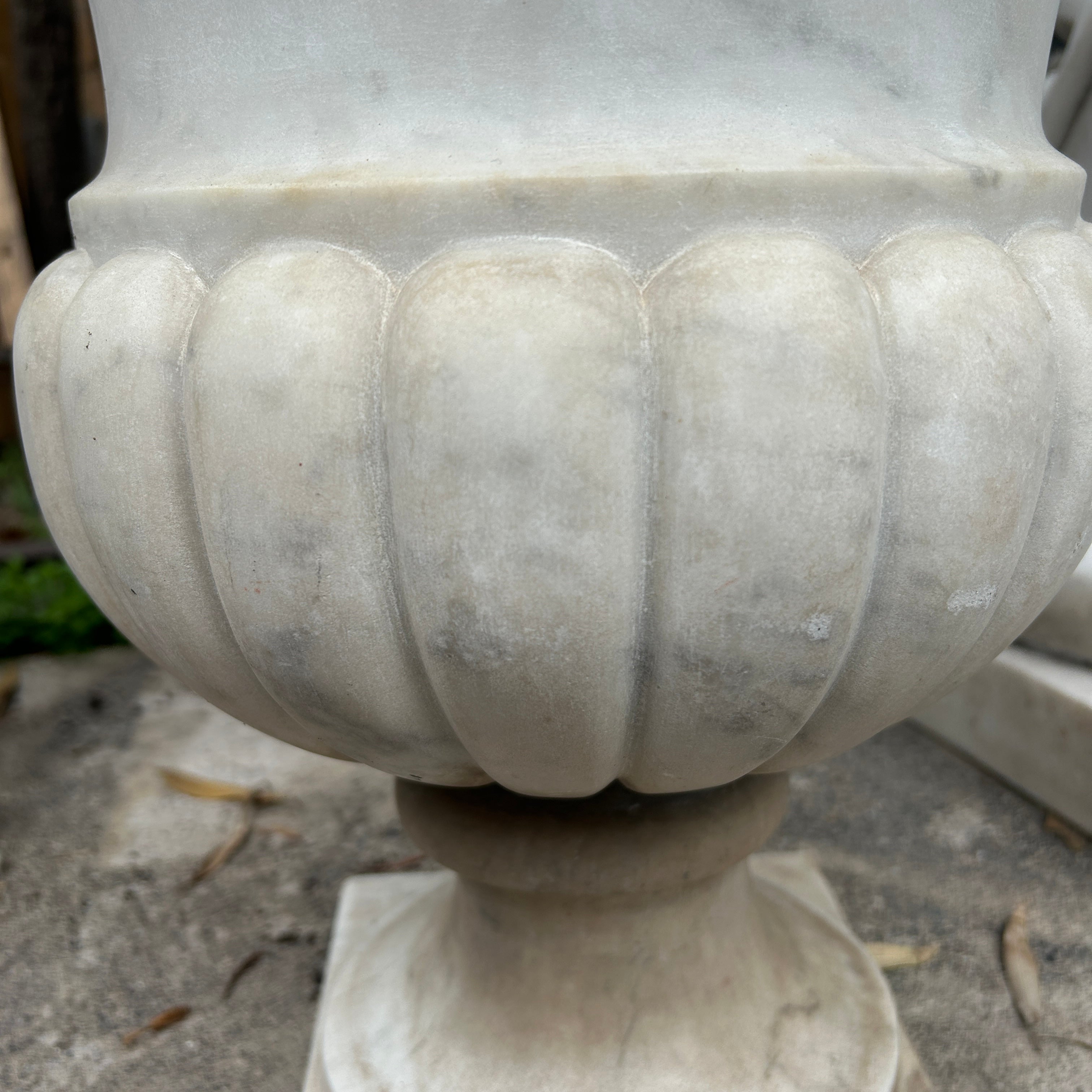 Bello copón blanco de mármol tallado. Puede ser utilizado como un gran macetero de exterior o bien como un hermoso elemento decorativo en interior. China, 2000s.