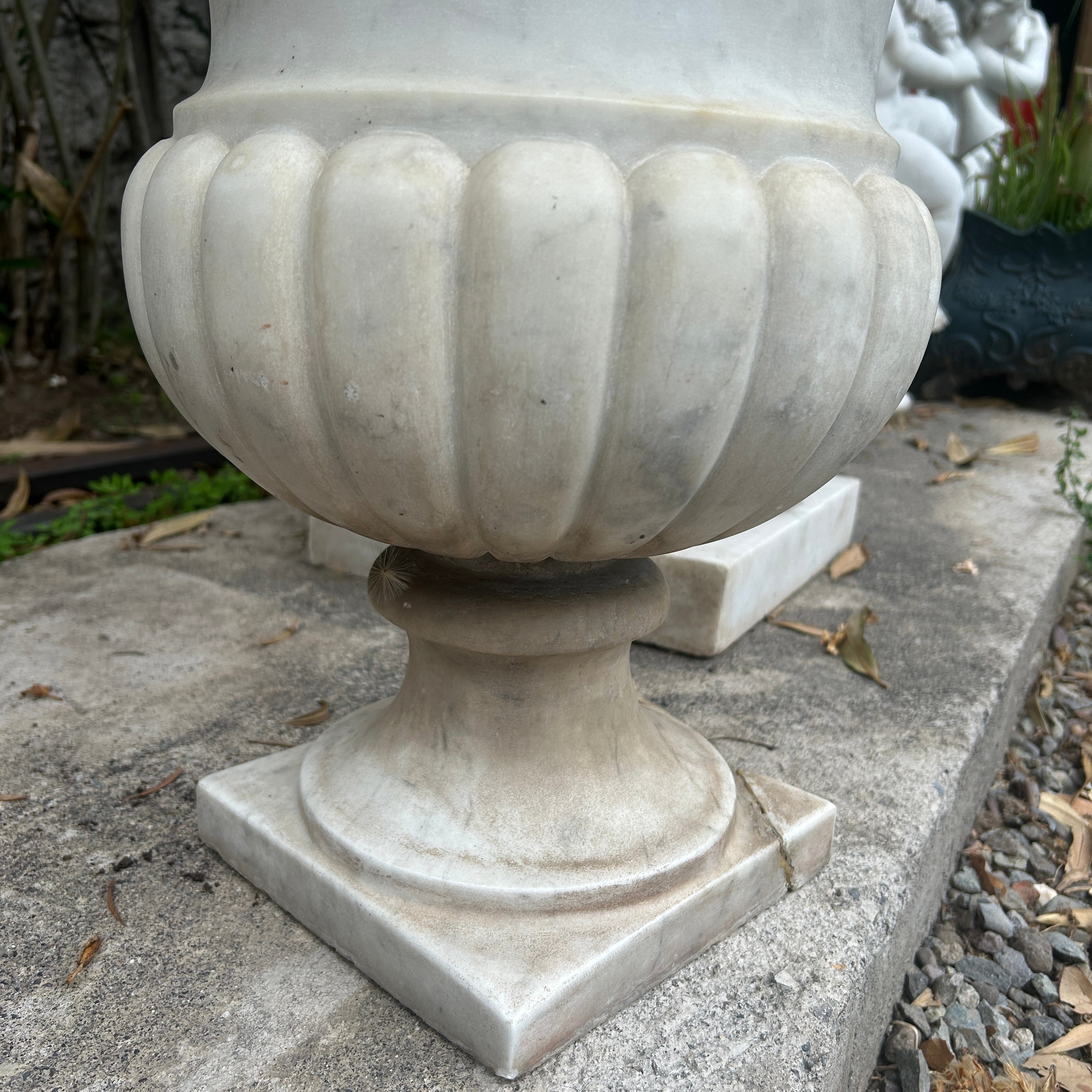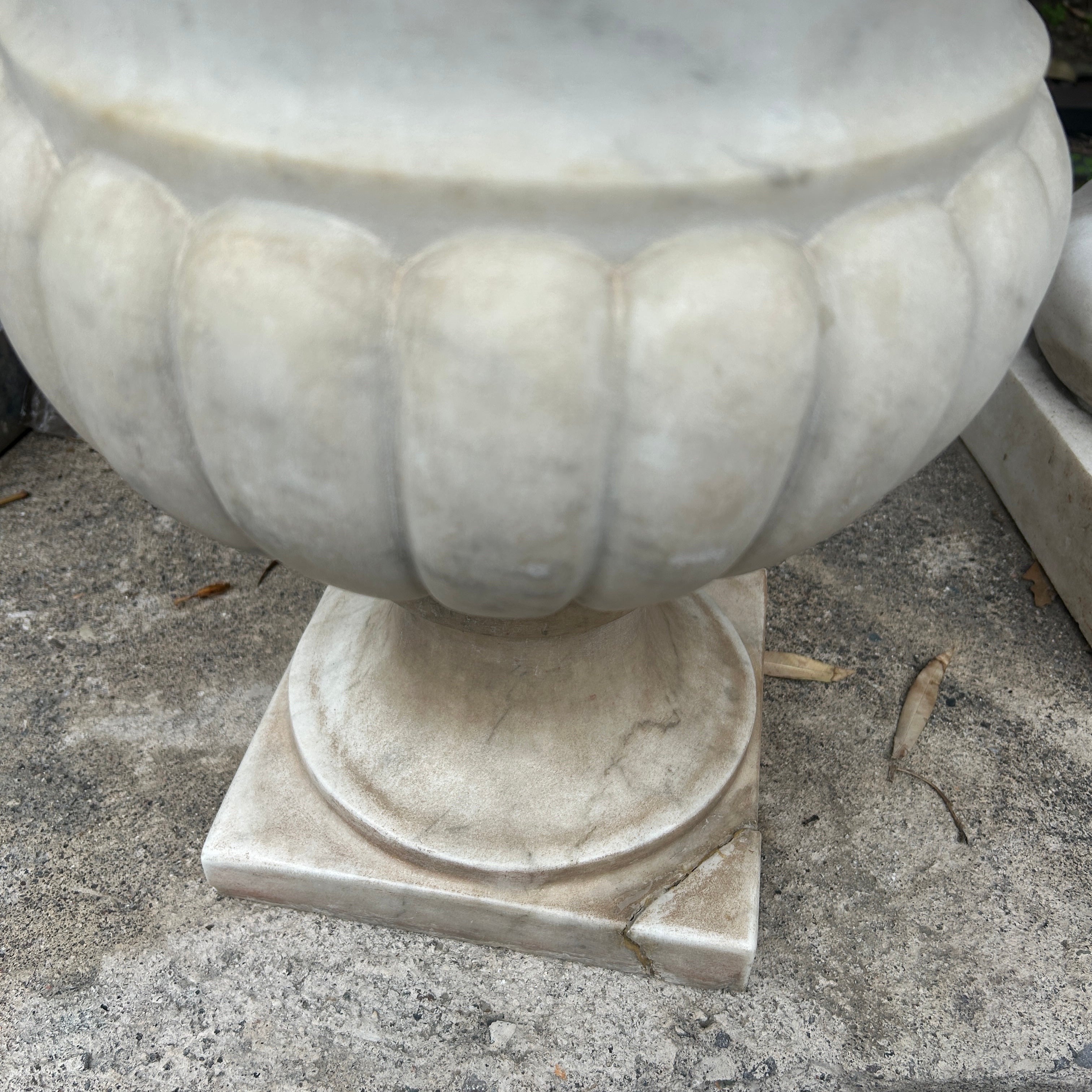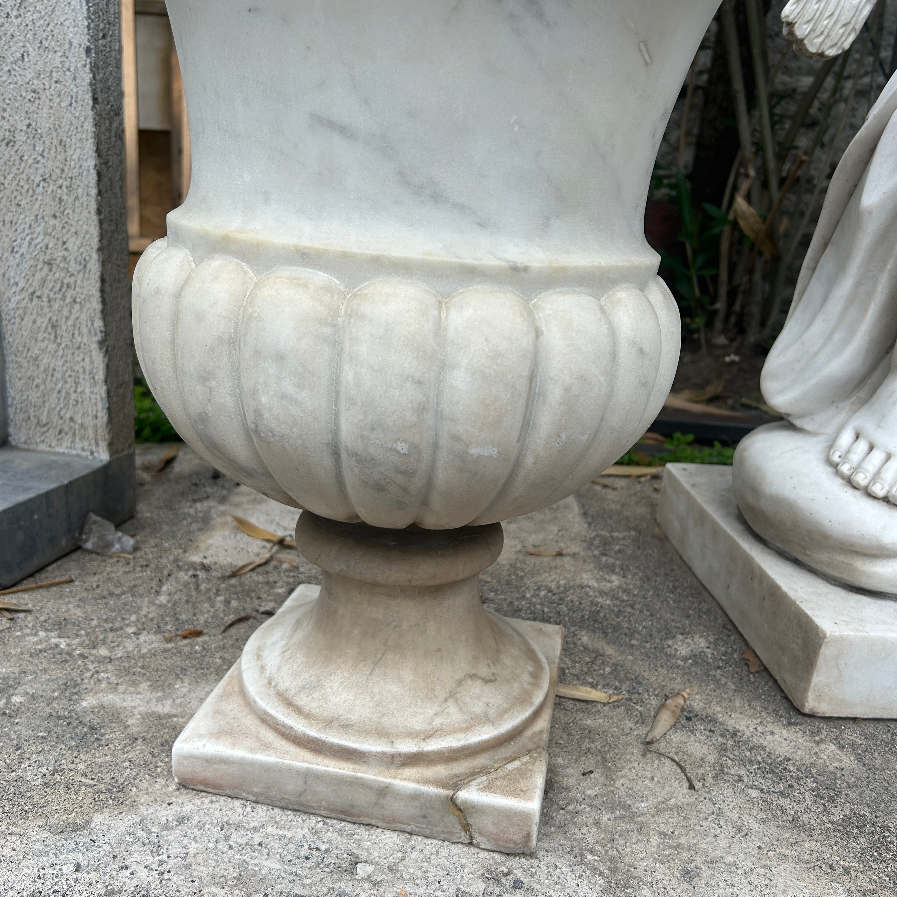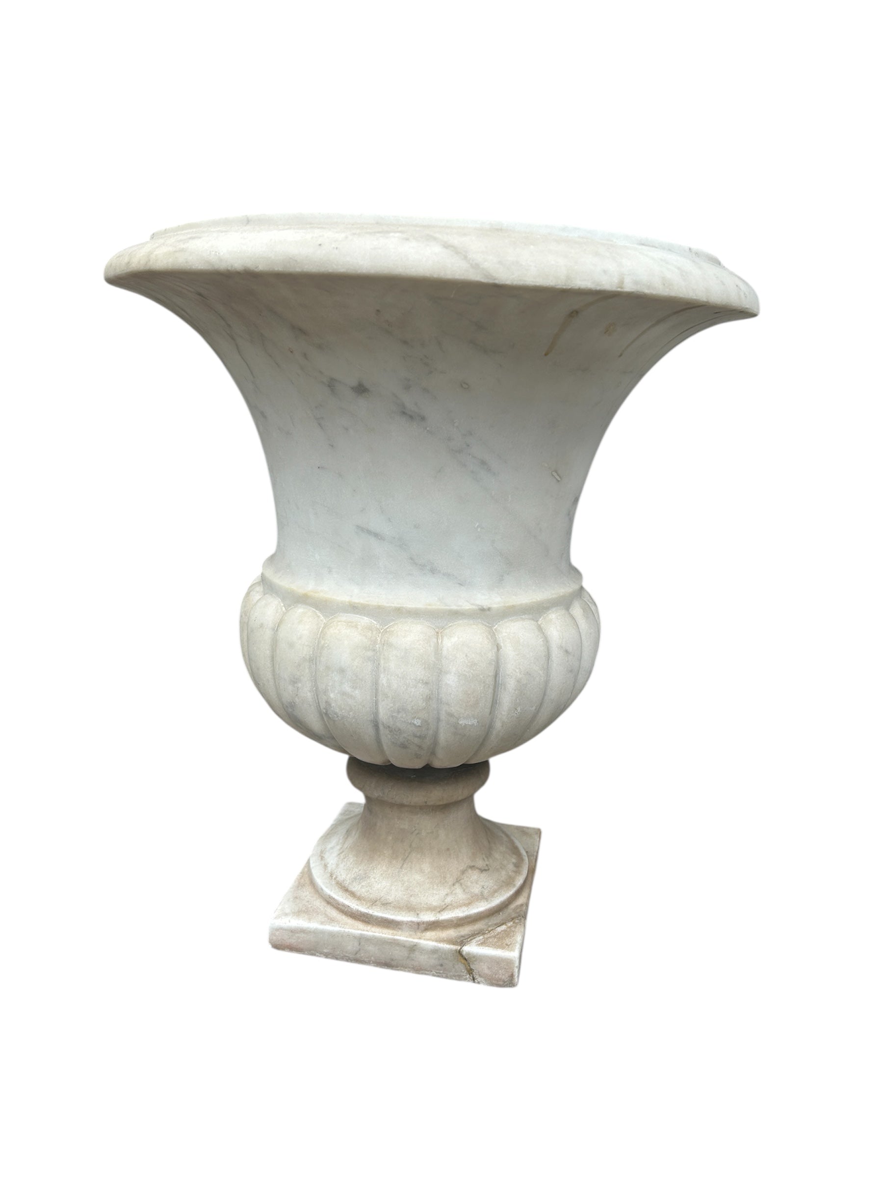 Bello copón blanco de mármol tallado. Puede ser utilizado como un gran macetero de exterior o bien como un hermoso elemento decorativo en interior. China, 2000s.