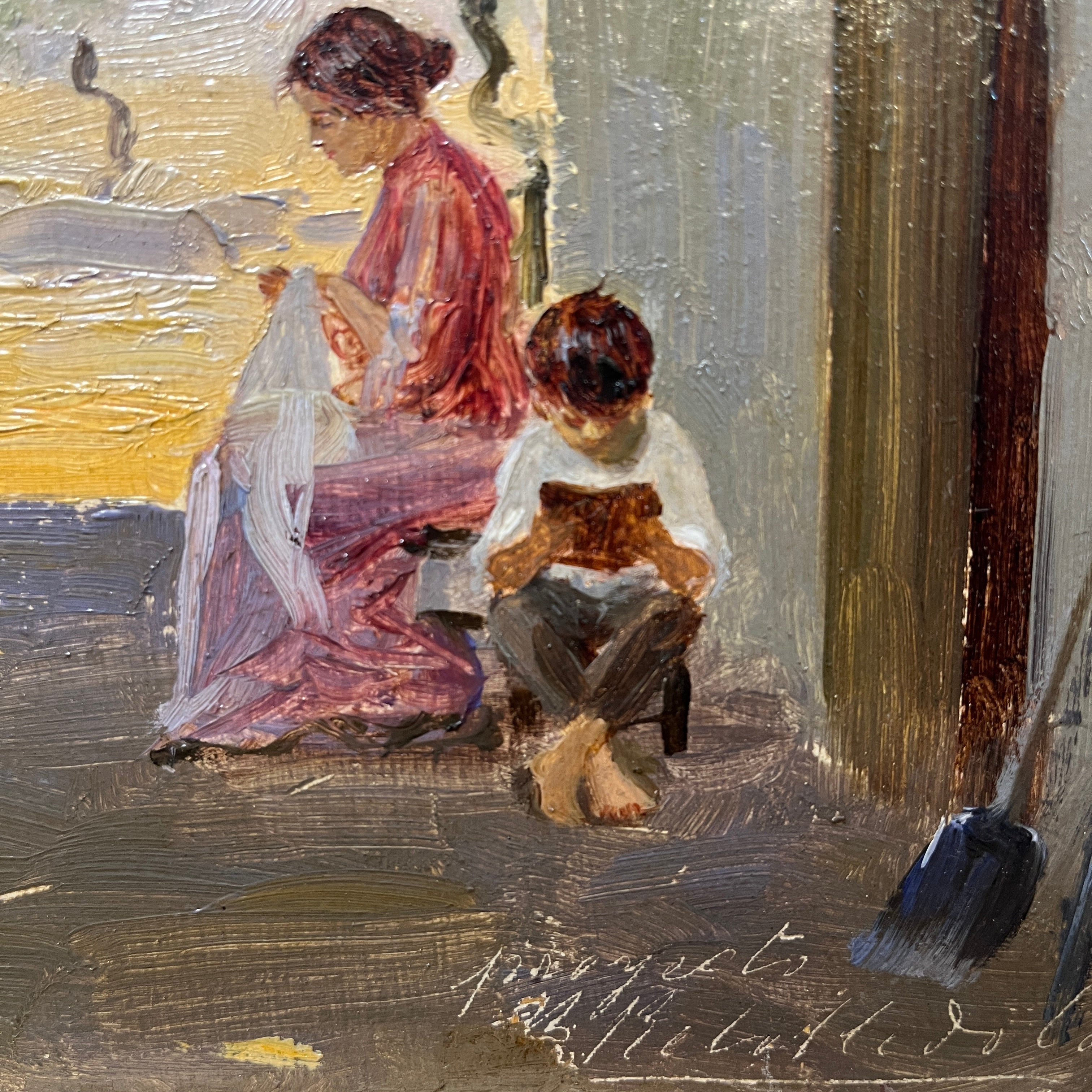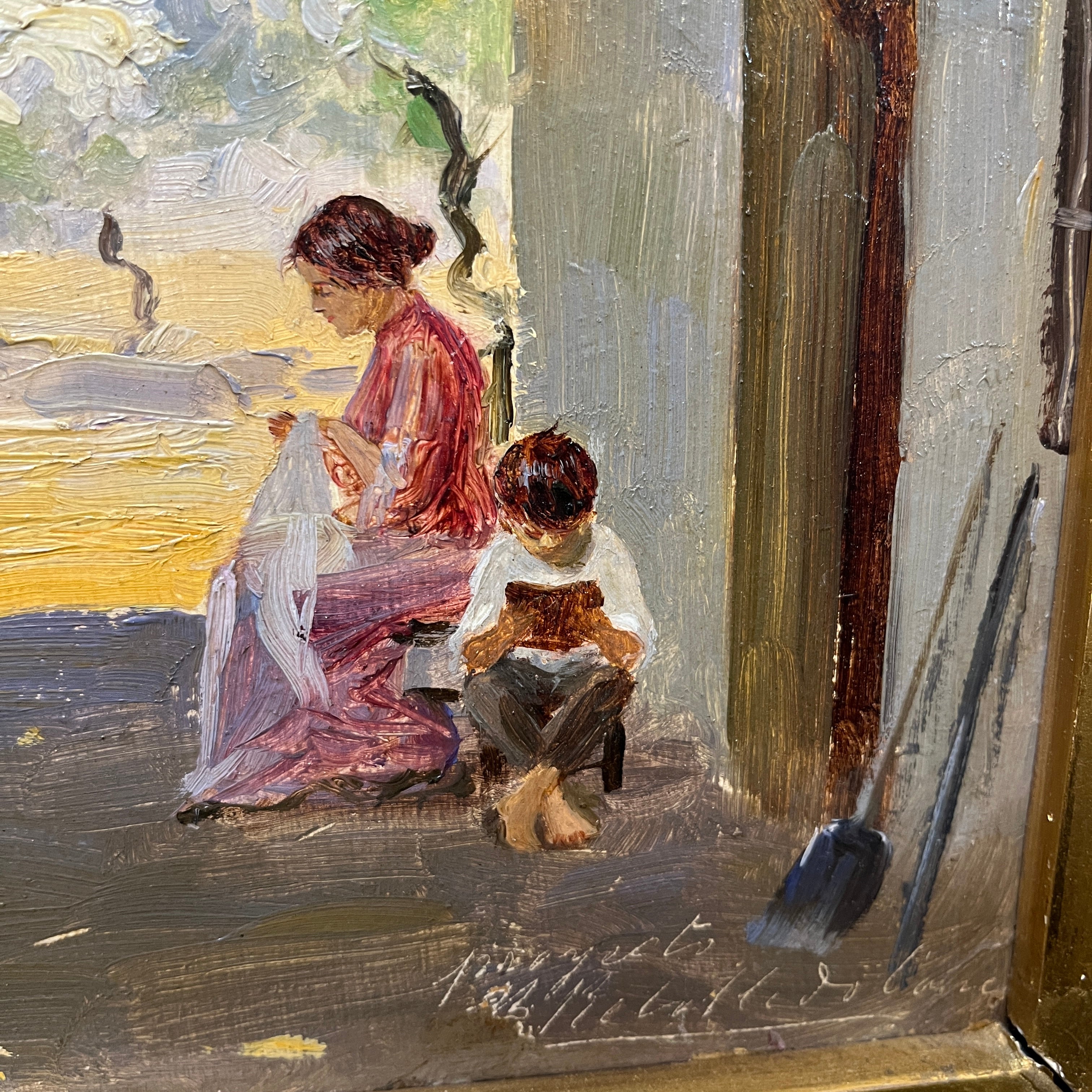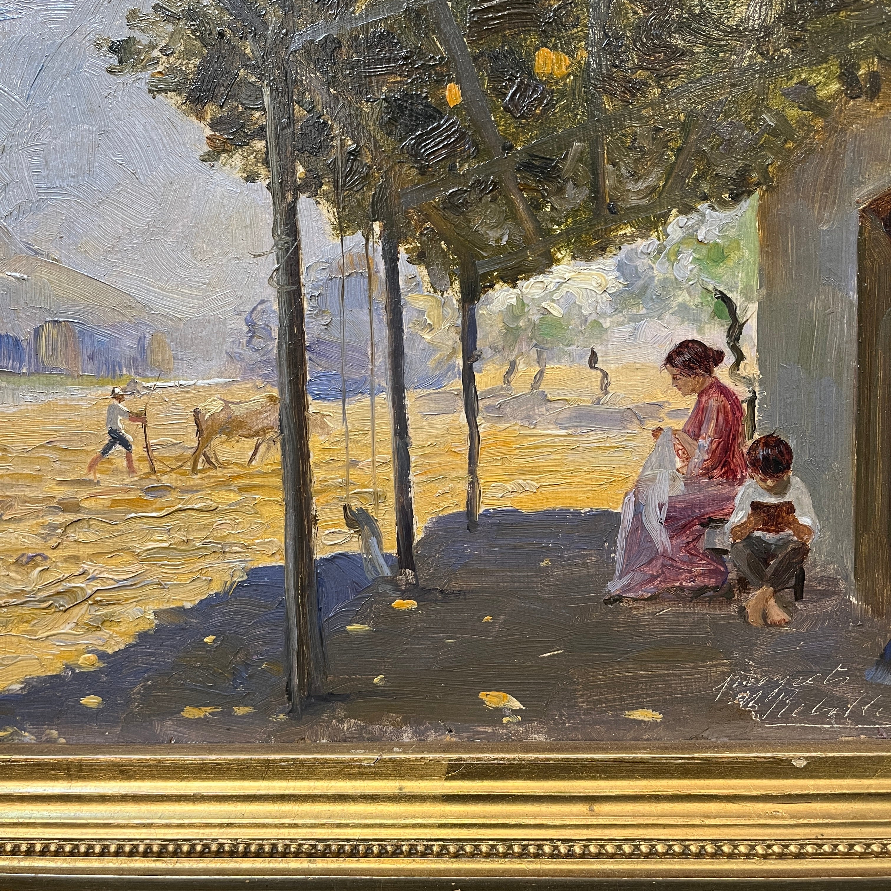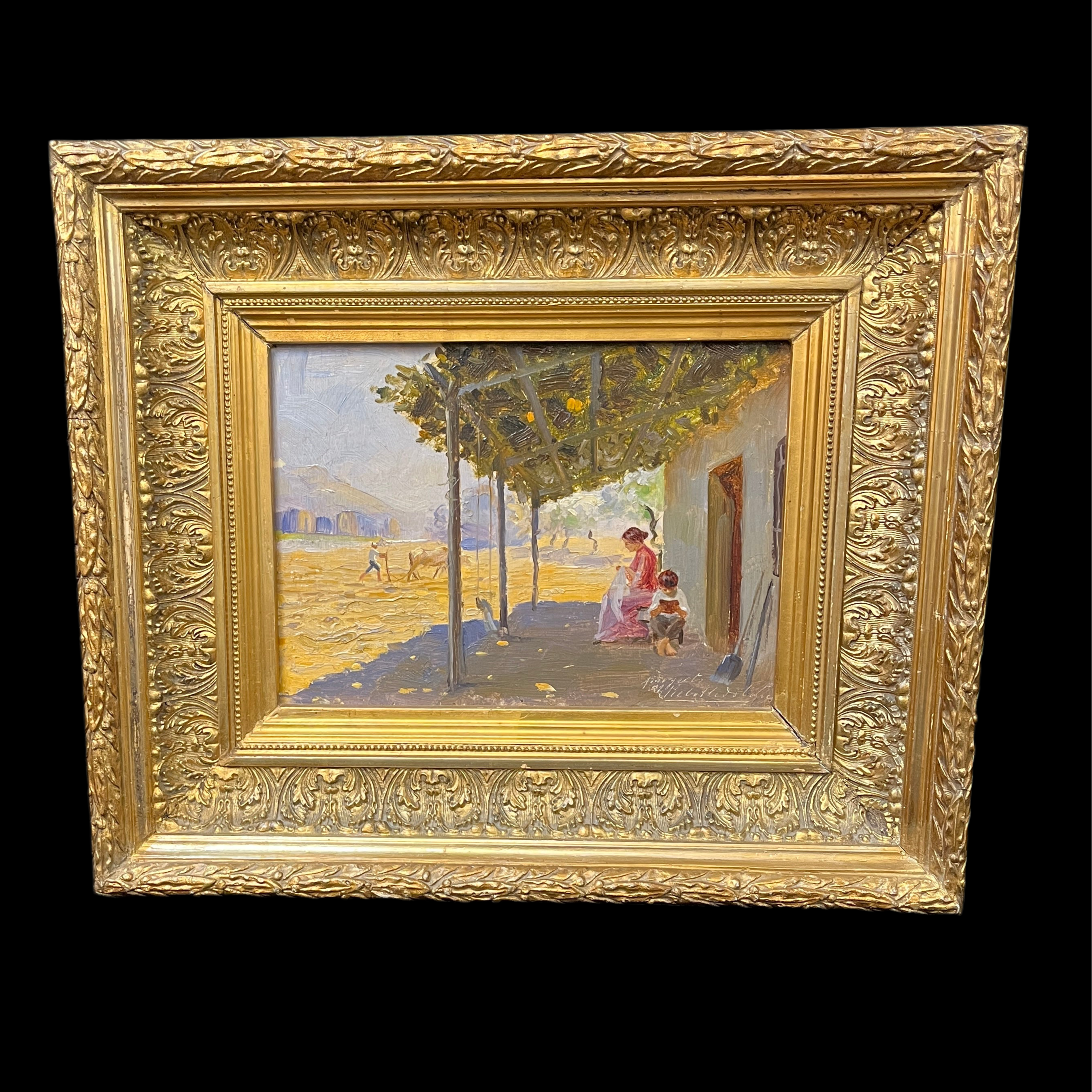 Hermosa pintura del artista chileno Benito Rebolledo que con absoluta destreza captura una escena familiar en un paisaje rural. Una mujer sentada bordando, a sus pies un pequeño niño descalzo leyendo y a la distancia a quien podemos imaginar como un padre labrando la tierra. Ambos madre e hijo bajo la sombra verde de una enredadera. La pintura transmite esa complicidad silenciosa de la vida familiar donde cada integrante coexiste a partir del otro.