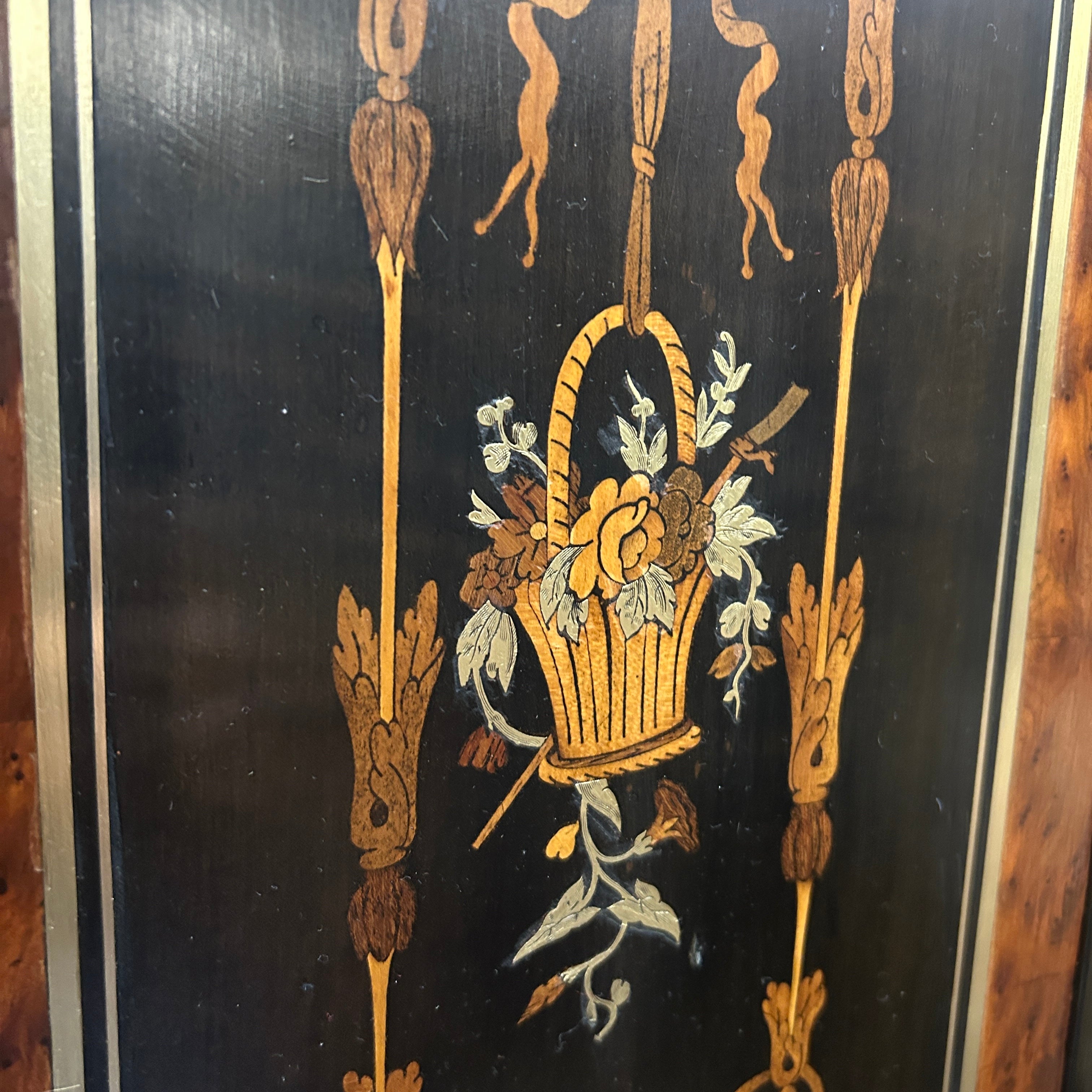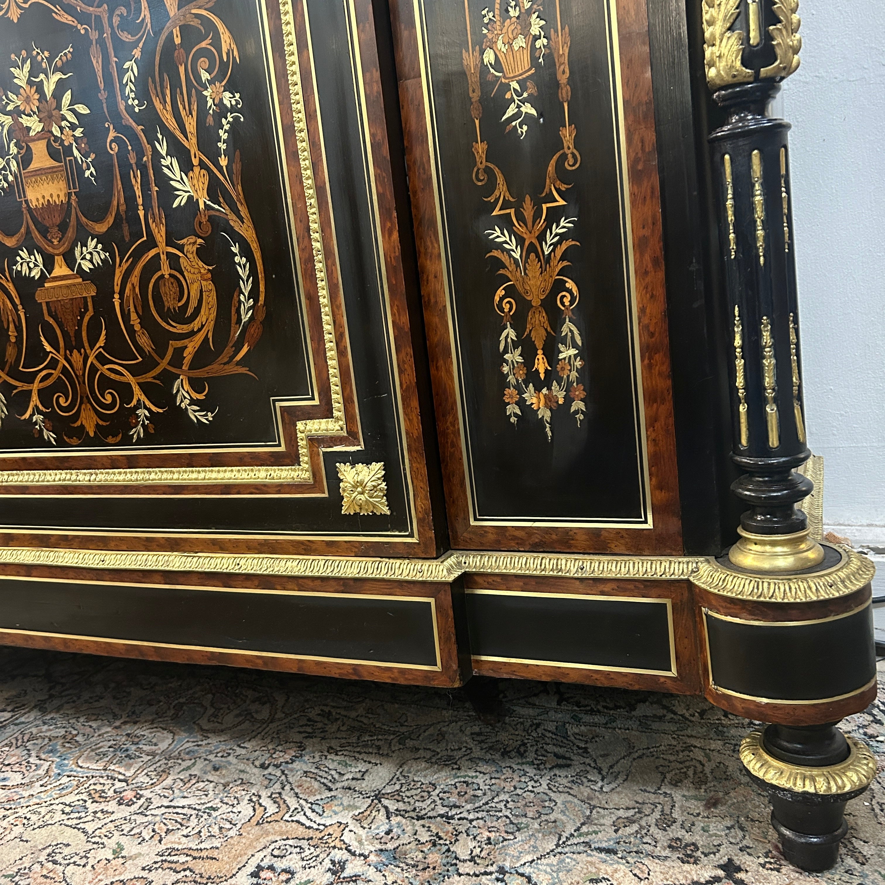 Gran boulle de origen francés estilo Napoleón III, hecho de madera ebonizada, con una increíble marquetería en nácar, maderas frutales y bronce, con motivos de decoración en guirnaldas y una gran vasija con flores en el centro. Esta llamativa pieza tiene aplicaciones de relieves y filetes en bronce ormolú, además de una espectacular cubierta de mármol blanco de Carrara. Un elemento distintivo de esta pieza es la mezcla del ebanizado con su enchapado en madera exótica. Su puerta de gran tamaño da acceso al espacio de almacenaje interior, compuesto de tres repisas.